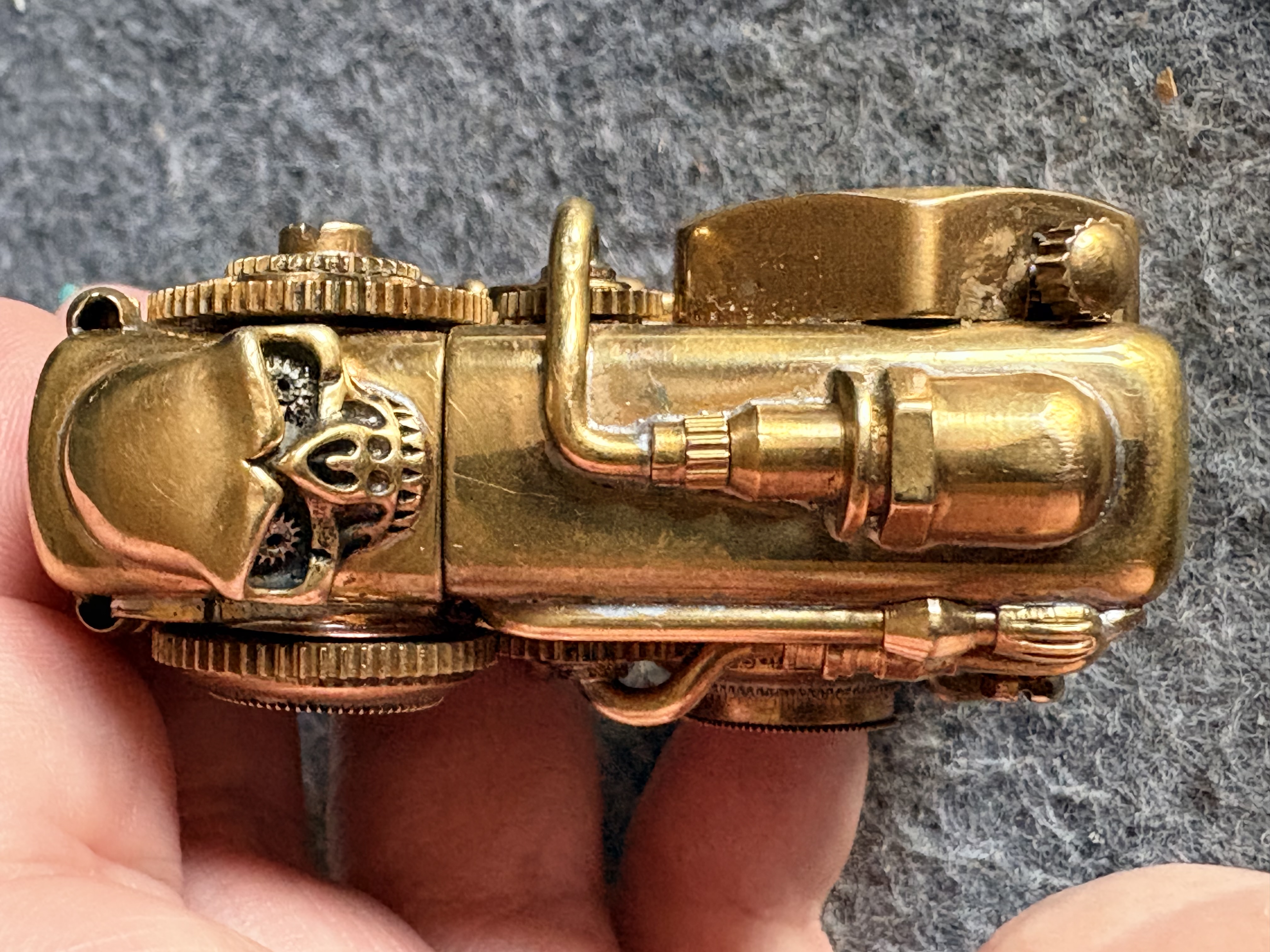 Each steampunk lighter is meticulously hand-welded from solid brass and finished with a protective lacquer, ensuring both durability and a gleaming finish. The combination of the skull, copper tubing, and functioning gears perfectly captures the essence of the steampunk aesthetic. This lighter is a must-have for collectors, enthusiasts, and anyone who appreciates exceptional craftsmanship and distinctive design.