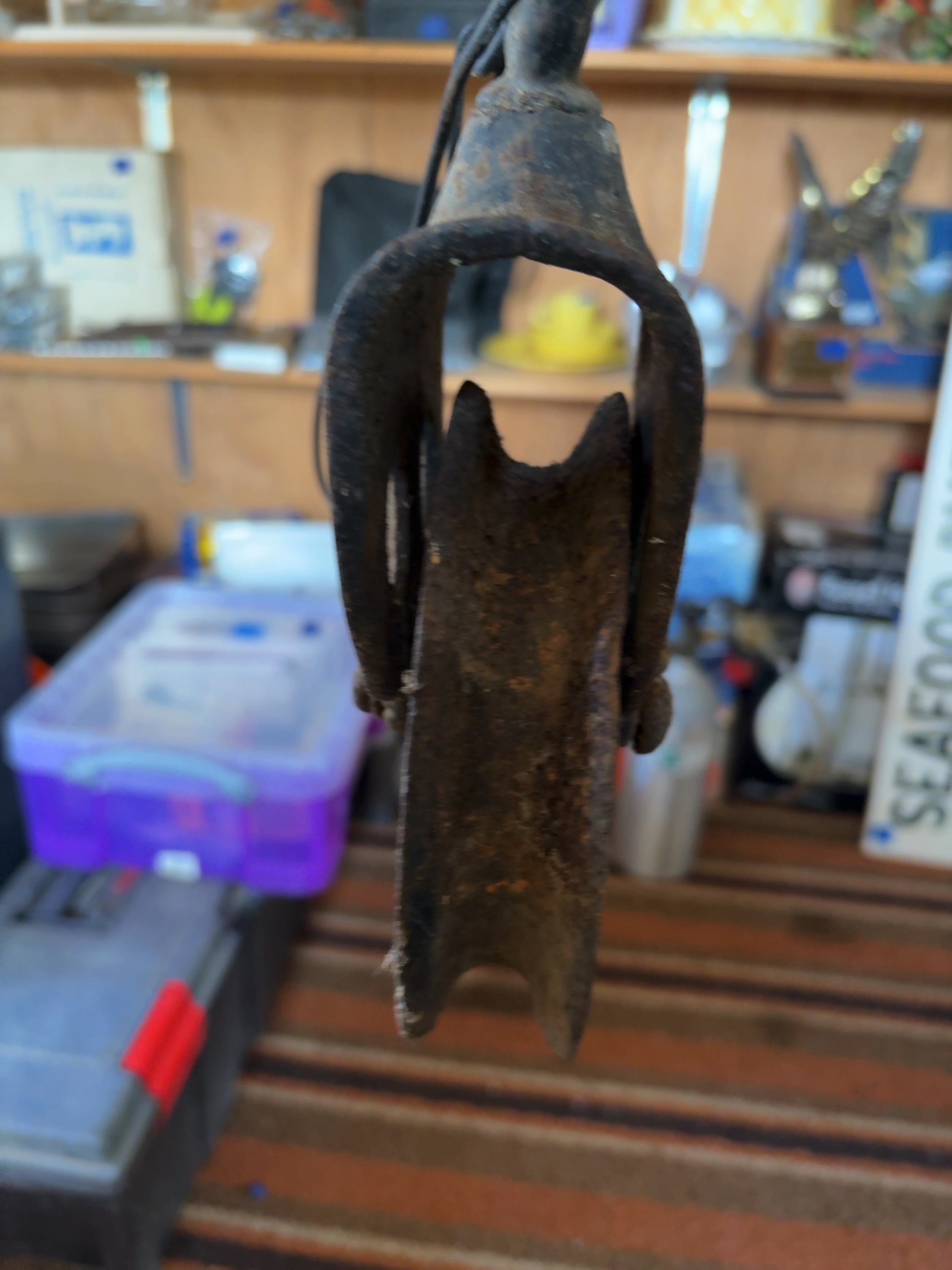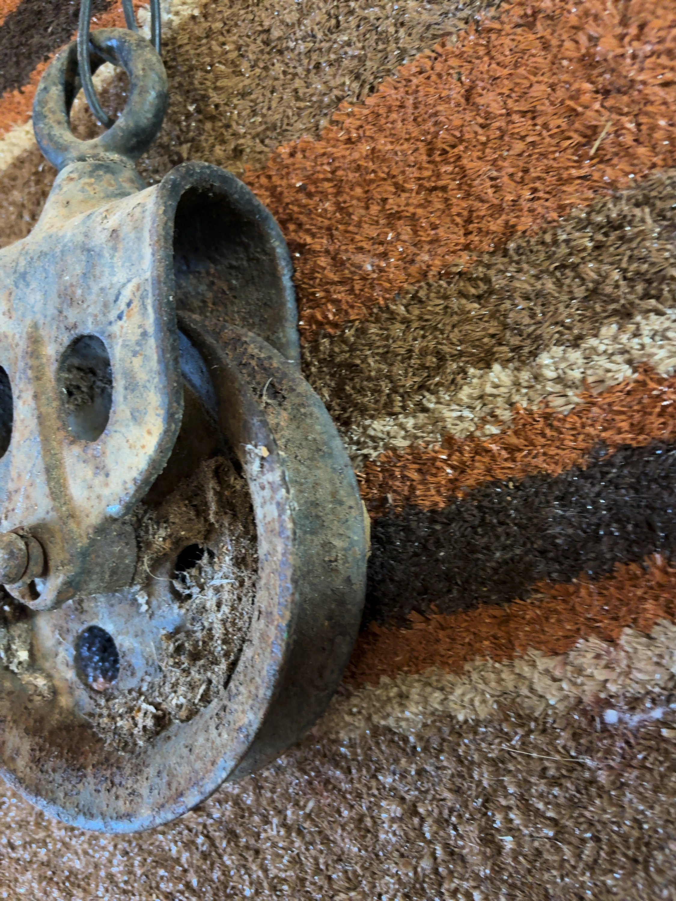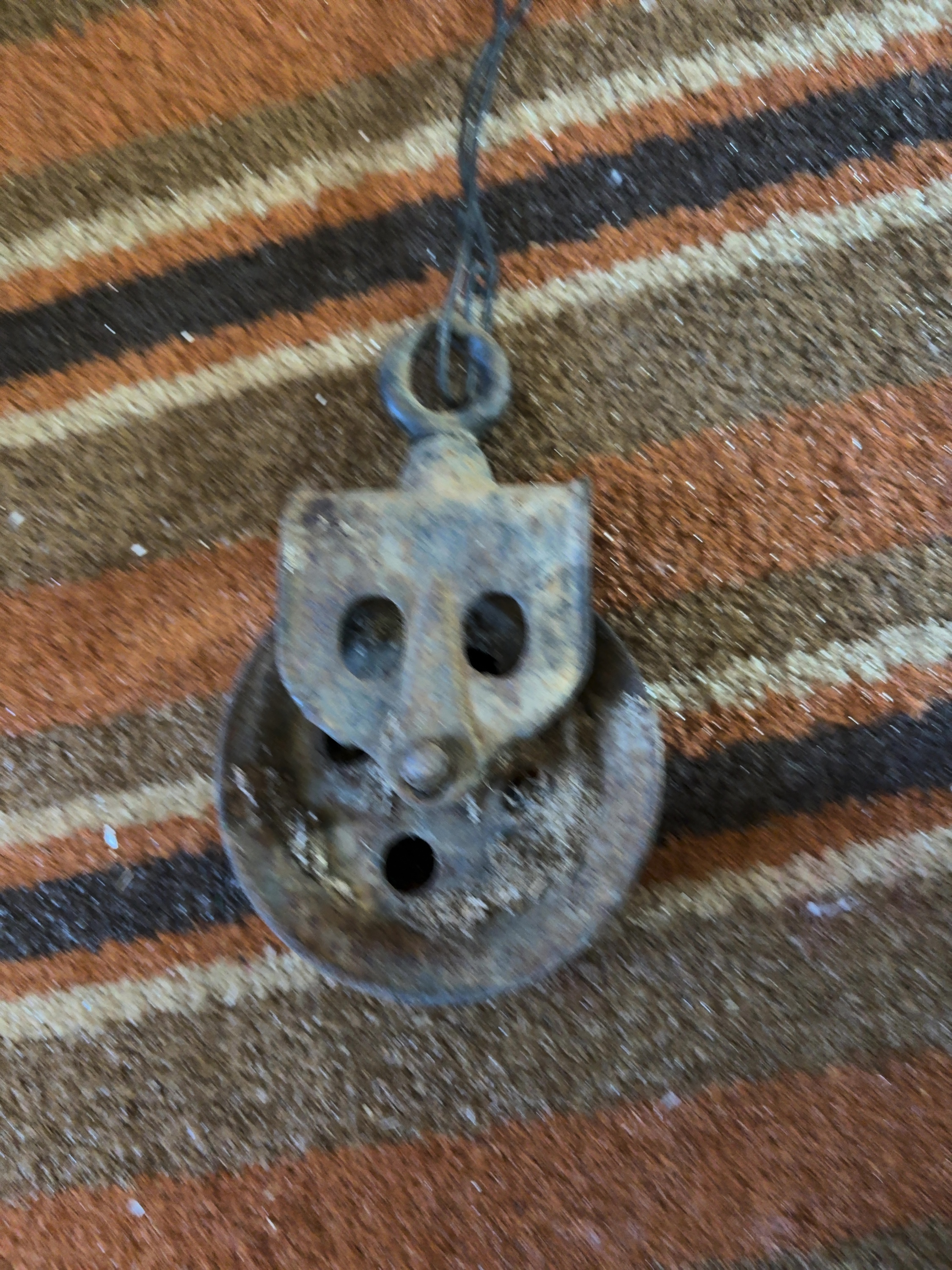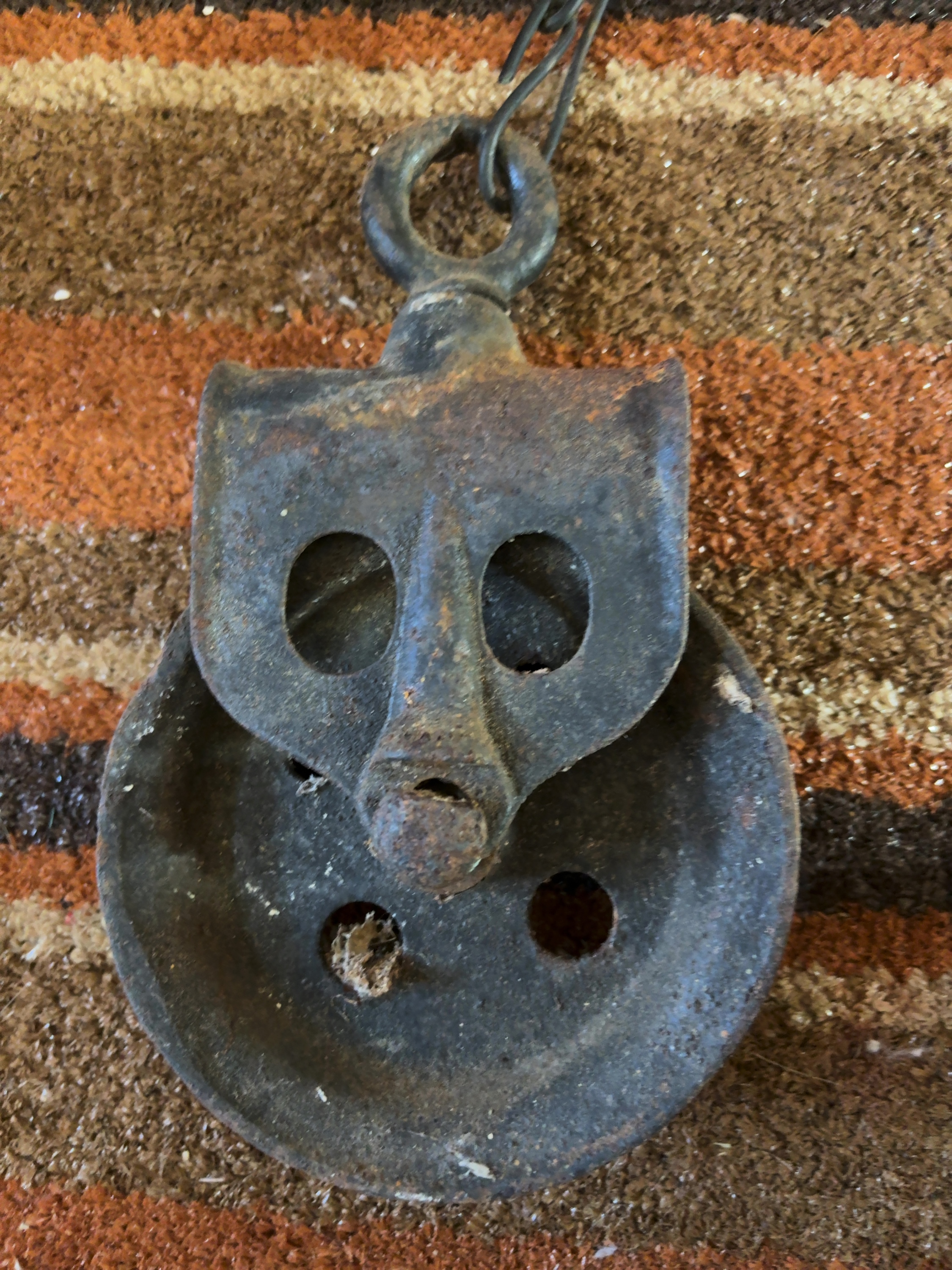 This antique single-sheave block pulley is constructed from a cast iron frame and sheave with a forged iron swivel mounting eye. The side plates exhibit a stylized cloverleaf or face-shaped design typical of American agricultural hardware from the late 19th to early 20th century. This type of pulley was commonly employed in barn hay-lifting systems or for well utility. The unit includes the original side plates, central axle, and a sheave with a deep rope channel. No manufacturer marks, patent dates, or identifying stamps are visible on the metal surfaces.