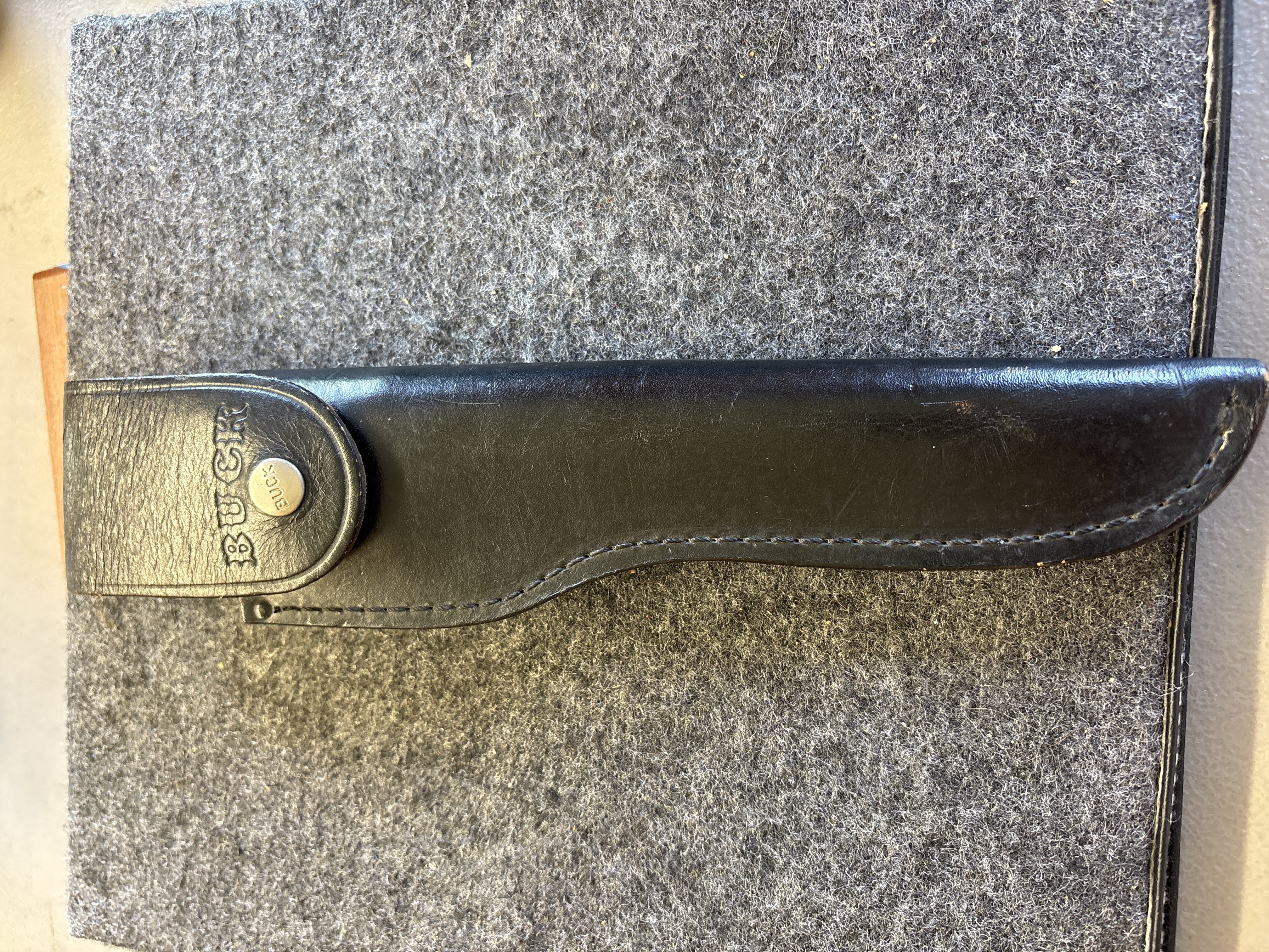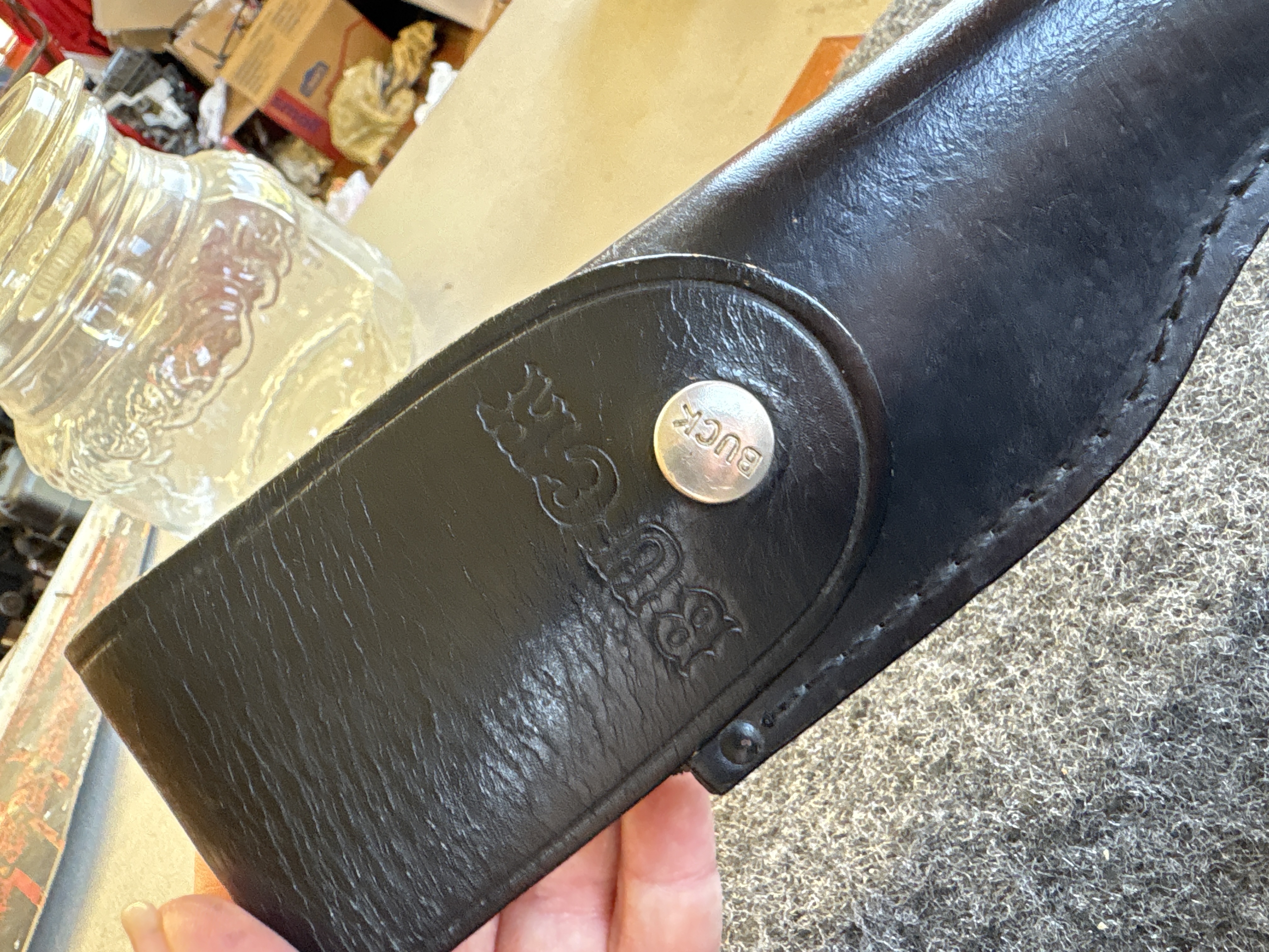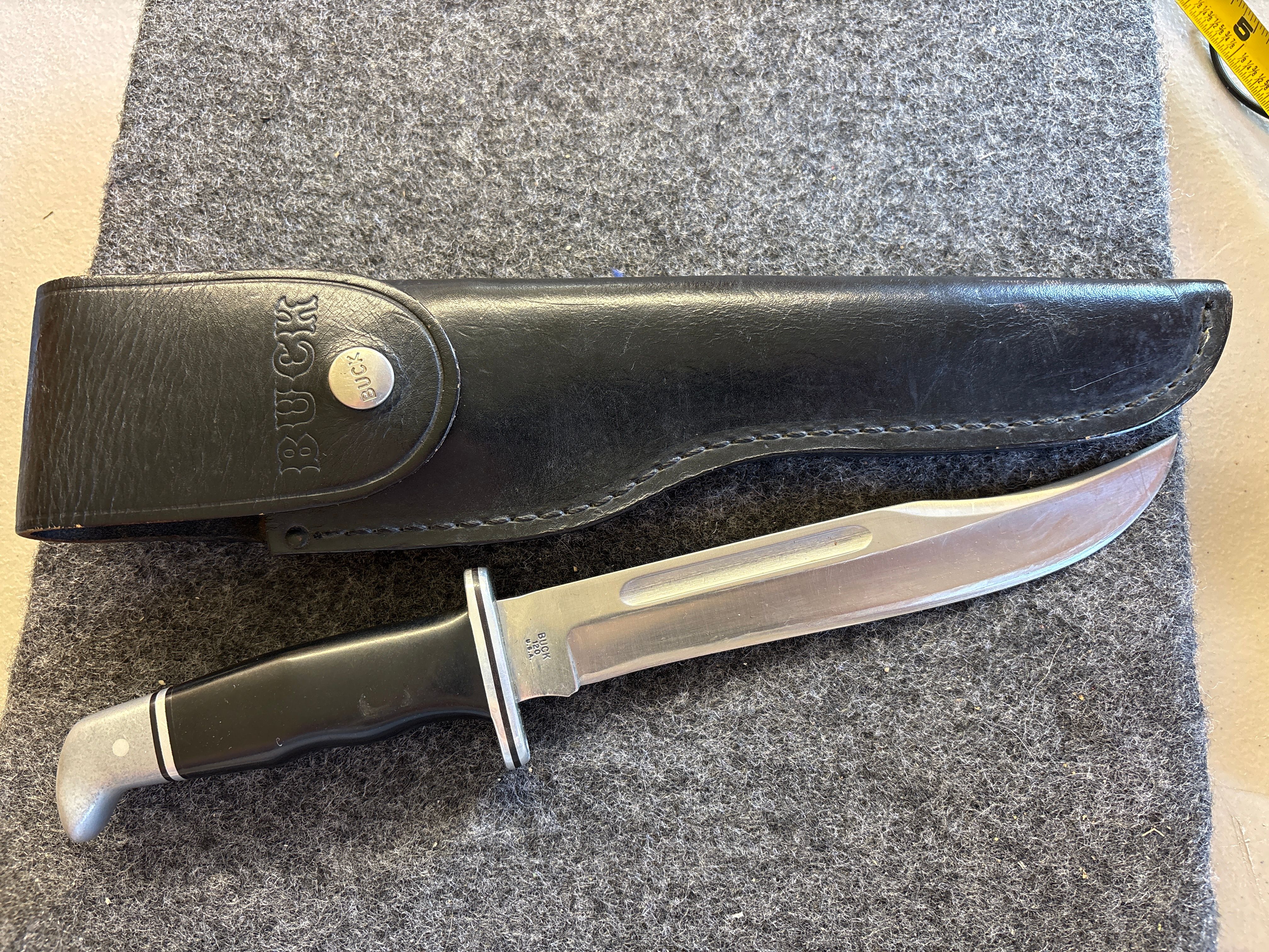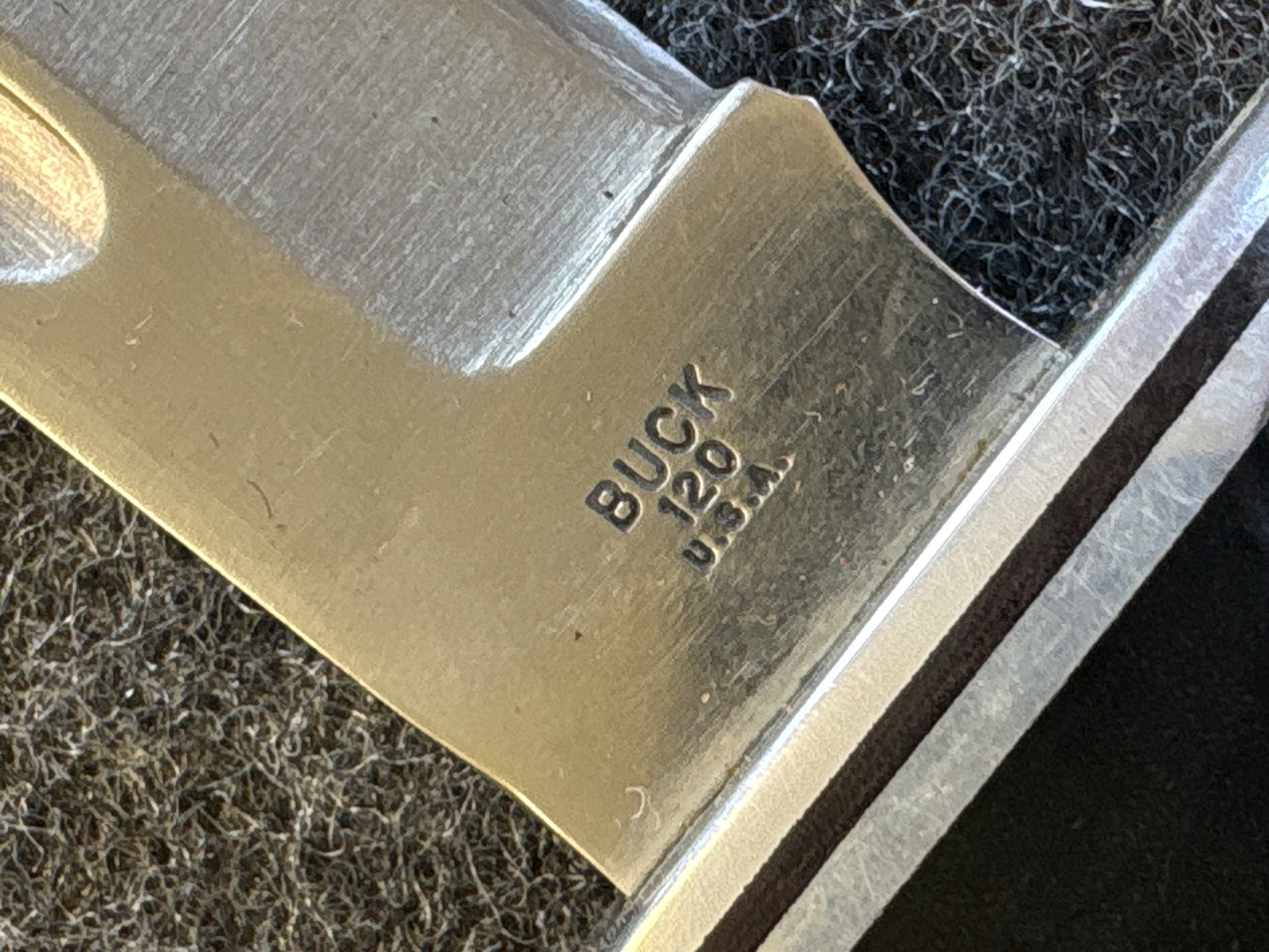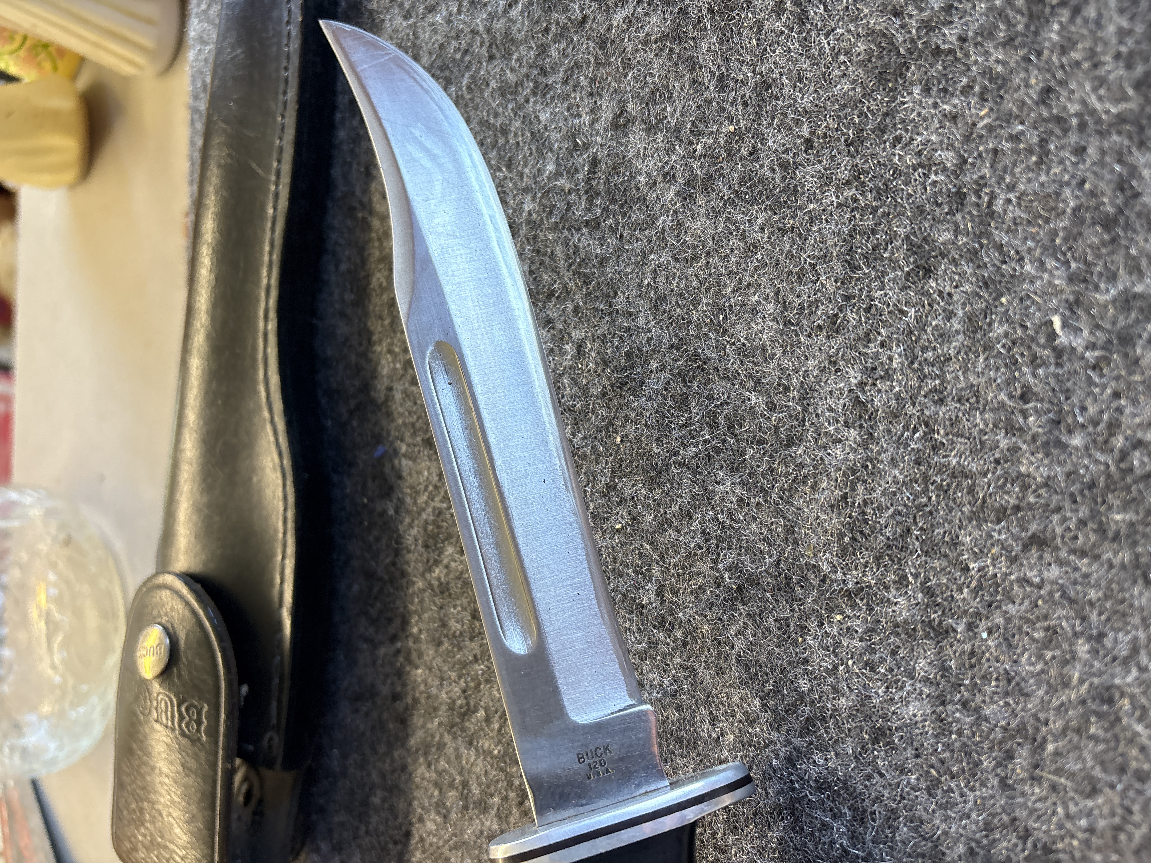 A Buck Knives model 120 General fixed-blade hunting knife. The knife features a clip point steel blade with a satin finish and a single fuller. The tang is marked with a three-line stamp reading BUCK, 120, and U.S.A. The handle is constructed of black phenolic resin with a contoured grip, featuring an aluminum crossguard and a swept aluminum pommel. Black and white spacers are present at the hilt and pommel junctions. The item includes an original black leather fold-over sheath with a belt loop and a snap-closure retaining strap. The sheath features the maker name embossed on the face and snap button, with the model number 120 stamped on the reverse.