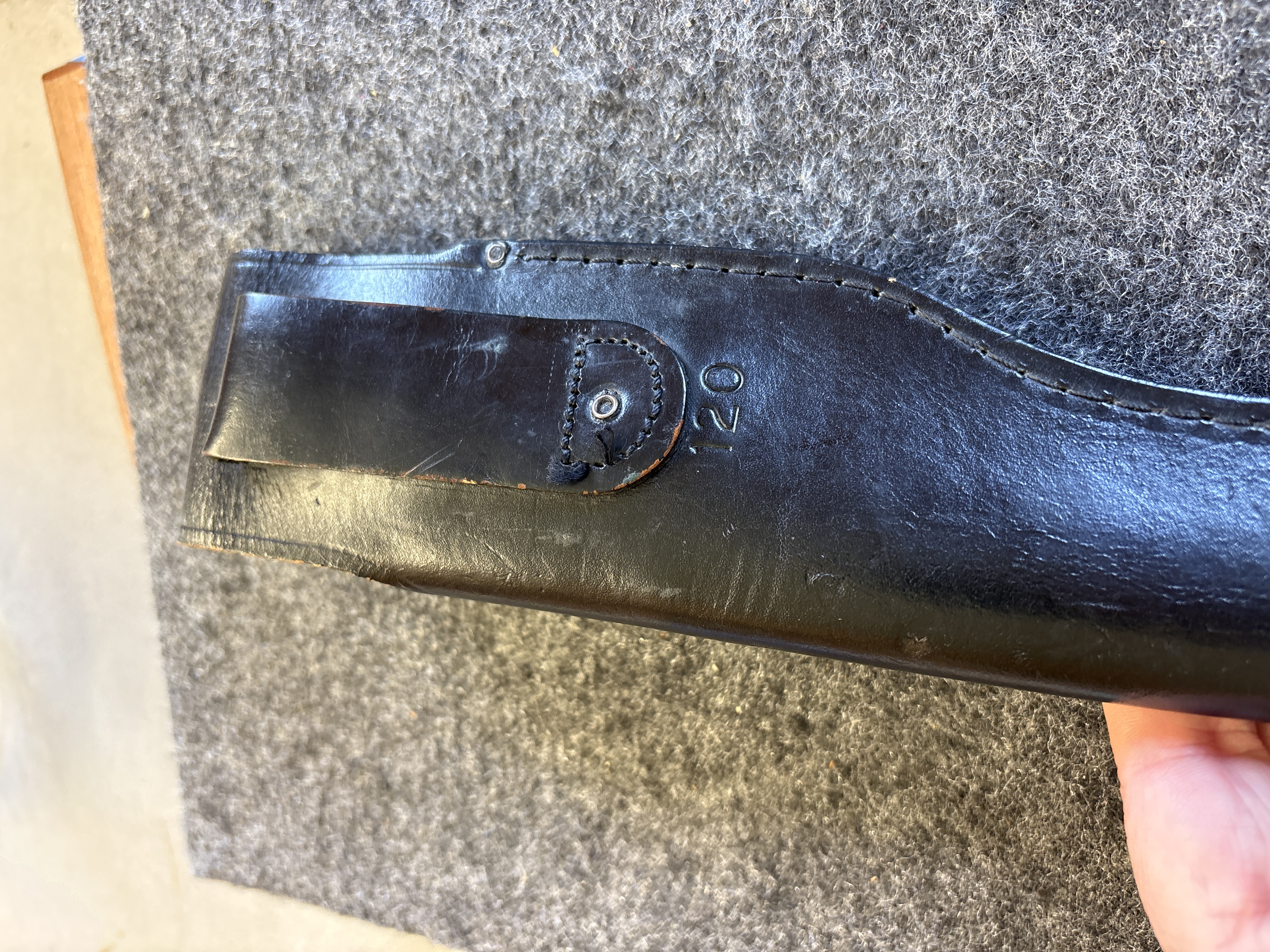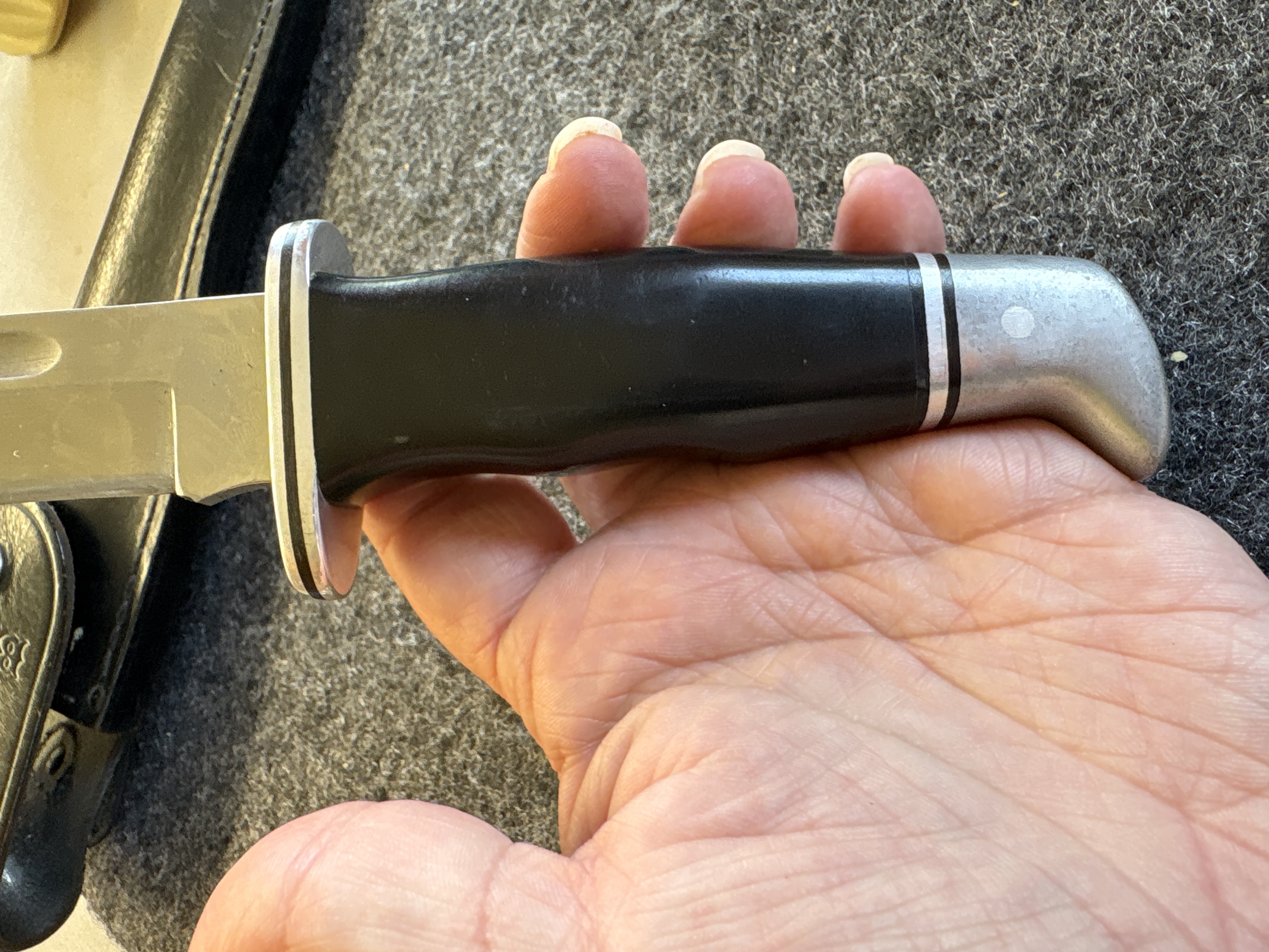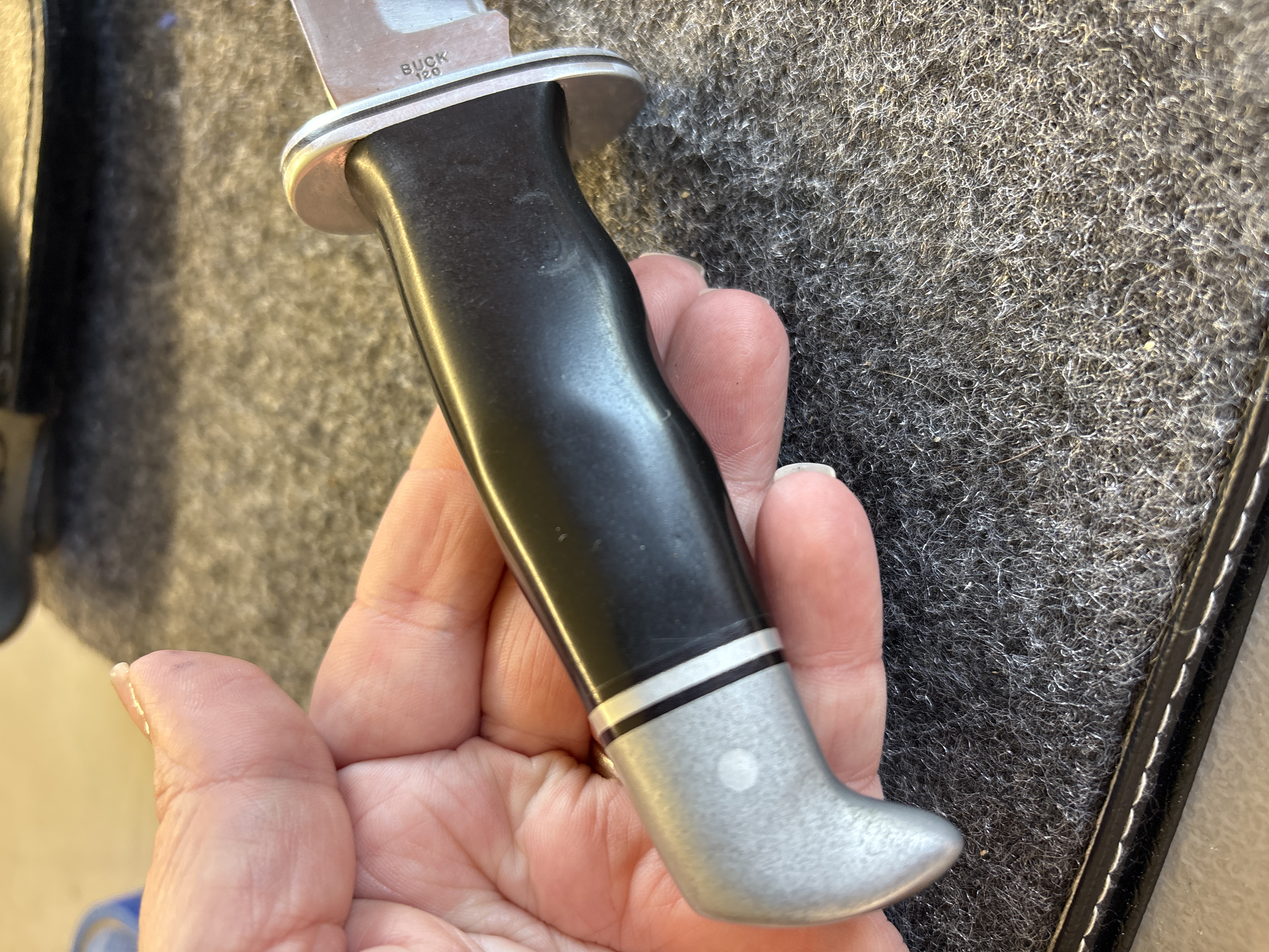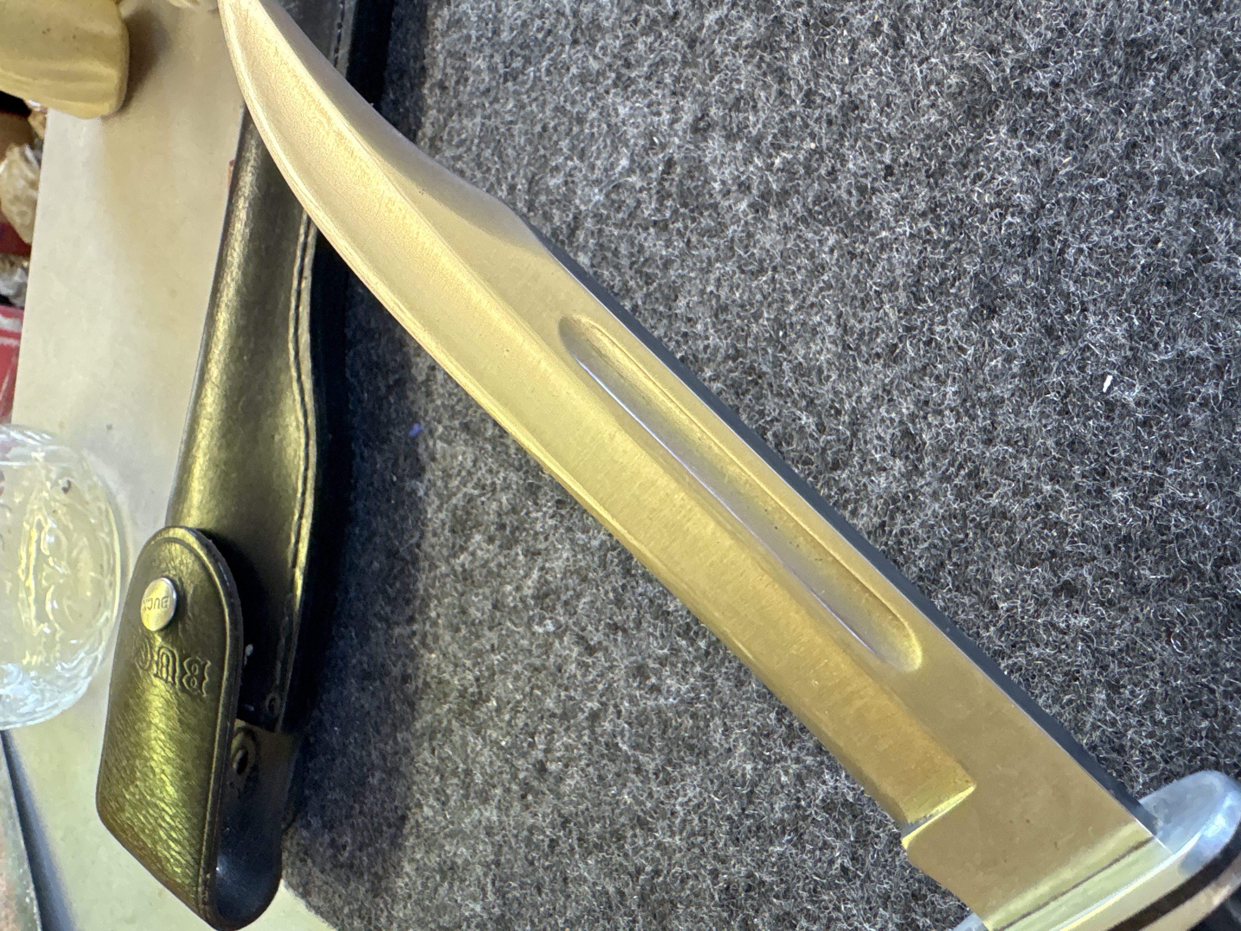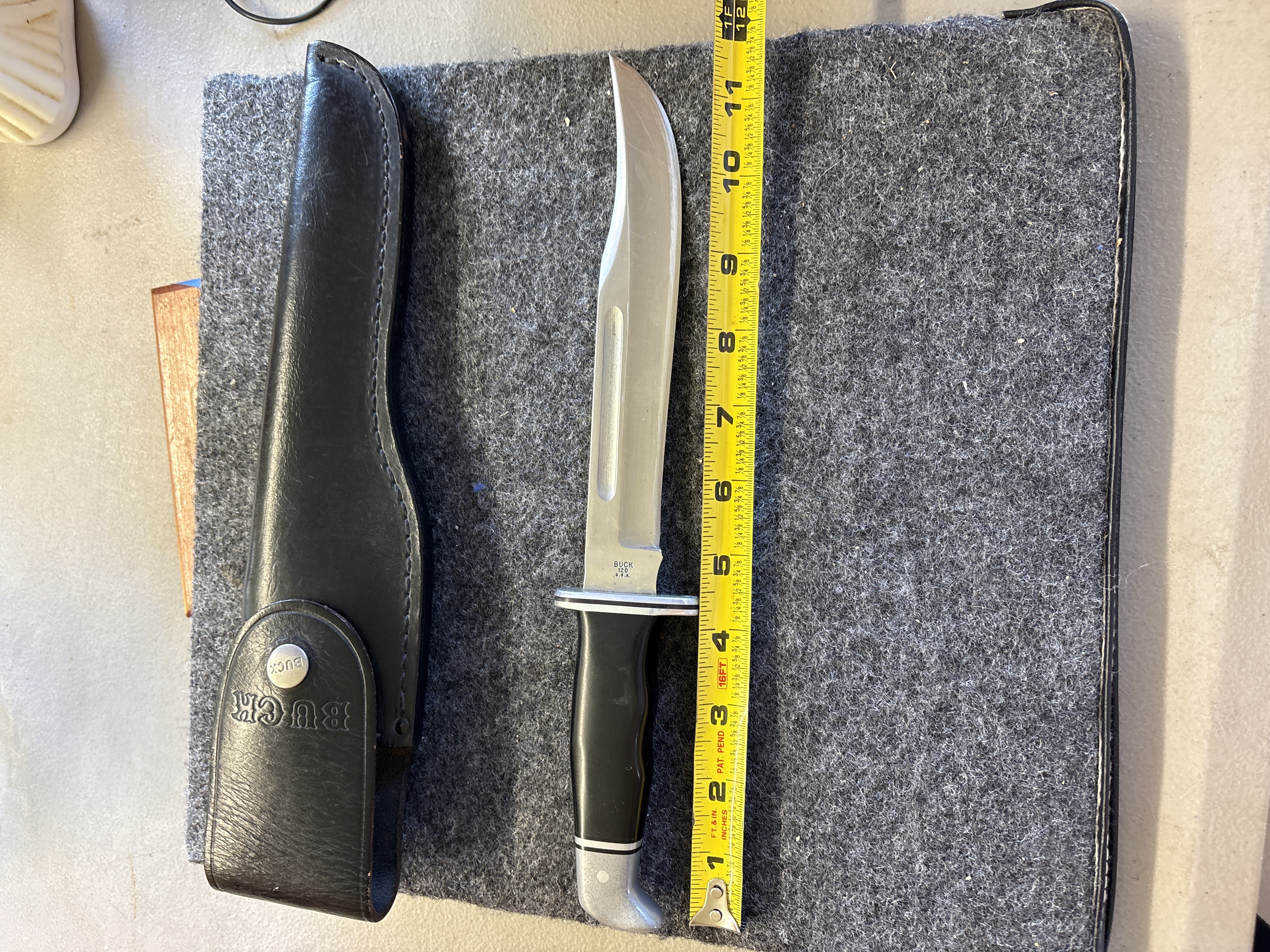 A Buck Knives model 120 General fixed-blade hunting knife. The knife features a clip point steel blade with a satin finish and a single fuller. The tang is marked with a three-line stamp reading BUCK, 120, and U.S.A. The handle is constructed of black phenolic resin with a contoured grip, featuring an aluminum crossguard and a swept aluminum pommel. Black and white spacers are present at the hilt and pommel junctions. The item includes an original black leather fold-over sheath with a belt loop and a snap-closure retaining strap. The sheath features the maker name embossed on the face and snap button, with the model number 120 stamped on the reverse.
