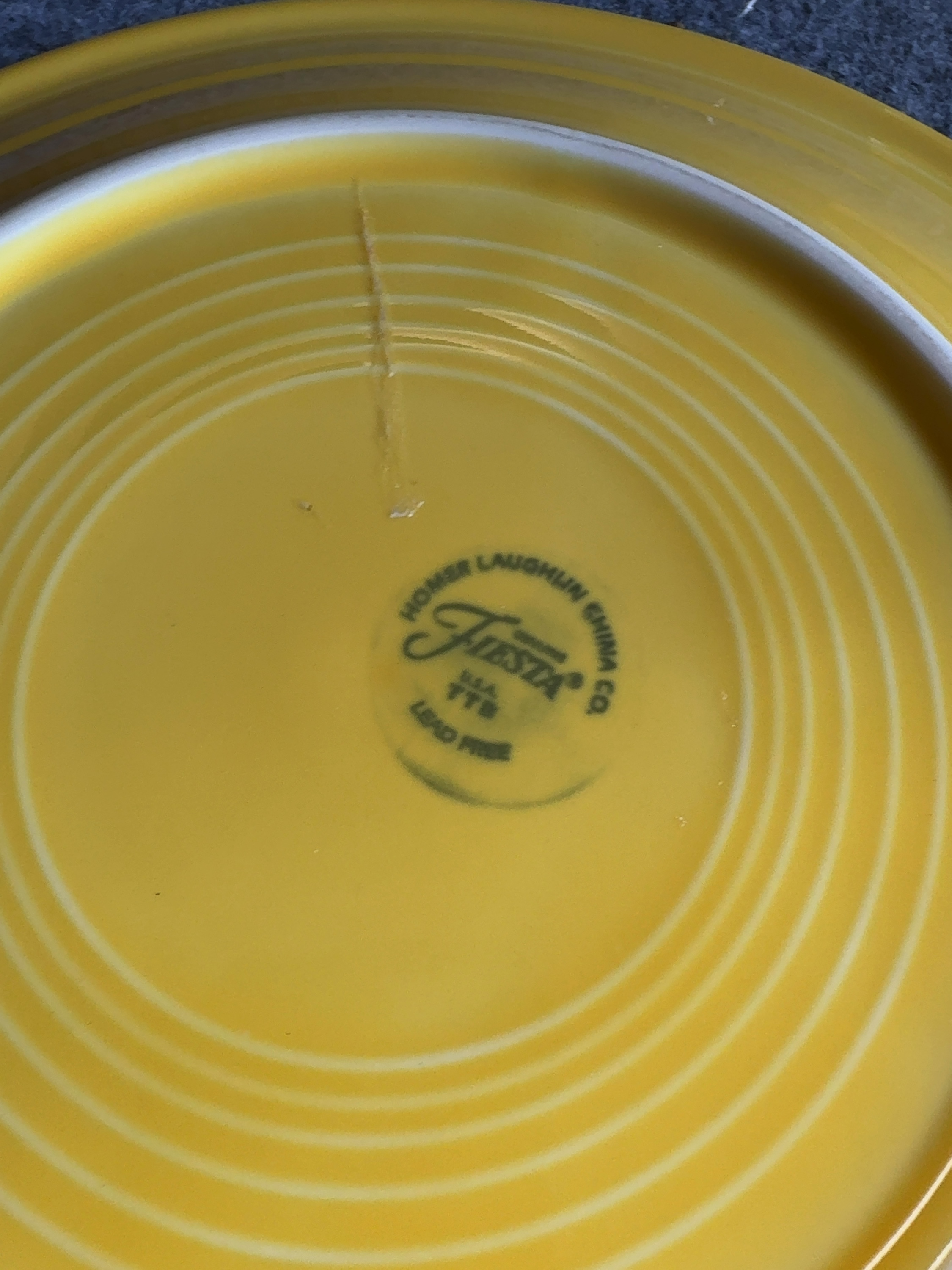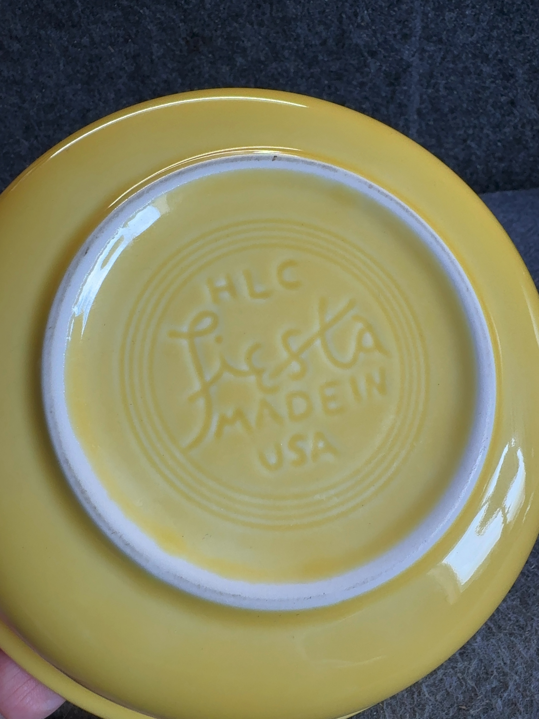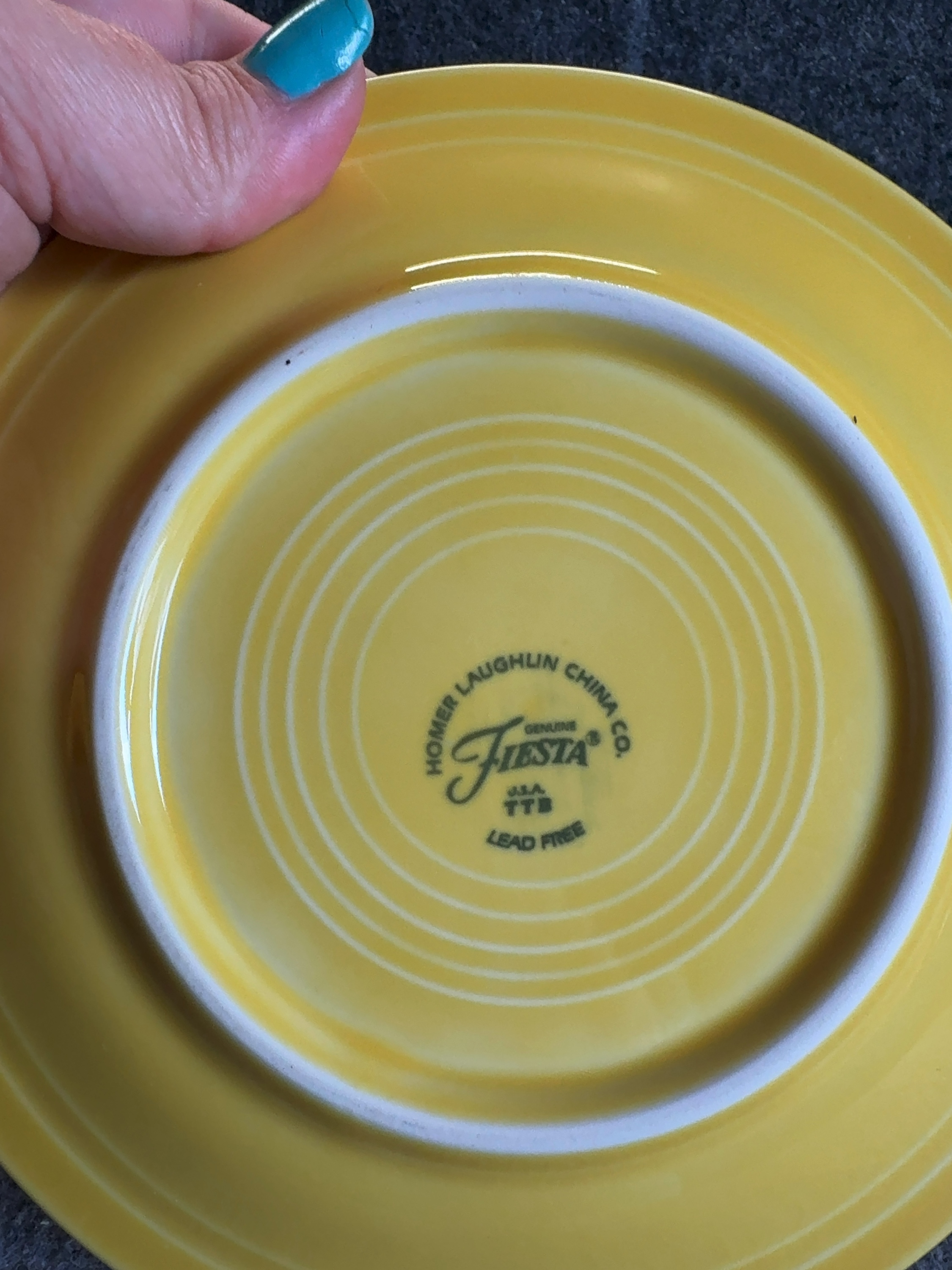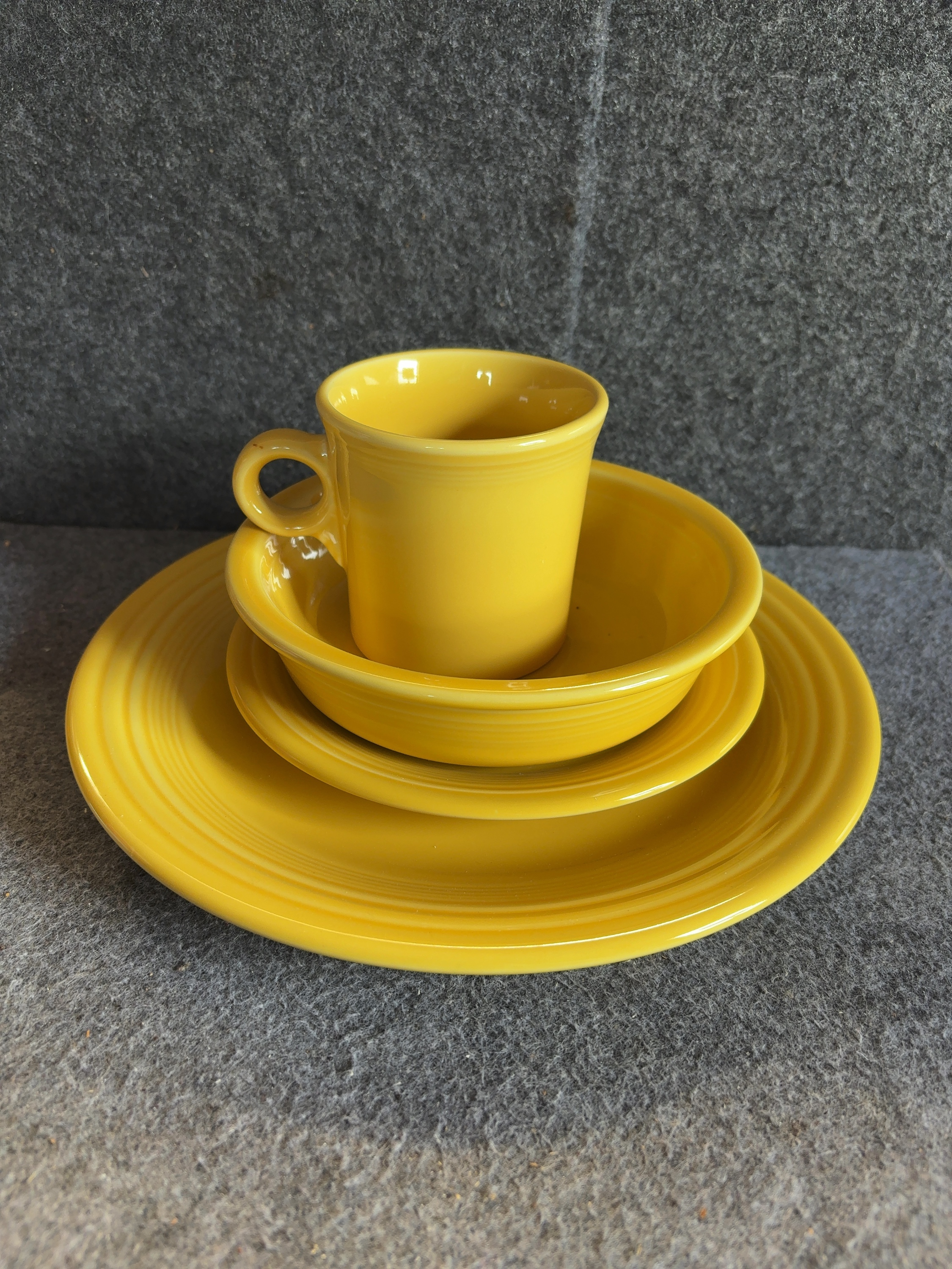 This set of glazed vitreous earthenware is manufactured by the Homer Laughlin China Company in the Fiesta pattern. The items are finished in the Sunflower colorway, a vibrant yellow glaze introduced in 2001. The set consists of a dinner plate, a salad plate, a bowl, and a ring-handle mug, all featuring the characteristic concentric ring detailing. The bases of the dinner and salad plates feature a dark green circular ink stamp reading Homer Laughlin China Co. around the top, Genuine Fiesta in stylized script with a registered trademark symbol, U.S.A. over the date code TTB, and Lead Free at the bottom. The bowl features an incised mark under the glaze reading HLC Fiesta Made in USA. The mug features a faint incised mark reading HLC Fiesta USA.