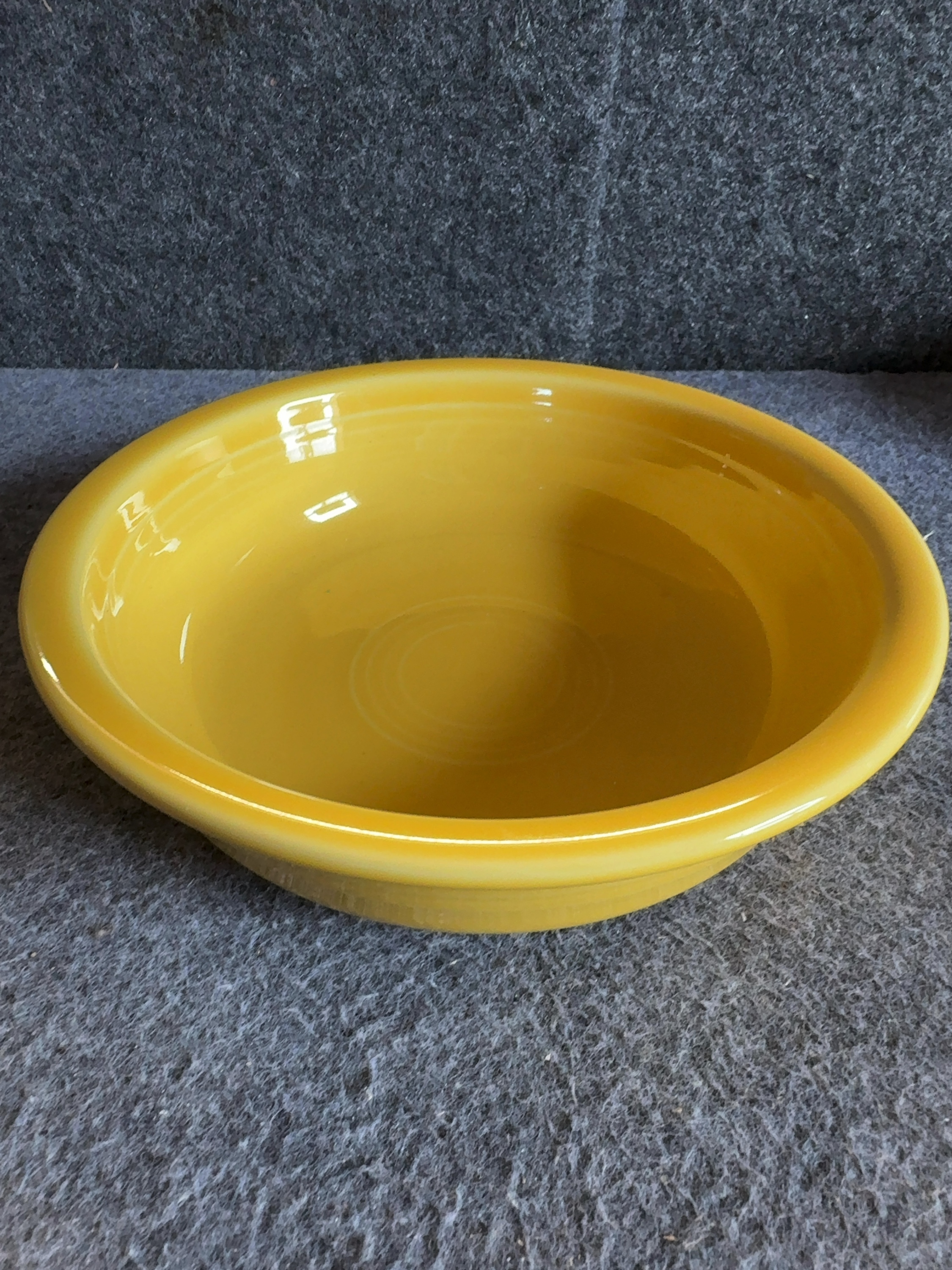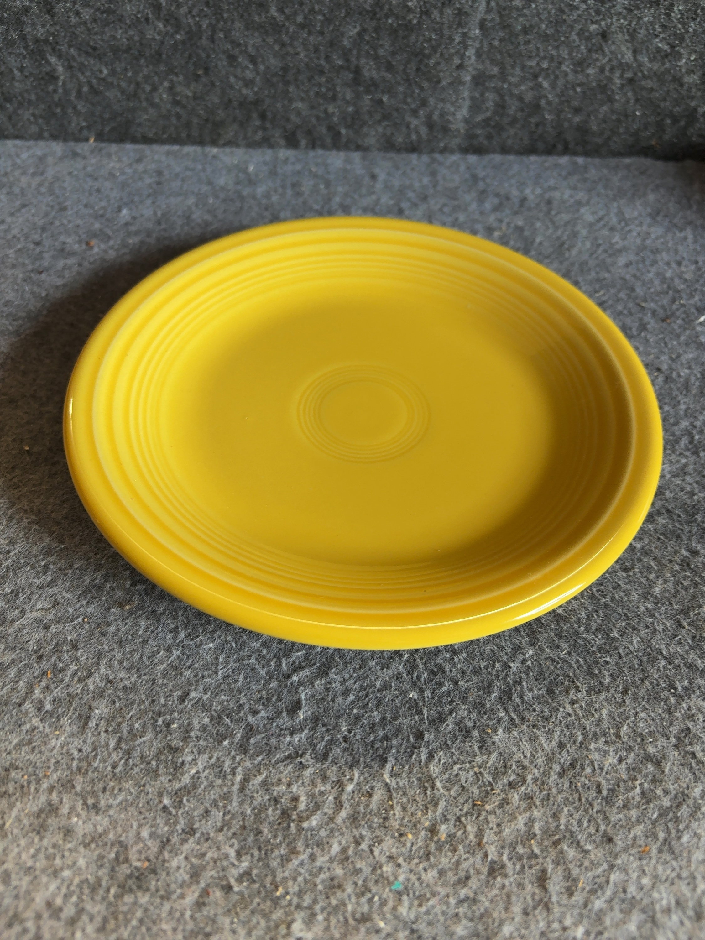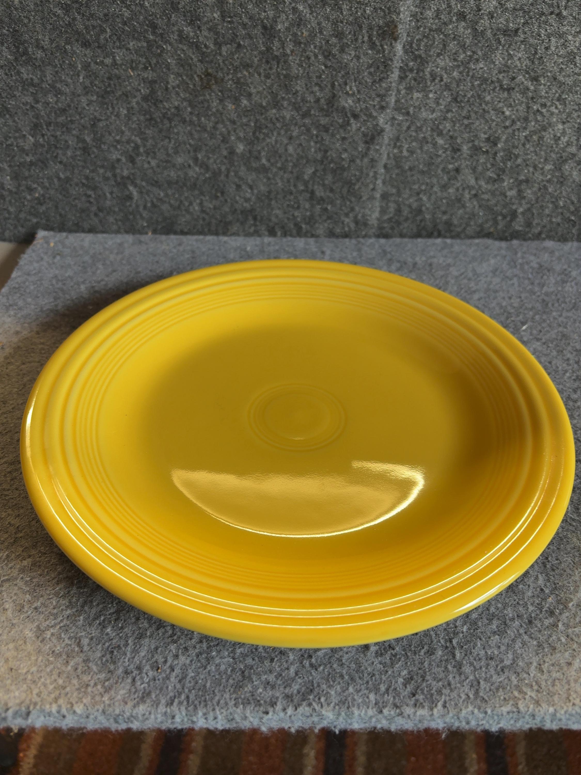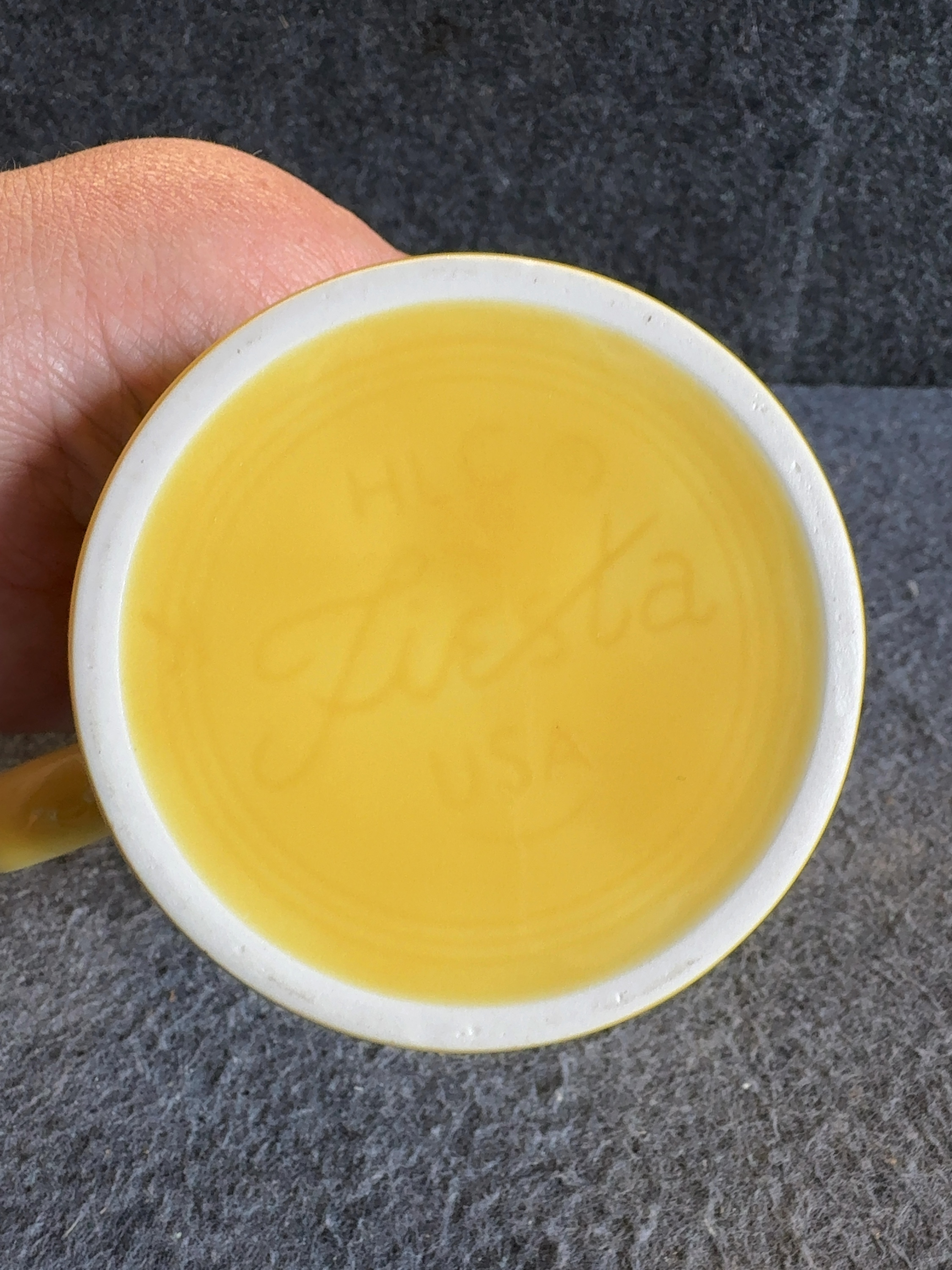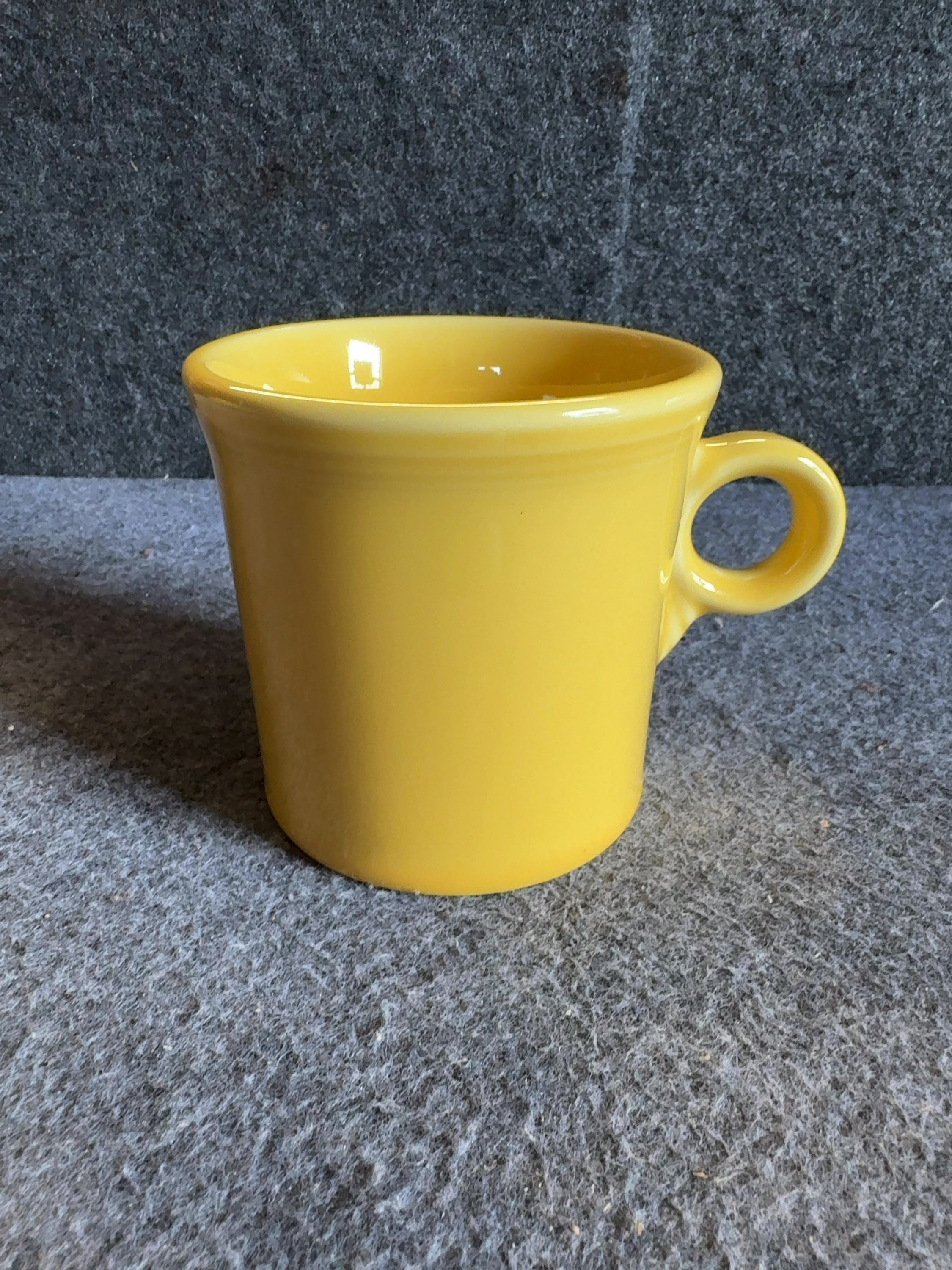This set of glazed vitreous earthenware is manufactured by the Homer Laughlin China Company in the Fiesta pattern. The items are finished in the Sunflower colorway, a vibrant yellow glaze introduced in 2001. The set consists of a dinner plate, a salad plate, a bowl, and a ring-handle mug, all featuring the characteristic concentric ring detailing. The bases of the dinner and salad plates feature a dark green circular ink stamp reading Homer Laughlin China Co. around the top, Genuine Fiesta in stylized script with a registered trademark symbol, U.S.A. over the date code TTB, and Lead Free at the bottom. The bowl features an incised mark under the glaze reading HLC Fiesta Made in USA. The mug features a faint incised mark reading HLC Fiesta USA.