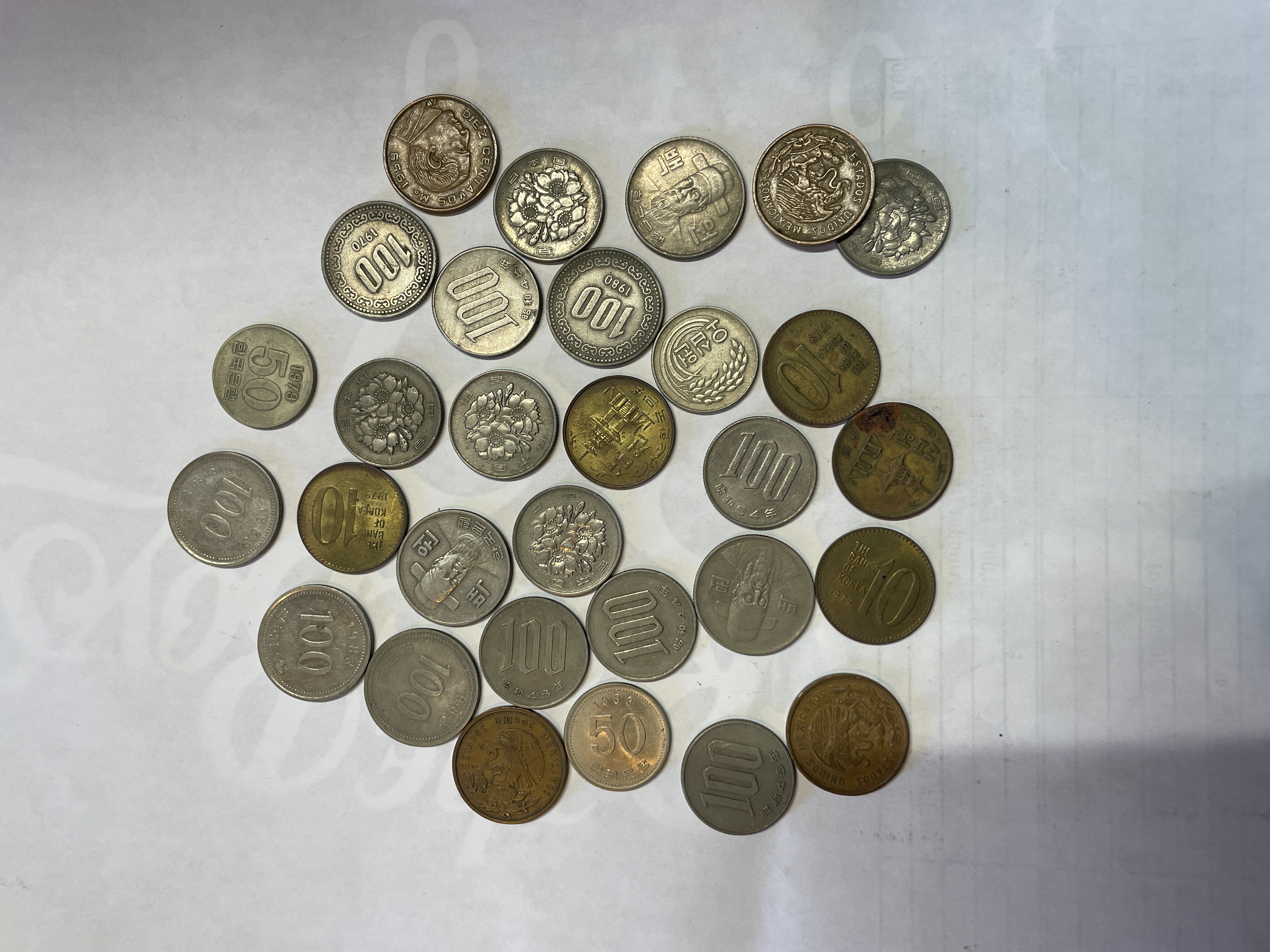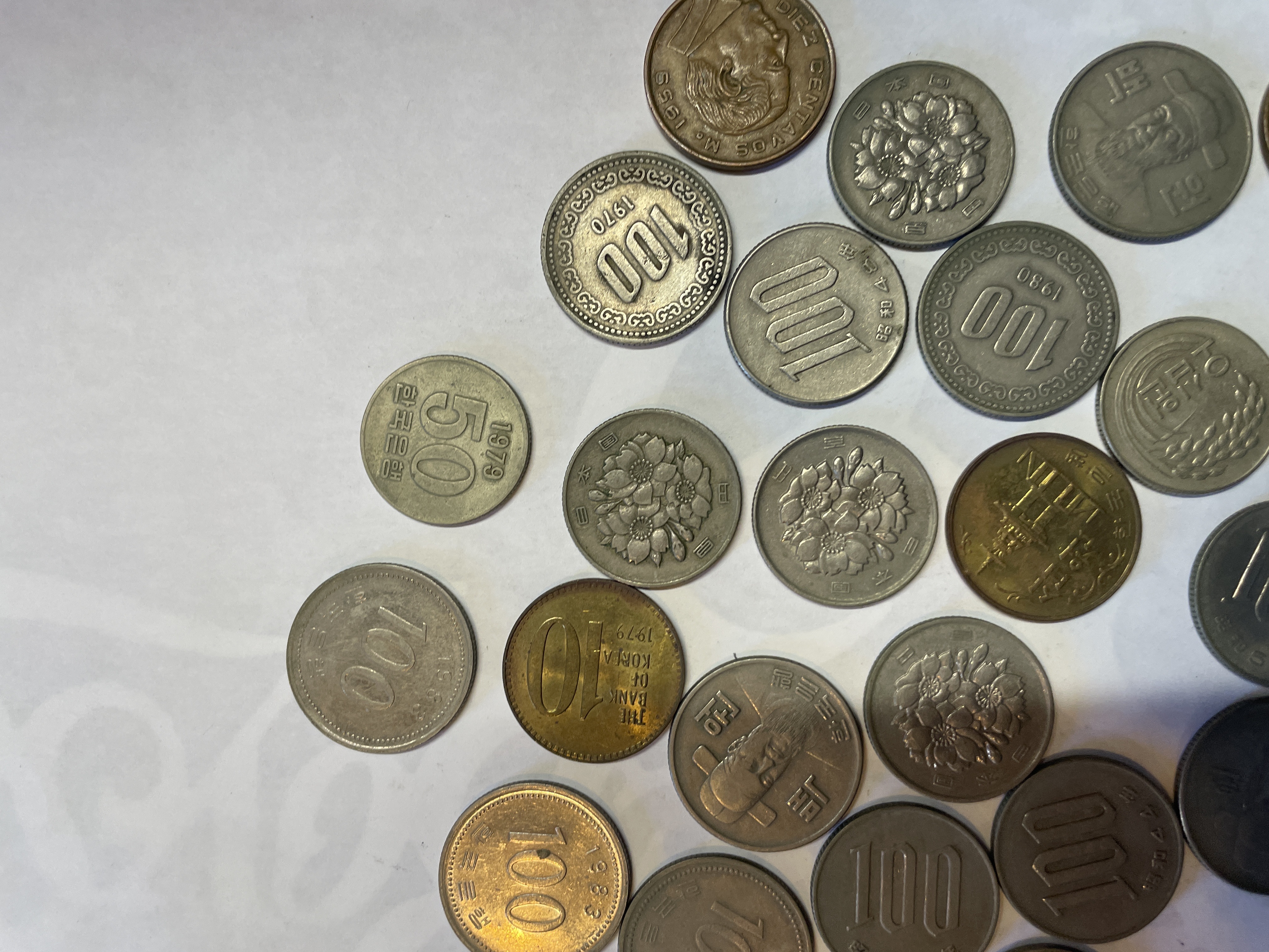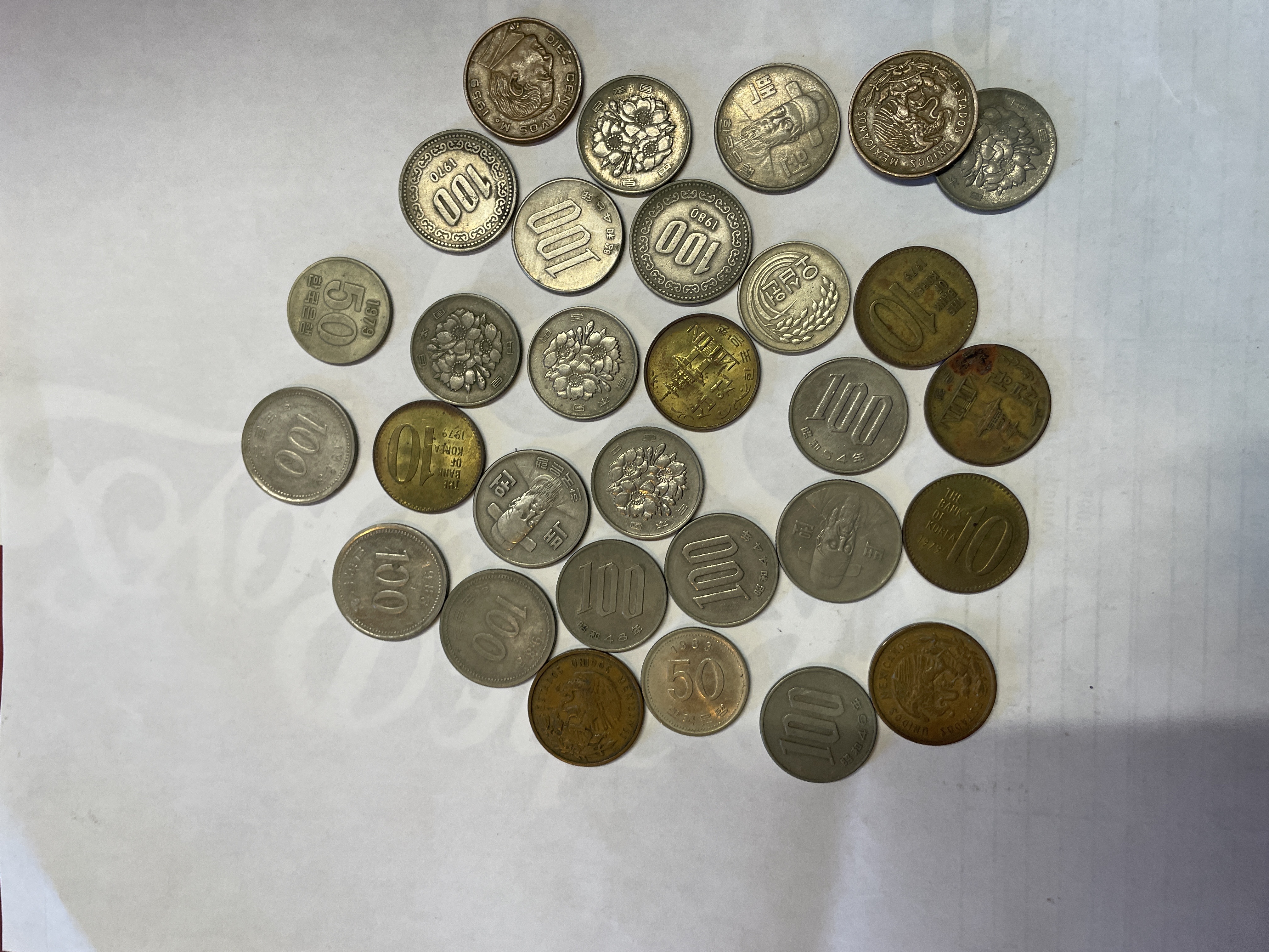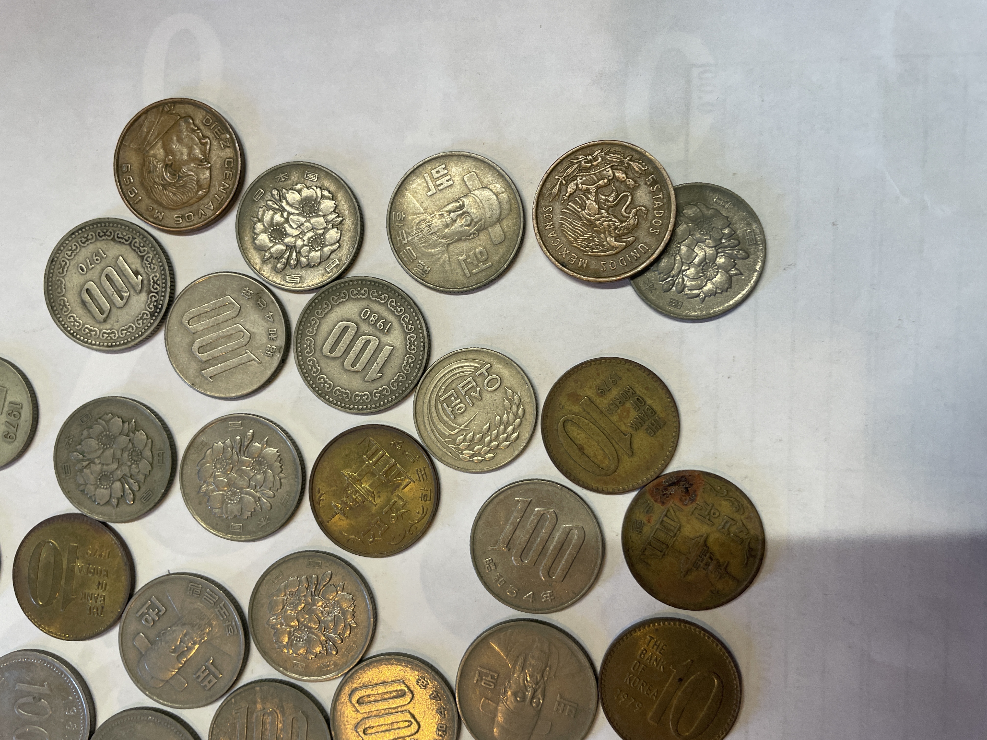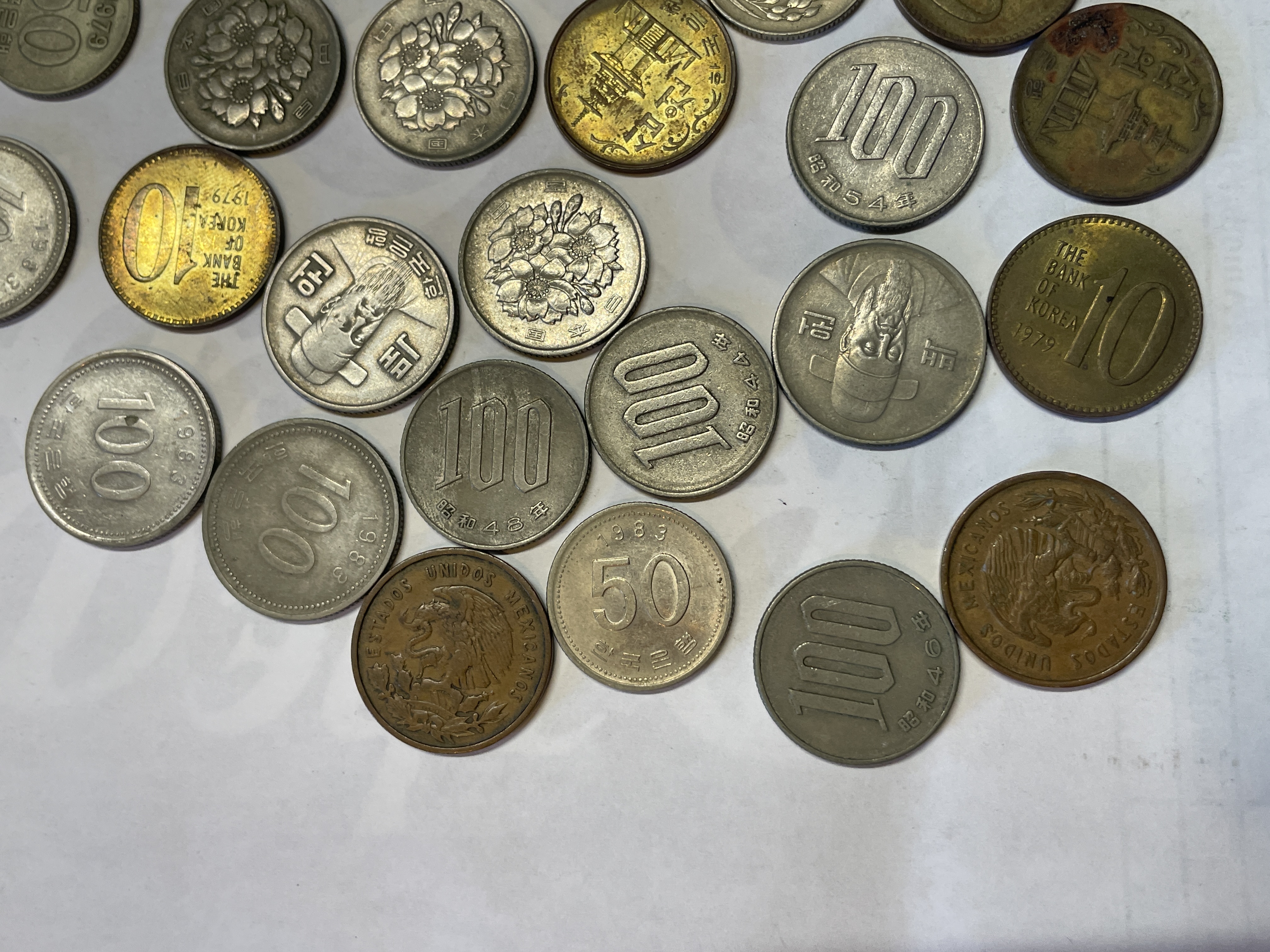 A collection of international coins from Mexico, South Korea, and Japan featuring various denominations in silver, gold, and copper tones.