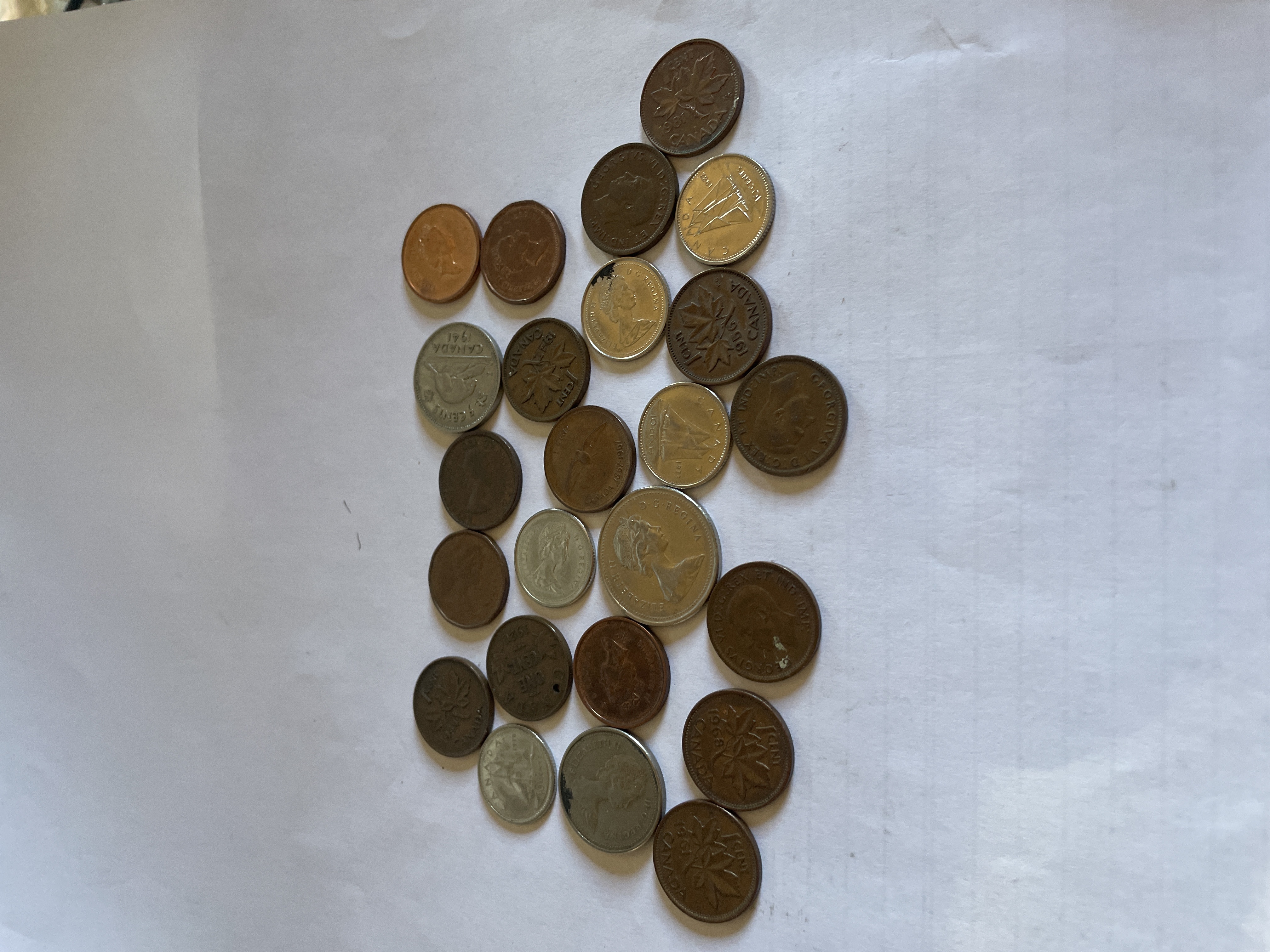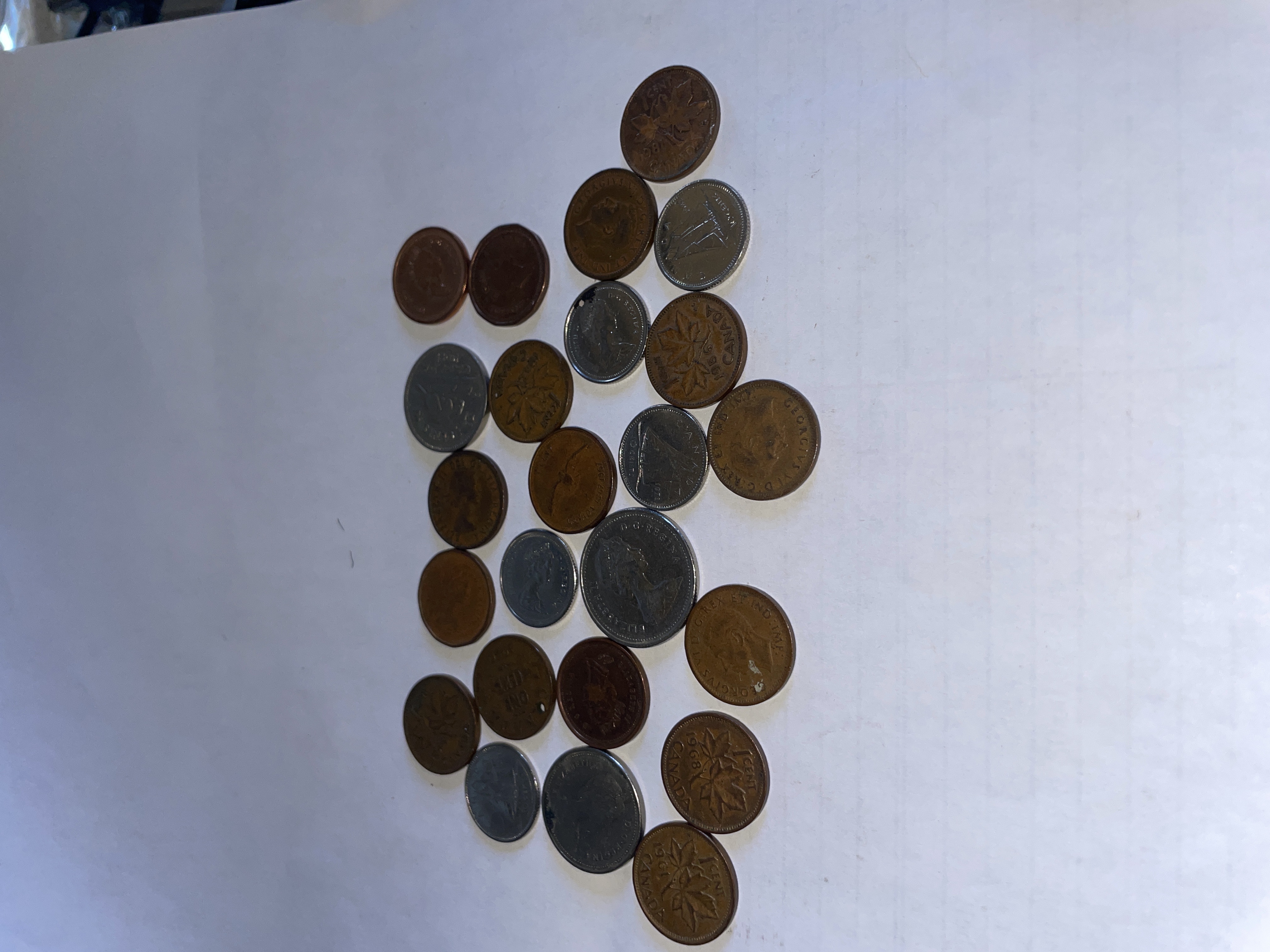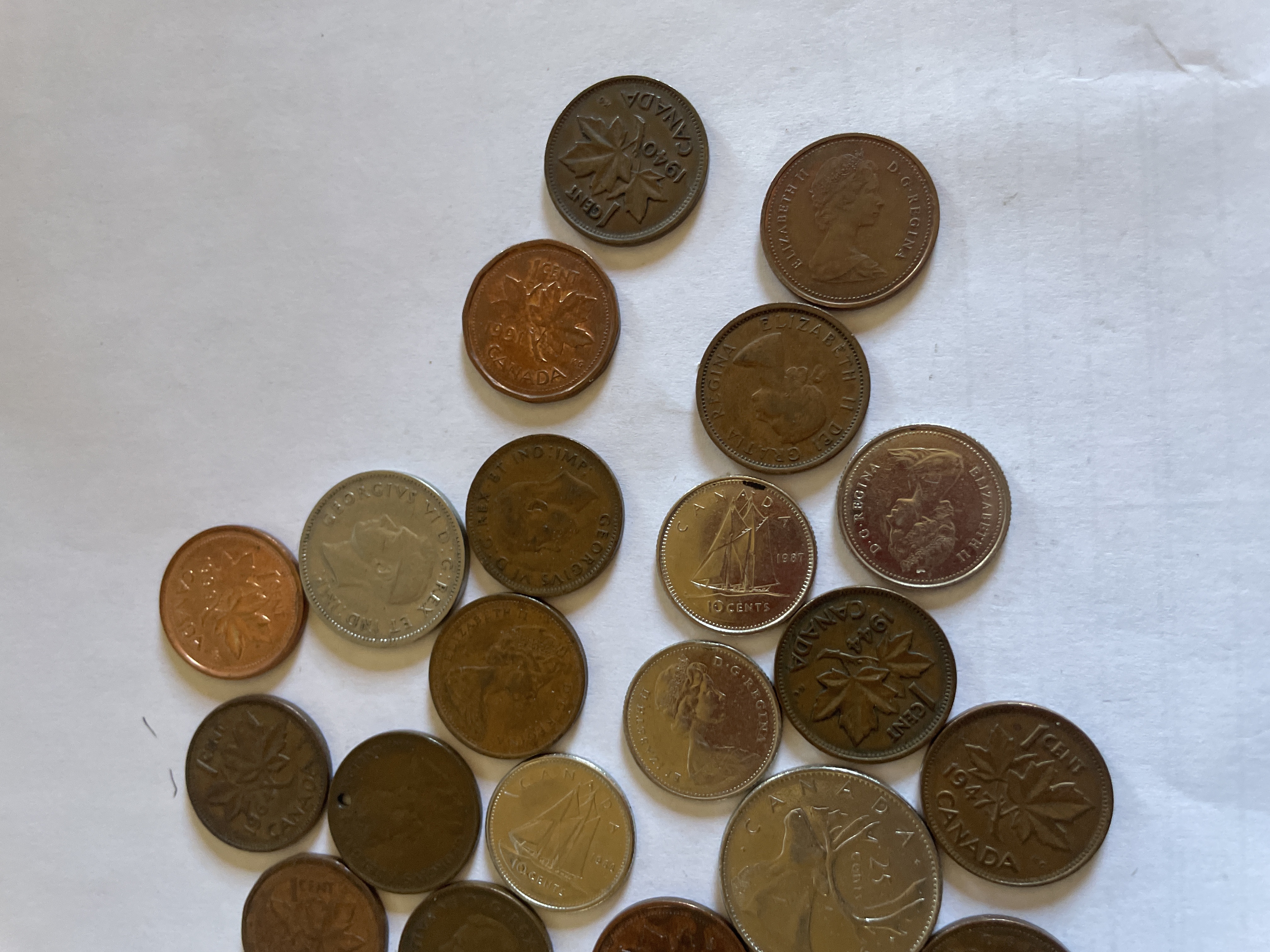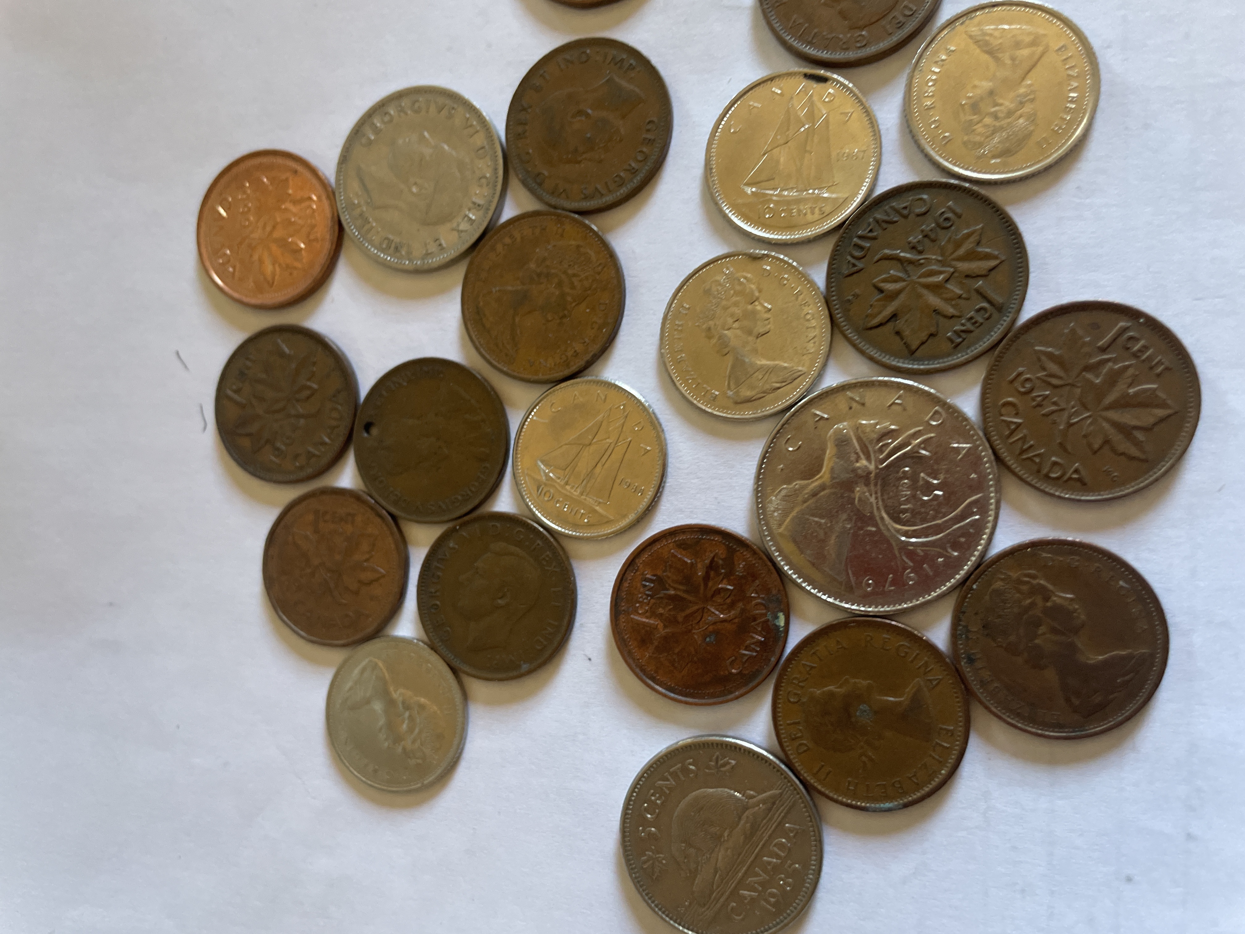A collection of copper and silver-colored Canadian currency including various denominations such as 1 cent, 5 cents, 10 cents, and 25 cents featuring portraits of Elizabeth II and George VI.