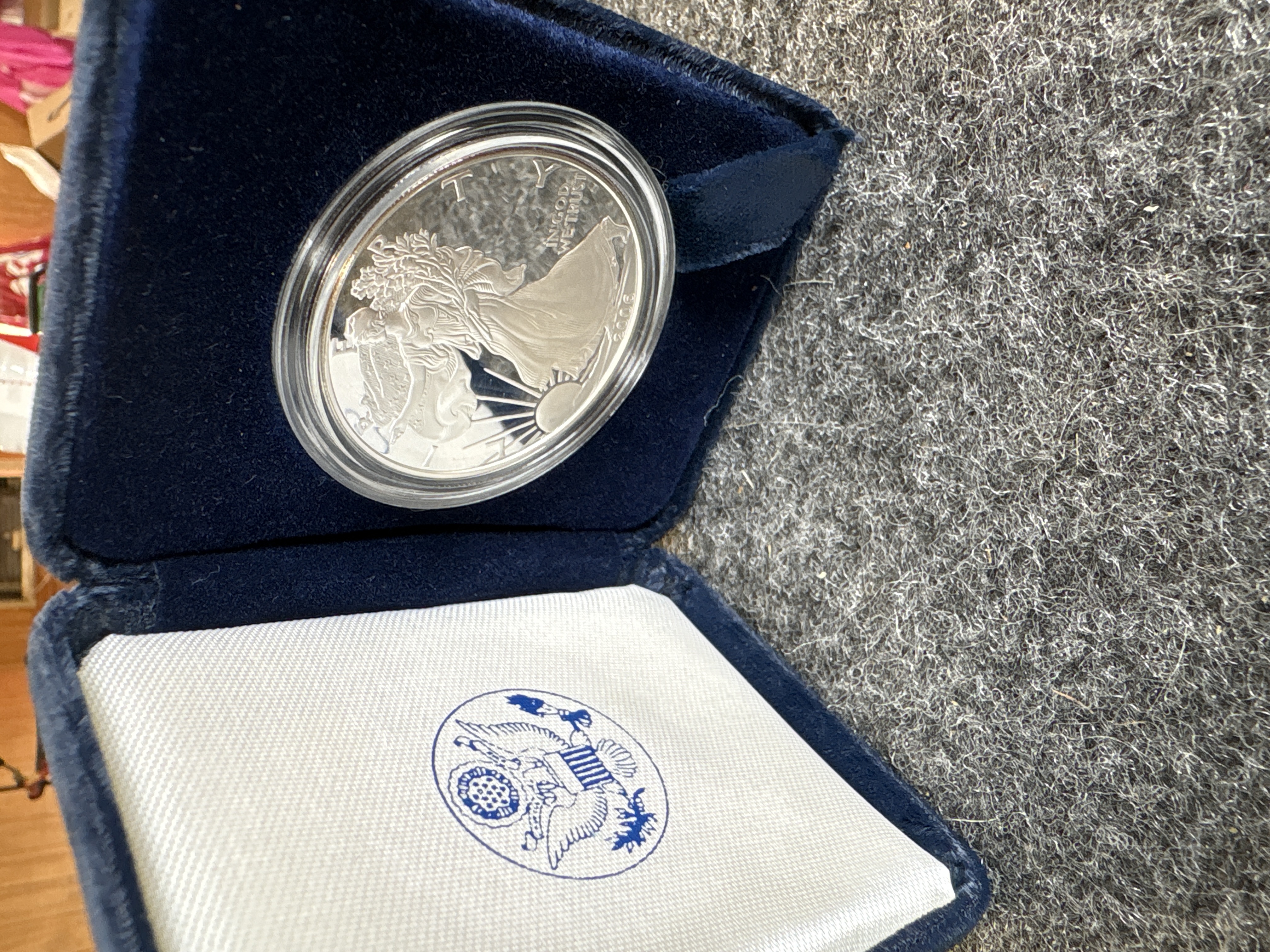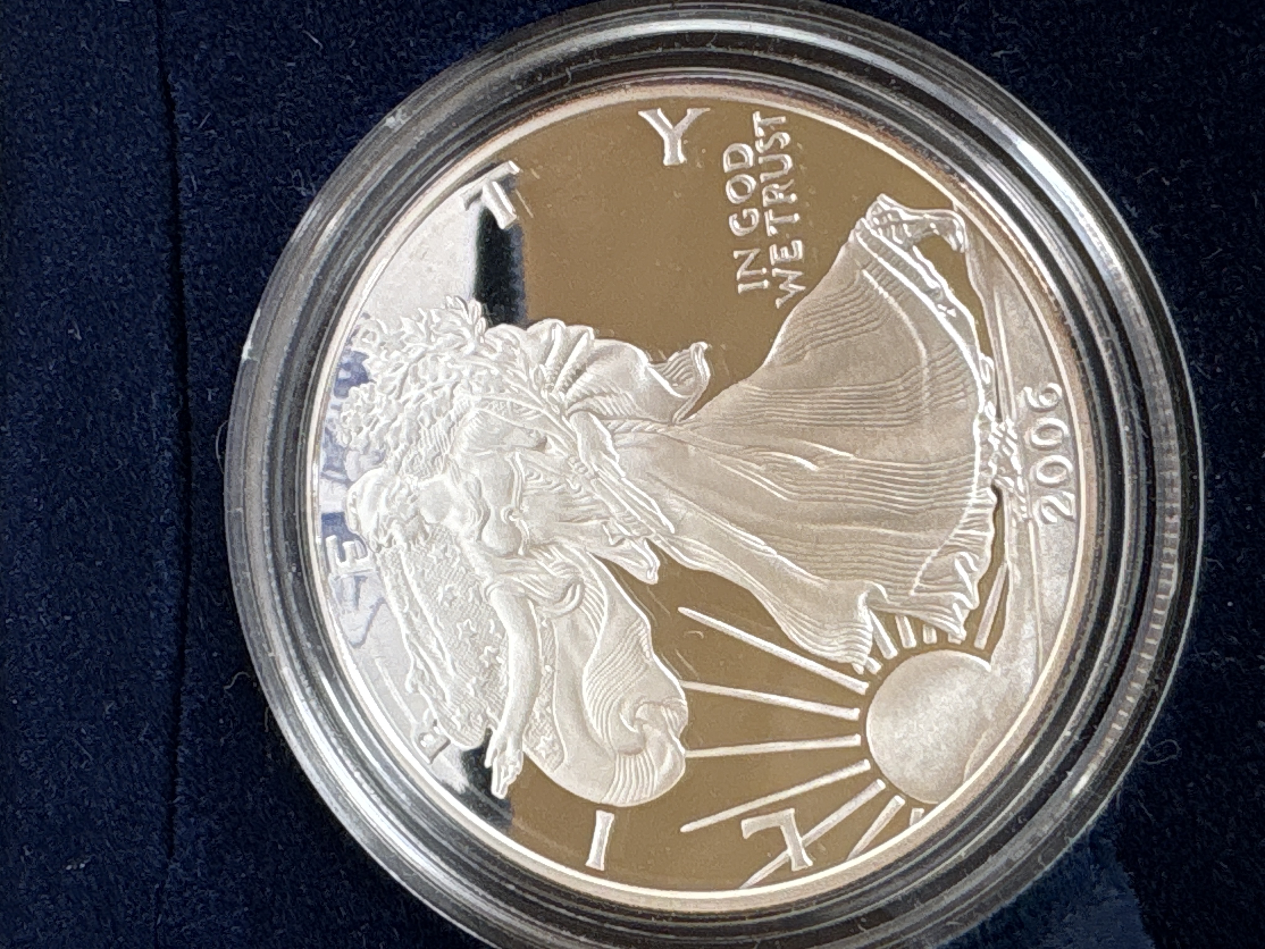 A 2006-W American Silver Eagle proof coin struck in .999 fine silver. The obverse features the Walking Liberty design with the inscriptions LIBERTY, IN GOD WE TRUST, and the date 2006. The reverse displays a heraldic eagle with a shield beneath thirteen stars, the W mint mark for the West Point Mint, and the text UNITED STATES OF AMERICA and 1 OZ. FINE SILVER~ONE DOLLAR. The coin is housed in a clear protective capsule and a blue velvet-lined presentation case featuring a silver-toned Great Seal of the United States on the exterior lid and a printed blue seal on the interior satin lining.