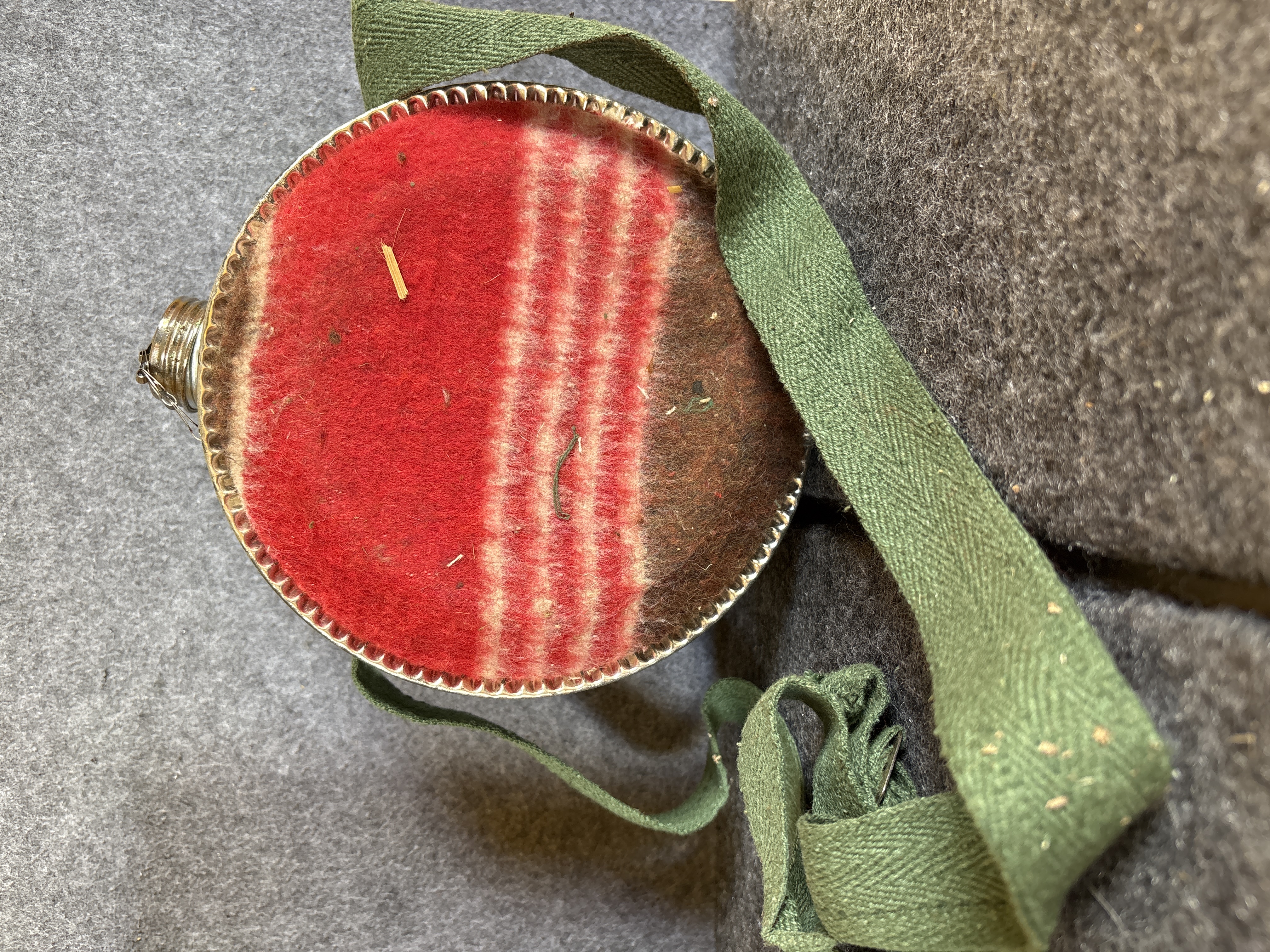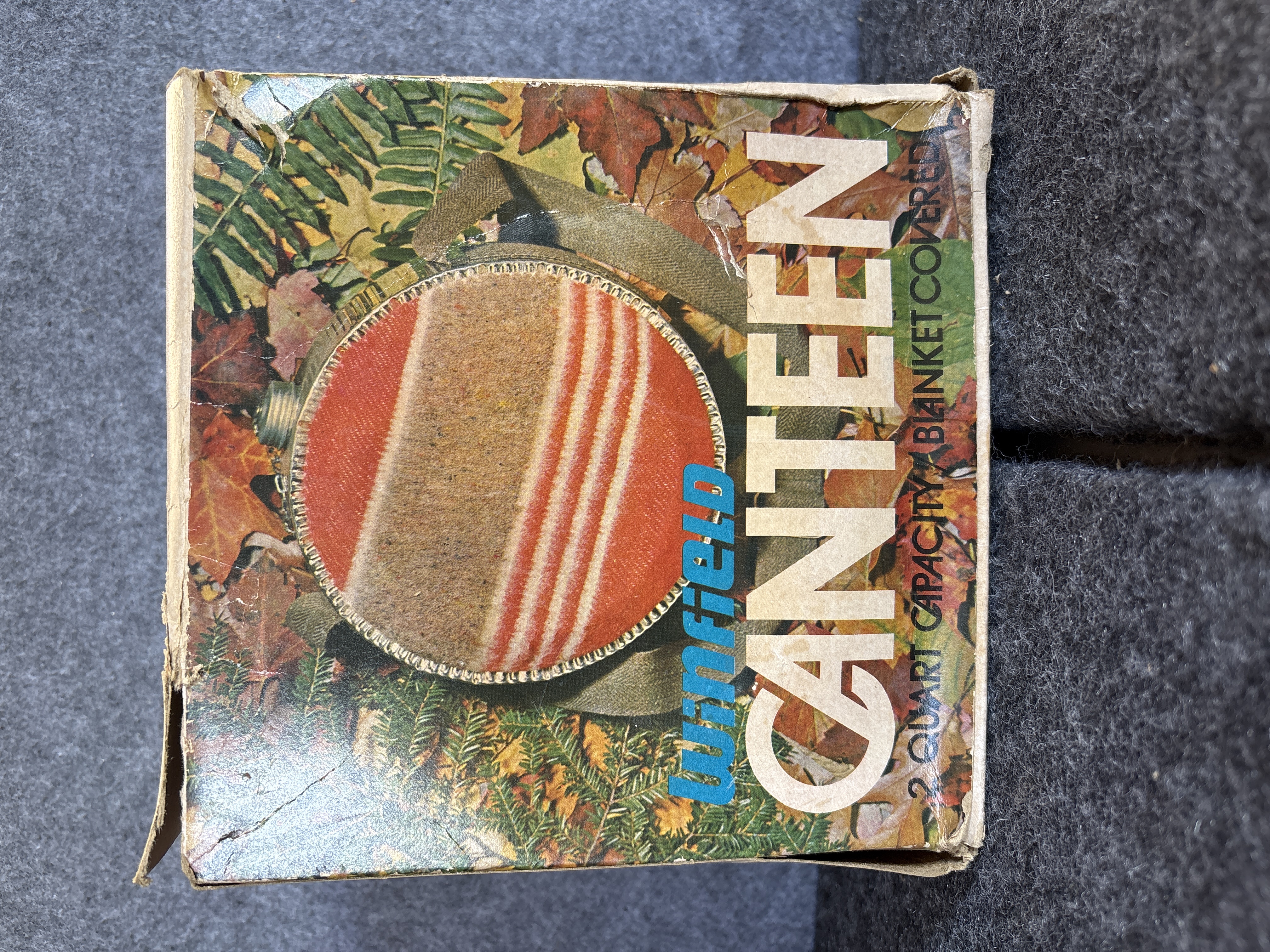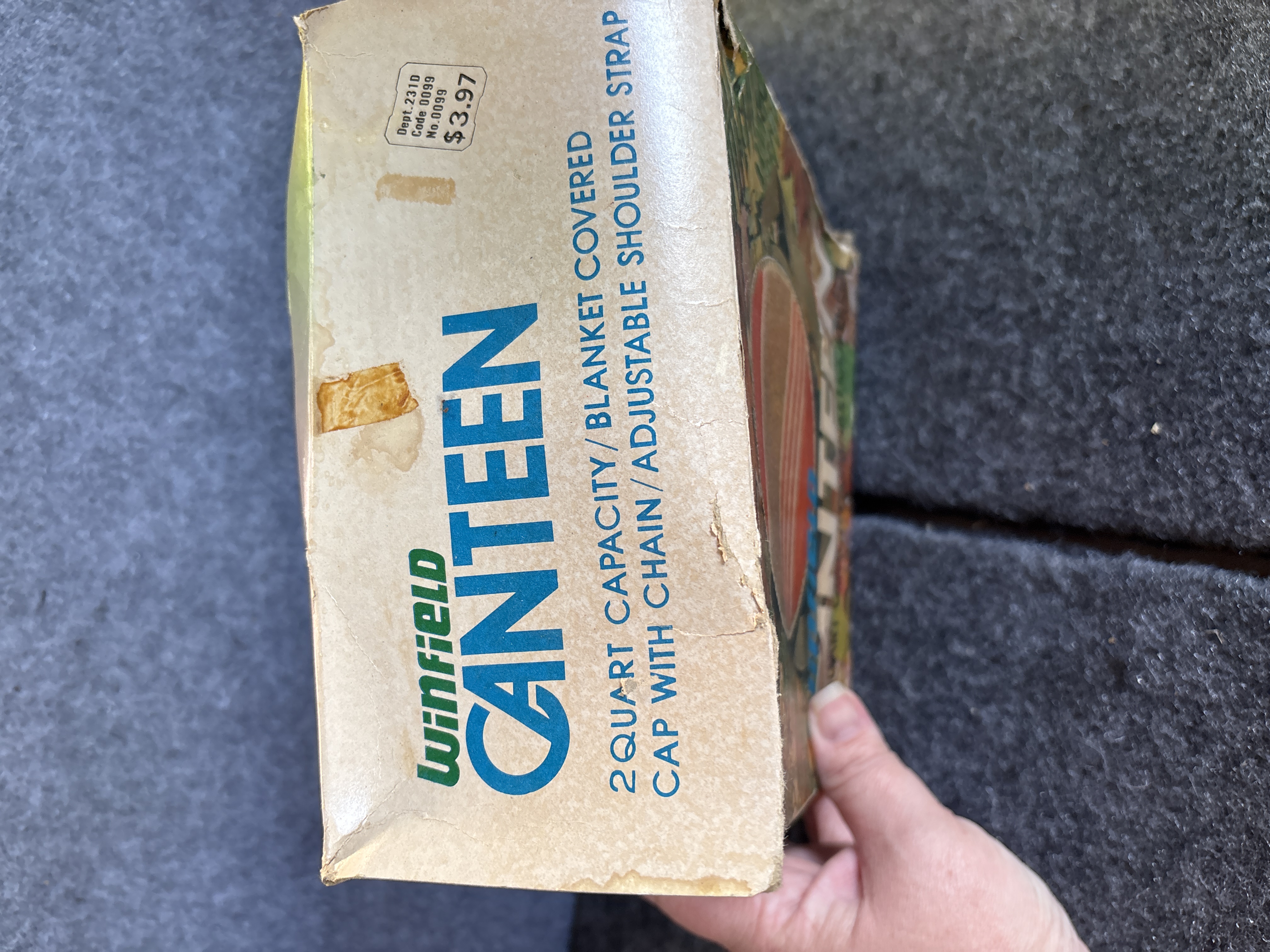 A vintage Winfield brand 2-quart capacity canteen featuring a ribbed metal body and a striped felt blanket cover. The canteen is equipped with a metal screw-on cap secured by a metal link chain and an adjustable green canvas shoulder strap. The felt cover is decorated with a pattern of red, brown, and cream stripes. The metal cap is embossed with the text MADE IN TAIWAN. This item includes its original cardboard retail box which features color graphics and a vintage price tag of $3.97.