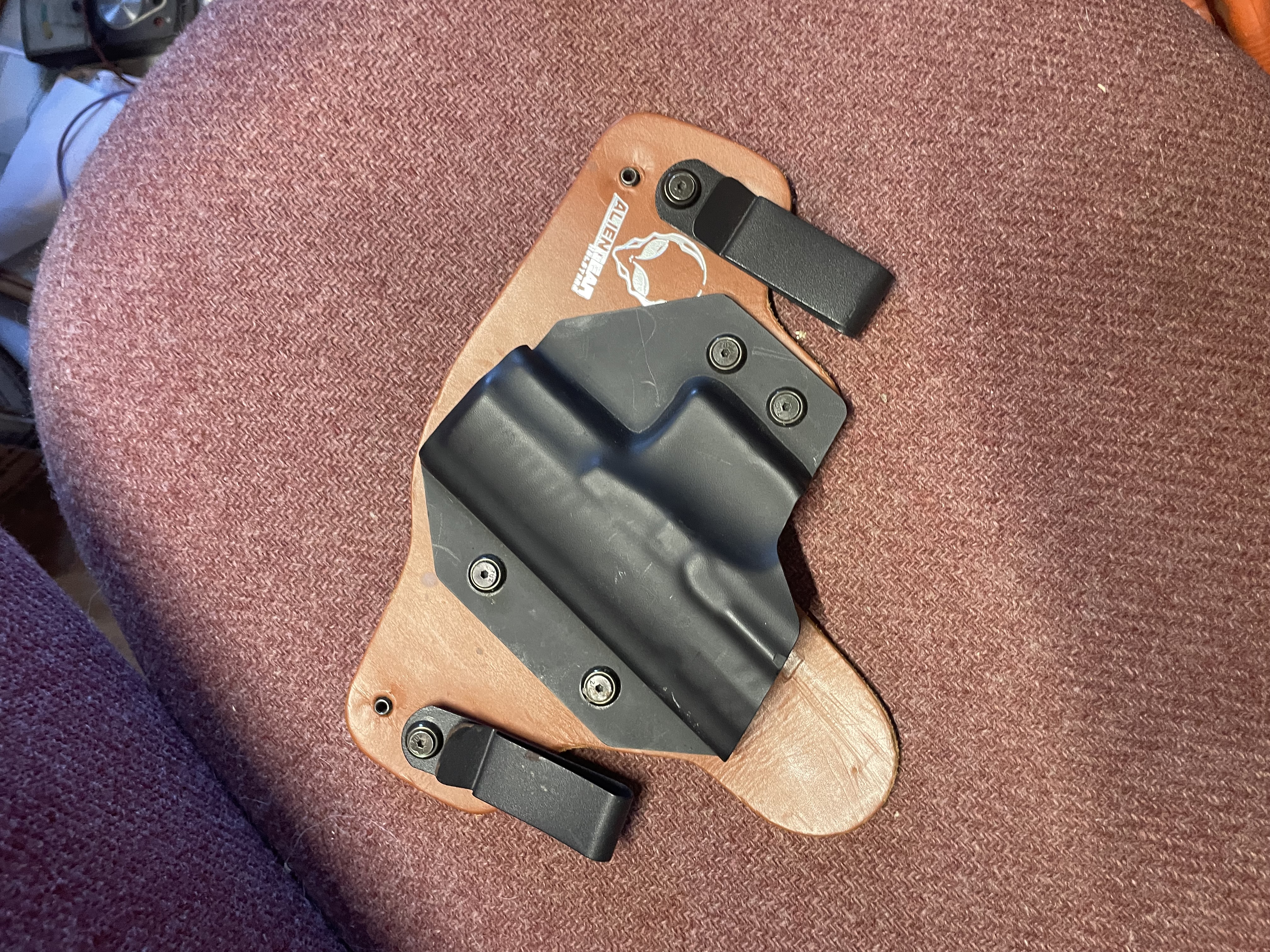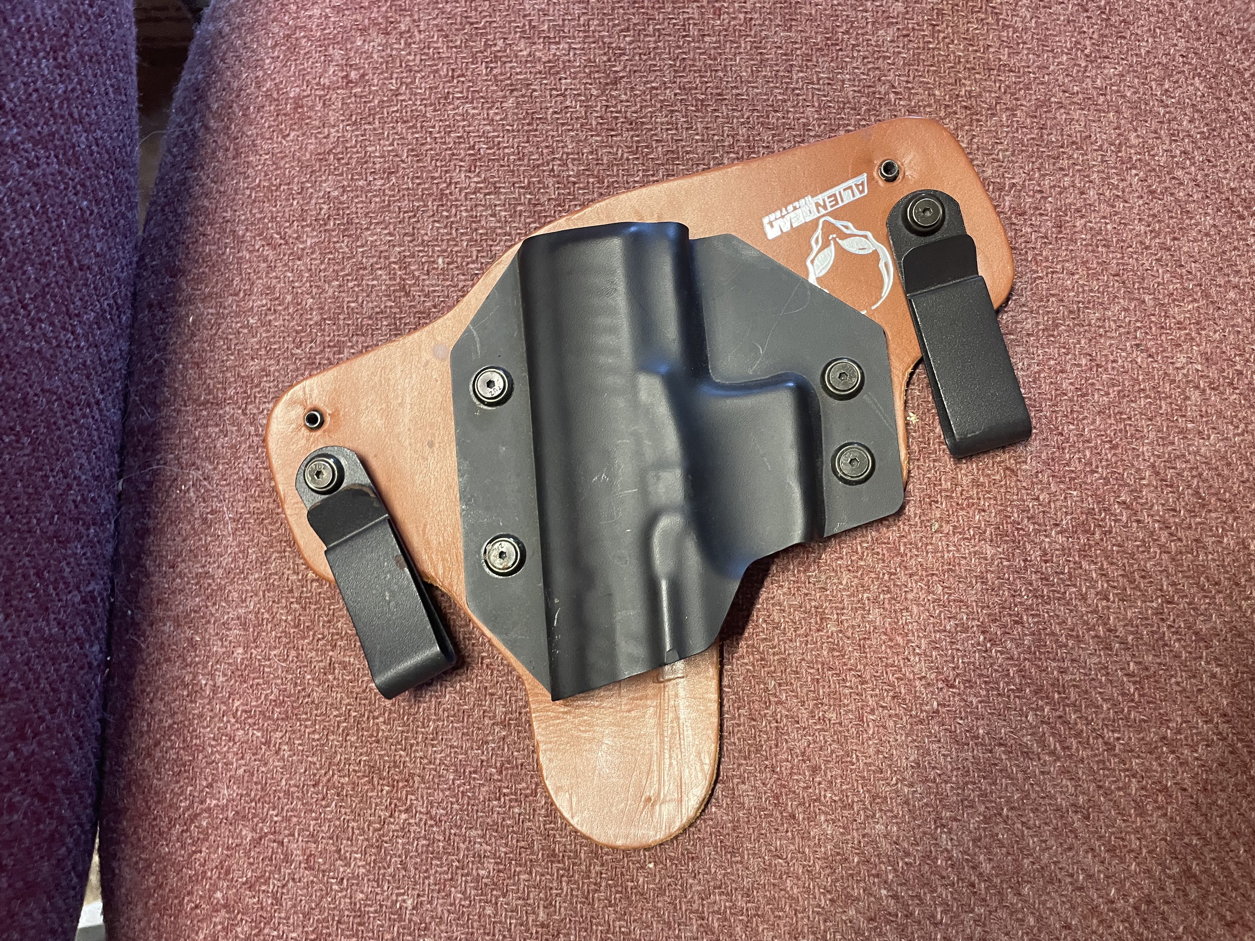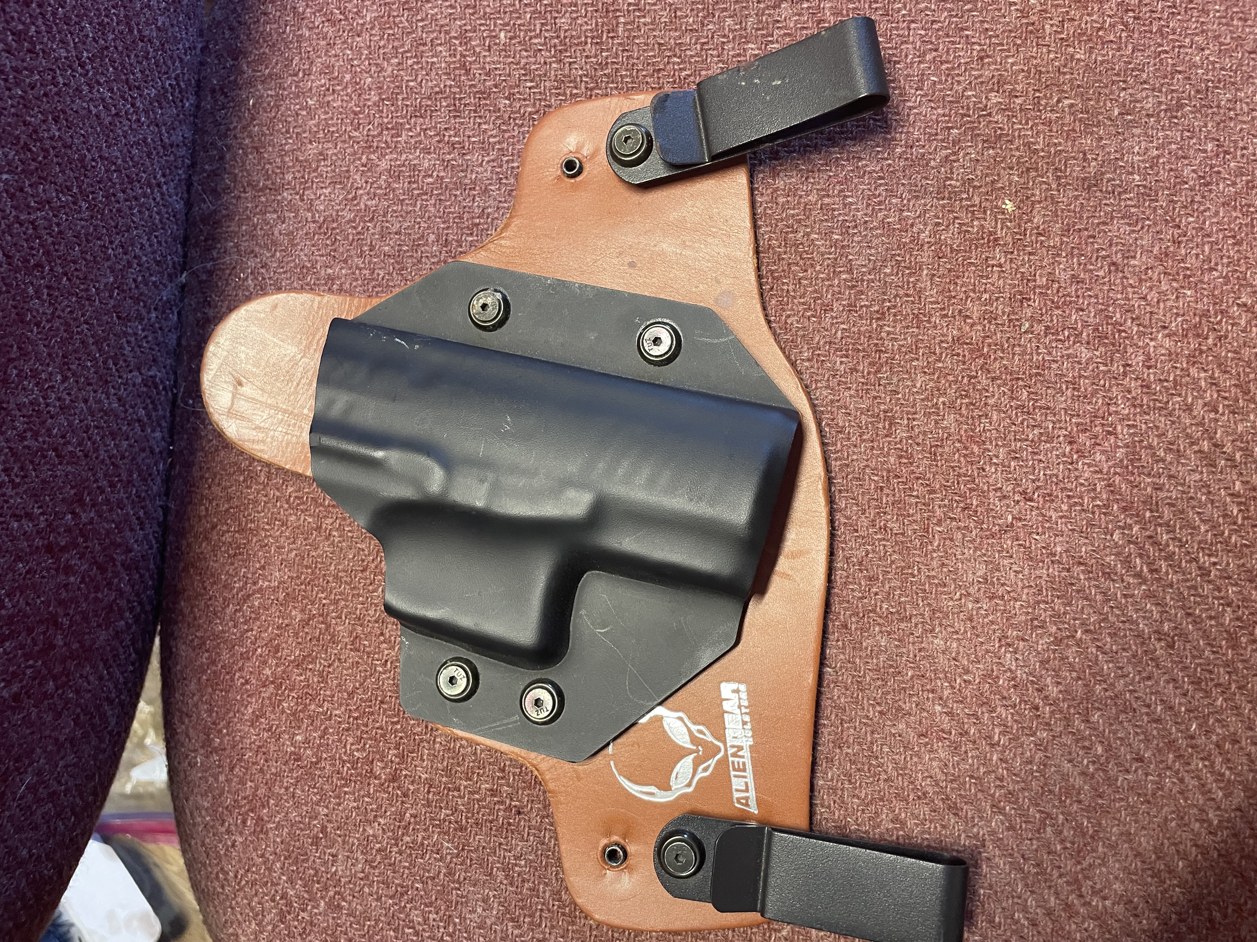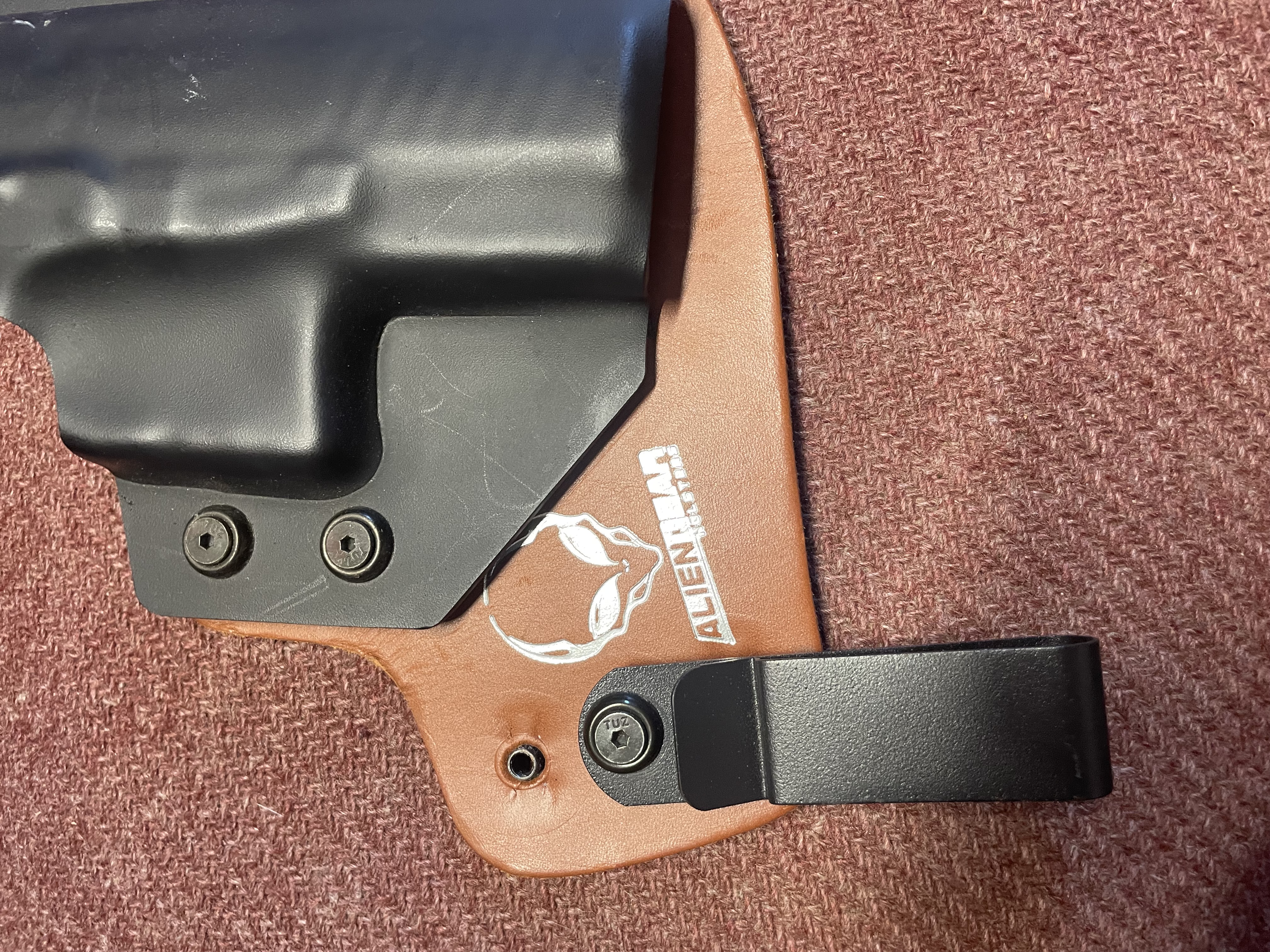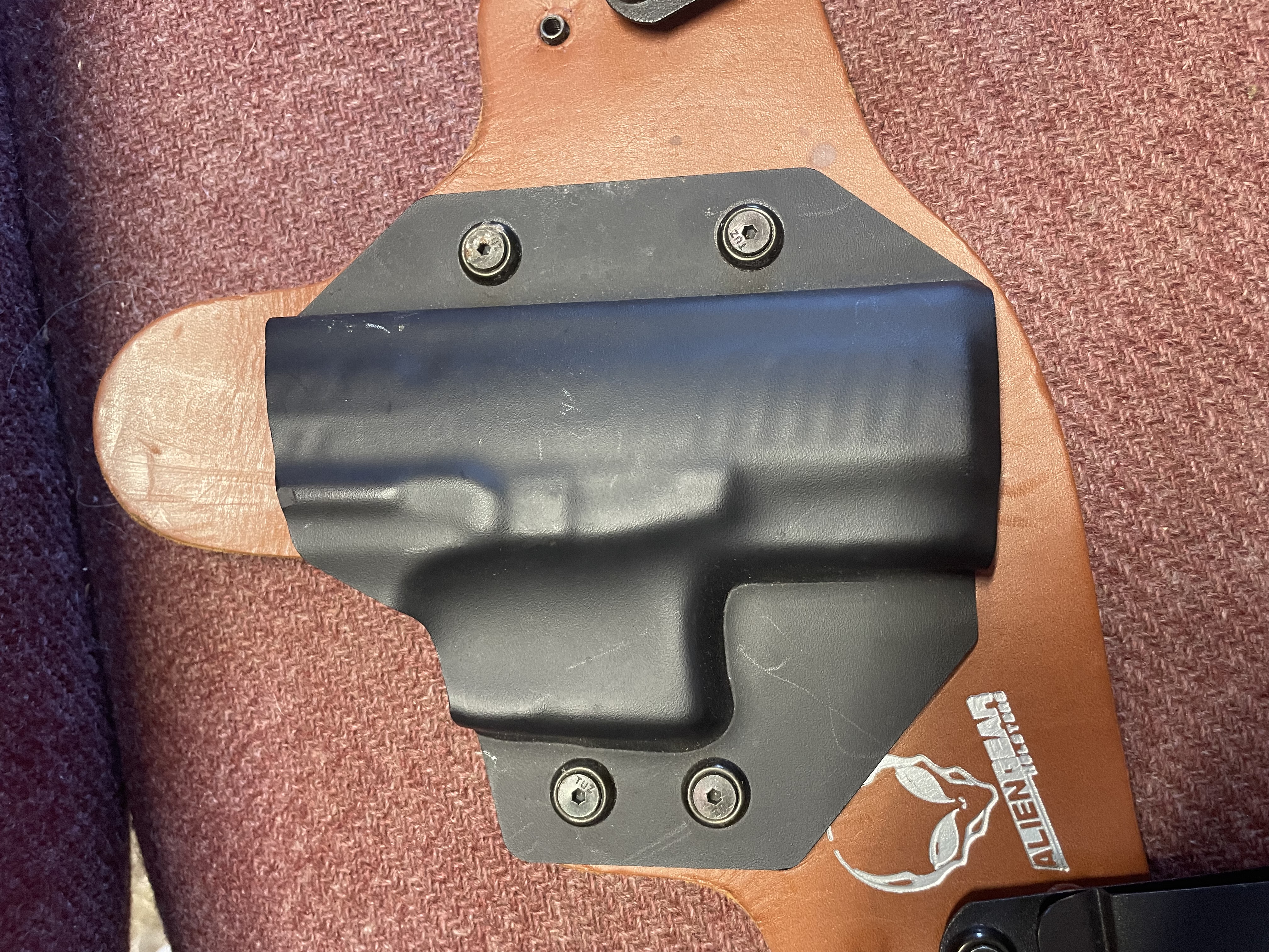 Alien Gear Cloak Tuck concealment holster for Glock model 23 or 19 I put both models in it from time-to-time Black shell with natural leather backing. Lightly used Very comfortable for me in side carry positions.