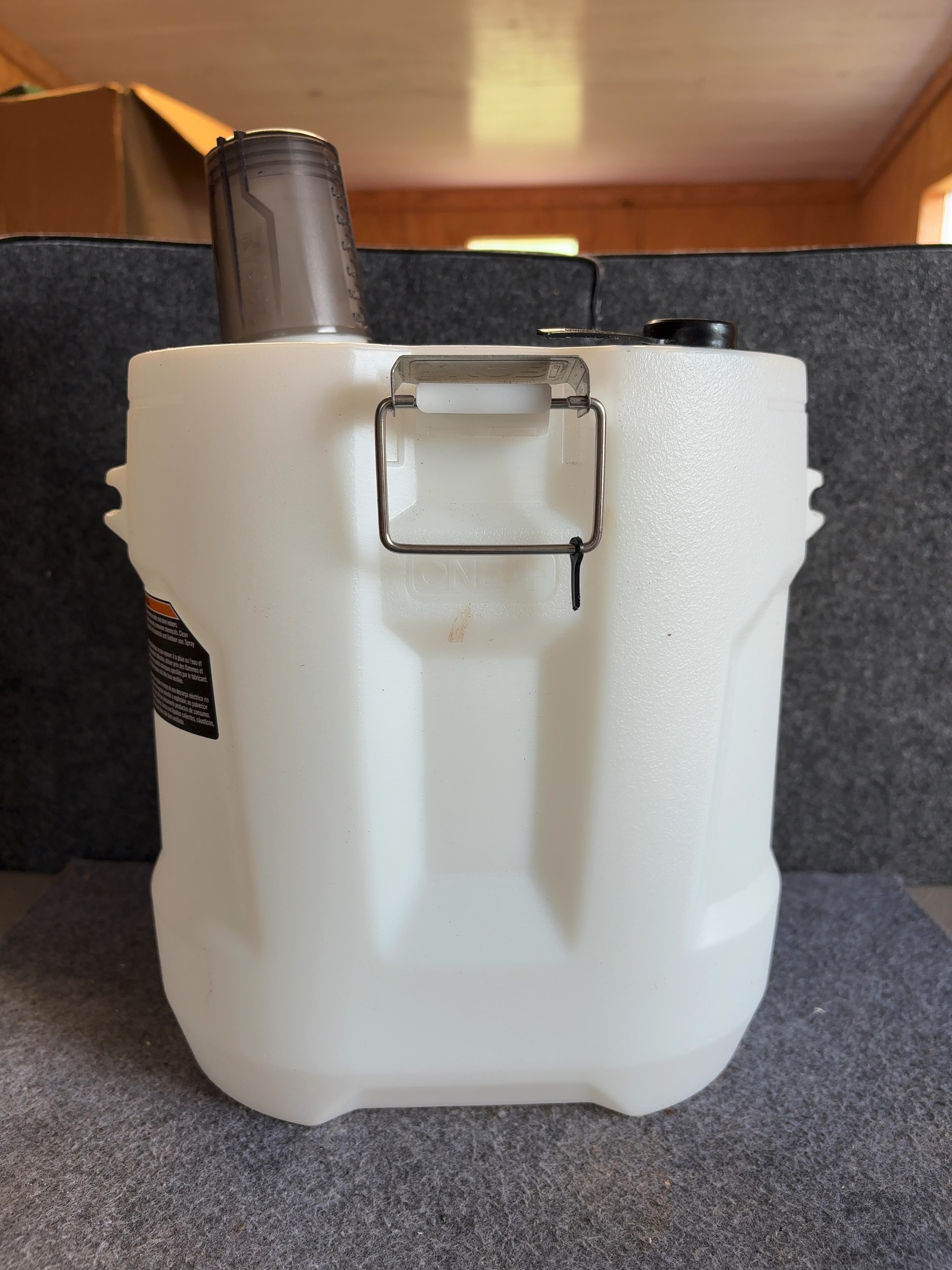 This is a Ryobi ONE+ 18V chemical sprayer replacement tank. The unit is manufactured from translucent white plastic and features molded graduation marks indicating a 2 gallon capacity. The tank includes integrated metal latches, with the Ryobi name embossed on the front latch and the ONE+ logo molded into the plastic body. It is equipped with a translucent grey measuring cup that serves as a cap, featuring a scale marked in ounces from 1 to 4. A multi-language safety warning label is present on the side. This item is the tank assembly only and does not include the motorized power head, battery, or spray wand.