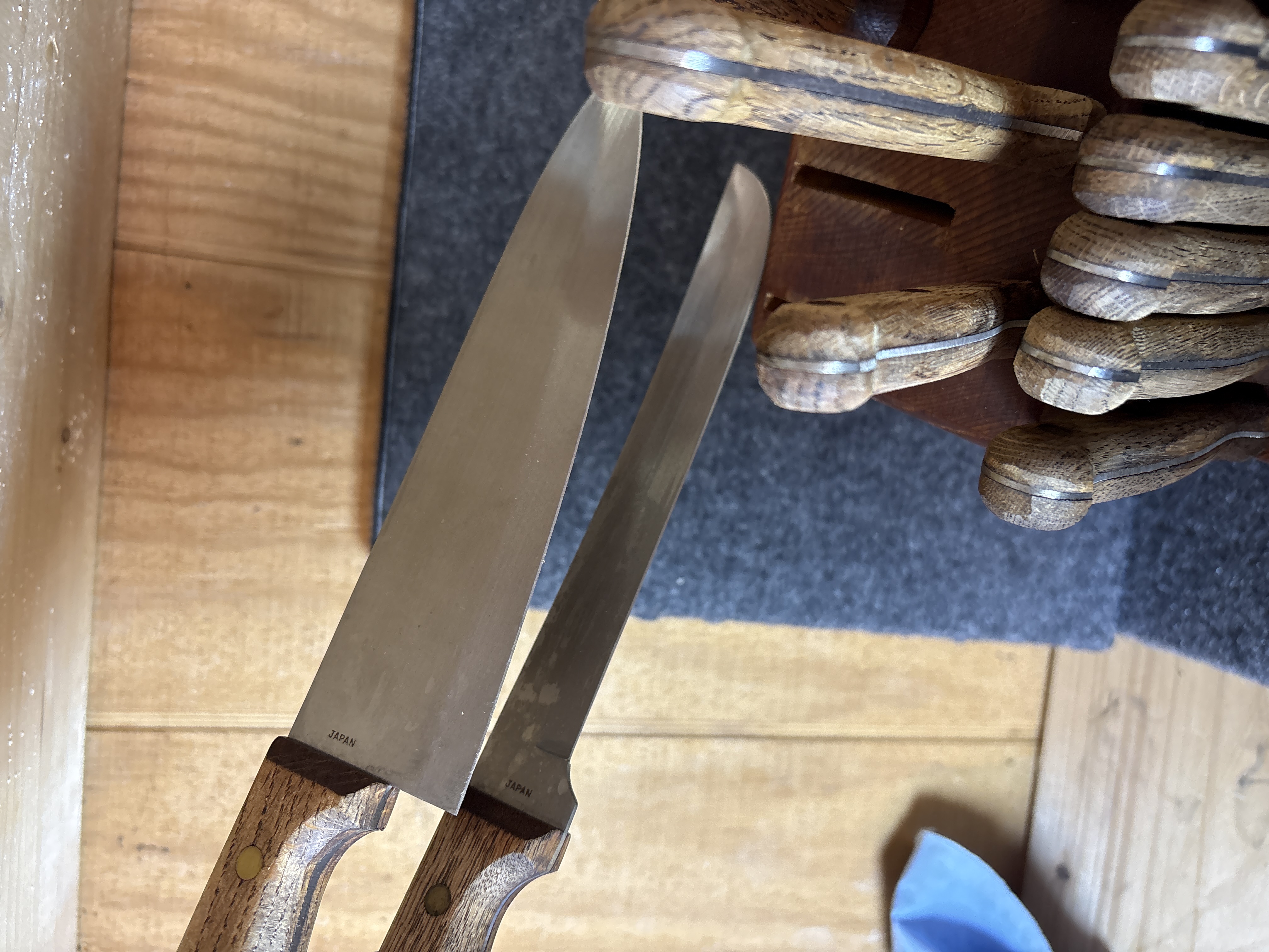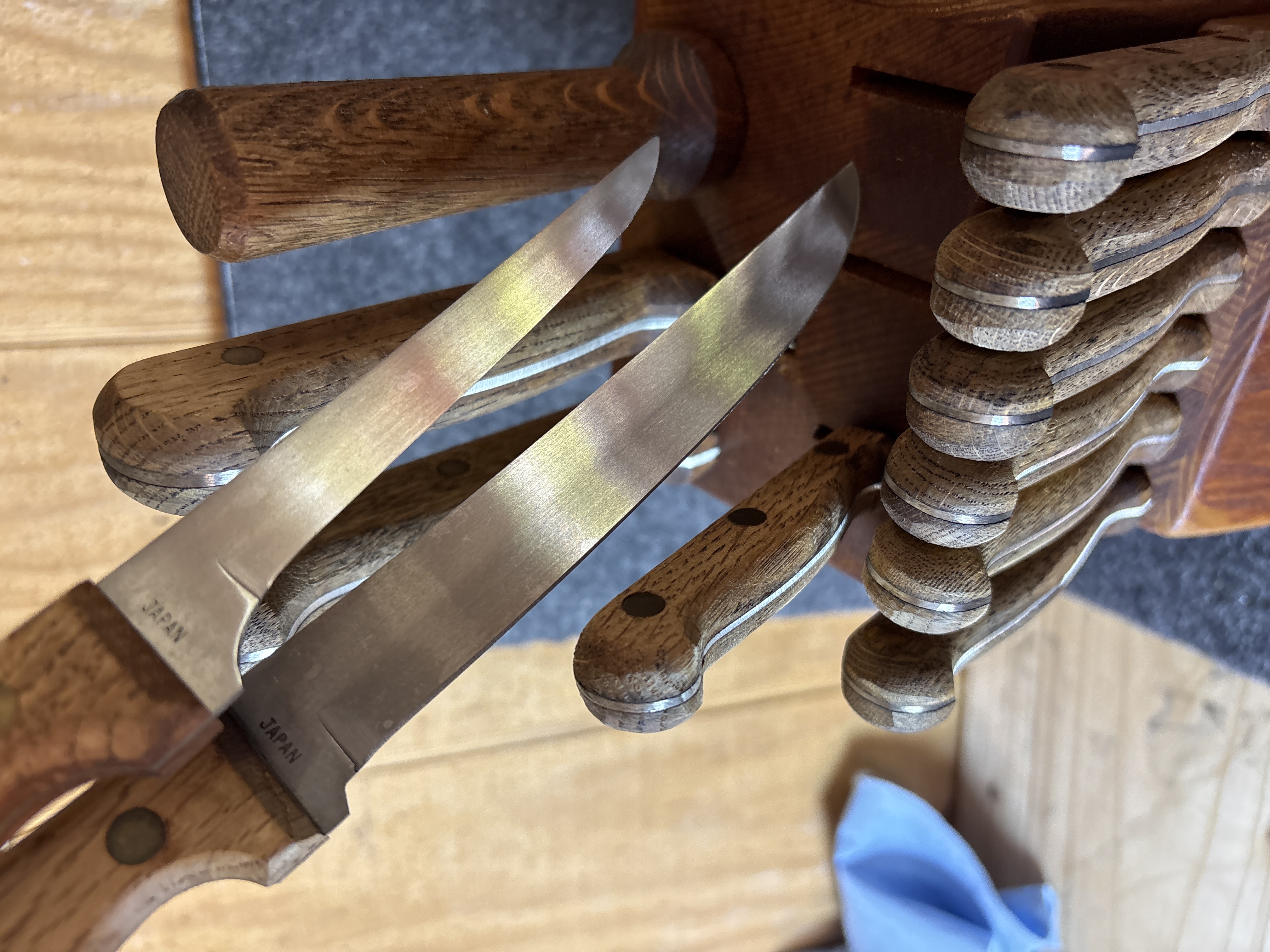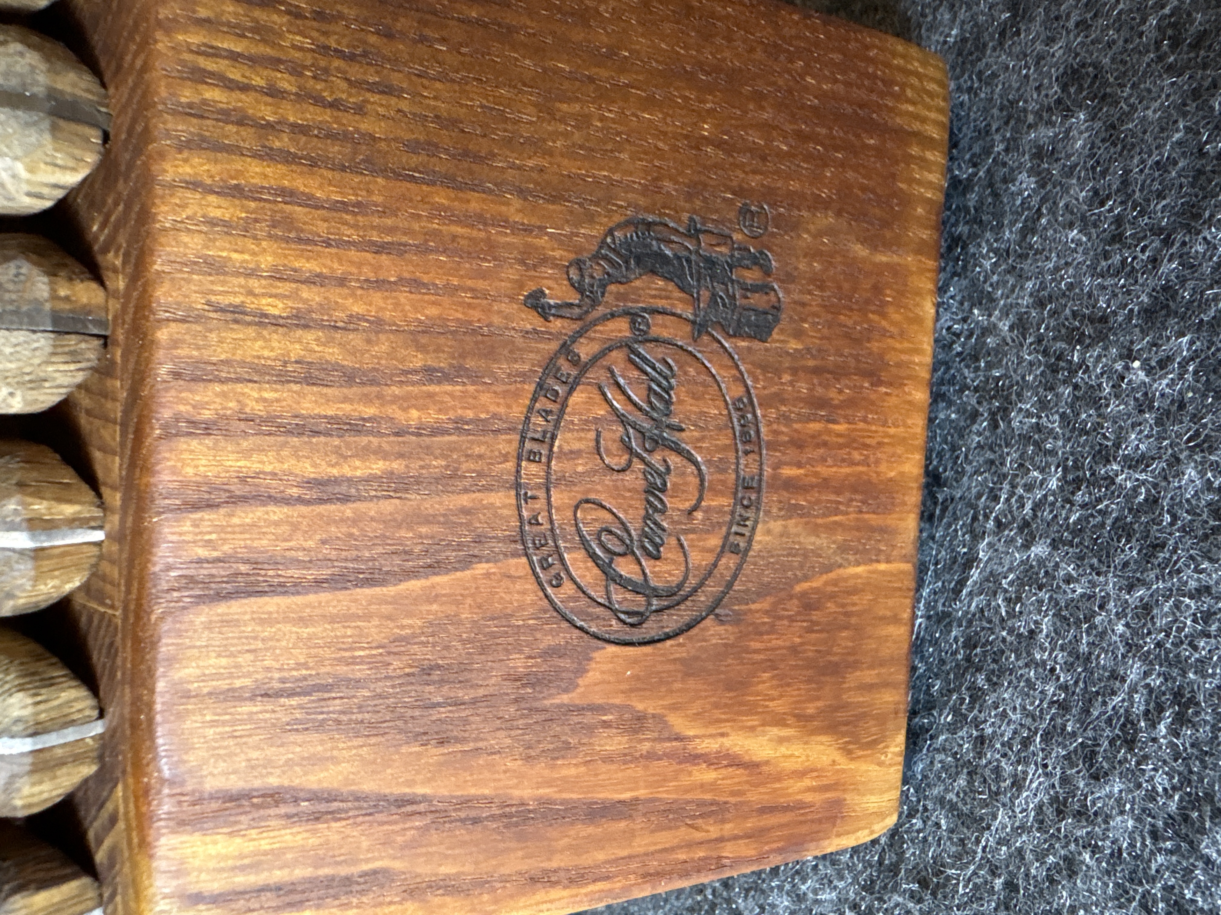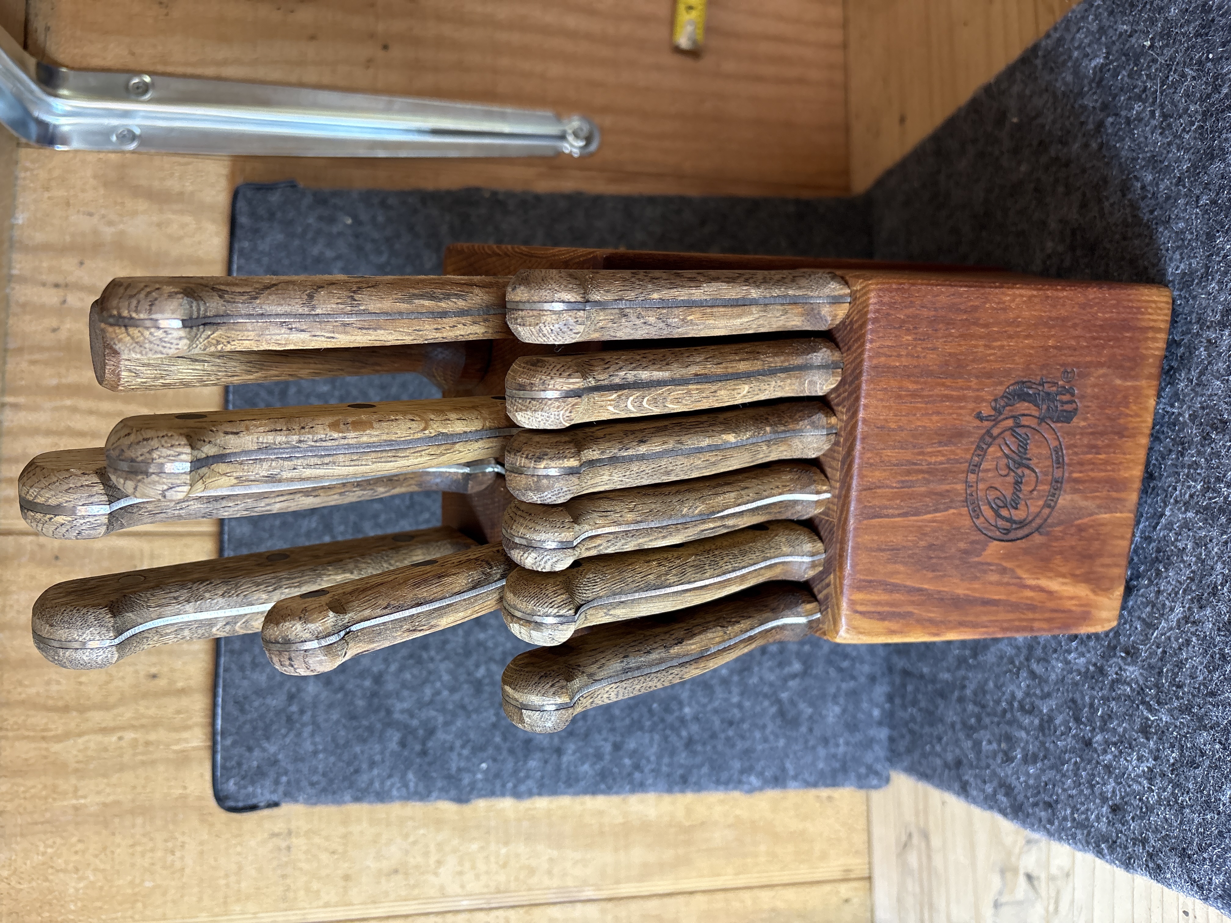 This kitchen cutlery set is produced by Carvel Hall and features blades manufactured in Japan. The set is comprised of ten knives and one honing tool presented in a slanted wooden storage block. The specific cutlery pieces include six steak knives, one paring knife, one utility knife, one carving or slicing knife, and one chef’s knife. The blades are constructed of stainless steel with a full-tang design, extending through the length of the handles. The handles are made of a wood laminate material and are fastened with triple brass rivets. The wooden block is marked with a circular brand featuring a craftsman at an anvil and the text Great Blades Since 1895 with the Carvel Hall signature. The base of the blades is stamped with the word Japan.