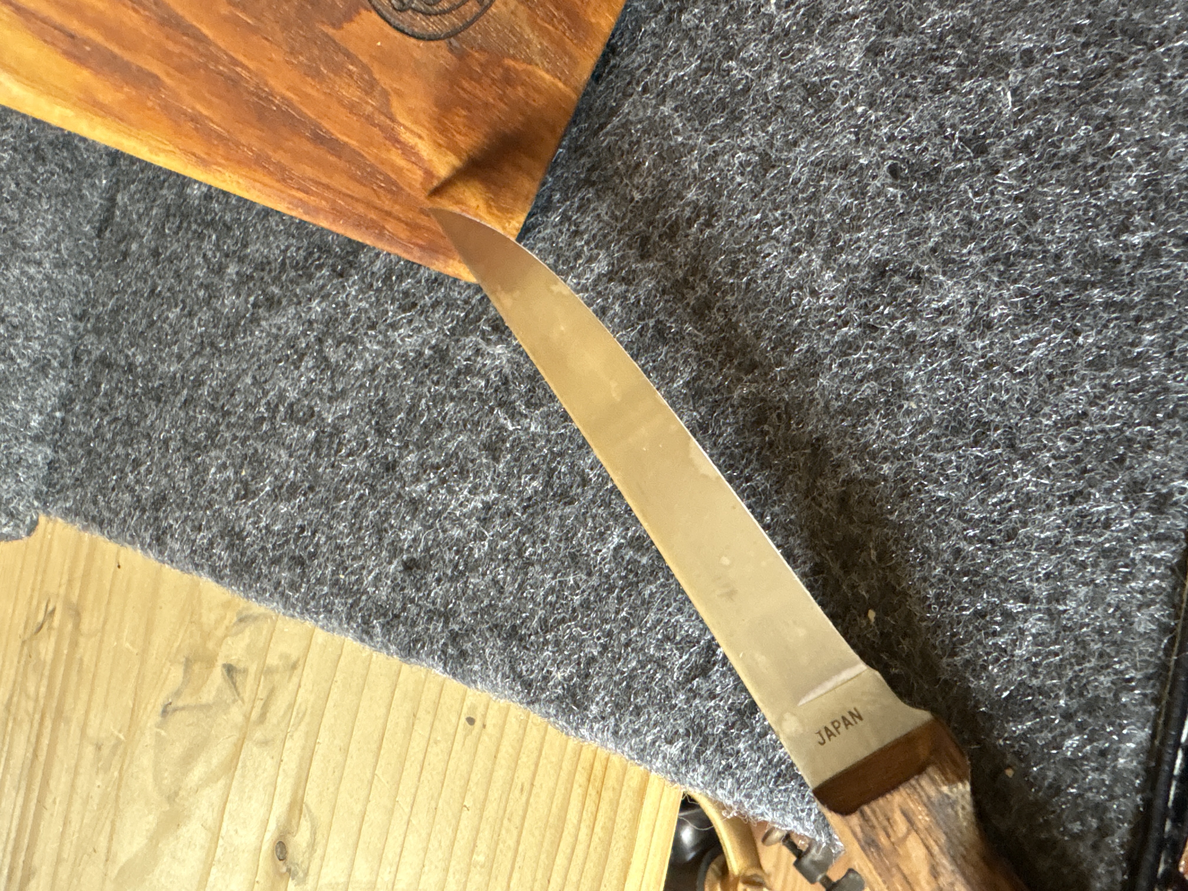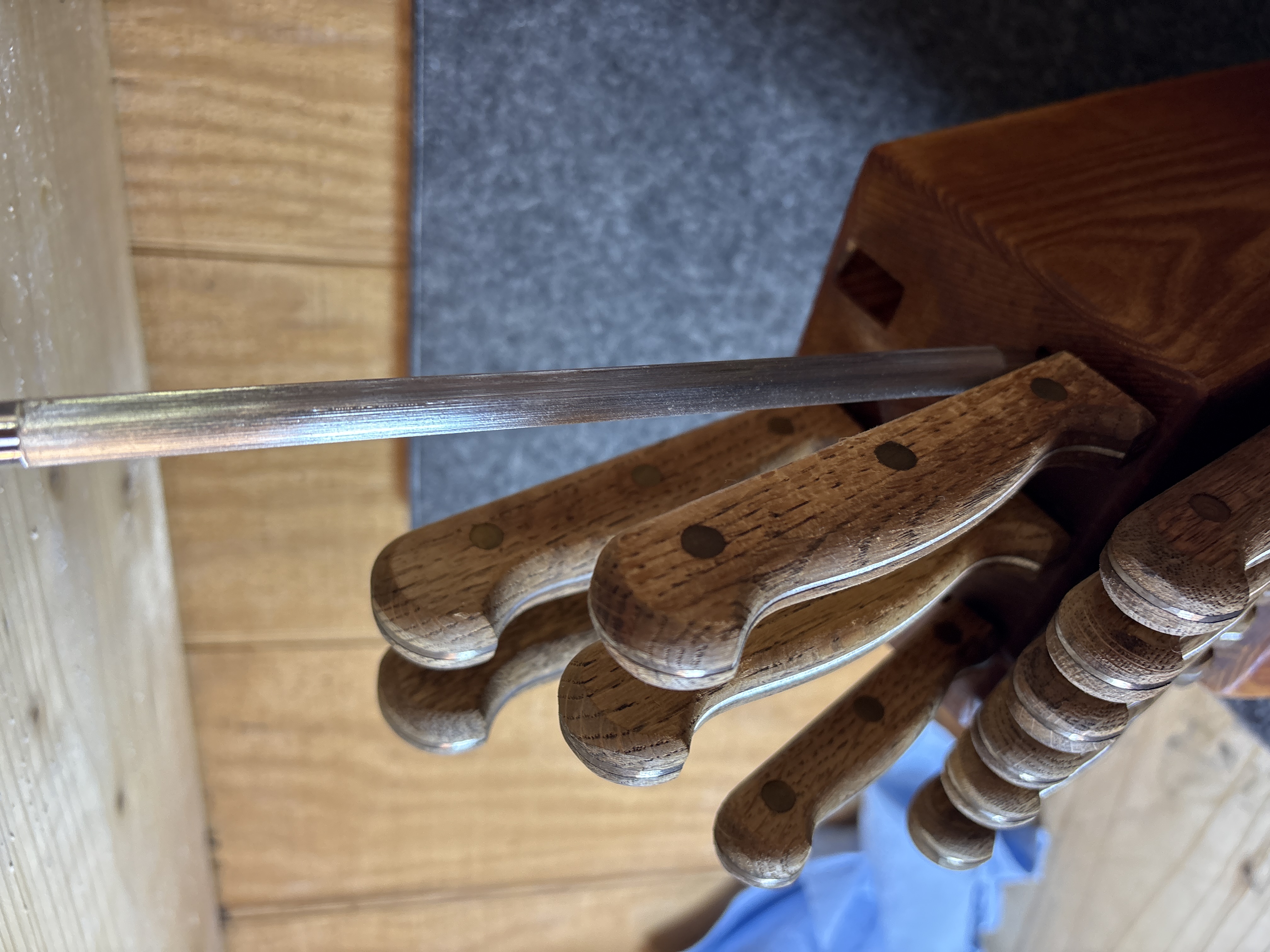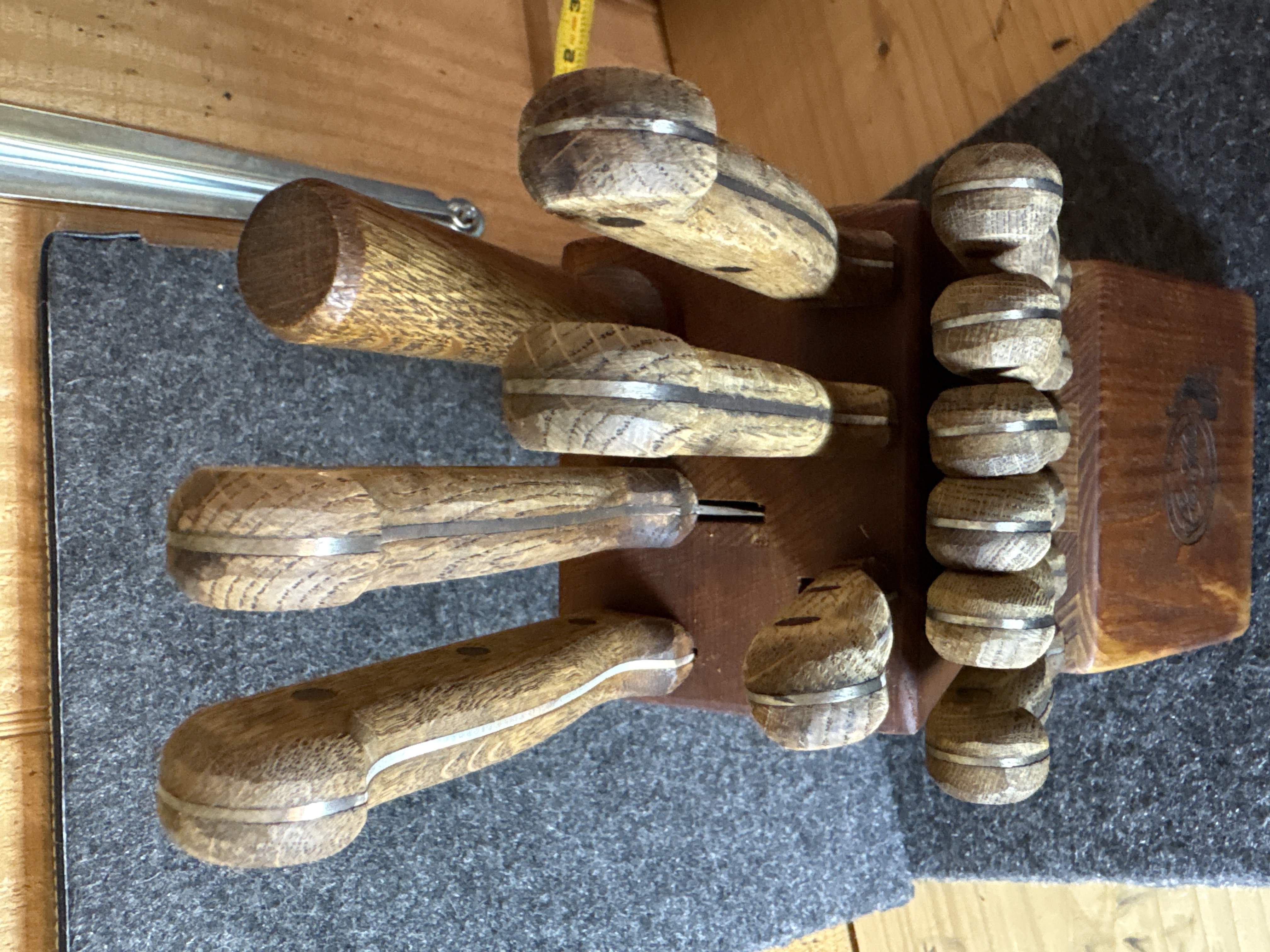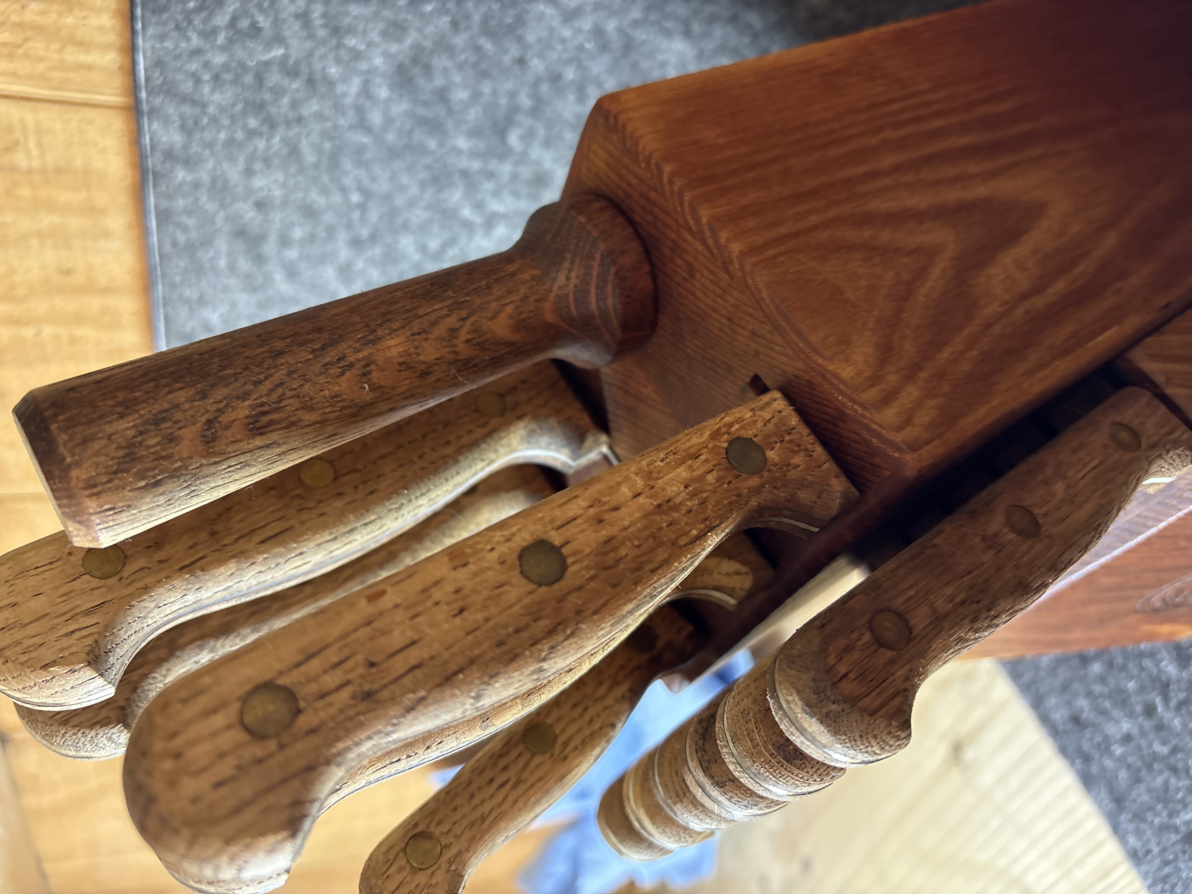 This kitchen cutlery set is produced by Carvel Hall and features blades manufactured in Japan. The set is comprised of ten knives and one honing tool presented in a slanted wooden storage block. The specific cutlery pieces include six steak knives, one paring knife, one utility knife, one carving or slicing knife, and one chef’s knife. The blades are constructed of stainless steel with a full-tang design, extending through the length of the handles. The handles are made of a wood laminate material and are fastened with triple brass rivets. The wooden block is marked with a circular brand featuring a craftsman at an anvil and the text Great Blades Since 1895 with the Carvel Hall signature. The base of the blades is stamped with the word Japan.