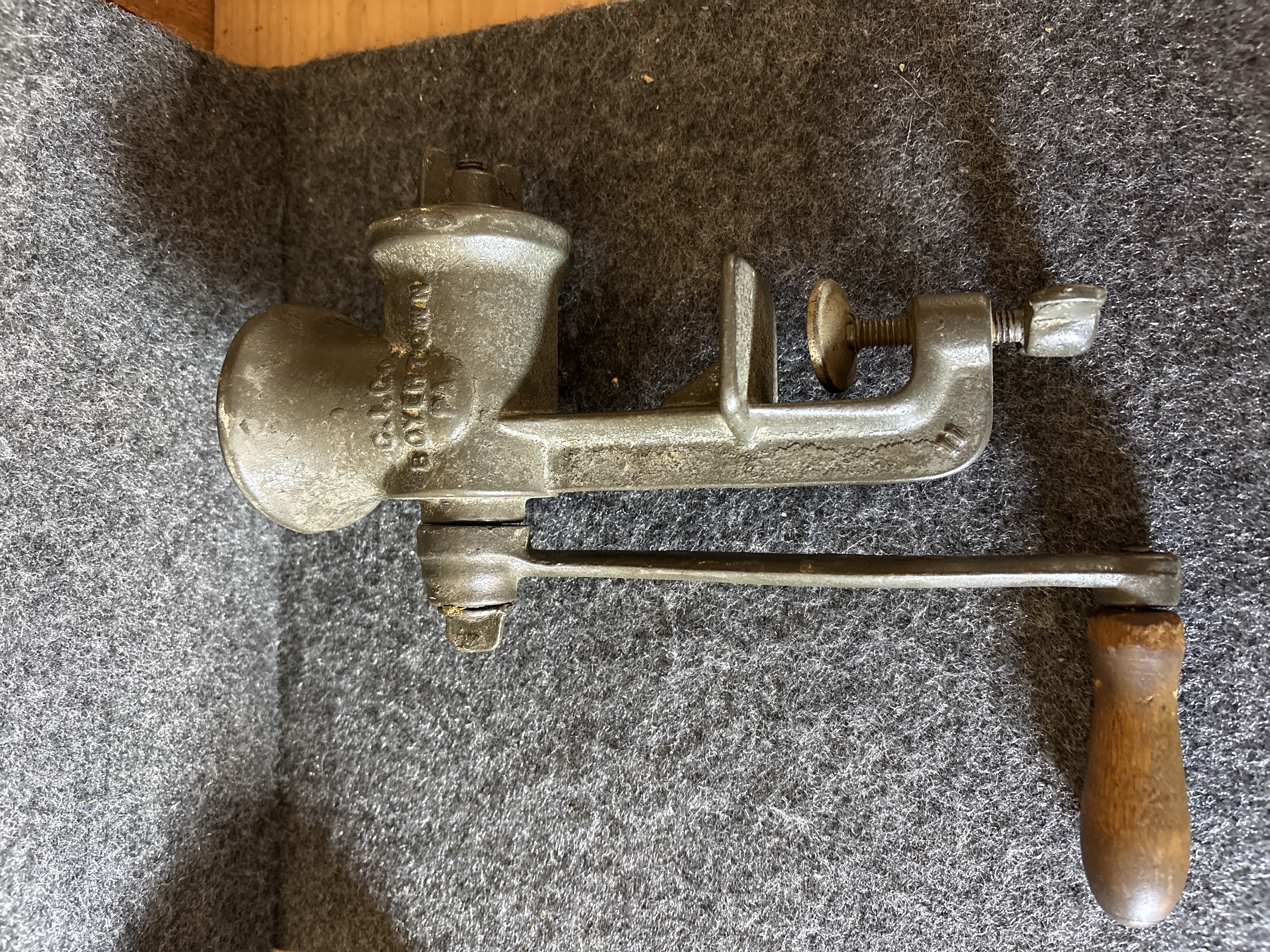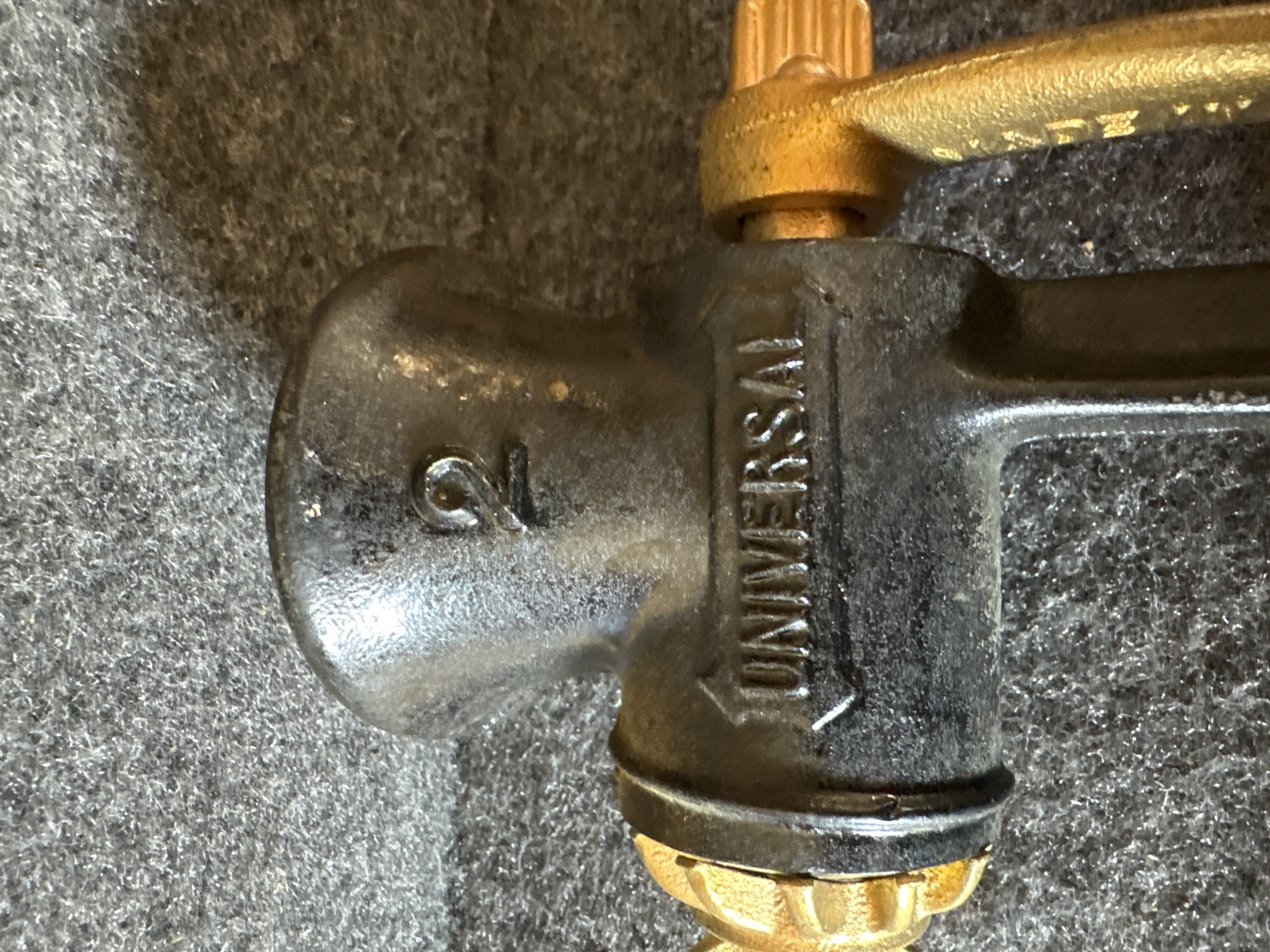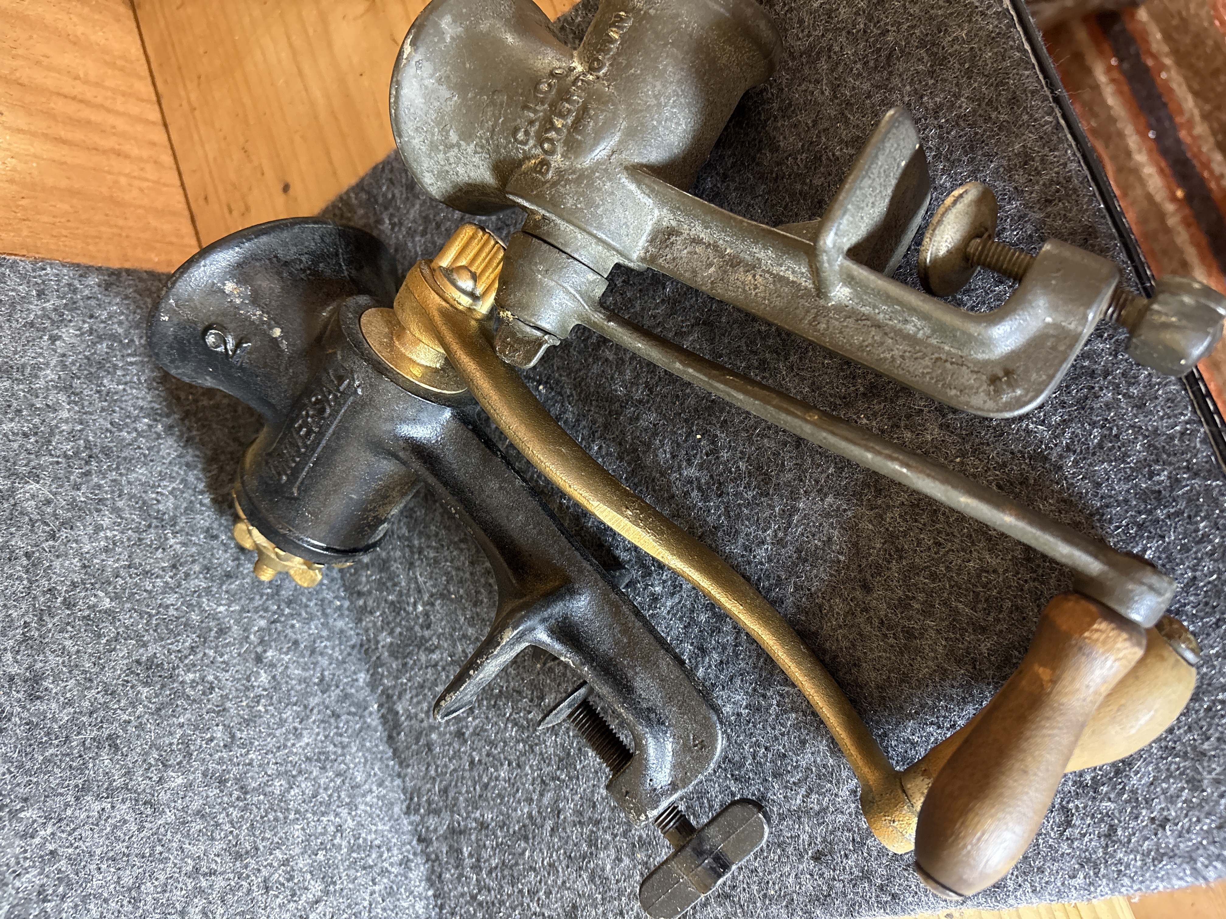 This lot consists of two vintage cast iron hand-crank food grinders equipped with integrated table clamps. The first item is a Keystone model produced by C.I. Co. in Boyertown, Pennsylvania. The hopper is embossed with the number 10 inside a square, and the crank arm is marked Made in U.S.A. It features a turned wooden handle. The second item is a Universal No. 2 model finished in black paint with gold-toned highlights on the crank arm, grinding plate, and adjustment nut. The handle is embossed with Made in U.S.A. Both units are constructed of cast iron and include their original internal grinding augers and exterior adjustment hardware.