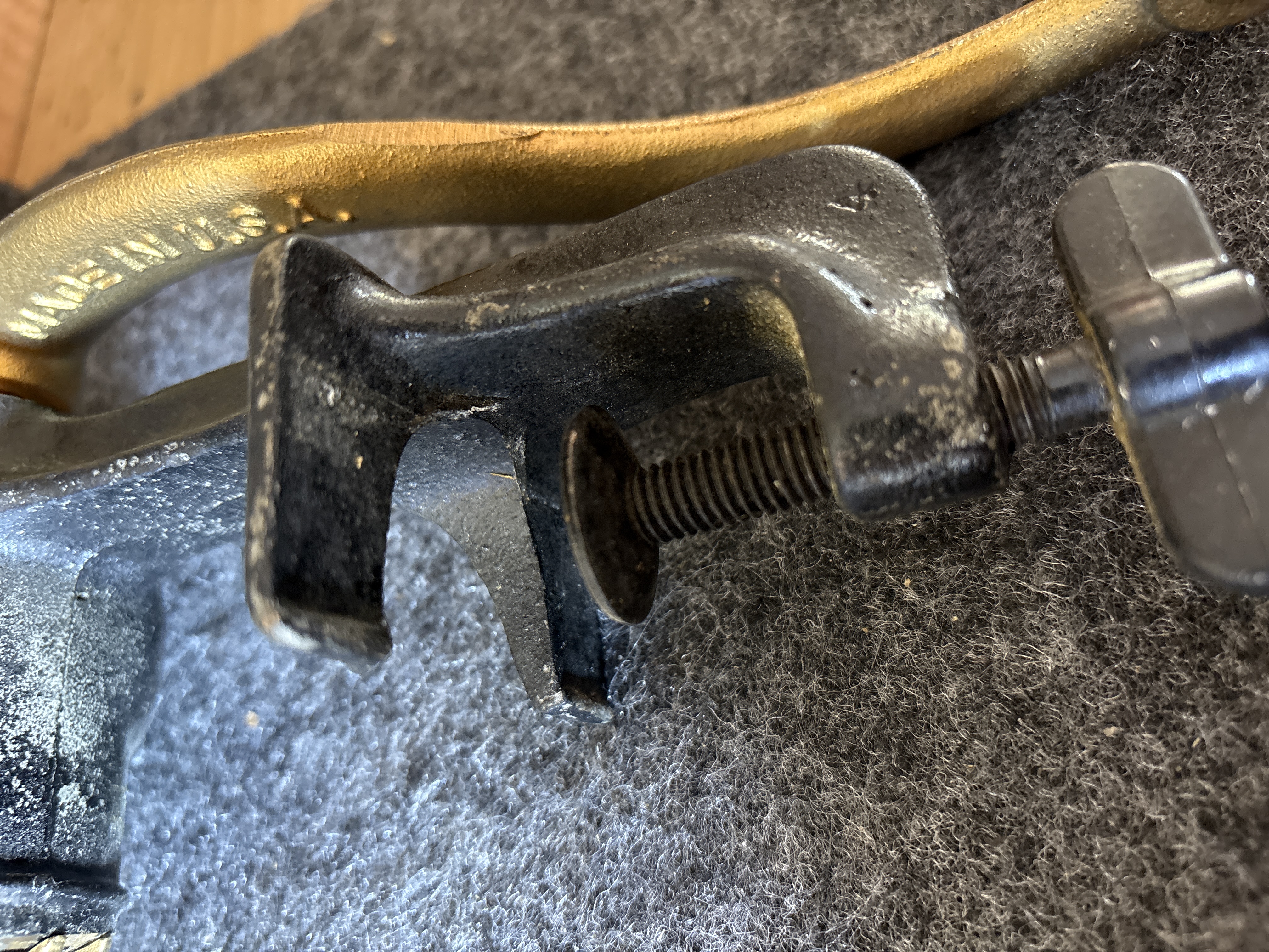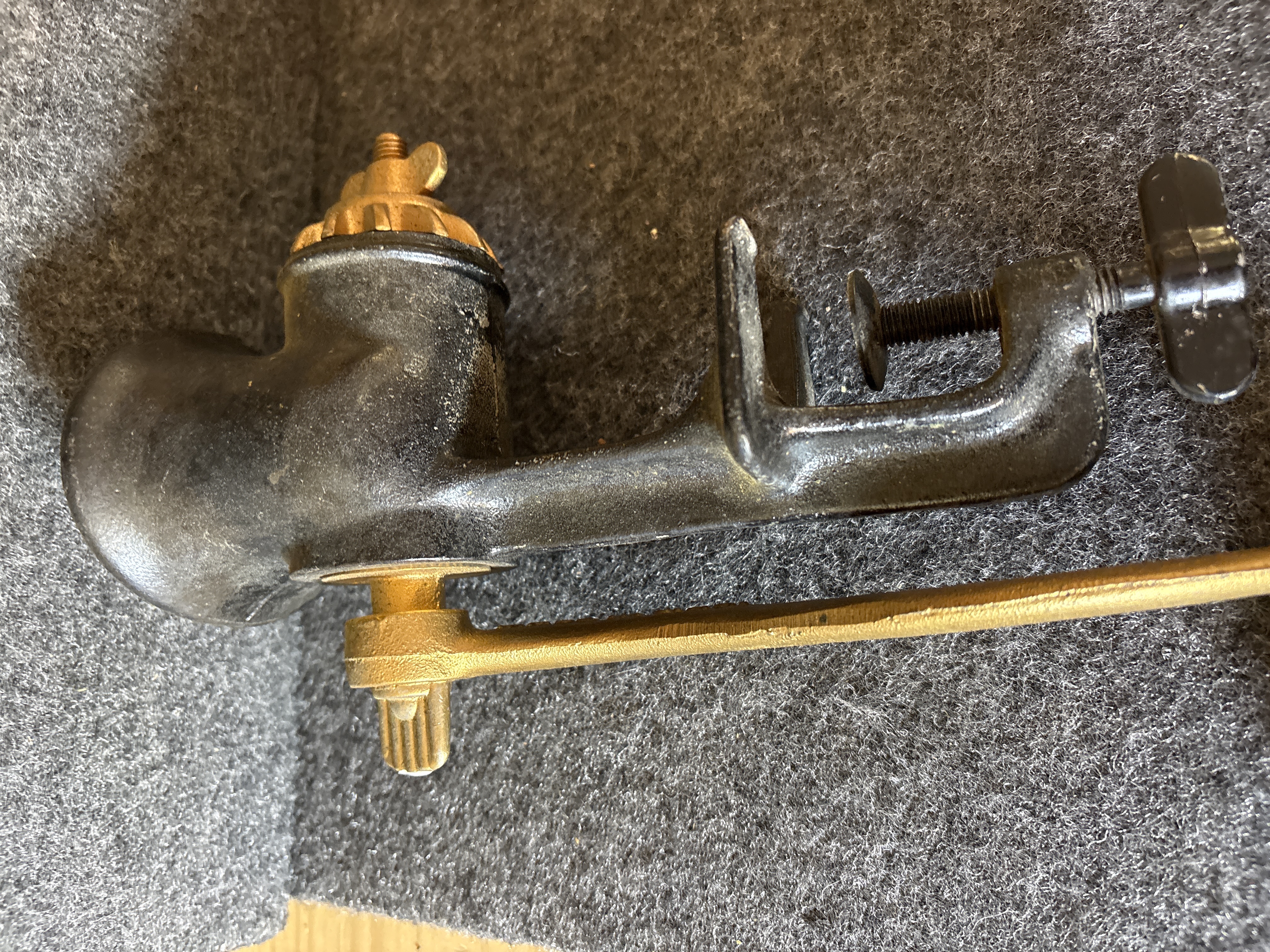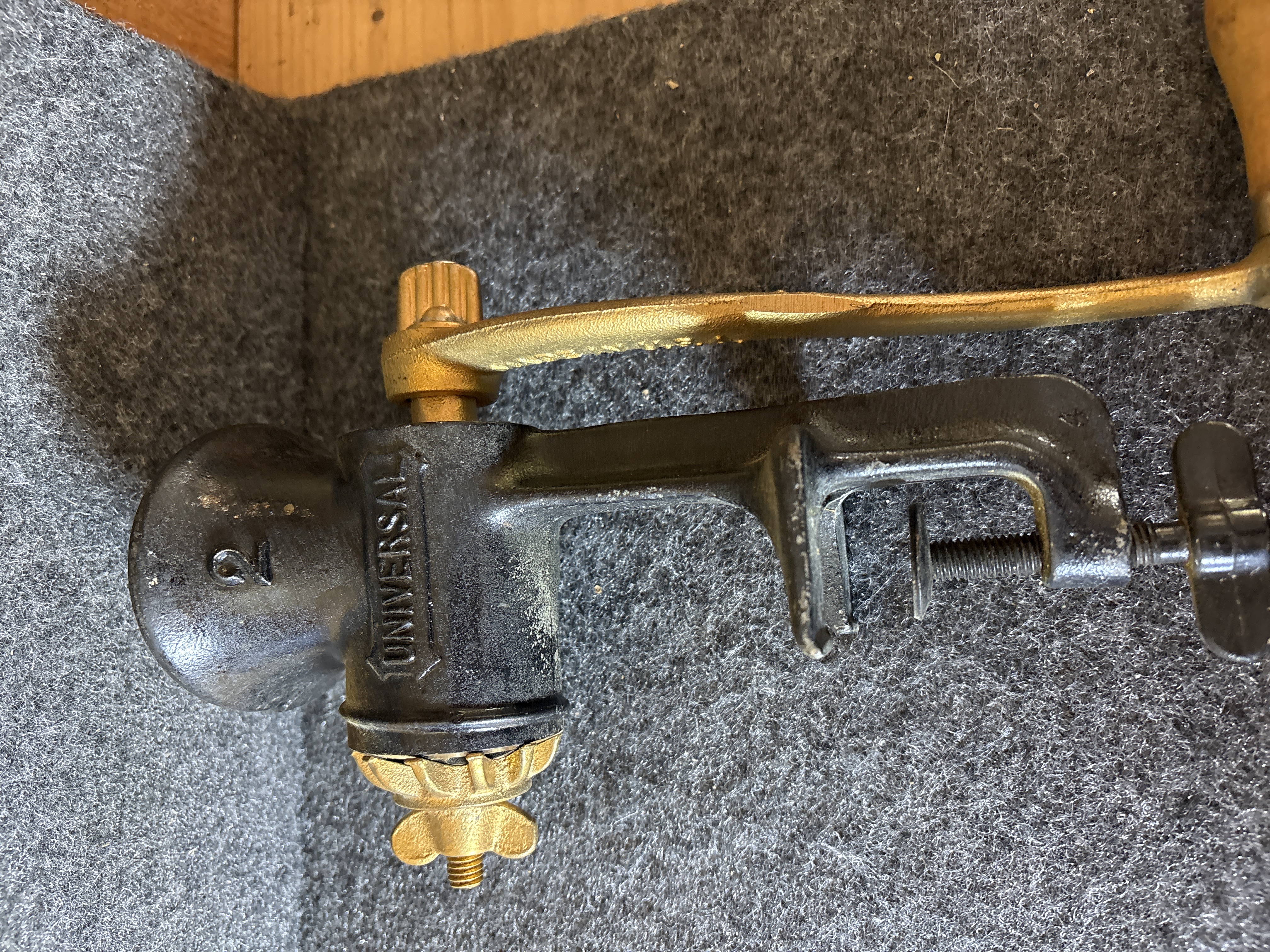 This lot consists of two vintage cast iron hand-crank food grinders equipped with integrated table clamps. The first item is a Keystone model produced by C.I. Co. in Boyertown, Pennsylvania. The hopper is embossed with the number 10 inside a square, and the crank arm is marked Made in U.S.A. It features a turned wooden handle. The second item is a Universal No. 2 model finished in black paint with gold-toned highlights on the crank arm, grinding plate, and adjustment nut. The handle is embossed with Made in U.S.A. Both units are constructed of cast iron and include their original internal grinding augers and exterior adjustment hardware.