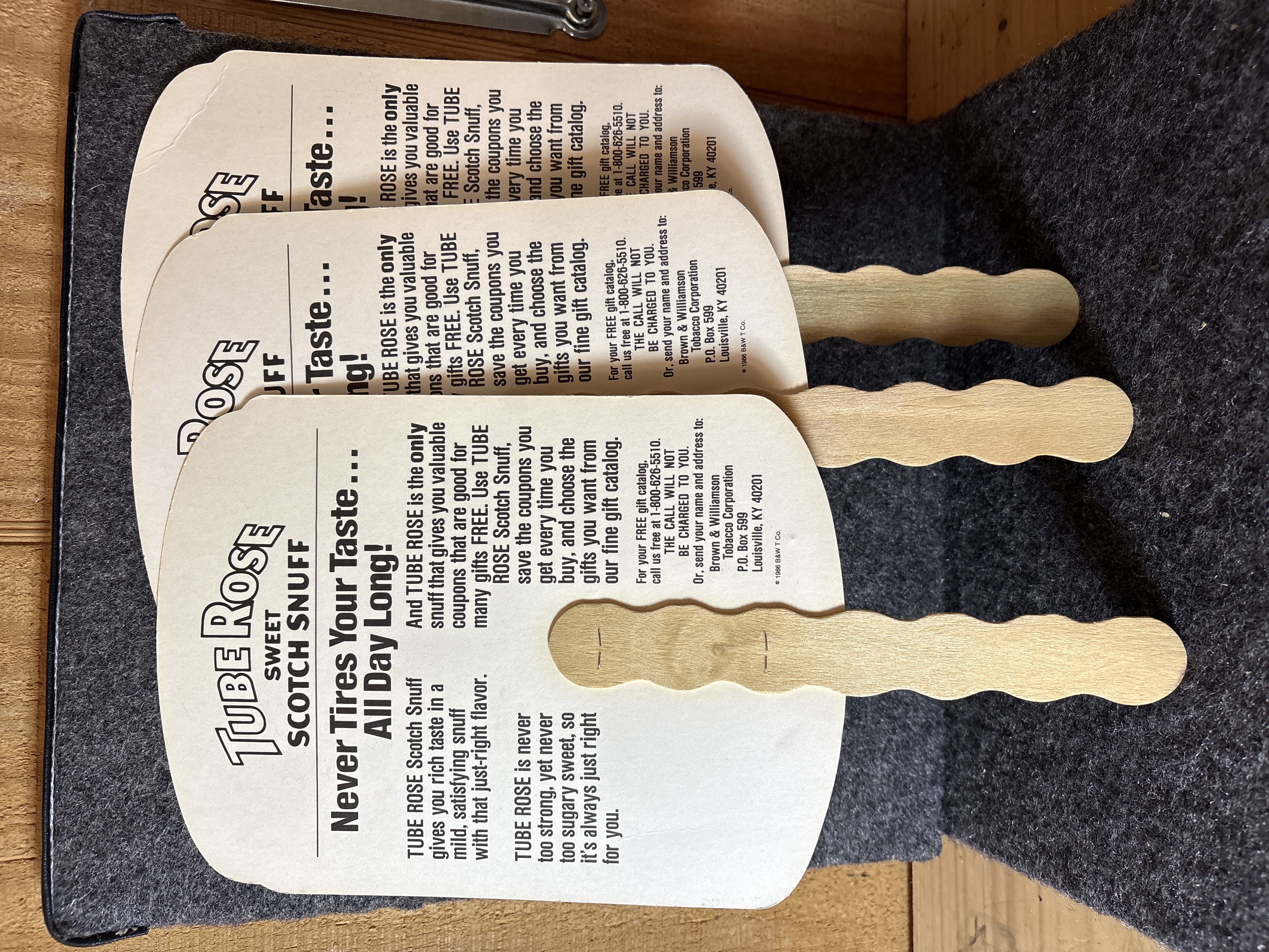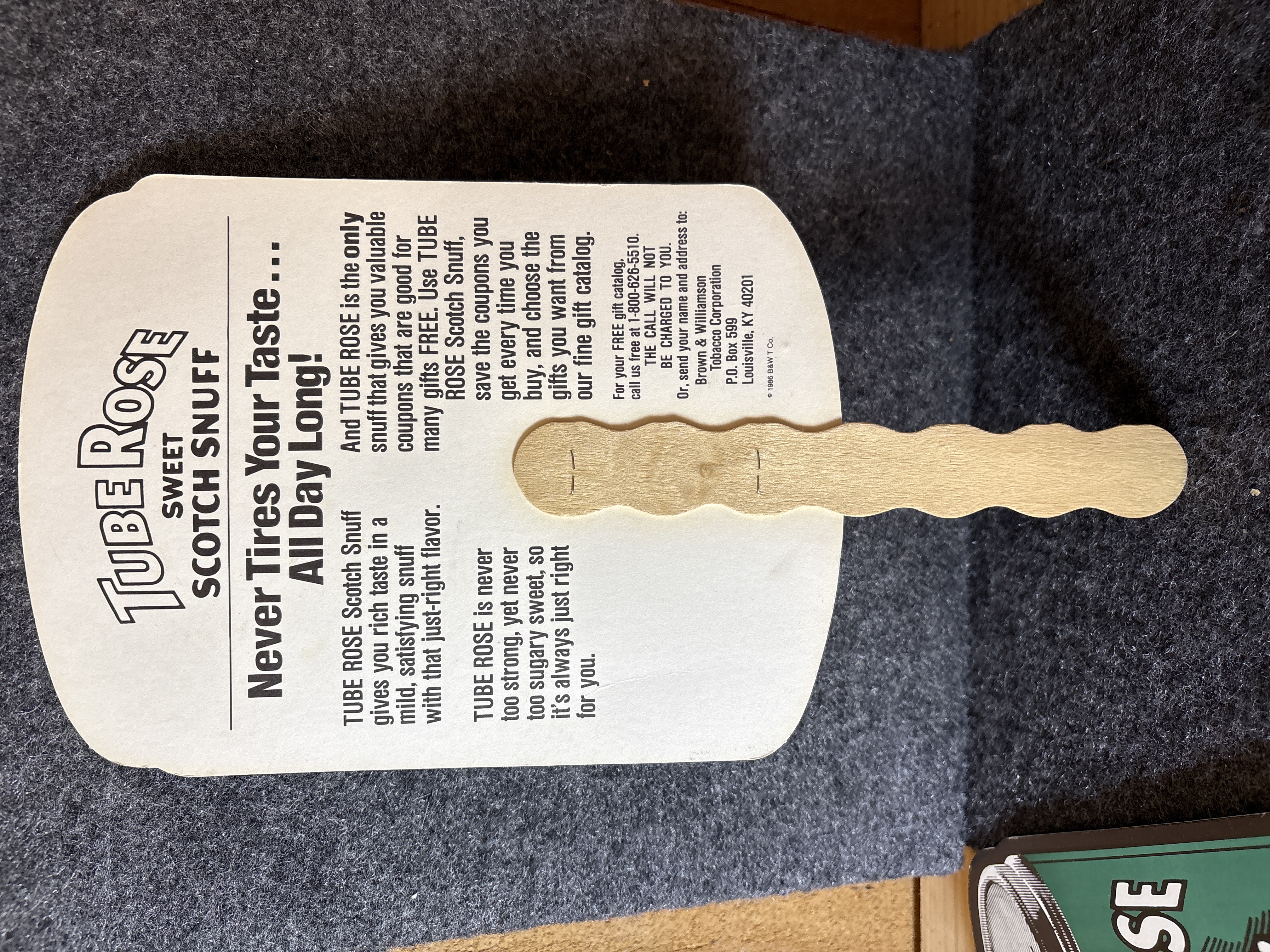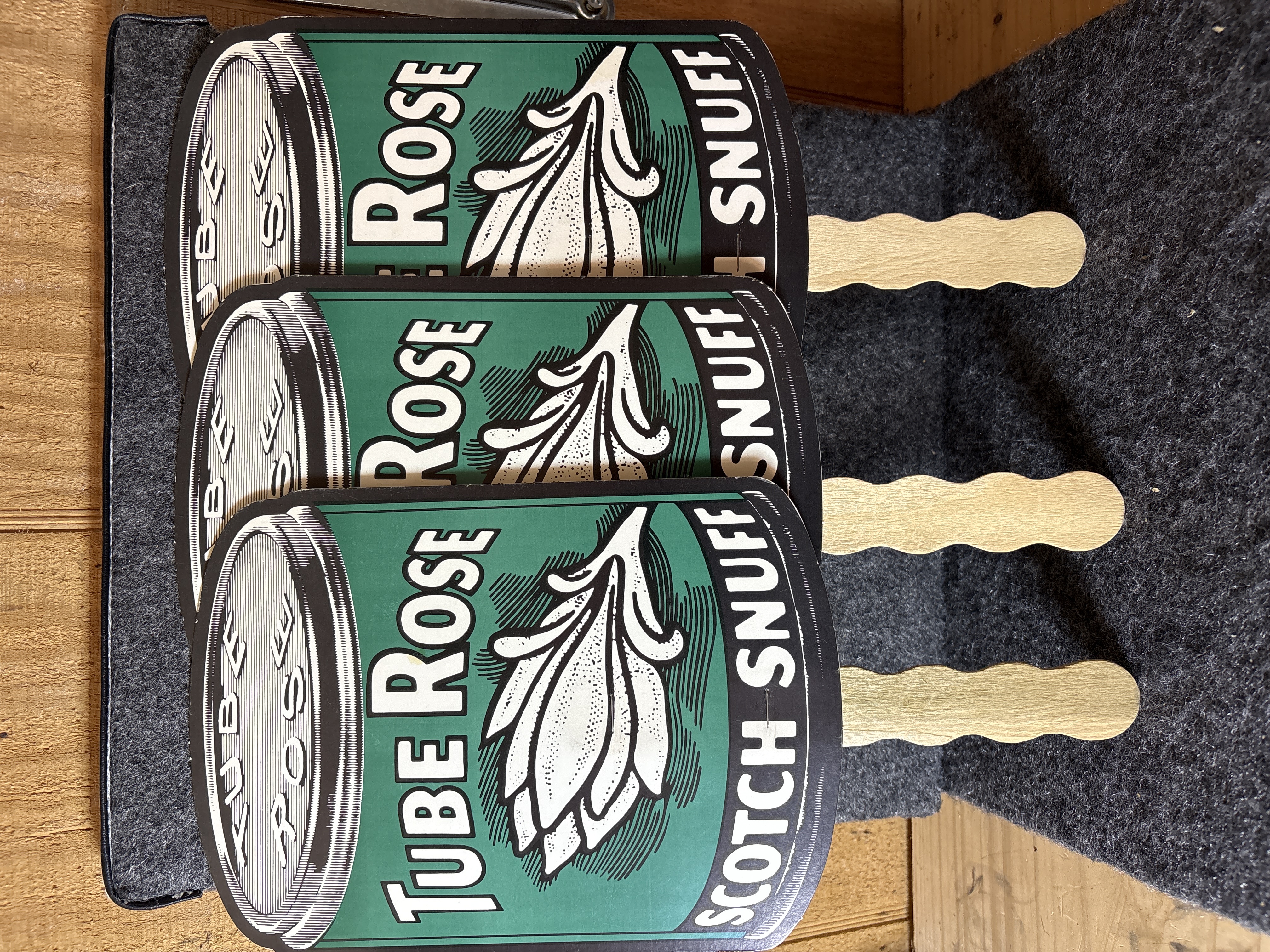 A trio of promotional hand fans for Tube Rose Sweet Scotch Snuff, produced for the Brown & Williamson Tobacco Corporation. Each fan is constructed from printed heavy cardstock secured to a wavy-contoured, natural-finish wooden handle with two metal staples. The front of each fan displays a graphic representation of a Tube Rose Scotch Snuff tin, featuring a green label with a white tuberose flower illustration and bold white text. The reverse side is printed with black marketing copy, including the slogan Never Tires Your Taste… All Day Long! and information regarding a gift catalog coupon program. The reverse also bears the manufacturer information for Brown & Williamson Tobacco Corporation in Louisville, Kentucky, and a copyright mark dated 1986.
