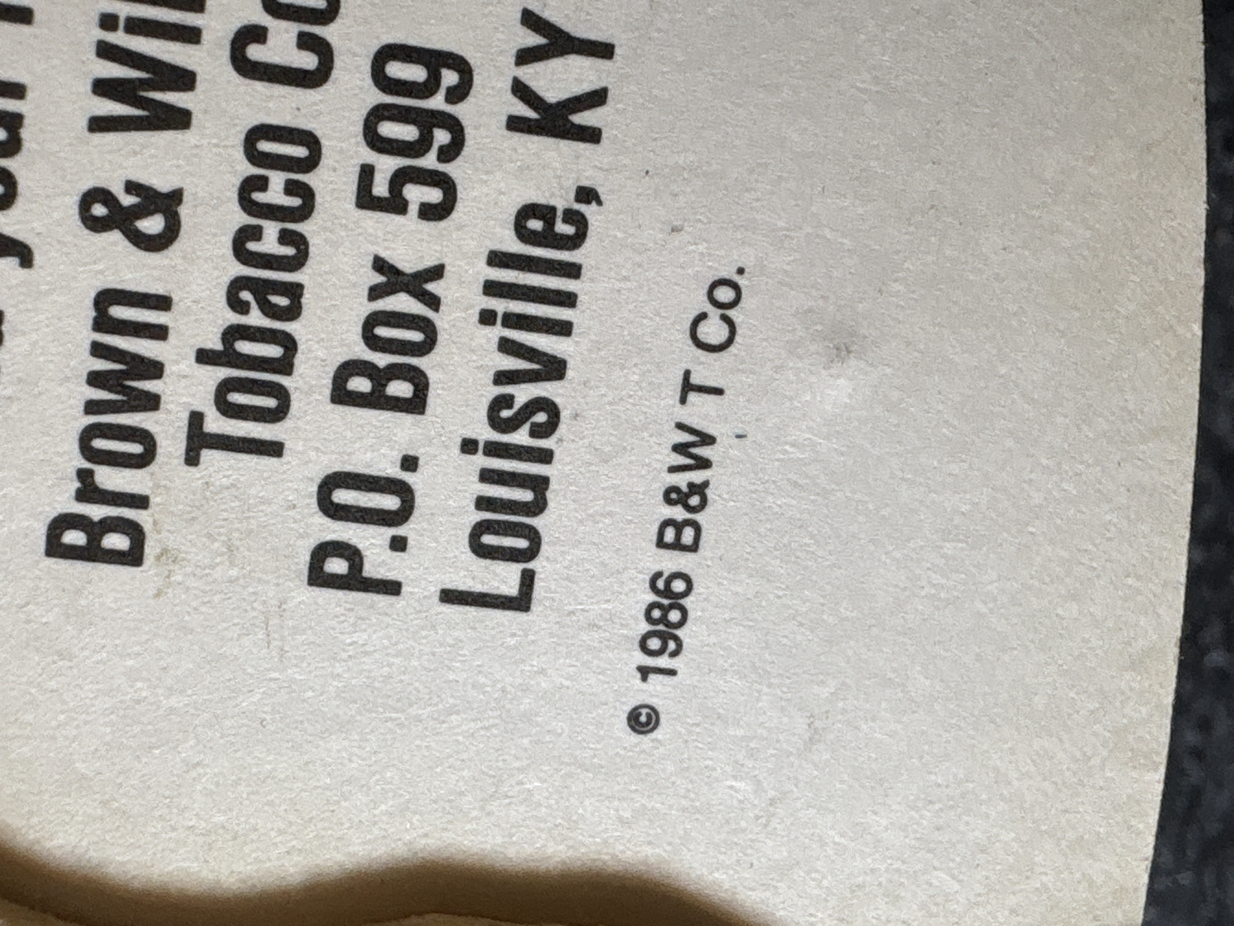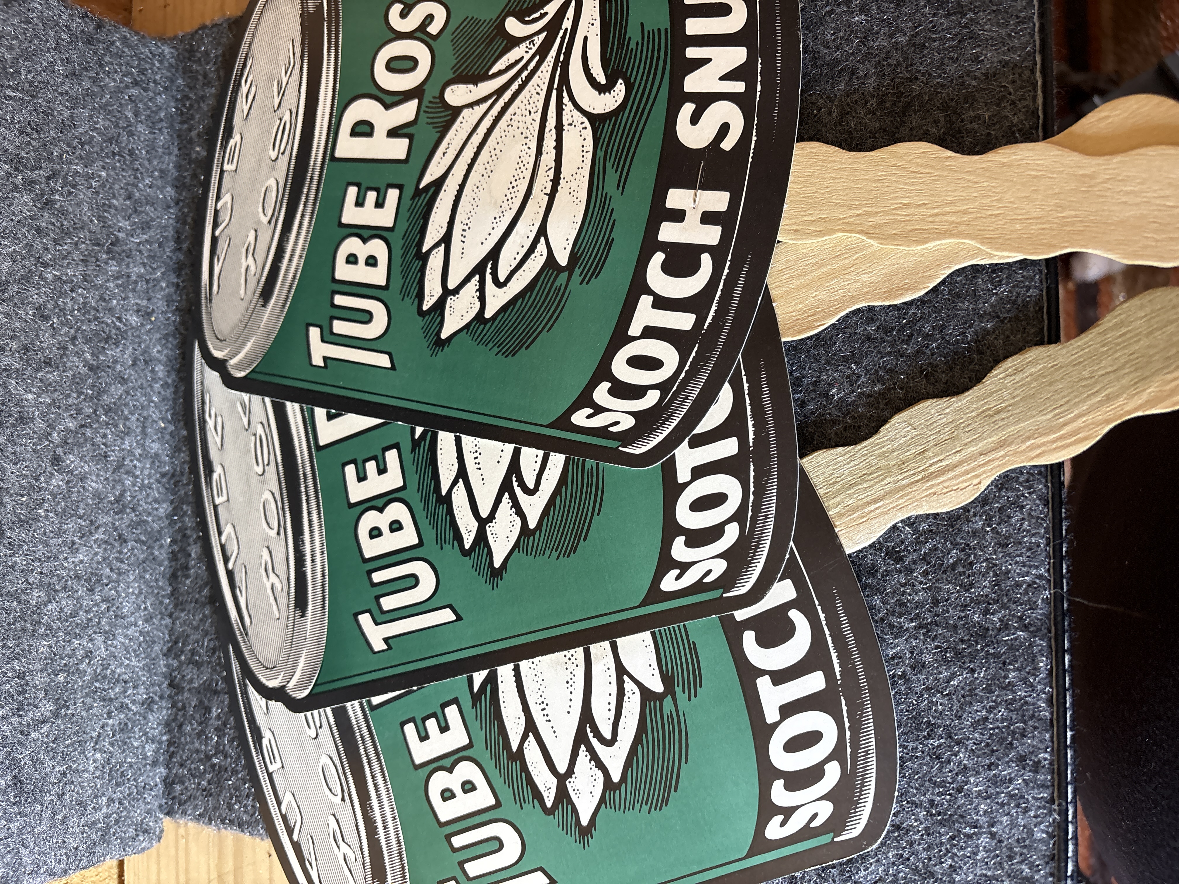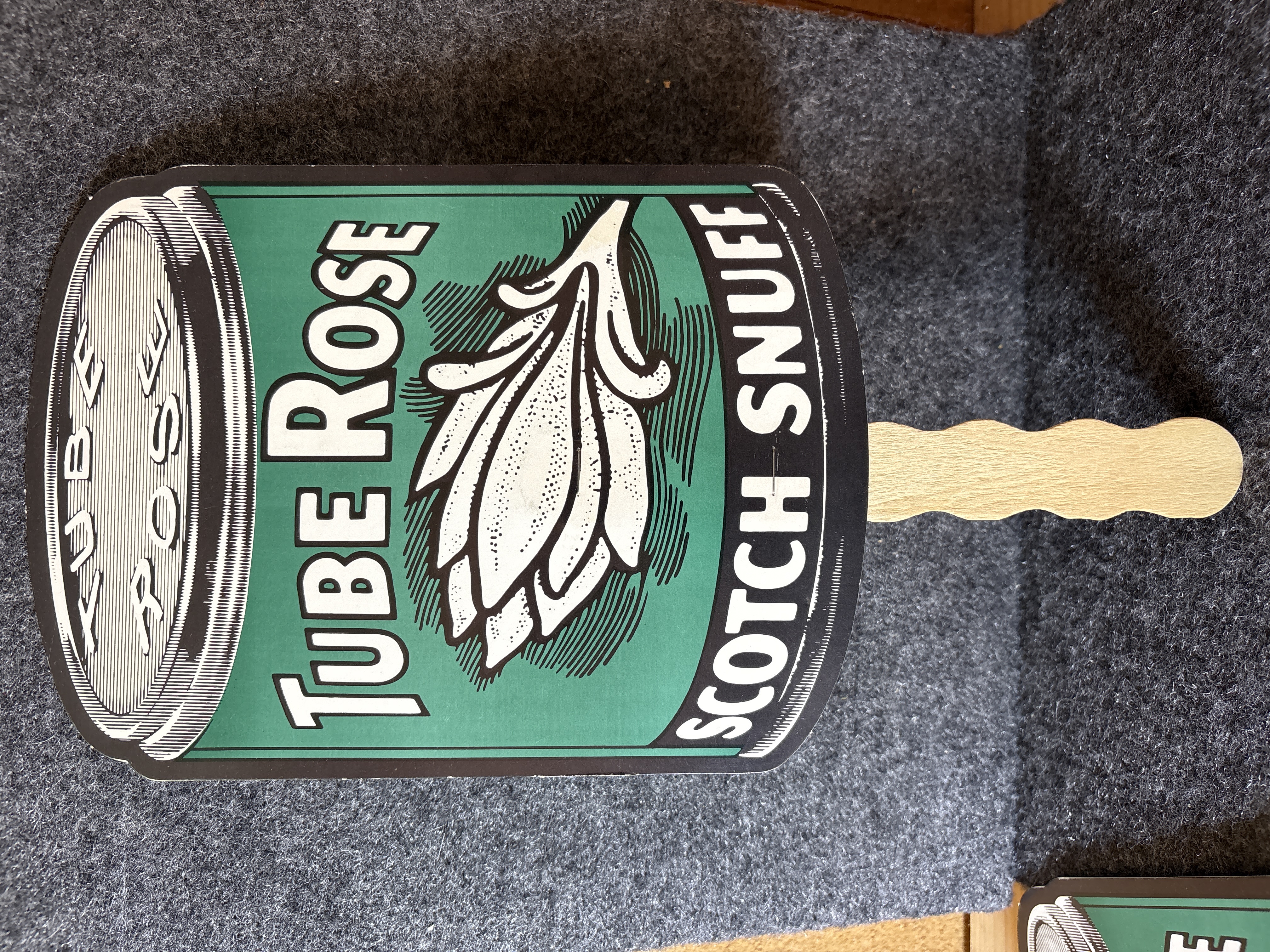 A trio of promotional hand fans for Tube Rose Sweet Scotch Snuff, produced for the Brown & Williamson Tobacco Corporation. Each fan is constructed from printed heavy cardstock secured to a wavy-contoured, natural-finish wooden handle with two metal staples. The front of each fan displays a graphic representation of a Tube Rose Scotch Snuff tin, featuring a green label with a white tuberose flower illustration and bold white text. The reverse side is printed with black marketing copy, including the slogan Never Tires Your Taste… All Day Long! and information regarding a gift catalog coupon program. The reverse also bears the manufacturer information for Brown & Williamson Tobacco Corporation in Louisville, Kentucky, and a copyright mark dated 1986.