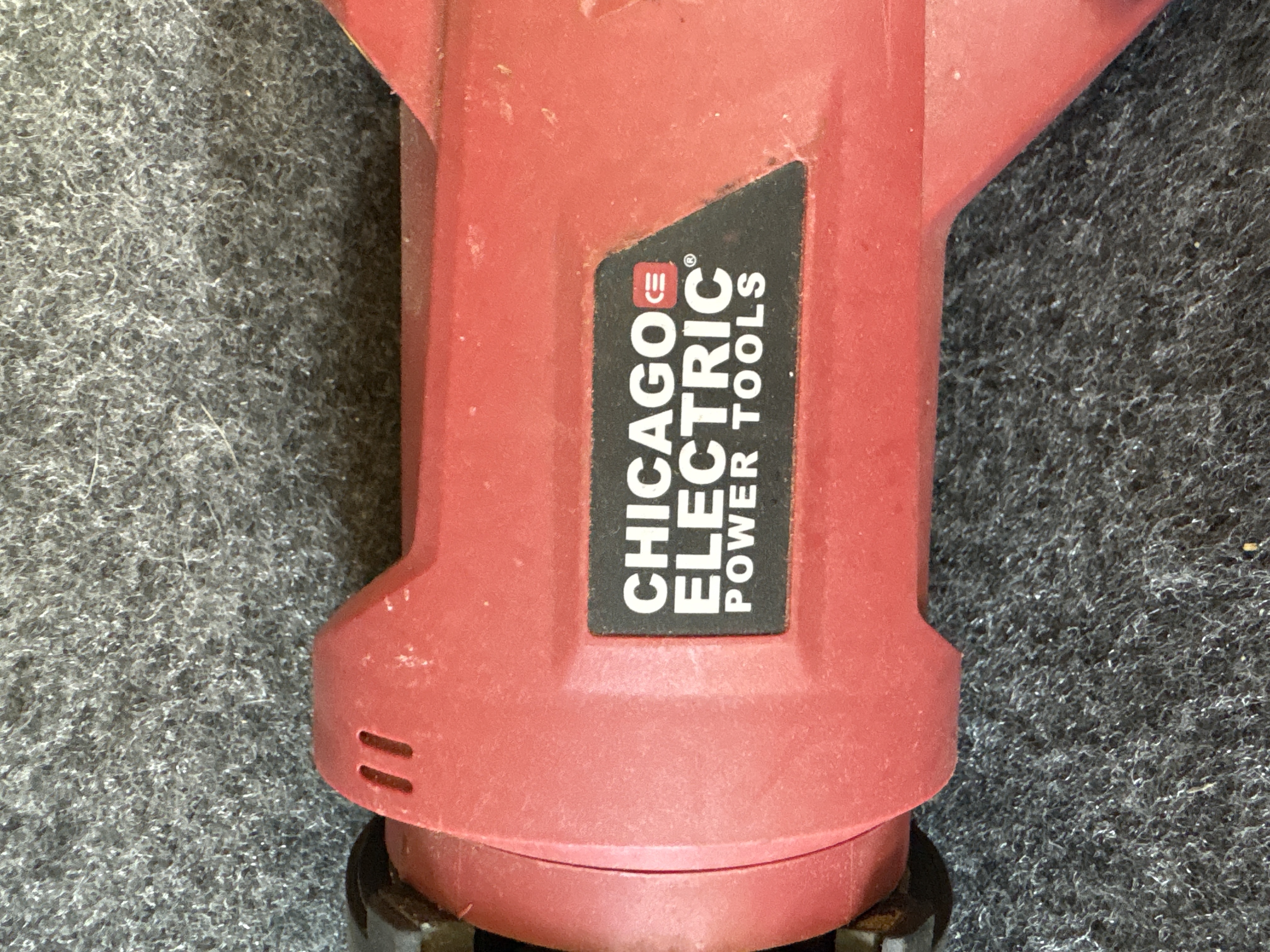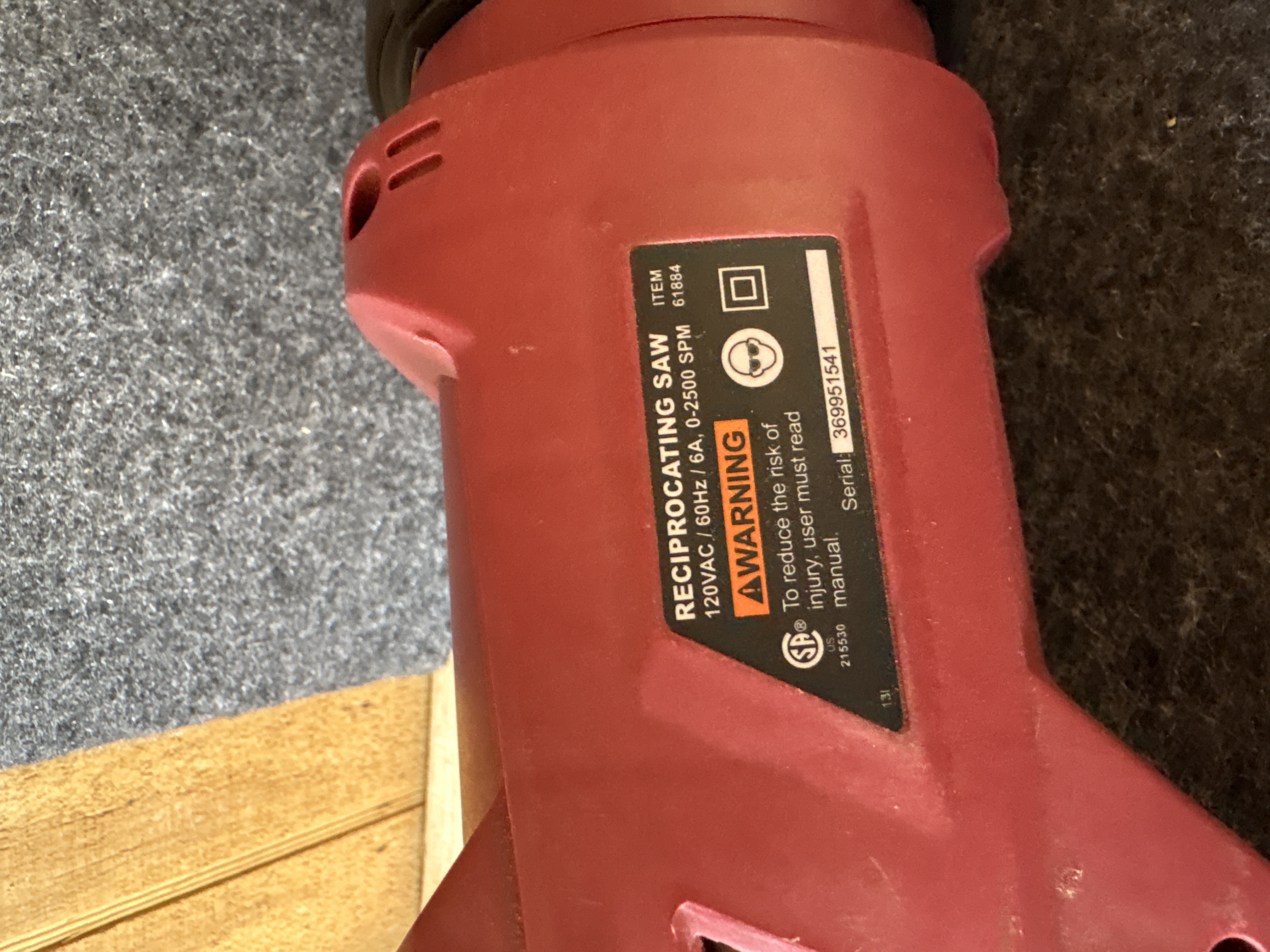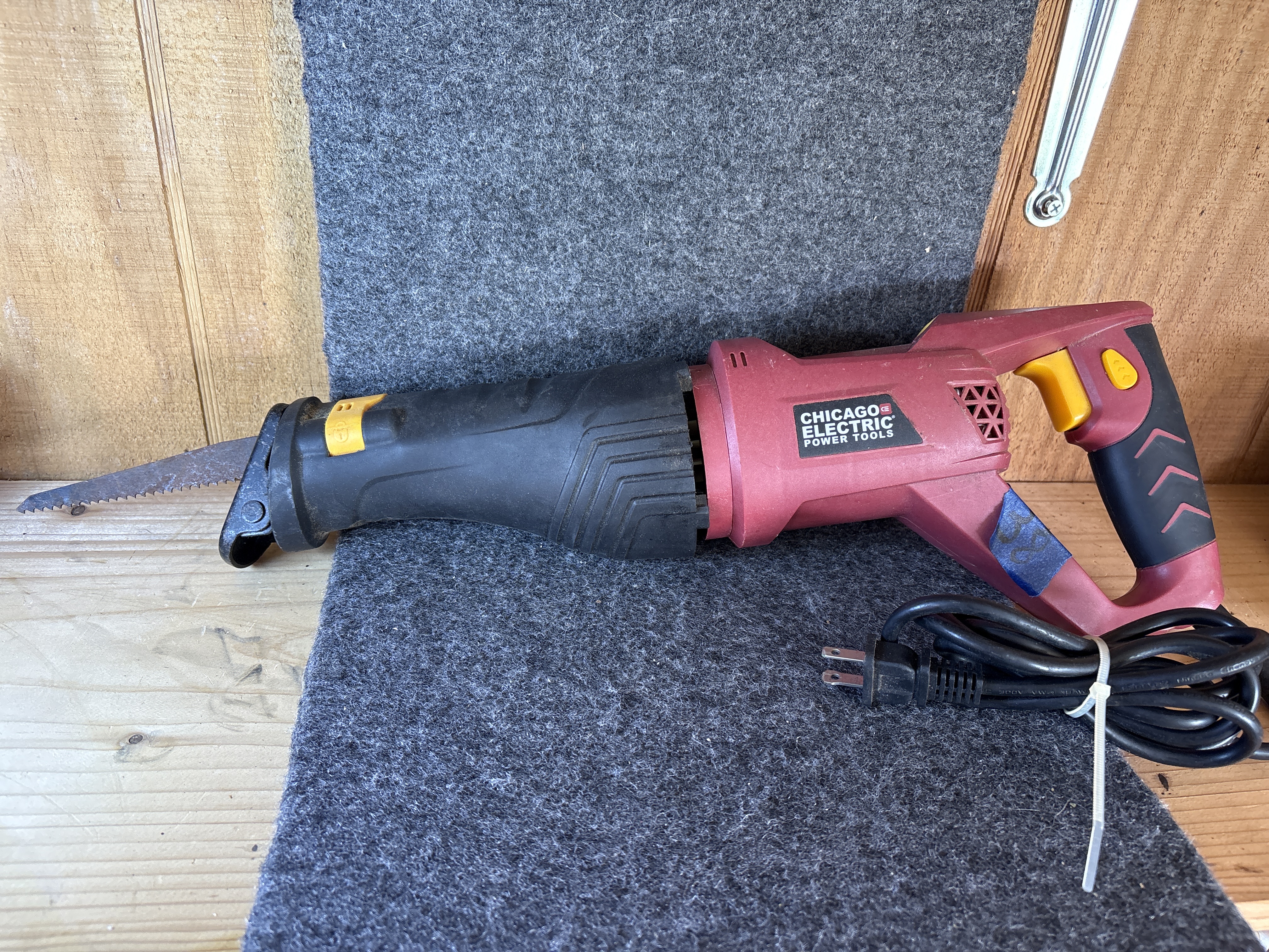 This is a Chicago Electric Power Tools corded reciprocating saw, item number 61884. The tool is equipped with a 6A motor designed for 120VAC operation, providing a variable speed range of 0-2500 strokes per minute (SPM). The housing is constructed of red and black plastic and features a rotating handle design. A manufacturer label is visible on the side of the tool body, which includes the serial number 369951541 and relevant electrical specifications. The unit has an integrated power cord that is currently bundled with a white plastic zip-tie. A single metal saw blade is installed in the chuck. This item is a loose tool and does not include original packaging, manuals, or additional accessories.