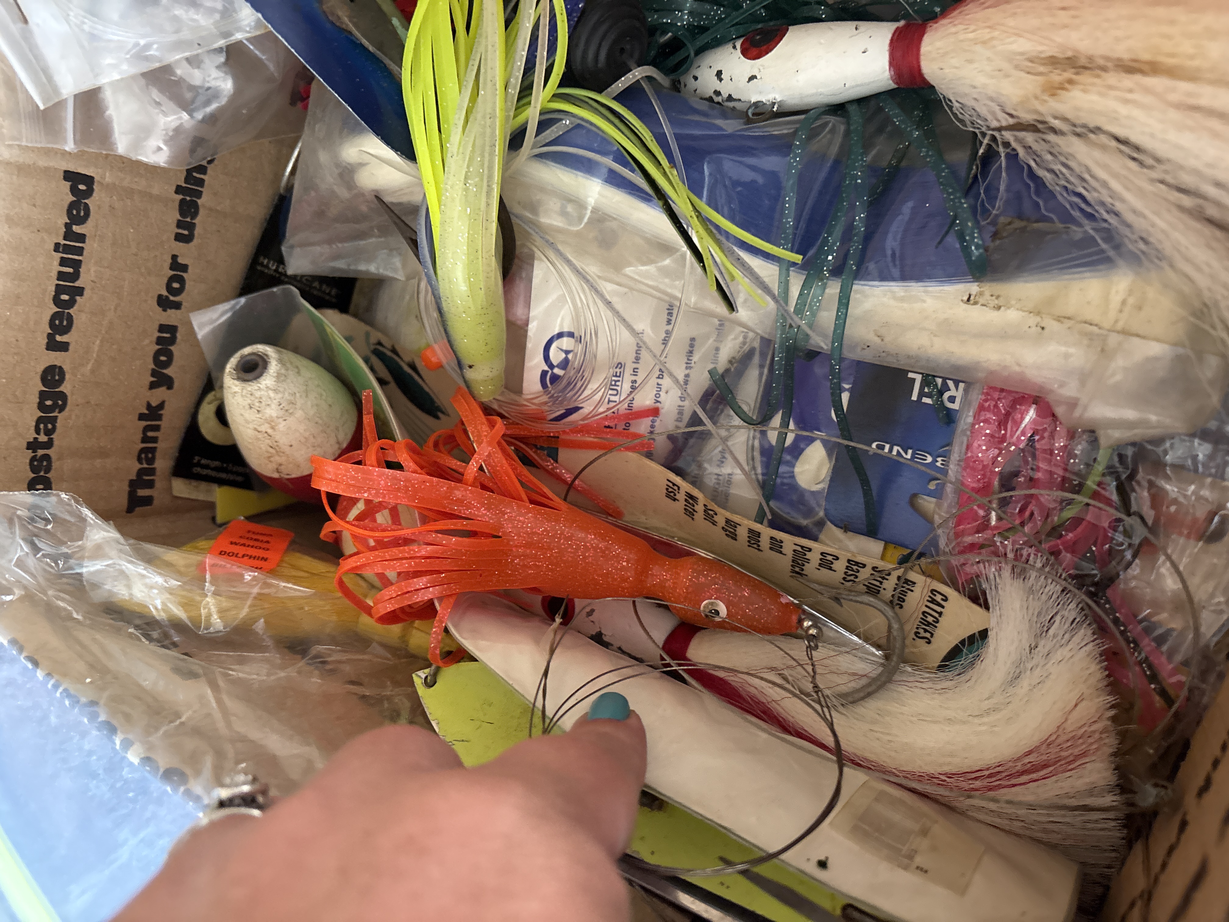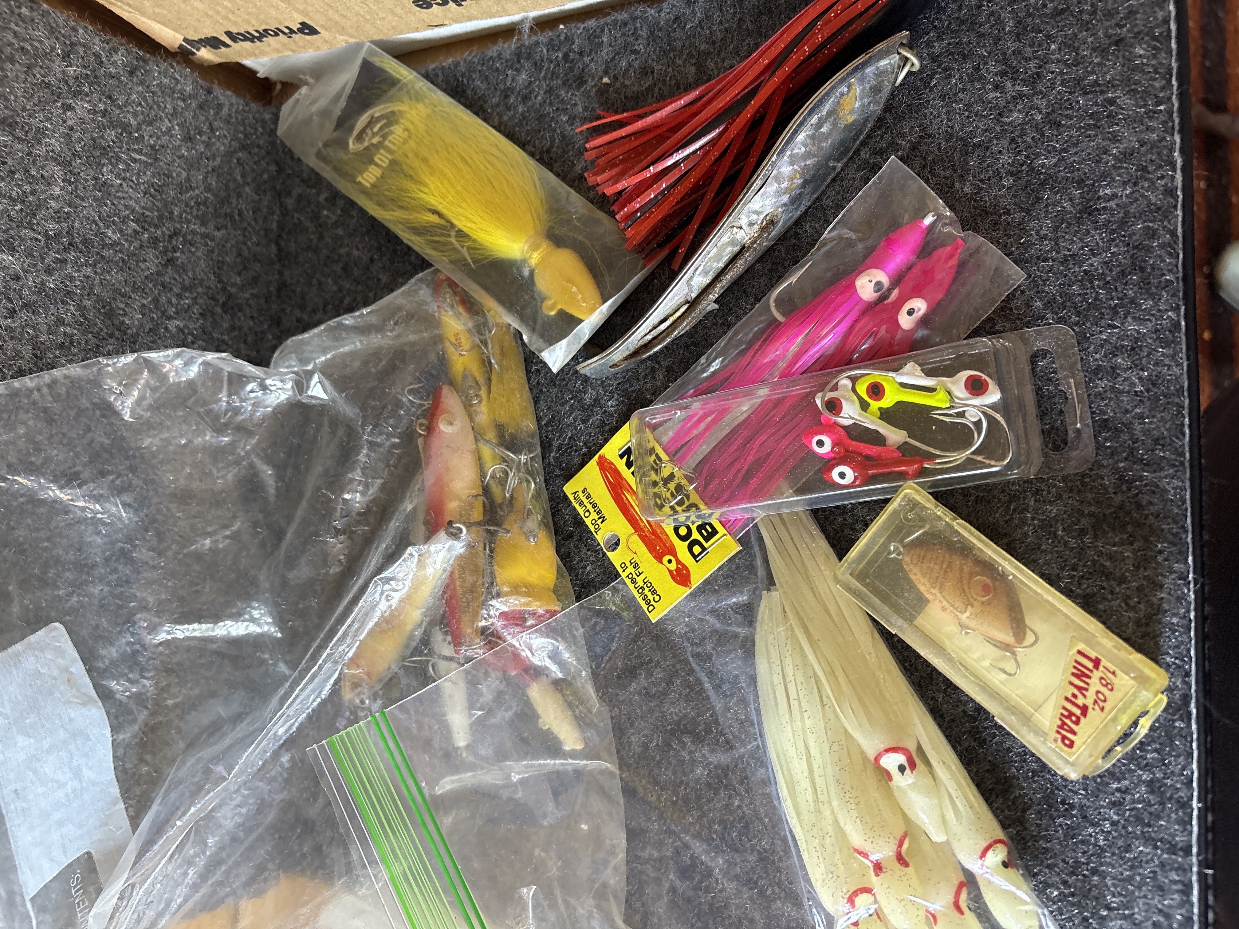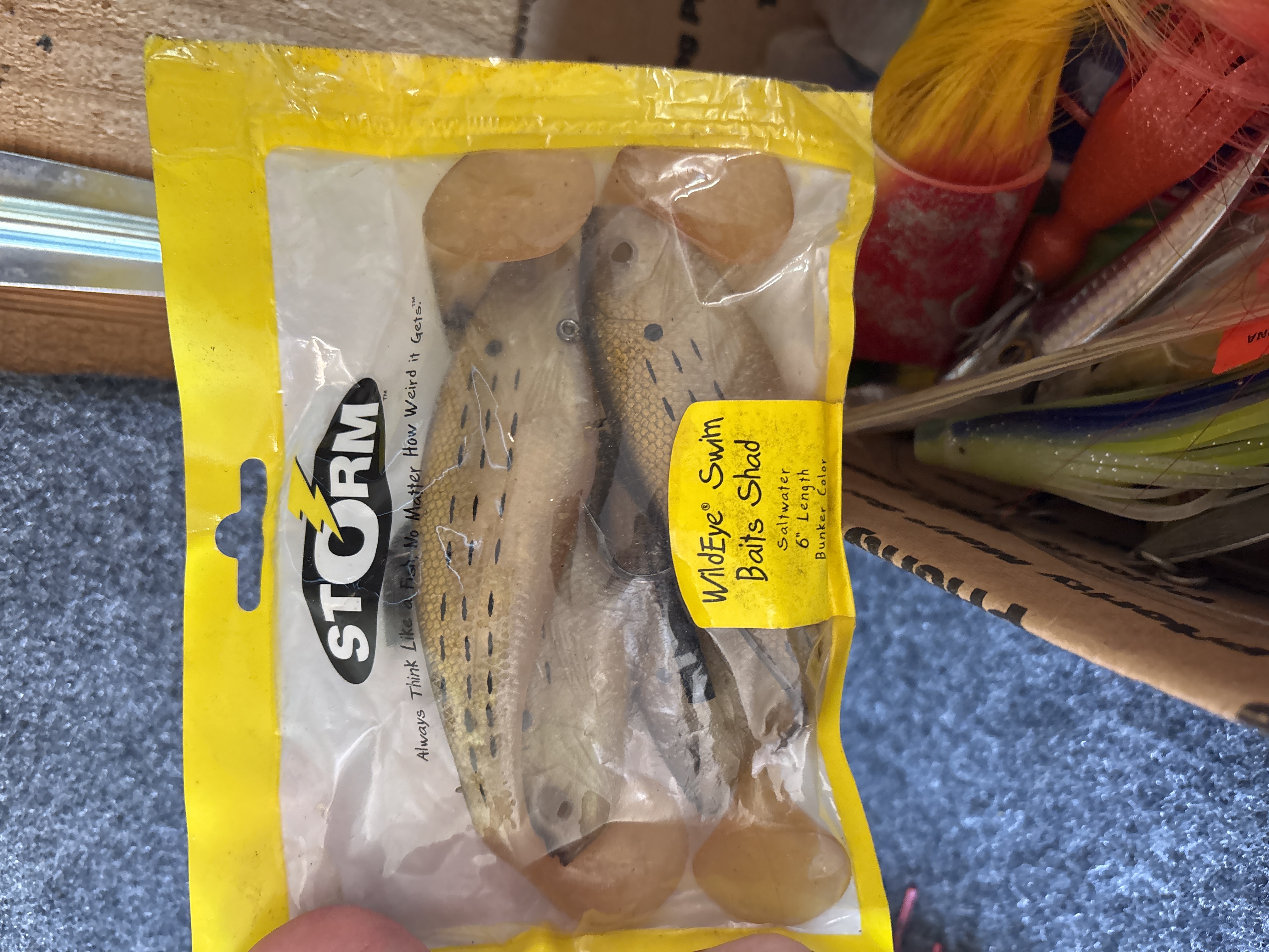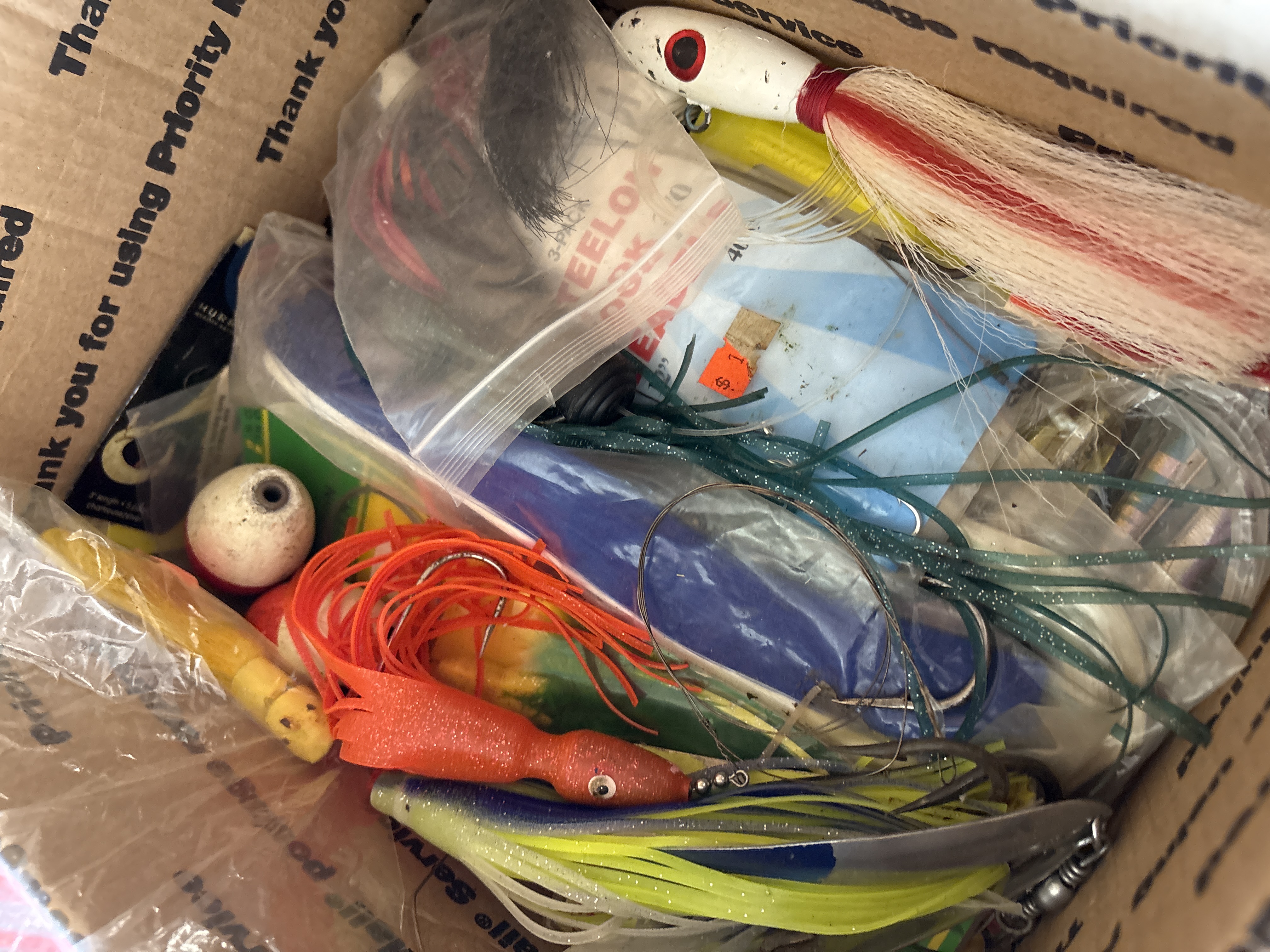 This collection comprises a variety of fishing tackle and lures designed for both saltwater and freshwater applications. Notable branded items include Storm WildEye Swim Baits in original packaging, featuring the 6 inch Bunker color 4 pack and the 4 inch Shiner Chartreuse Silver color 6 pack. Also present is a Bill Lewis Lures Tiny-Trap weighing 1/8 oz in its original plastic case. The lot includes a silver toned MirrOlure and an assortment of loose lures such as large bucktail jigs with white, red, and chartreuse hair, soft plastic squid lures in various colors including pink and orange, and several metal spoons and crankbaits. Accessories consist of steel hook leaders, bobbers, and lead head jigs. One clear plastic tackle box is included, marked with the OWALA brand on the lid and molded with Flambeau Products Corp. Middlefield, Ohio Made in U.S.A. on the base.