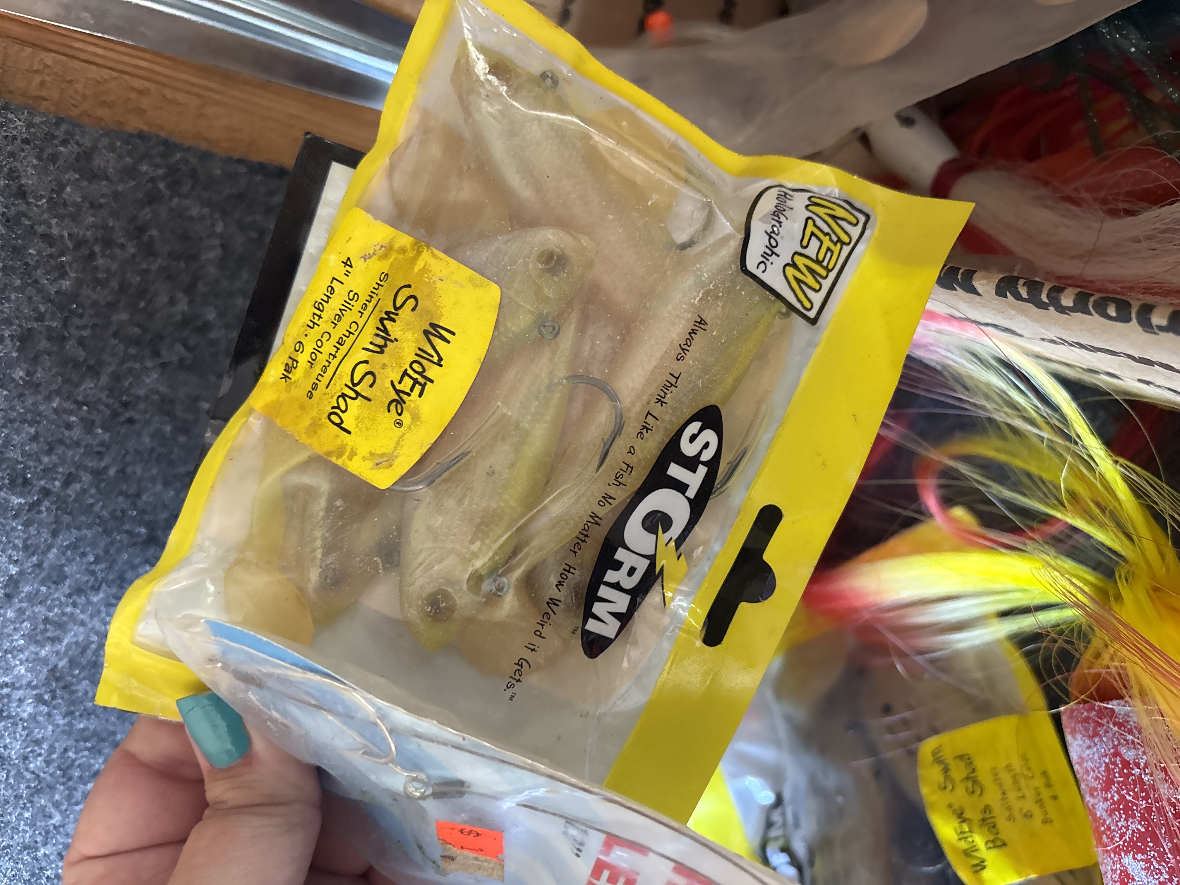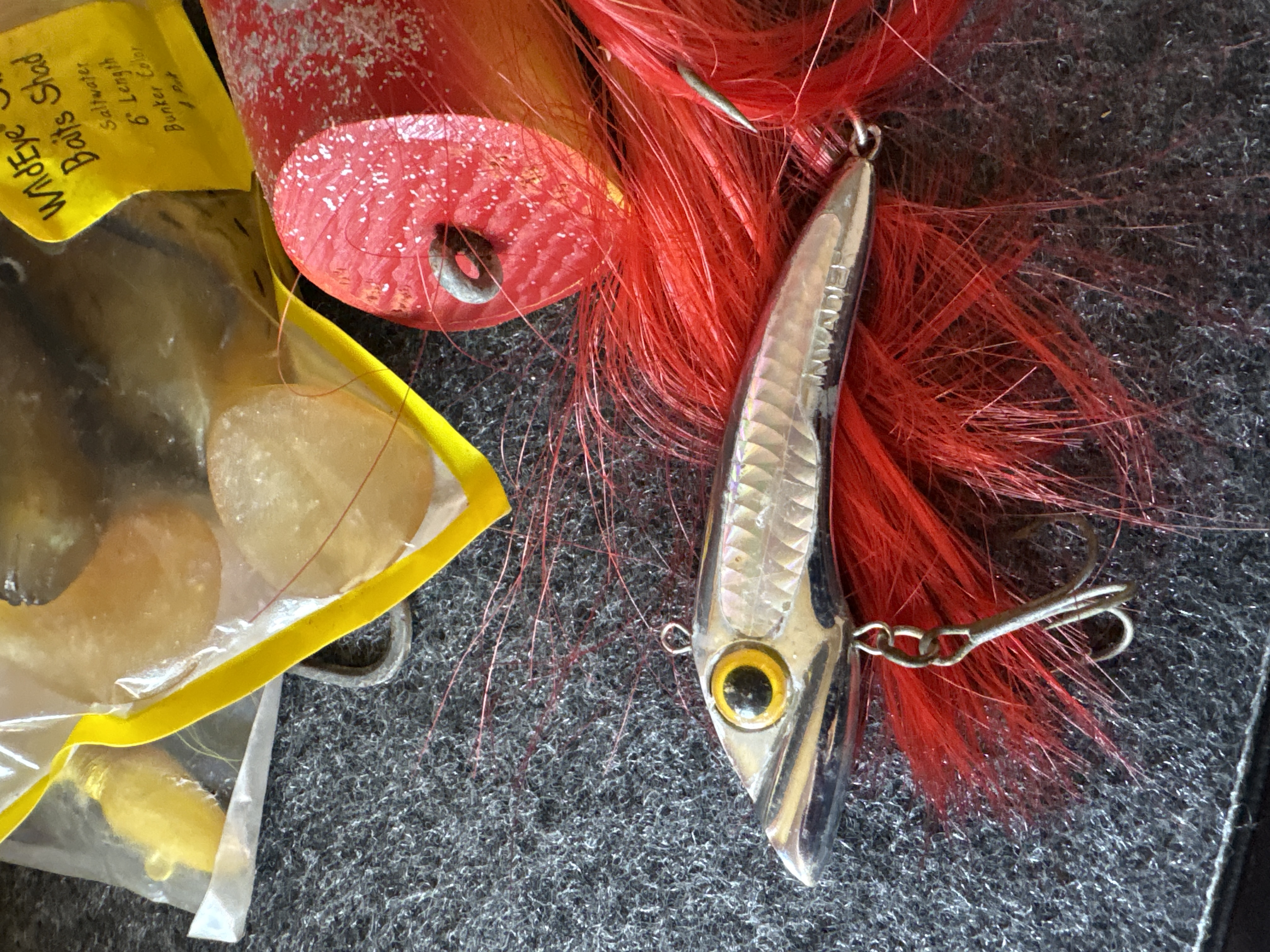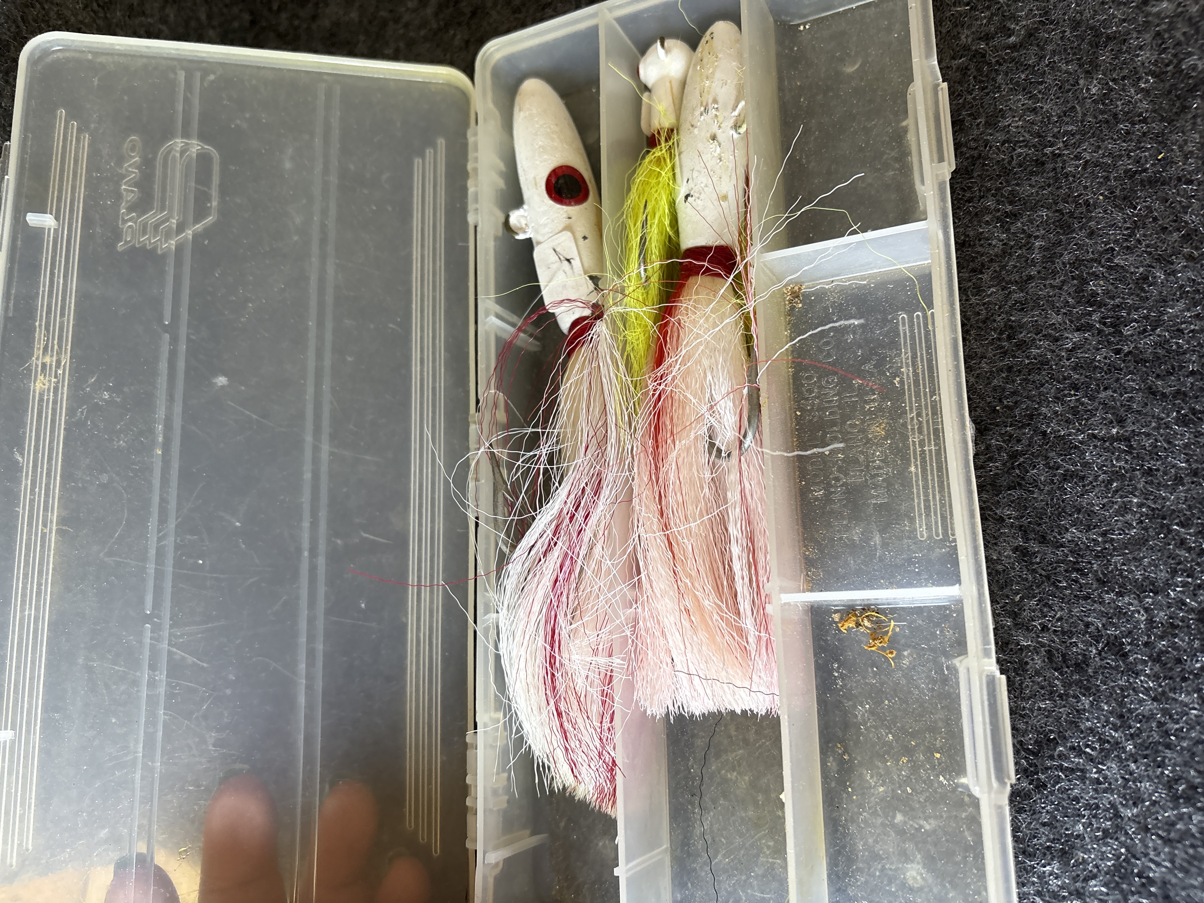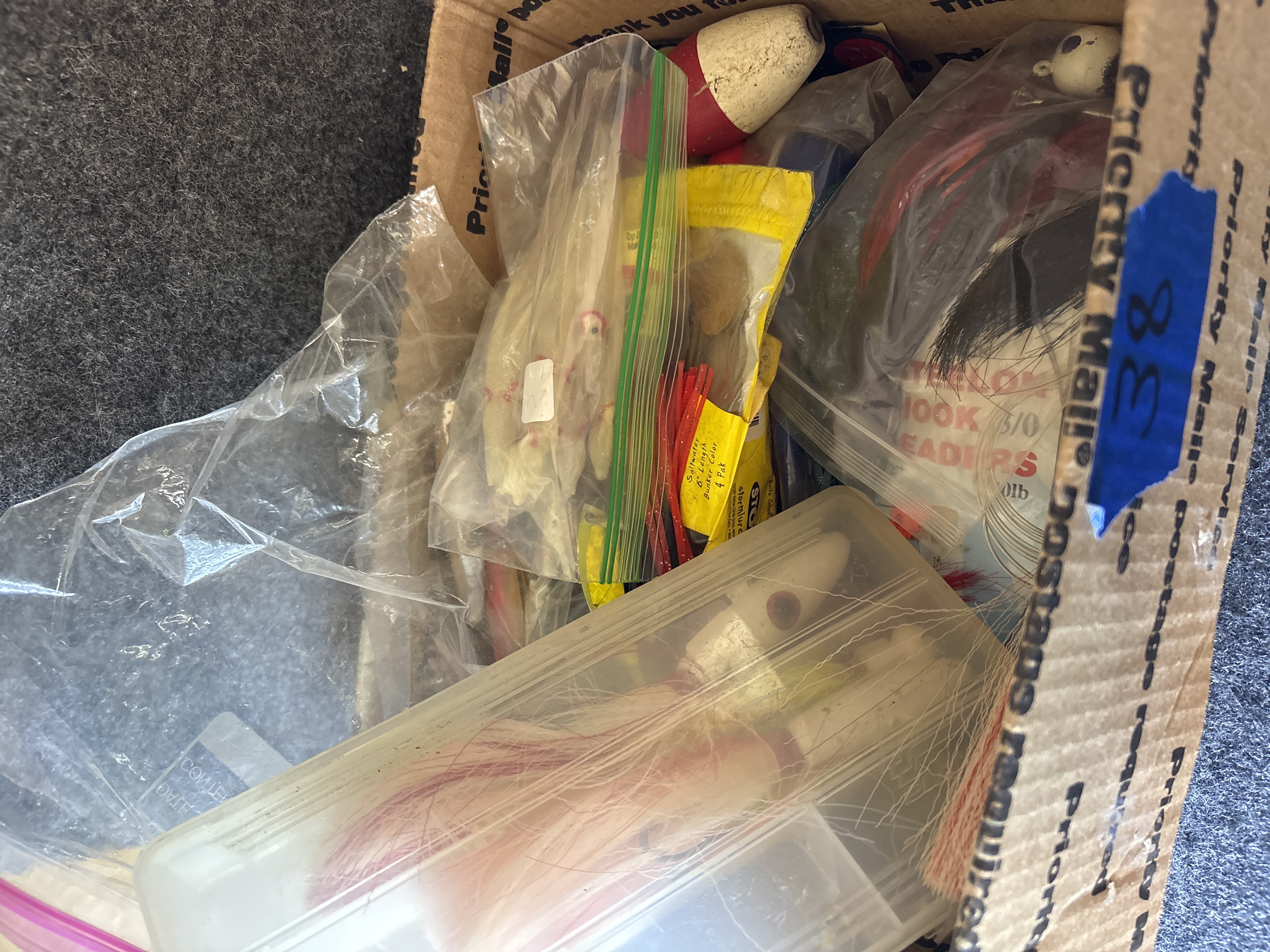 This collection comprises a variety of fishing tackle and lures designed for both saltwater and freshwater applications. Notable branded items include Storm WildEye Swim Baits in original packaging, featuring the 6 inch Bunker color 4 pack and the 4 inch Shiner Chartreuse Silver color 6 pack. Also present is a Bill Lewis Lures Tiny-Trap weighing 1/8 oz in its original plastic case. The lot includes a silver toned MirrOlure and an assortment of loose lures such as large bucktail jigs with white, red, and chartreuse hair, soft plastic squid lures in various colors including pink and orange, and several metal spoons and crankbaits. Accessories consist of steel hook leaders, bobbers, and lead head jigs. One clear plastic tackle box is included, marked with the OWALA brand on the lid and molded with Flambeau Products Corp. Middlefield, Ohio Made in U.S.A. on the base.