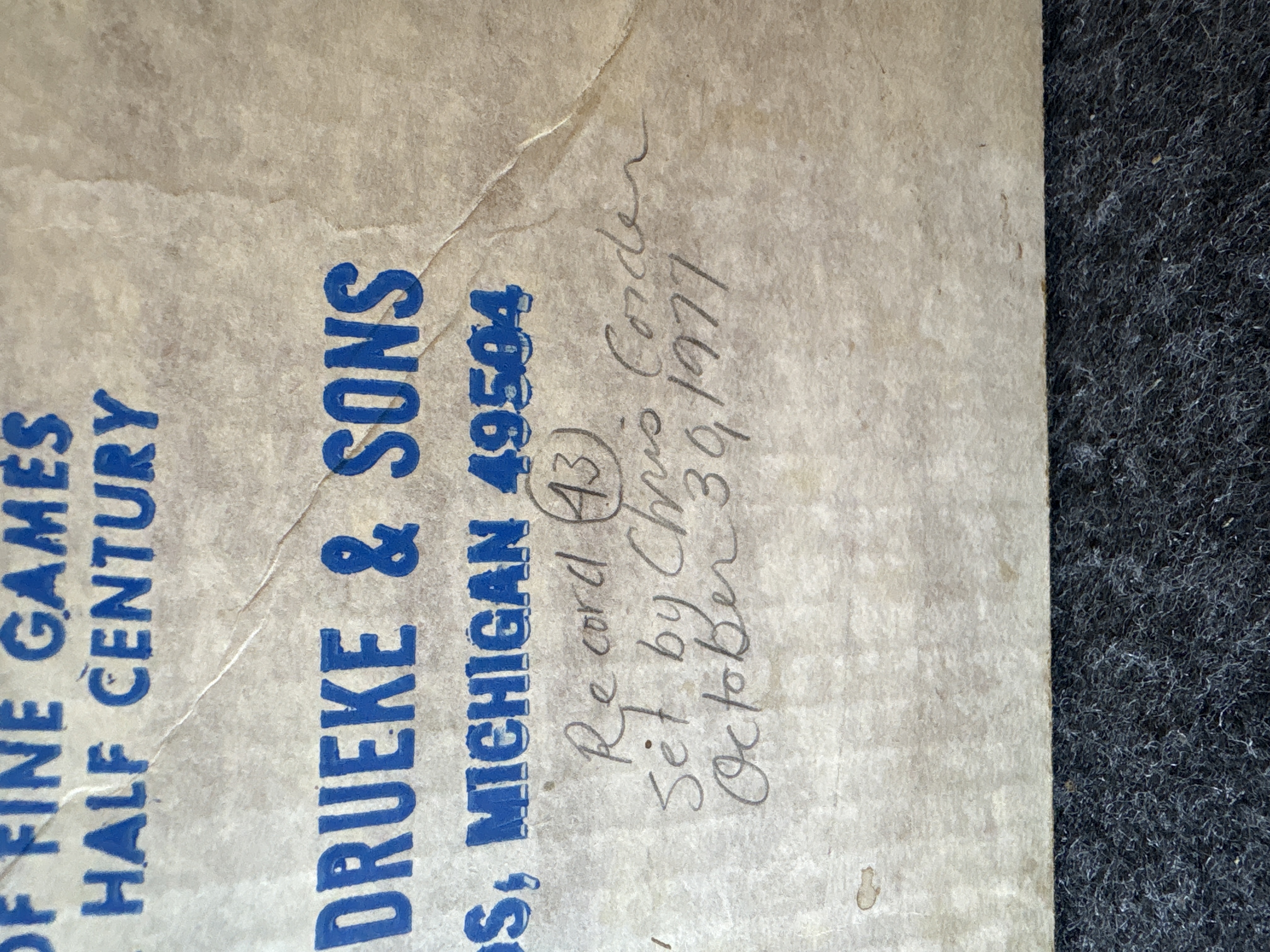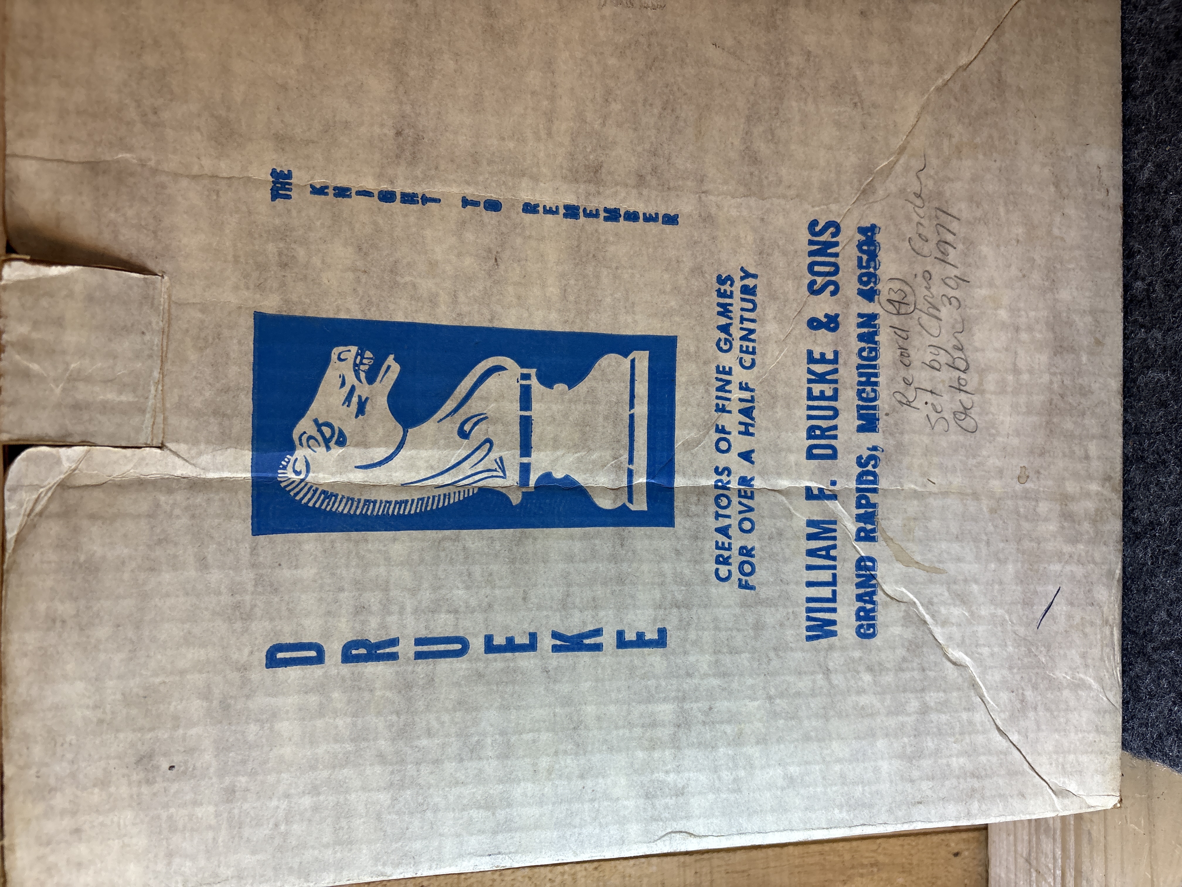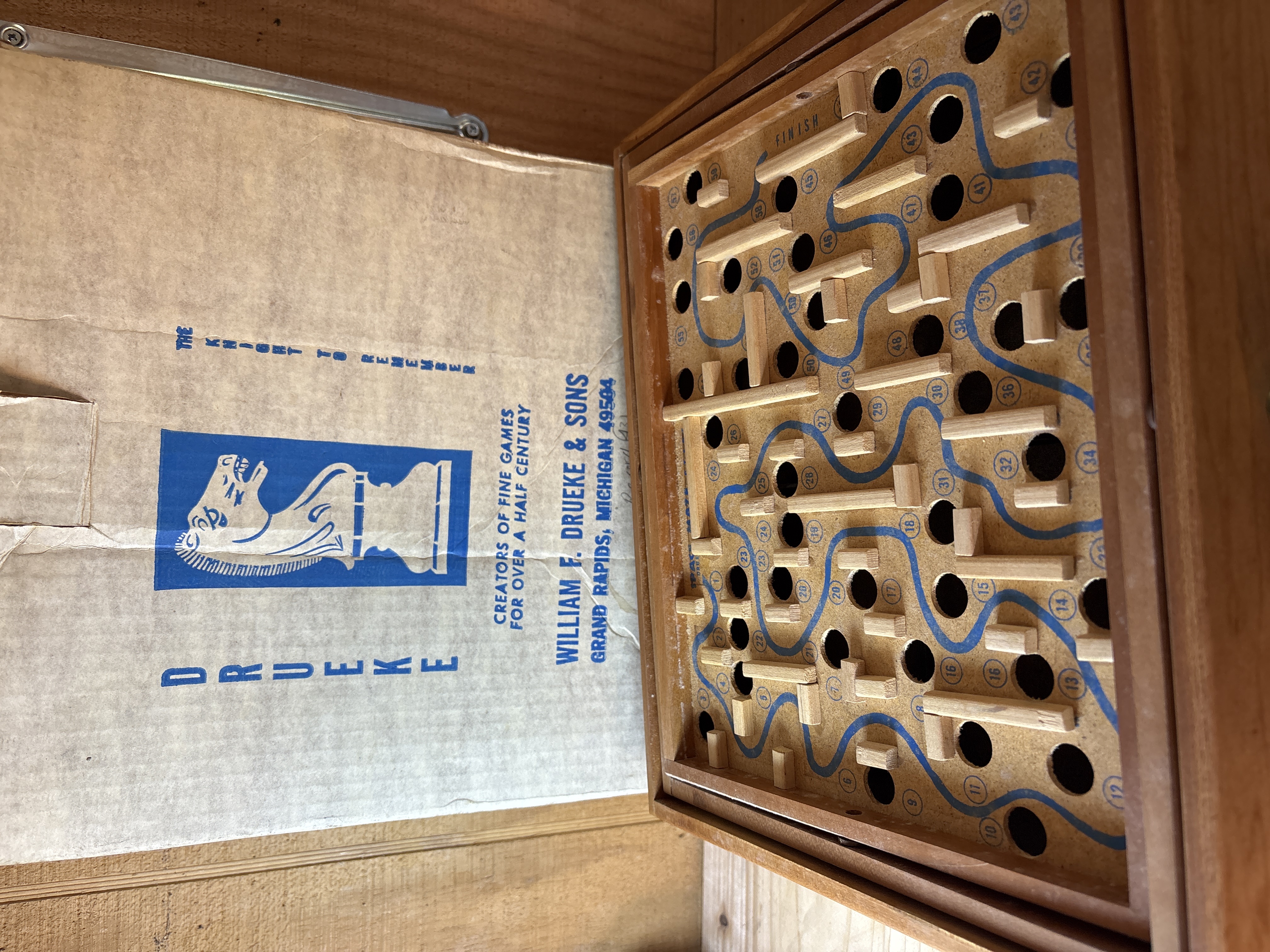 This vintage manual tilt-action marble labyrinth is the Space Maze Star model manufactured by William F. Drueke and Sons of Grand Rapids, Michigan. The game is constructed with a wooden outer frame and internal wooden dividers arranged in a maze pattern. The game board surface consists of printed fiberboard featuring a blue path and numbered holes ranging from 1 to 60. A green plastic knob located on the side of the frame operates the internal tilting mechanism used to navigate the marble through the course. The game board is printed with Space Maze Star and Drueke in the lower left corner. The original cardboard box is included, featuring the Drueke knight chess piece logo and the text The Knight to Remember, Creators of Fine Games for Over a Half Century. The box lid contains handwritten ballpoint pen notations including Record (43) set by Chris Corder and the date October 30, 1977. This lot includes the game unit, one clear glass marble, and the original packaging.