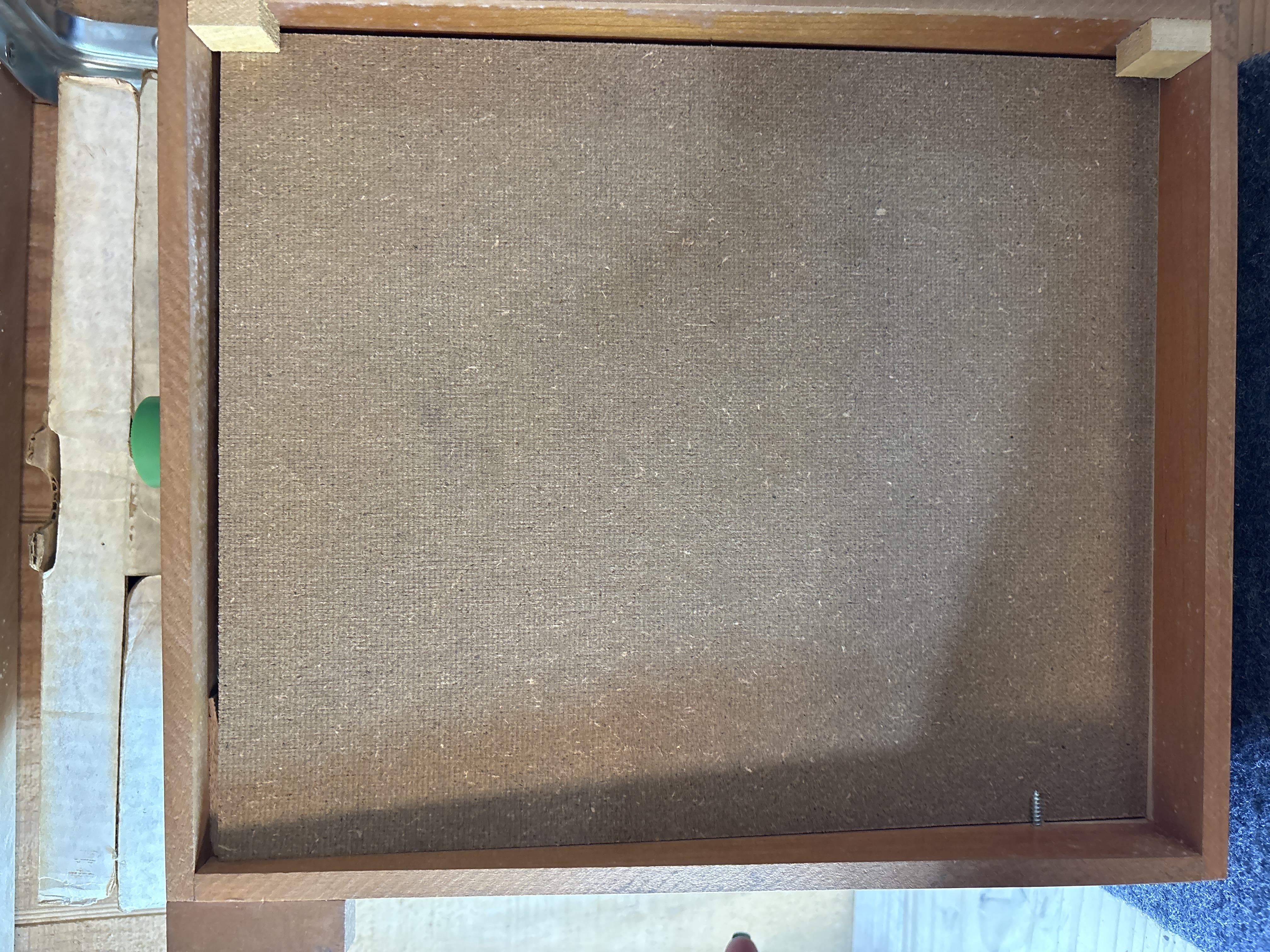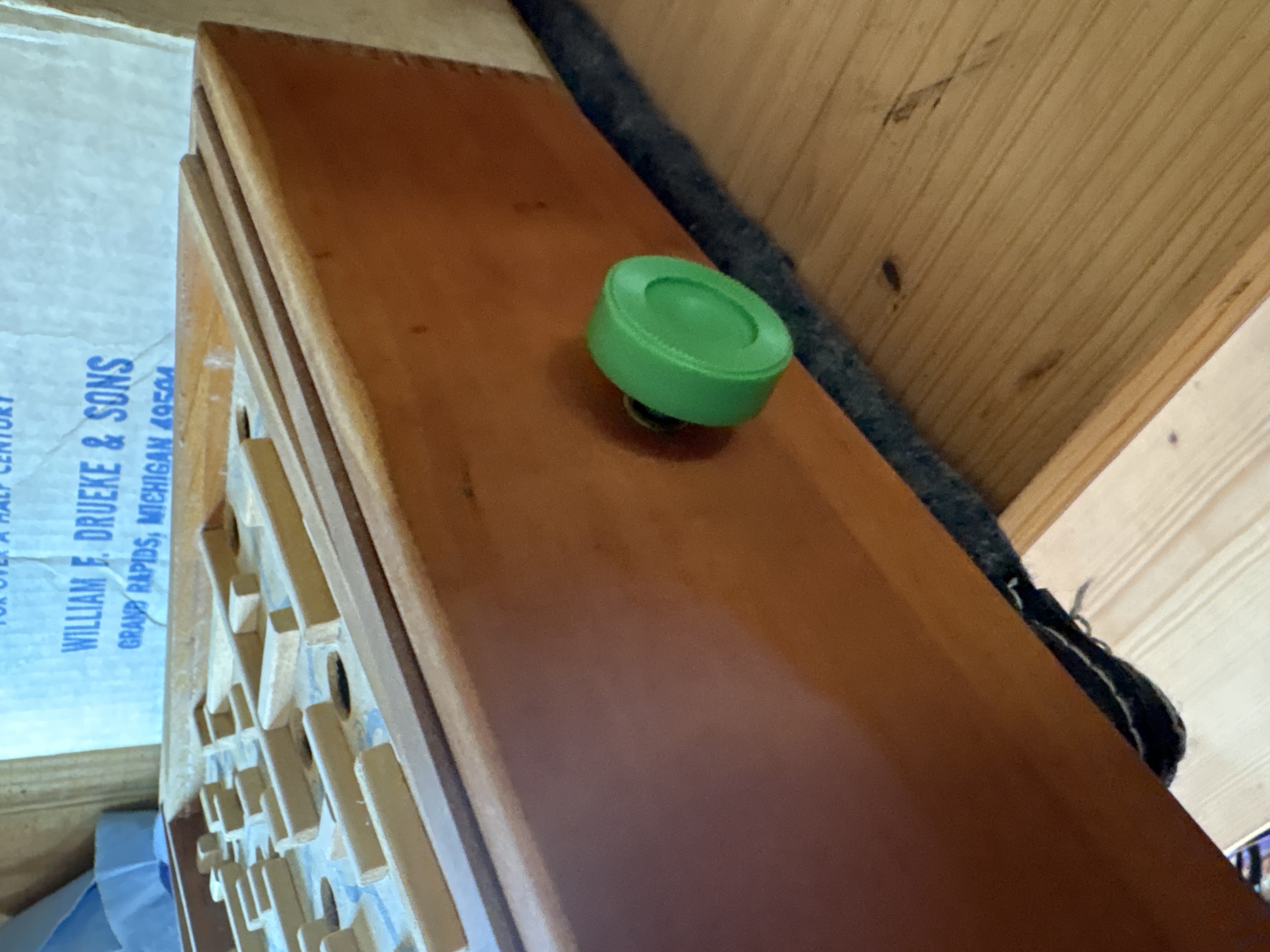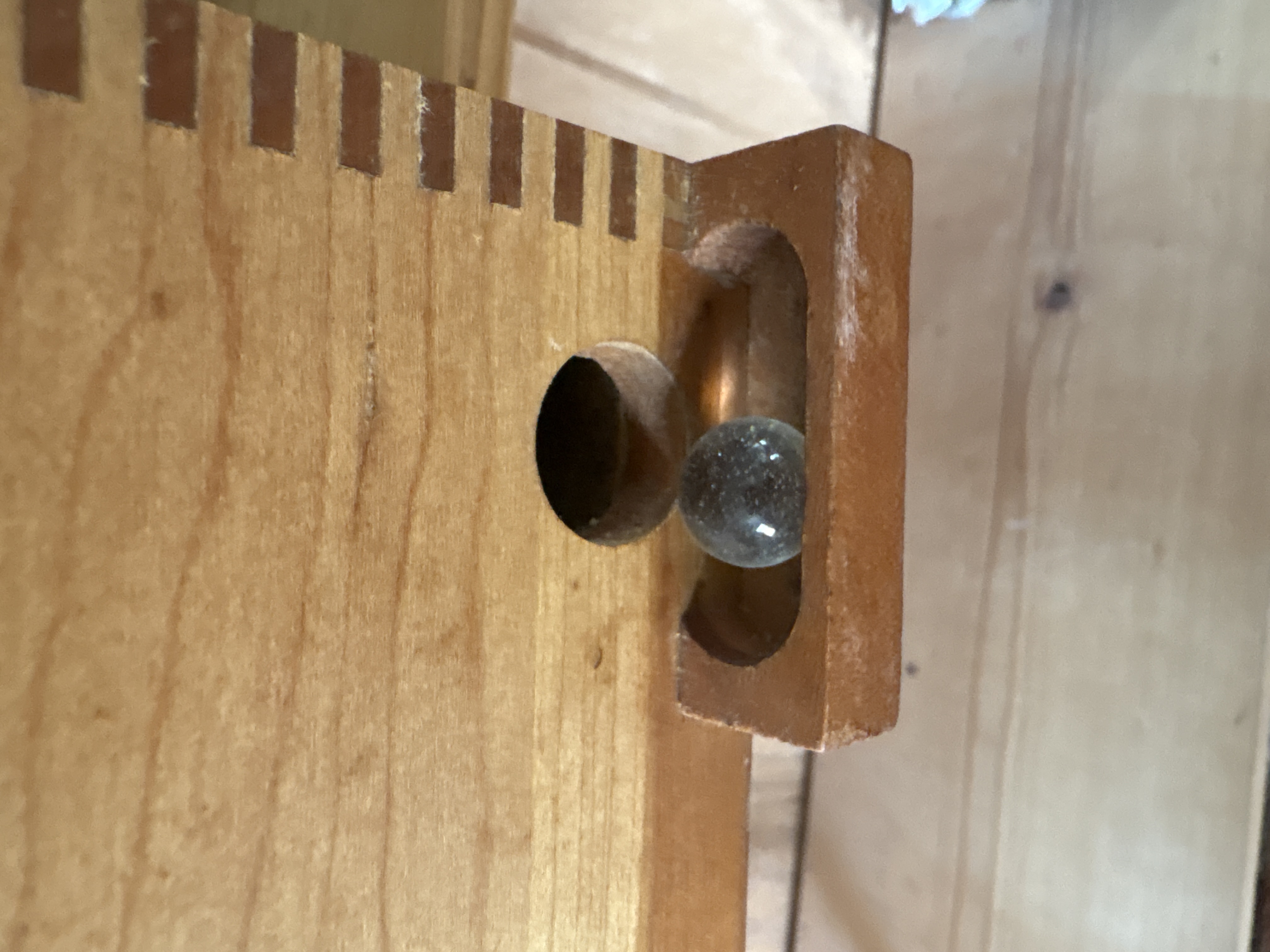 This vintage manual tilt-action marble labyrinth is the Space Maze Star model manufactured by William F. Drueke and Sons of Grand Rapids, Michigan. The game is constructed with a wooden outer frame and internal wooden dividers arranged in a maze pattern. The game board surface consists of printed fiberboard featuring a blue path and numbered holes ranging from 1 to 60. A green plastic knob located on the side of the frame operates the internal tilting mechanism used to navigate the marble through the course. The game board is printed with Space Maze Star and Drueke in the lower left corner. The original cardboard box is included, featuring the Drueke knight chess piece logo and the text The Knight to Remember, Creators of Fine Games for Over a Half Century. The box lid contains handwritten ballpoint pen notations including Record (43) set by Chris Corder and the date October 30, 1977. This lot includes the game unit, one clear glass marble, and the original packaging.