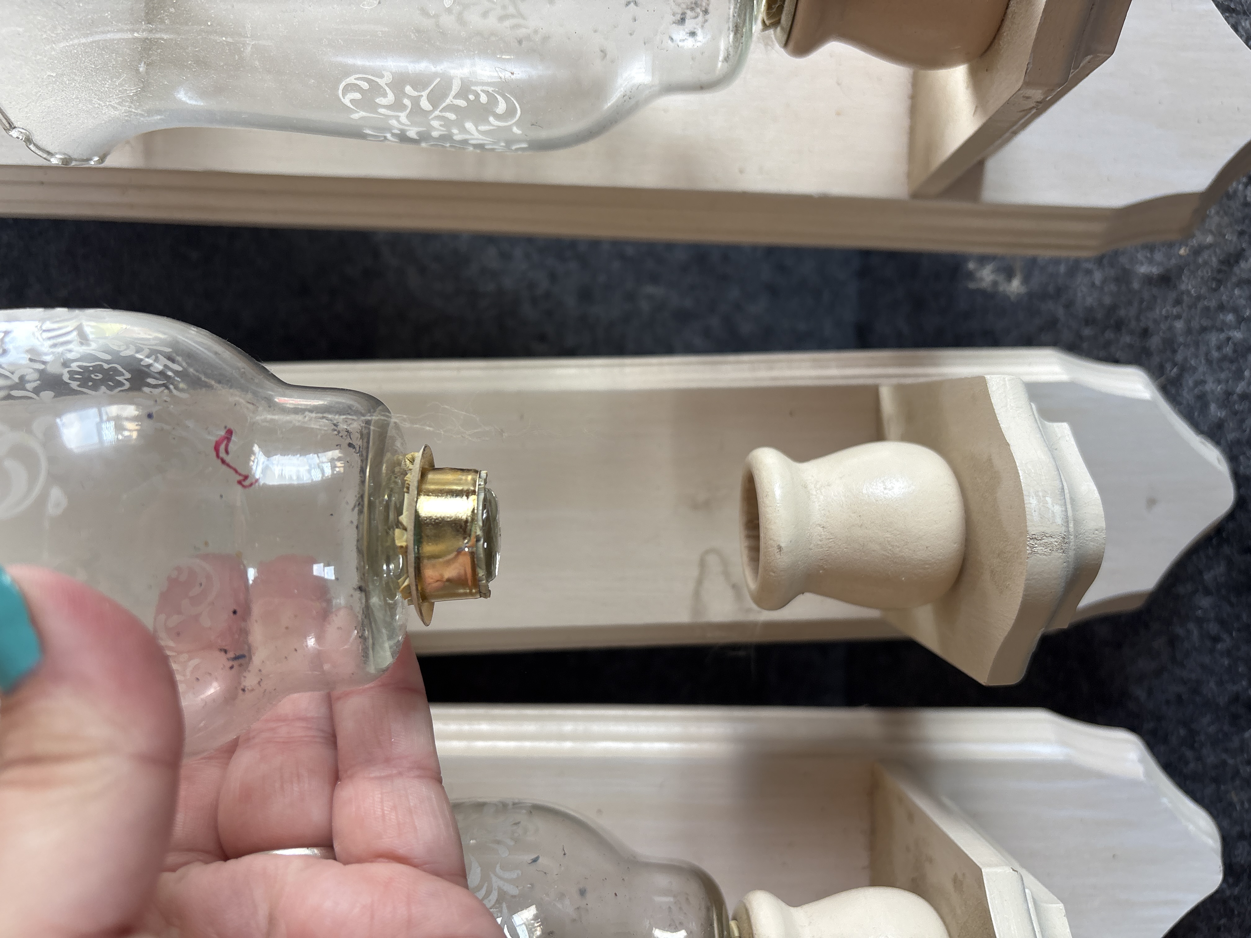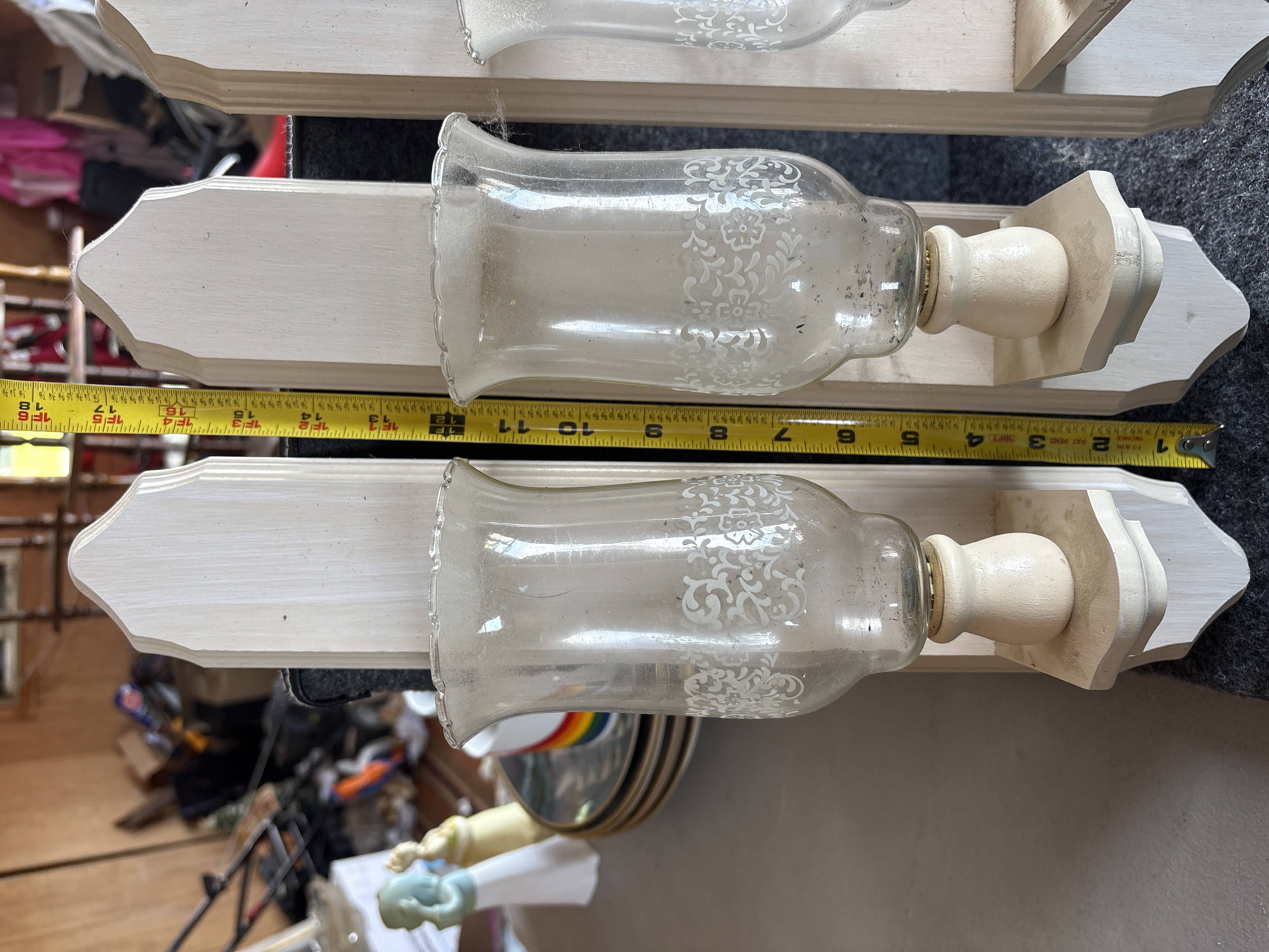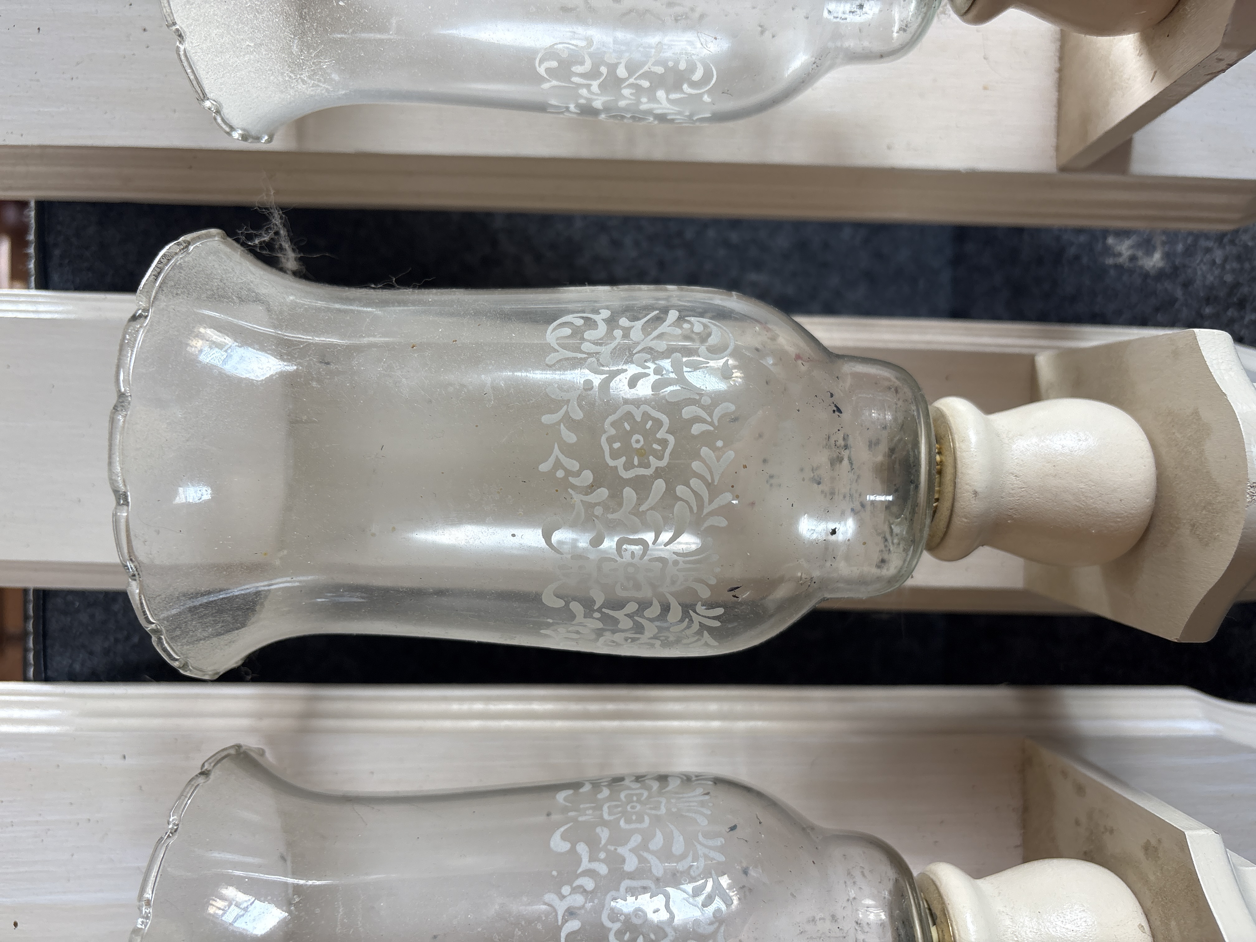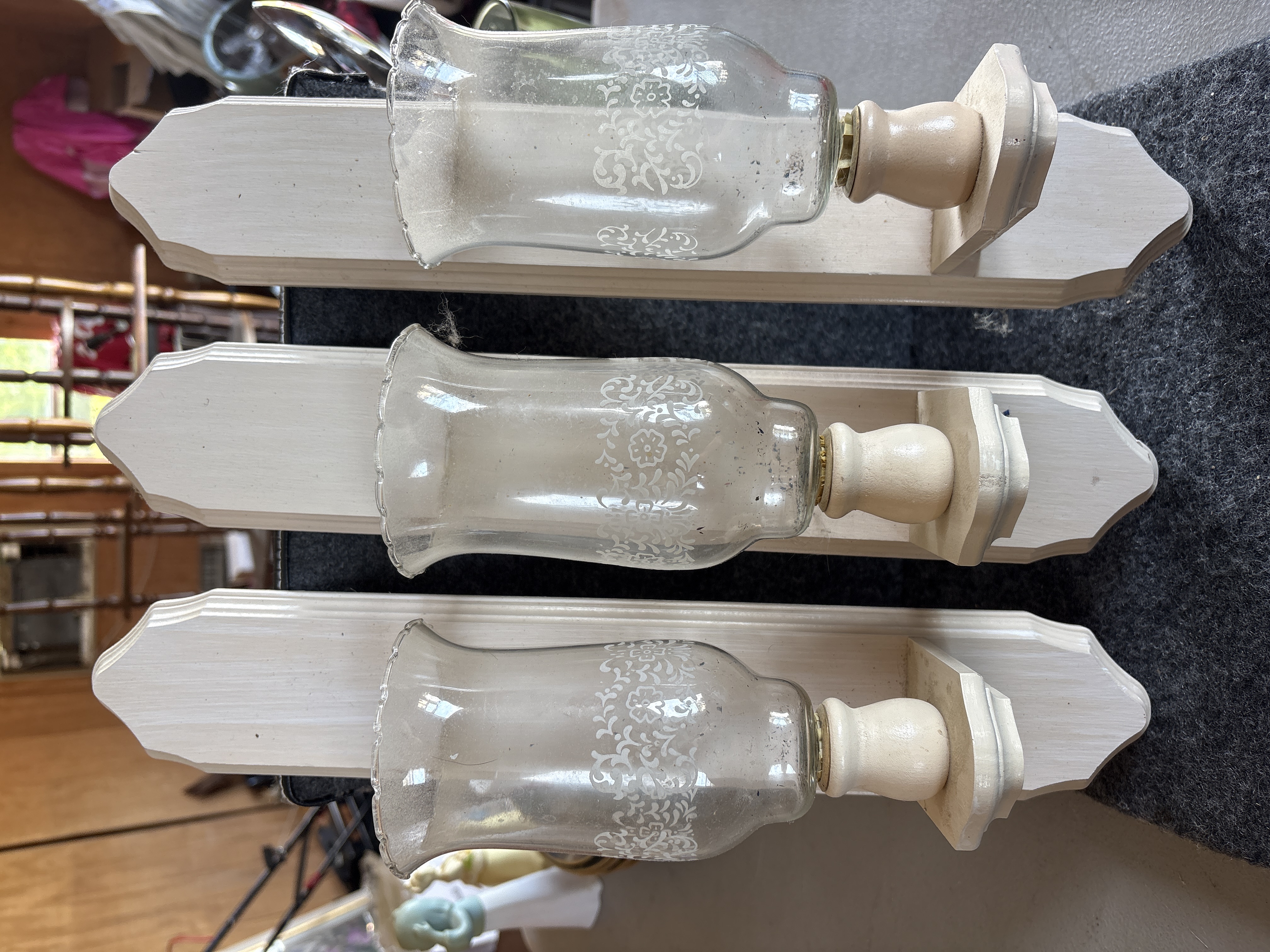 This lot consists of three matching non-electrical wall-mounted candle sconces. Each unit features a white-painted wooden backboard shaped in a picket-fence style with pointed top and bottom terminals. A small protruding wooden shelf supports a turned wooden holder equipped with a metal cup insert. The clear glass hurricane shades feature a scalloped pie-crust top rim and a decorative central band of white etched floral and scrollwork motifs. The shades are removable and utilize a peg-base fitting to sit within the wooden sockets. These sconces are designed for use with tea lights or small votive candles. No maker marks or labels are present on the wooden or glass components.