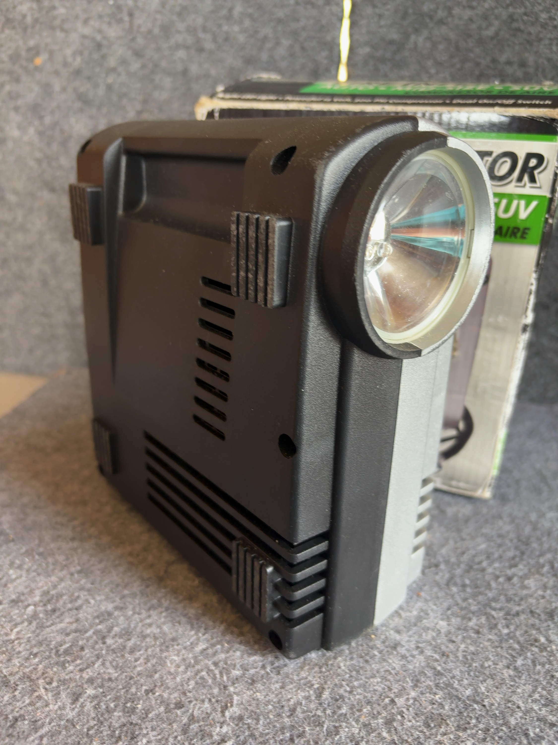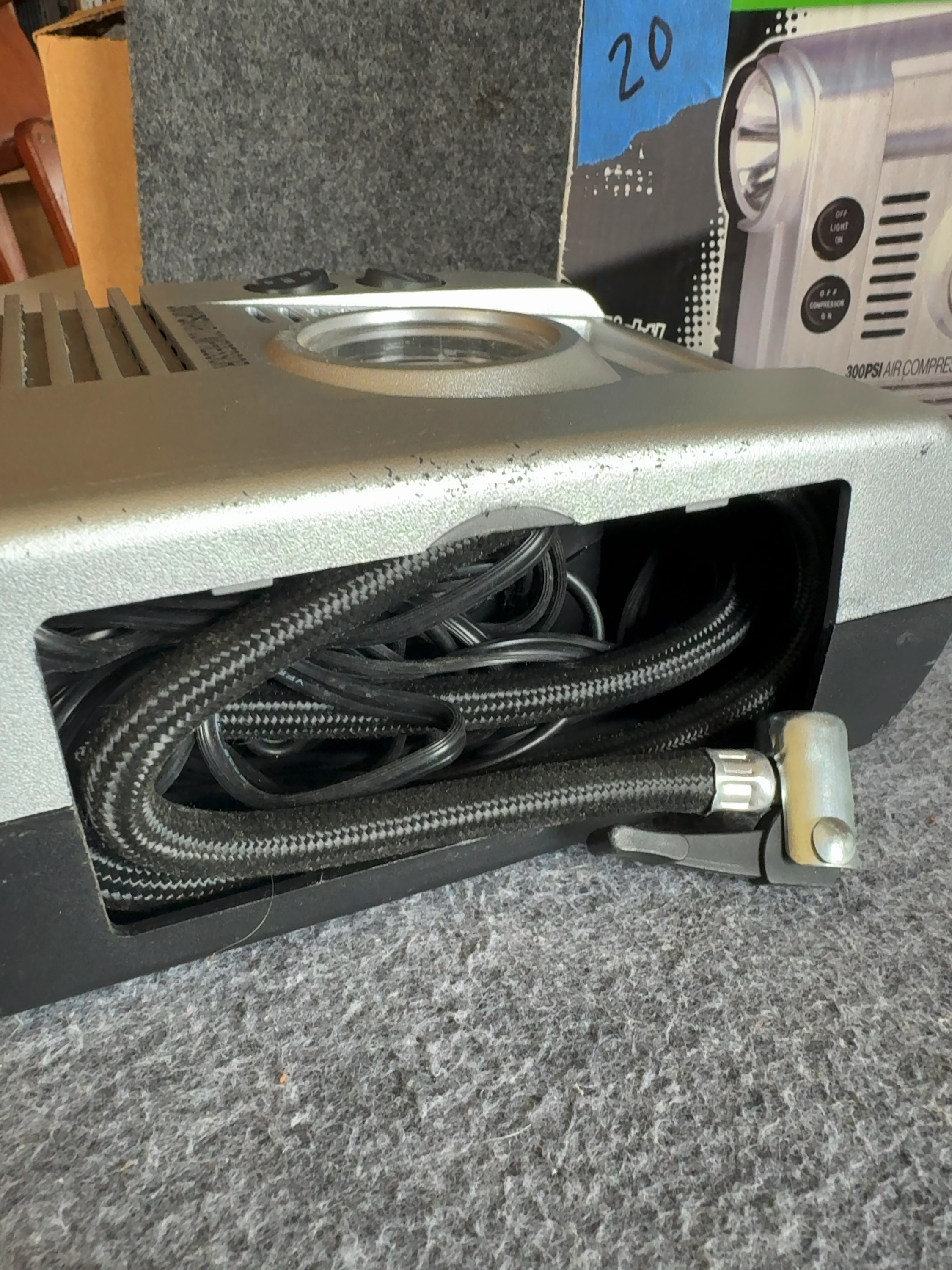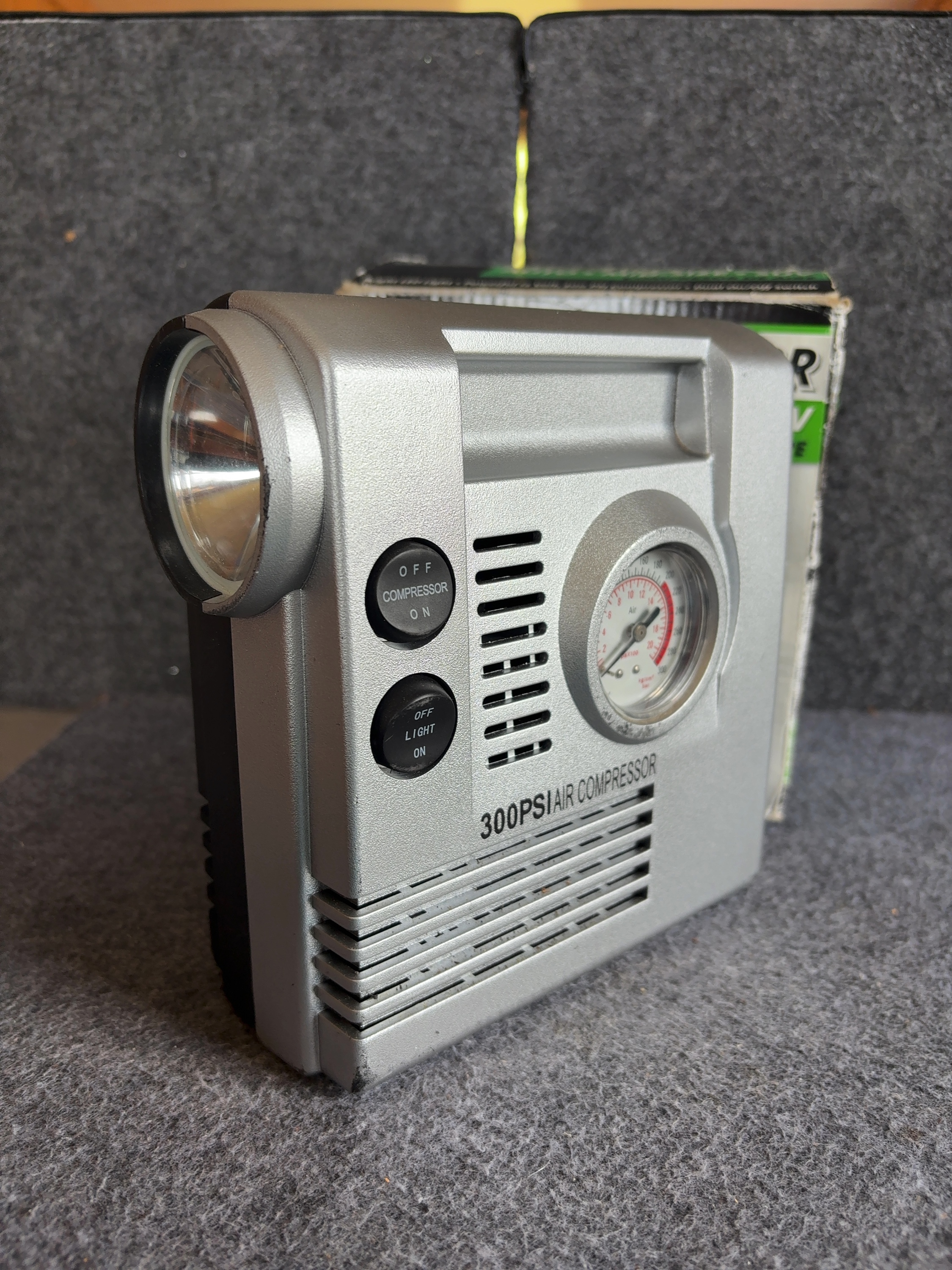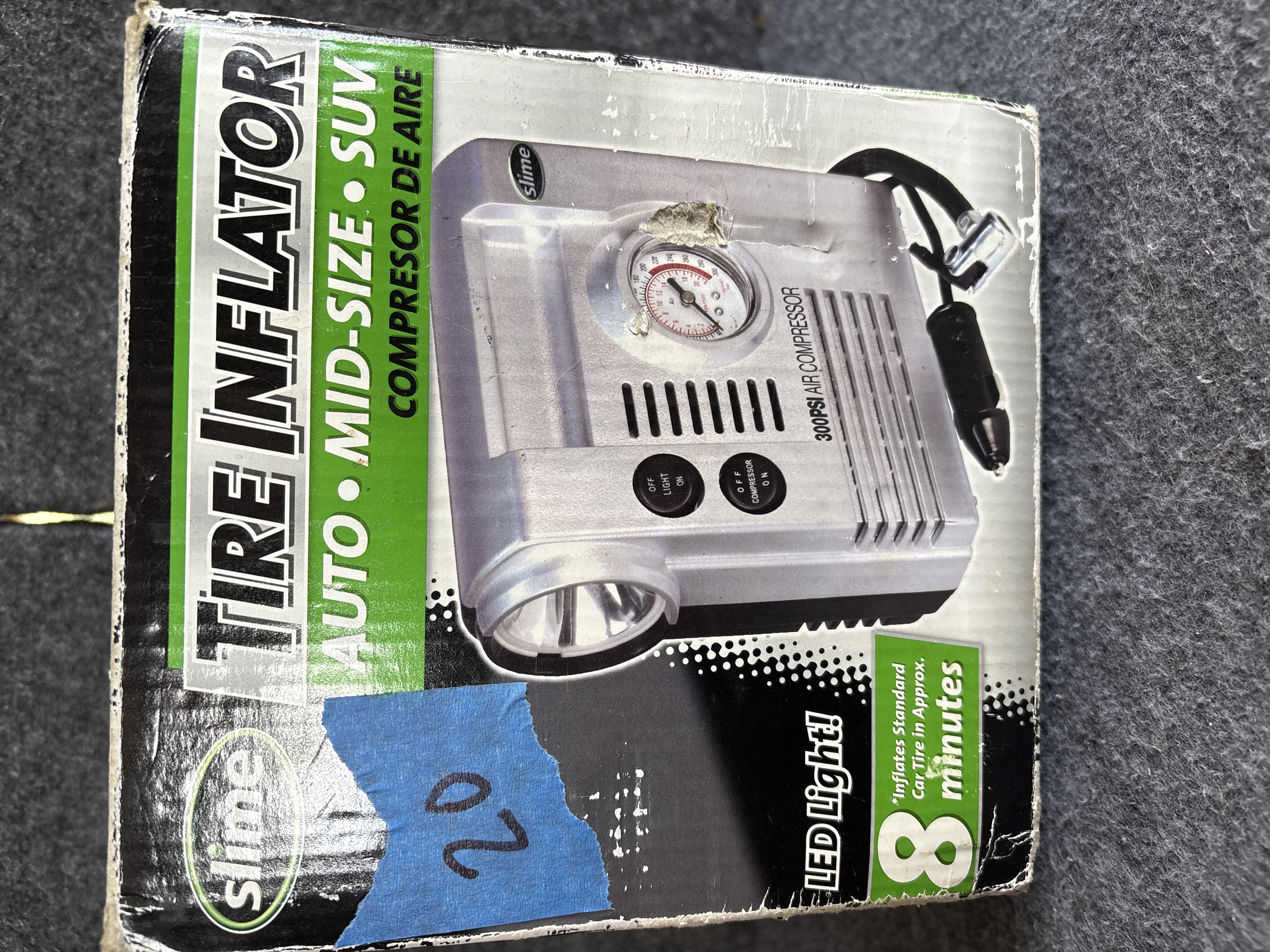 One (1) Slime model COMP 03 portable 12V DC tire inflator and air compressor. This unit features a maximum pressure rating of 300 PSI and is designed for use with automobiles, mid-size vehicles, and SUVs. The device is constructed with a silver and black plastic housing and includes an integrated analog pressure gauge and a built-in LED work light. Two dedicated rocker switches on the front panel control the compressor and light functions. The unit is powered via a standard 12V DC vehicle accessory plug. A braided air hose equipped with a thumb-lock valve connector is included. Both the power cord and air hose are stored in a dedicated compartment at the rear of the unit. The housing is marked with the Slime logo and 300PSI AIR COMPRESSOR.
