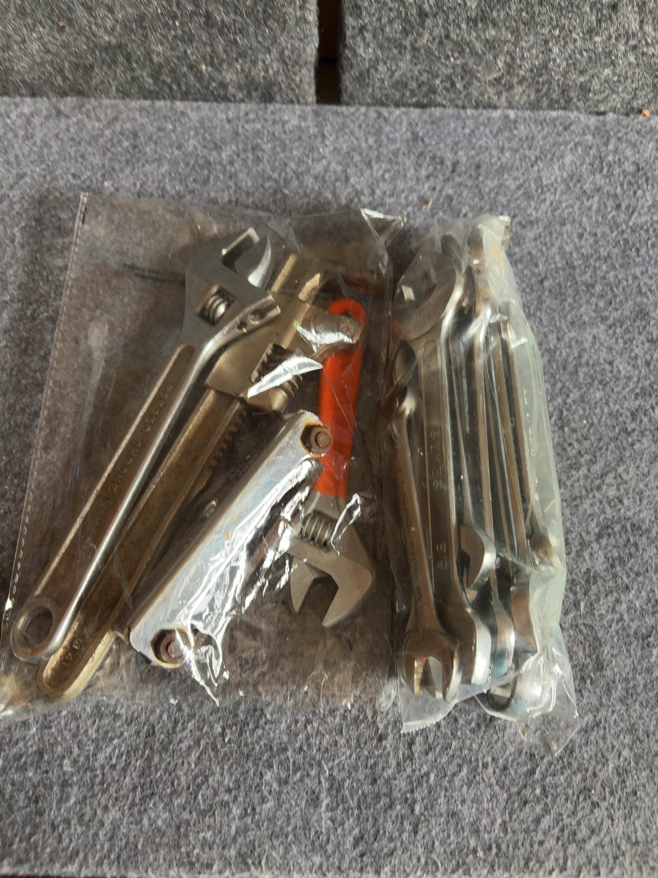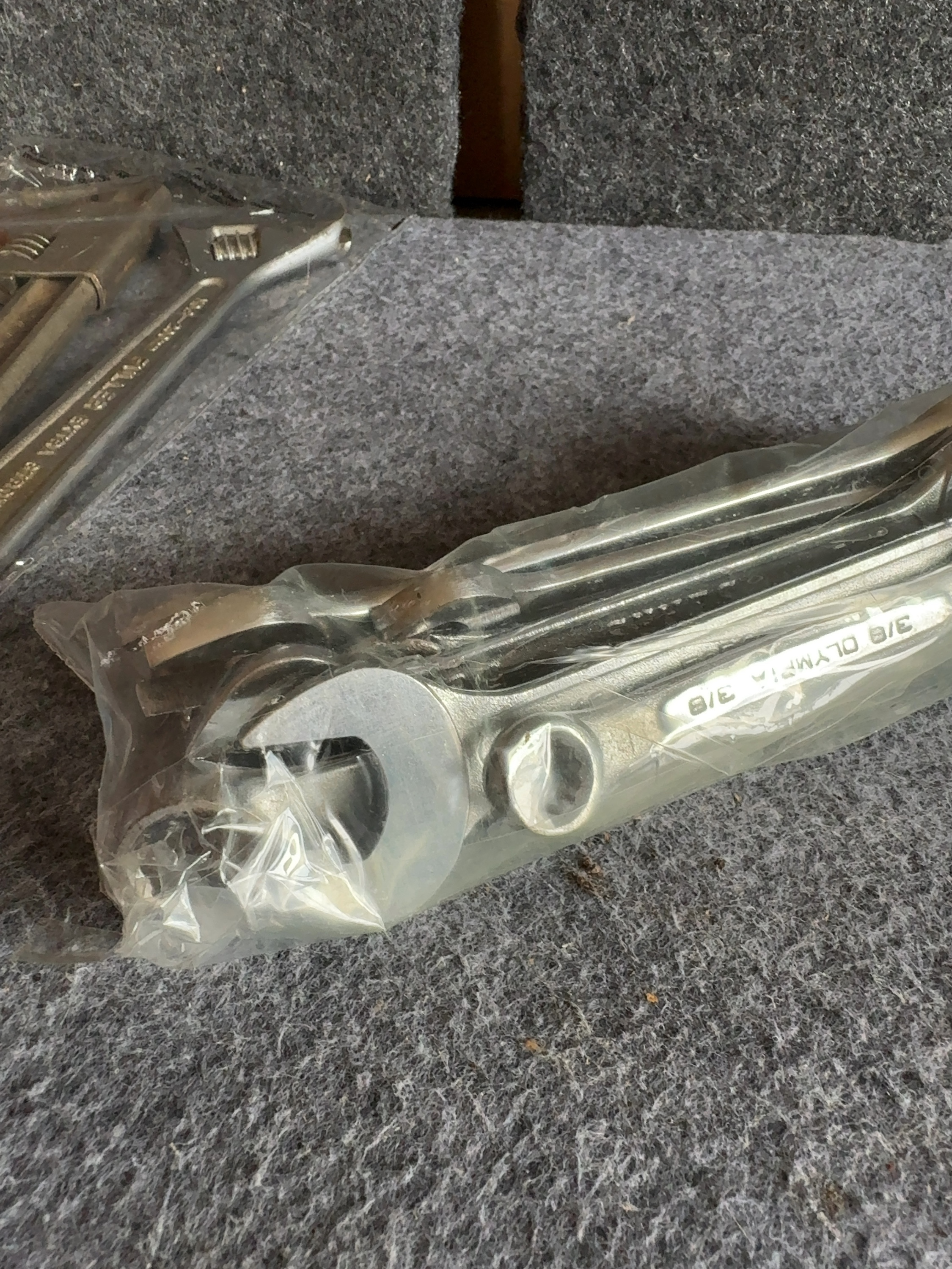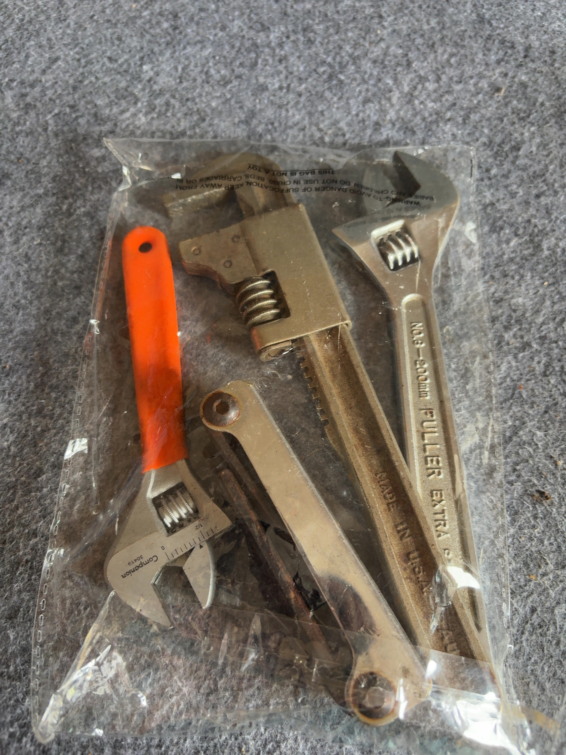 This group lot consists of three bags containing various hand tools manufactured in the United States and Japan. The first bag includes three adjustable wrenches, a pipe wrench, and a folding hex key set. One adjustable wrench is marked Fuller Extra 8-inch 200mm. A second adjustable wrench features a textured orange handle and is marked Companion 30413. A third adjustable wrench is stamped Forged Chrome Vanadium Japan. The heavy-duty pipe wrench is marked Made in USA. The second bag contains a collection of combination wrenches with open and box ends. Visible markings on these tools include Olympia 3/8 and Forged Alloy Steel USA. The third bag contains an assortment of socket heads of varying sizes. The tools are constructed from forged steel, alloy steel, and chrome vanadium.