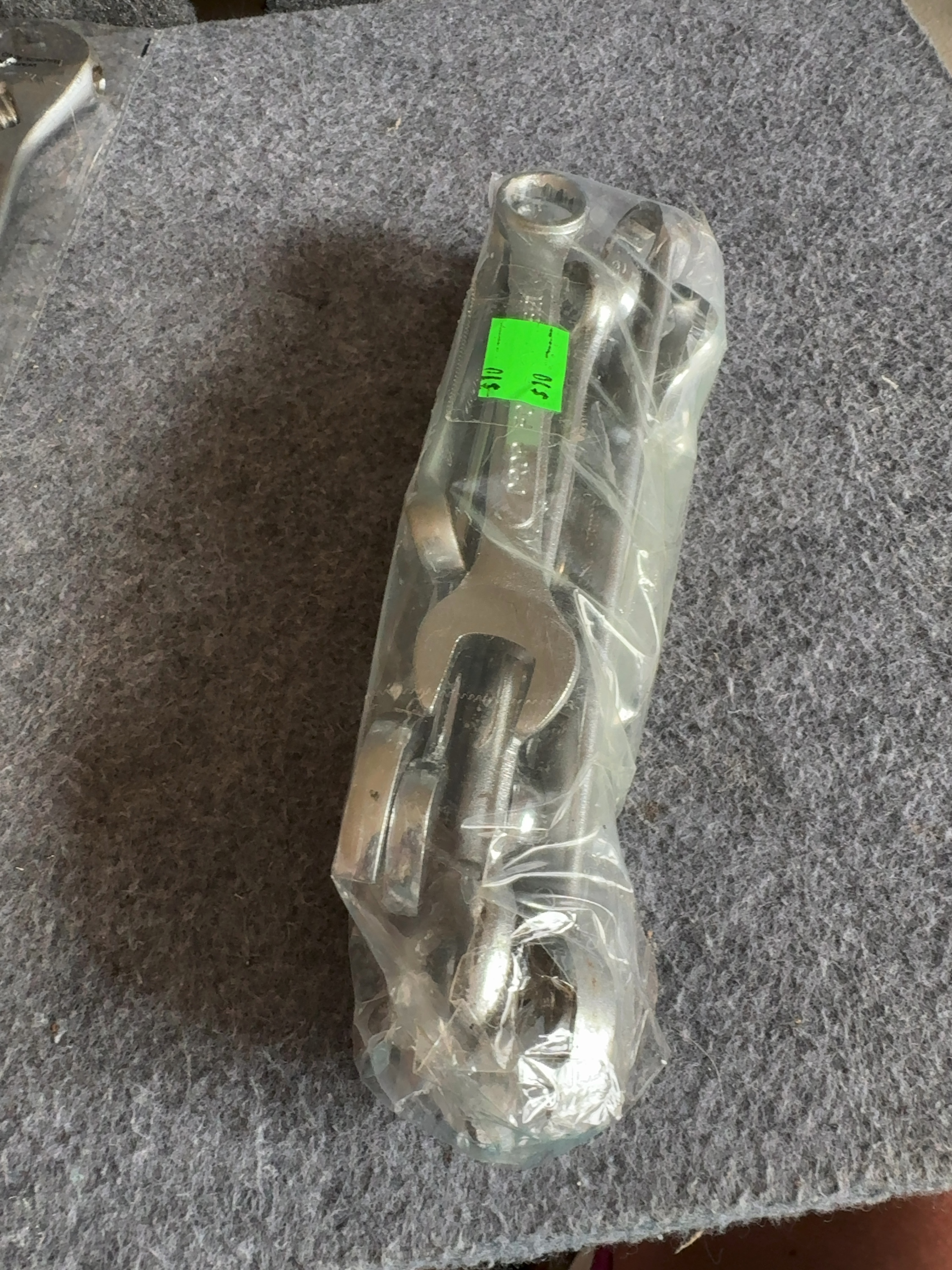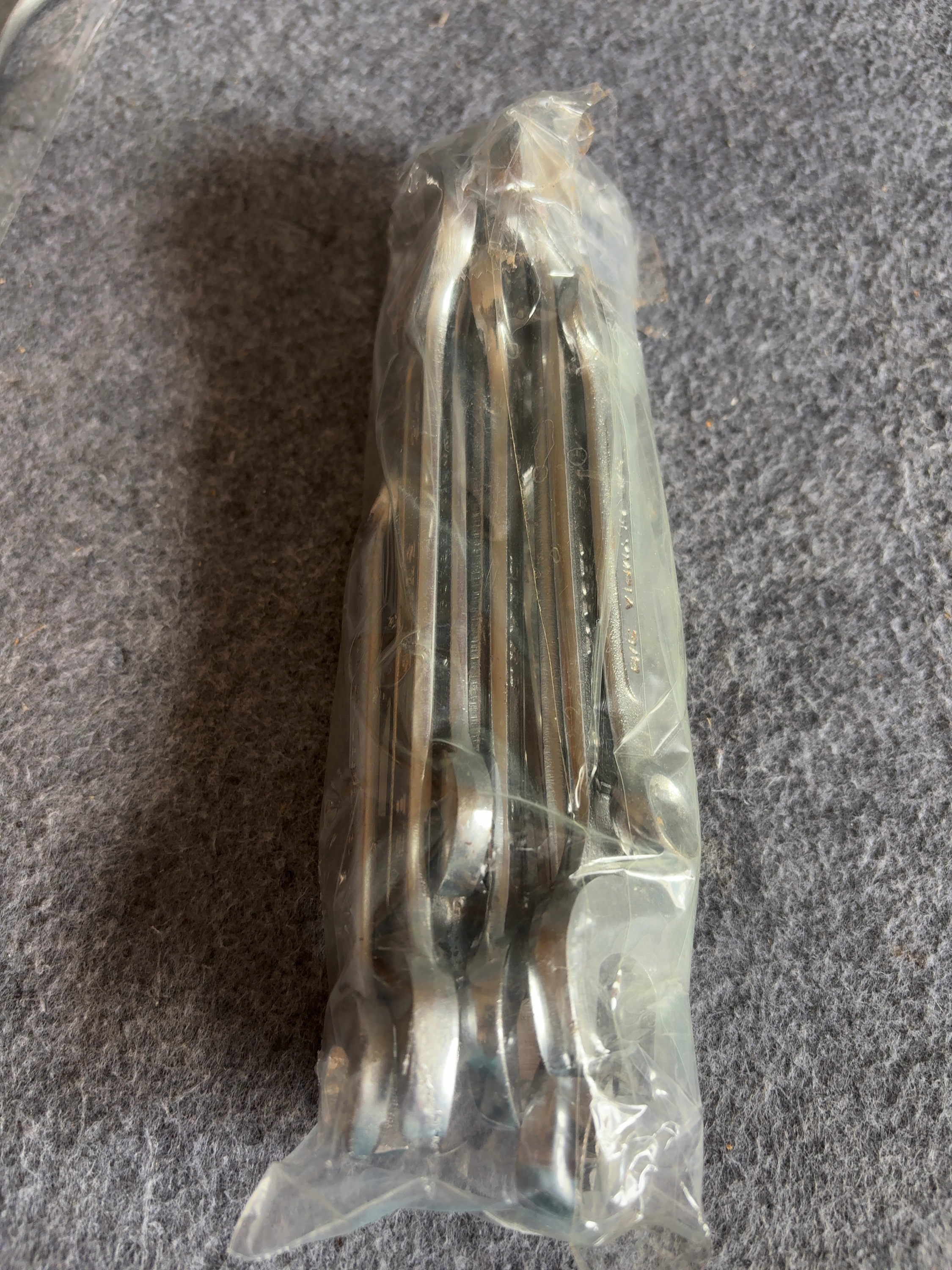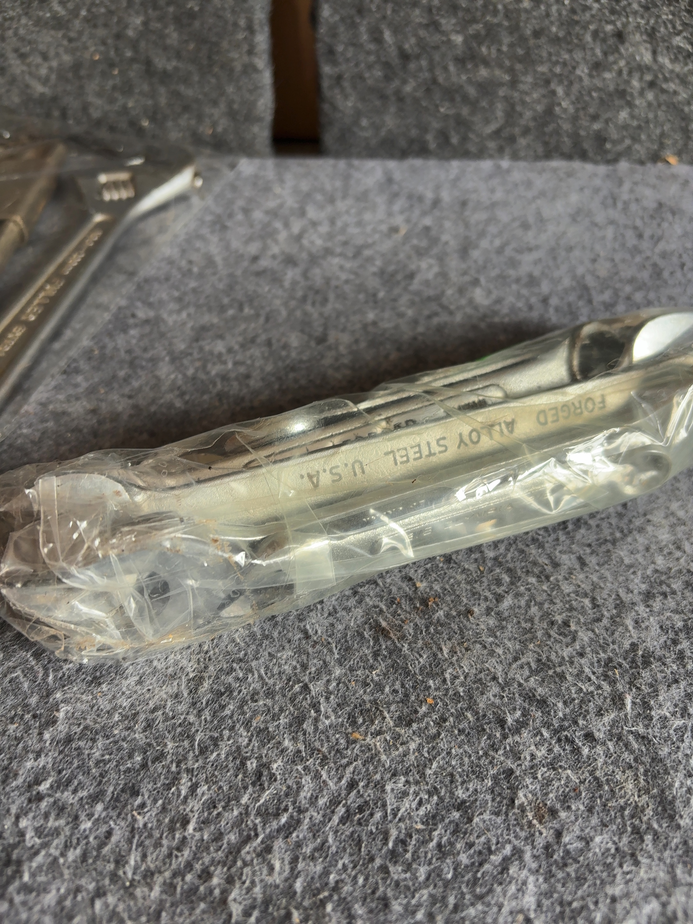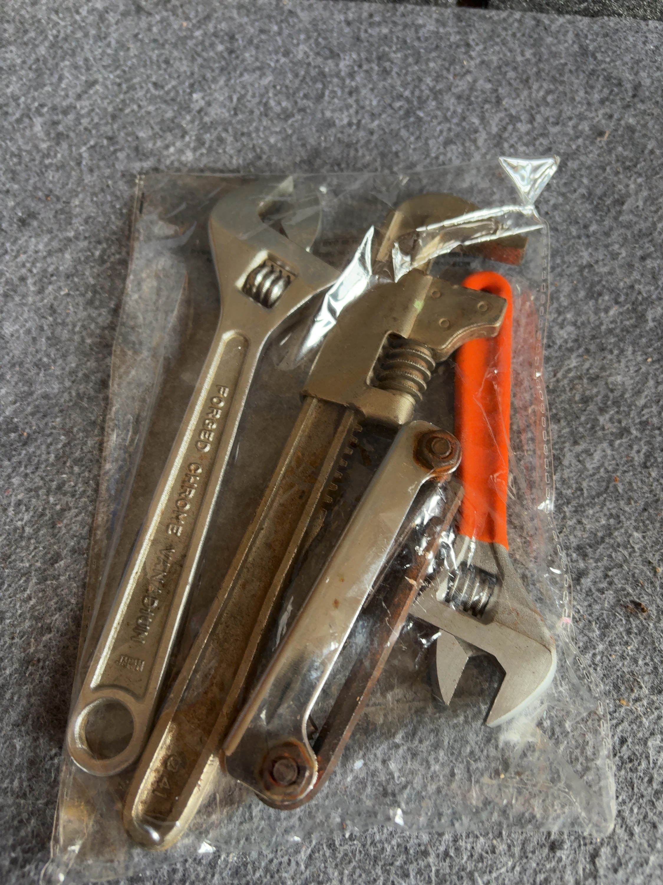 This group lot consists of three bags containing various hand tools manufactured in the United States and Japan. The first bag includes three adjustable wrenches, a pipe wrench, and a folding hex key set. One adjustable wrench is marked Fuller Extra 8-inch 200mm. A second adjustable wrench features a textured orange handle and is marked Companion 30413. A third adjustable wrench is stamped Forged Chrome Vanadium Japan. The heavy-duty pipe wrench is marked Made in USA. The second bag contains a collection of combination wrenches with open and box ends. Visible markings on these tools include Olympia 3/8 and Forged Alloy Steel USA. The third bag contains an assortment of socket heads of varying sizes. The tools are constructed from forged steel, alloy steel, and chrome vanadium.