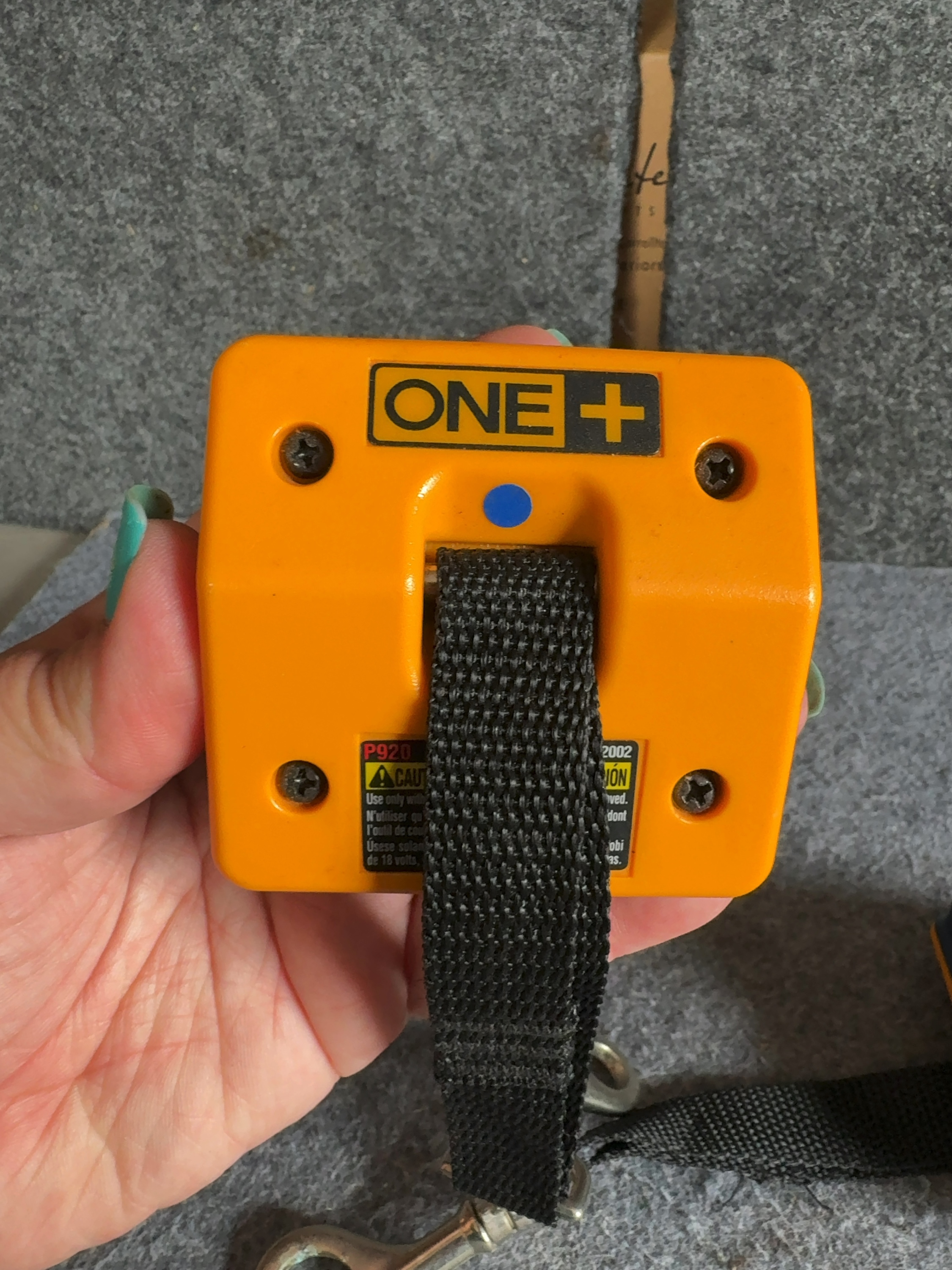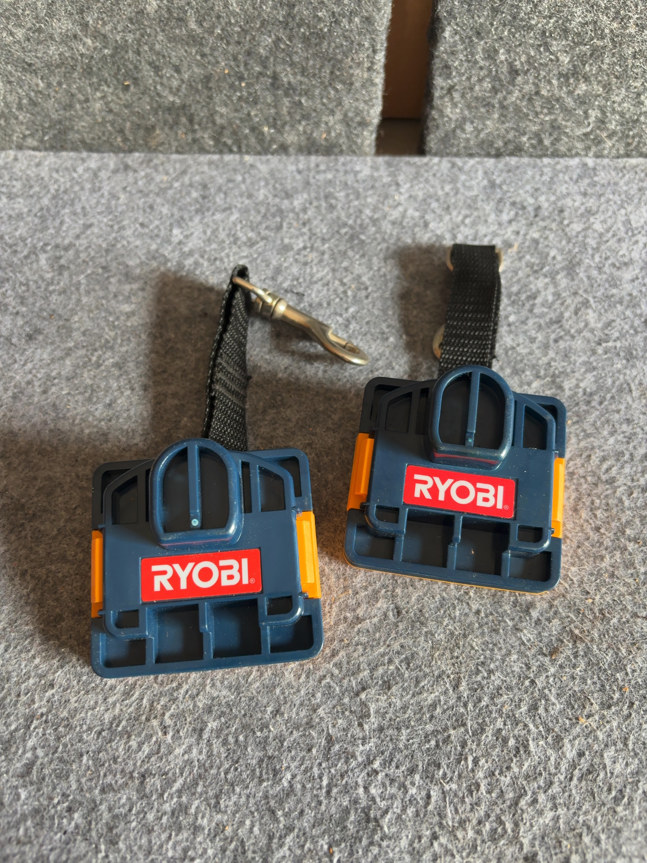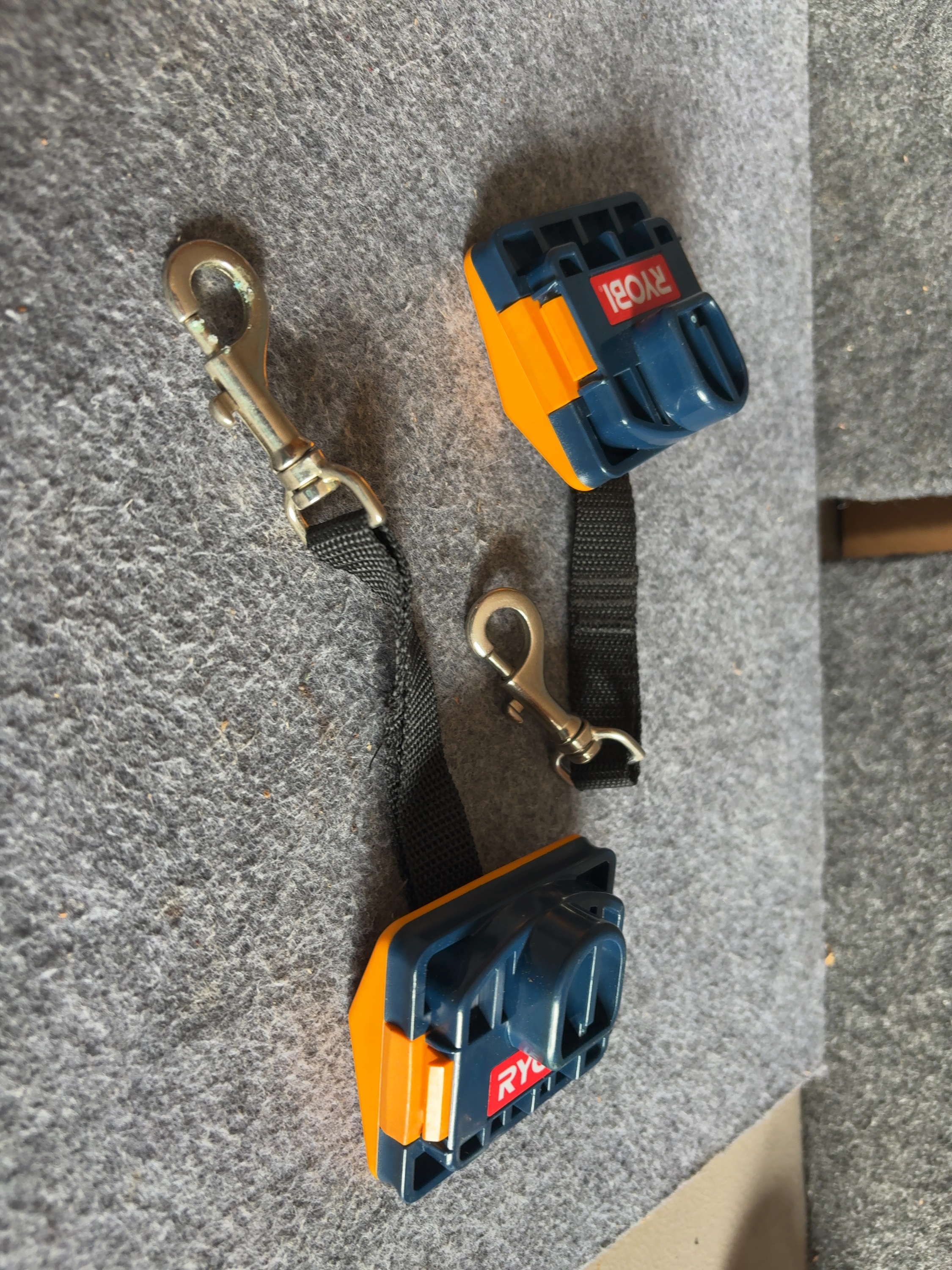 This lot consists of a pair of Ryobi P920 ONE+ battery port cover lanyards. These accessories are constructed from molded high-impact plastic in a navy blue and orange color scheme. Each unit features a black synthetic webbing strap that terminates in a metal swivel-eye snap hook. The items are designed to interface with the battery port of Ryobi 18V ONE+ power tools, serving as a tethering point or belt clip. The blue plastic housing features a red label with white Ryobi branding. The orange reverse side displays a yellow box with black ONE+ lettering. A black identification label specifies the model number P920 and the year 2002.