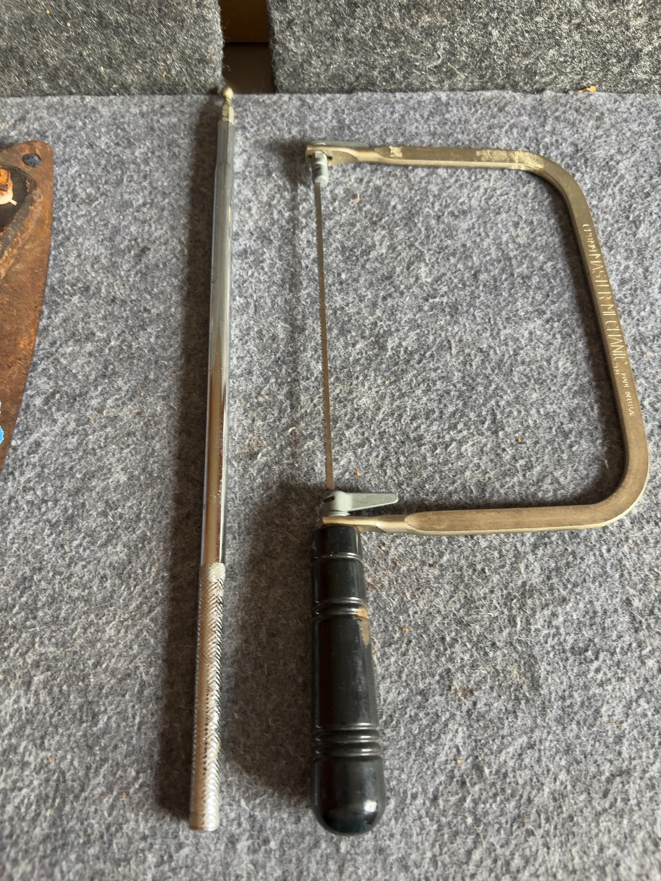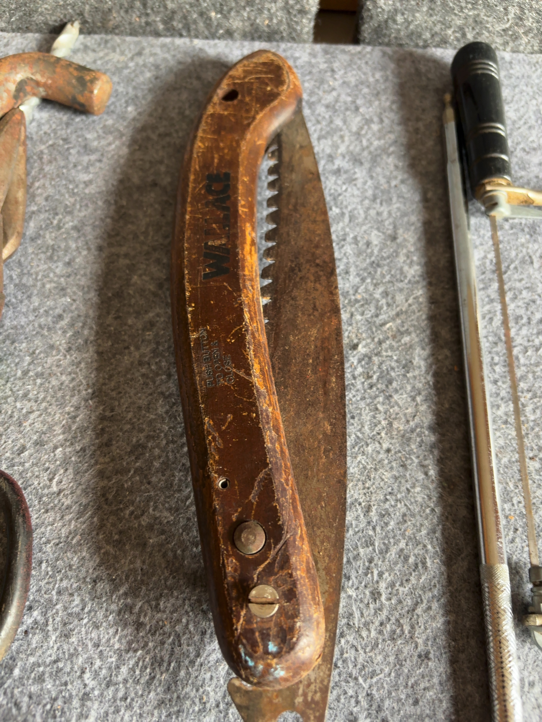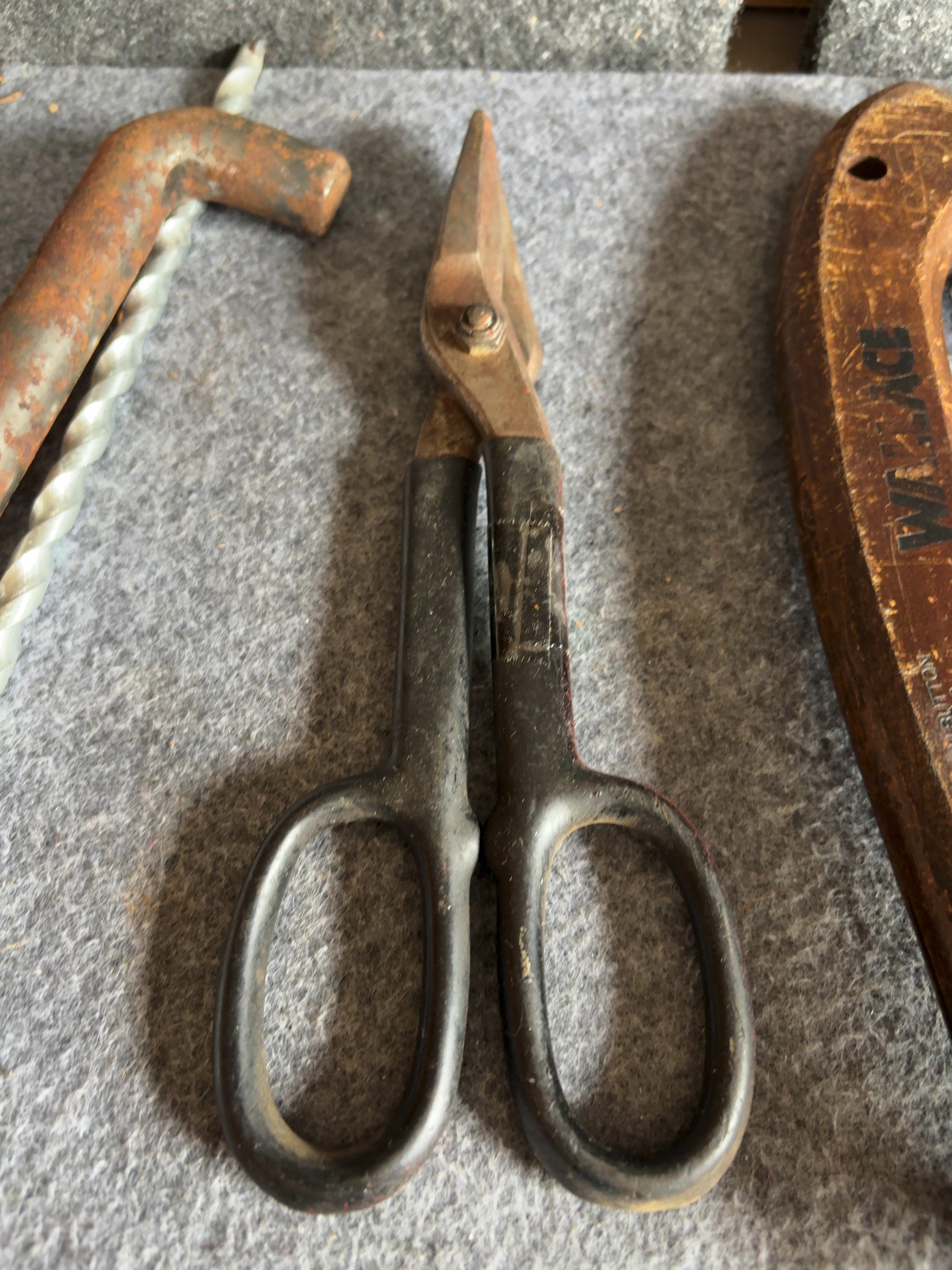 This collection consists of six assorted hand tools of various types and eras. The lot includes a folding pruning saw featuring a curved steel blade and a wooden handle with a push-button locking mechanism. The handle is printed with the maker mark Wallace and includes instructions stating Push Button To Open and Close. Also included is a Master Mechanic coping saw with a steel frame stamped Master Mechanic TM and Made in U.S.A., fitted with a black ribbed composition handle. The assortment further contains a pair of straight-cut tin snips with forged metal construction and black-coated handles, an L-shaped tapered metal alignment tool or drift punch, a long twisted-flute steel drill bit, and a chrome-plated telescoping tool with a knurled grip section.