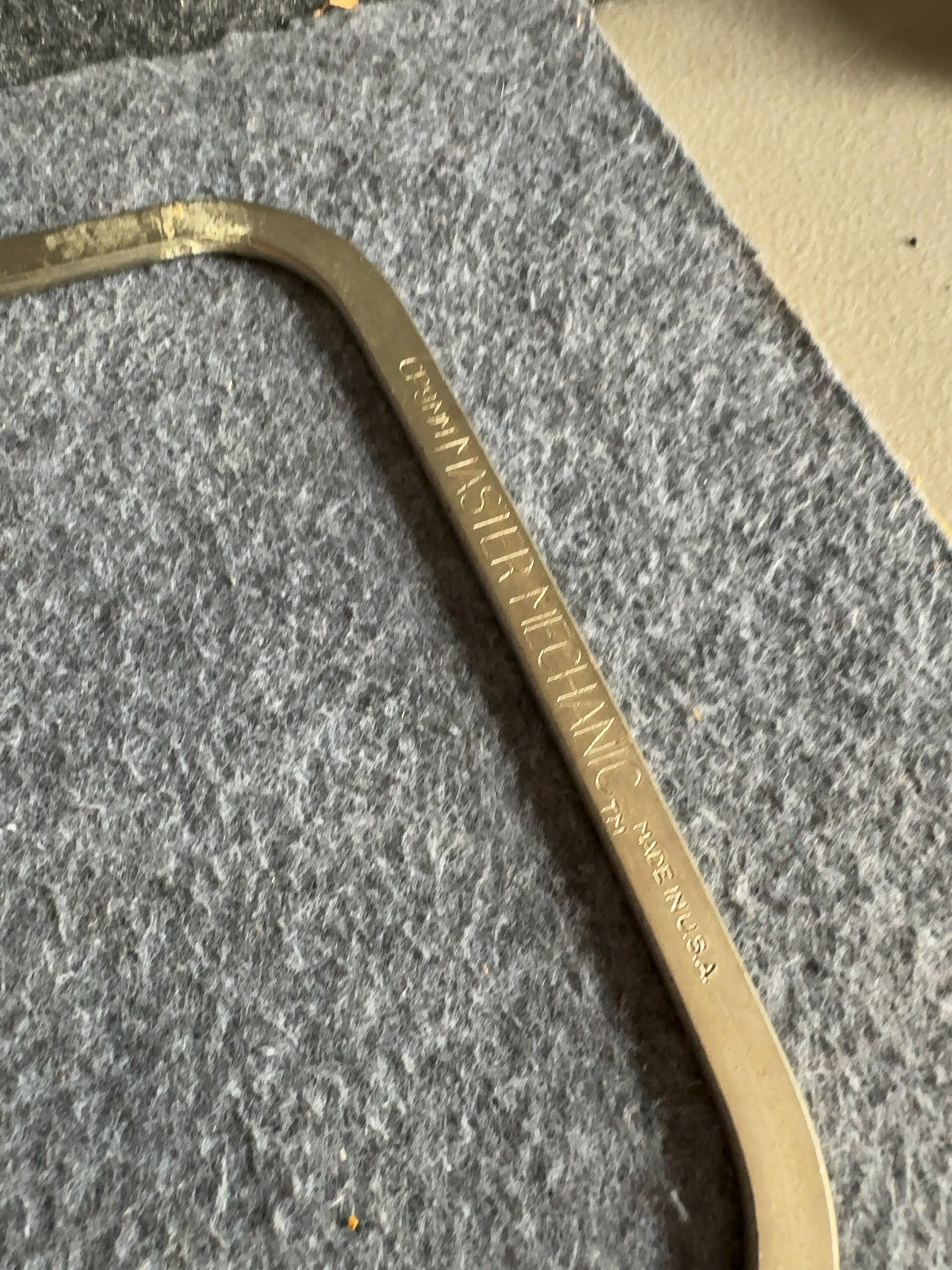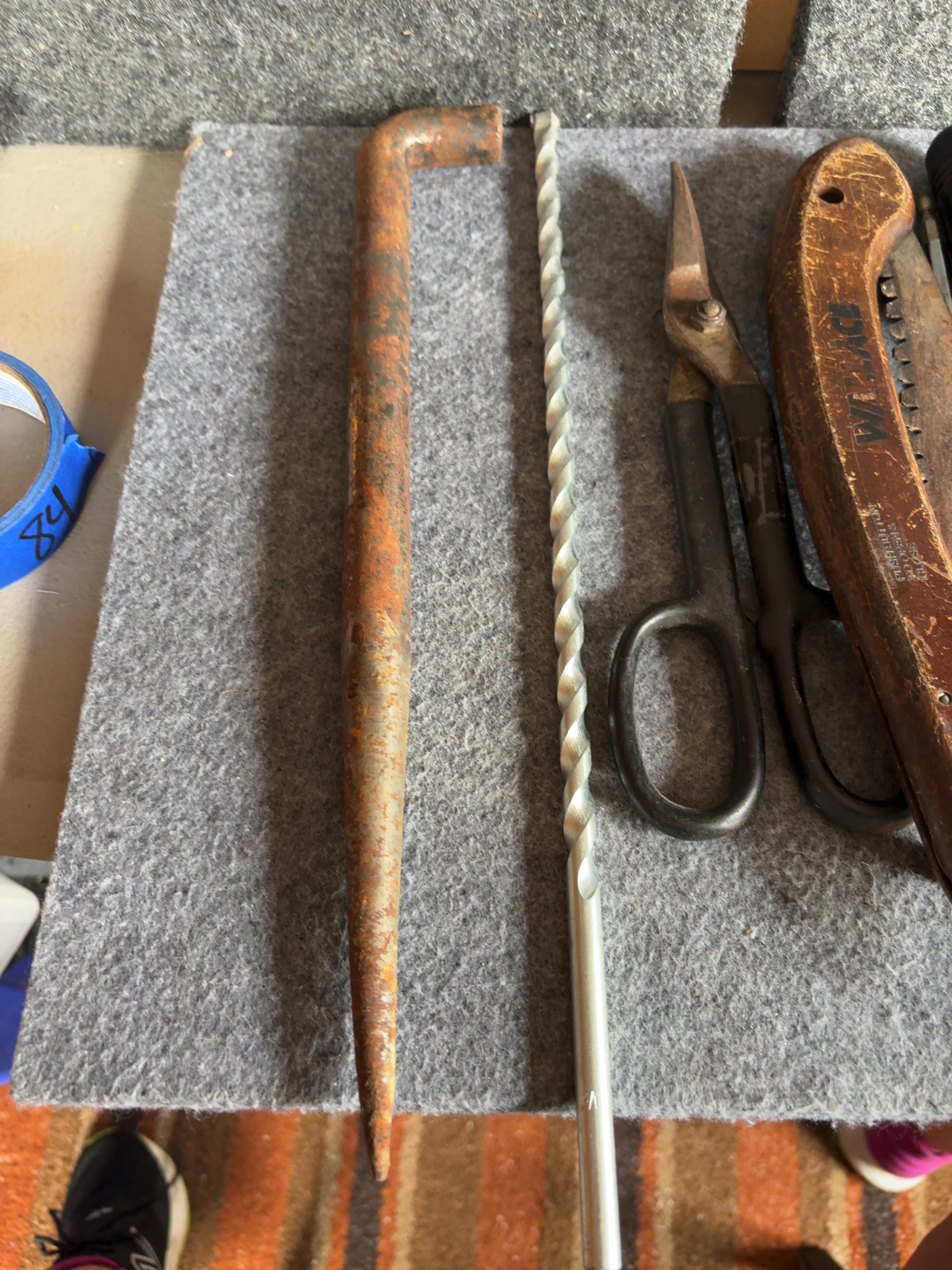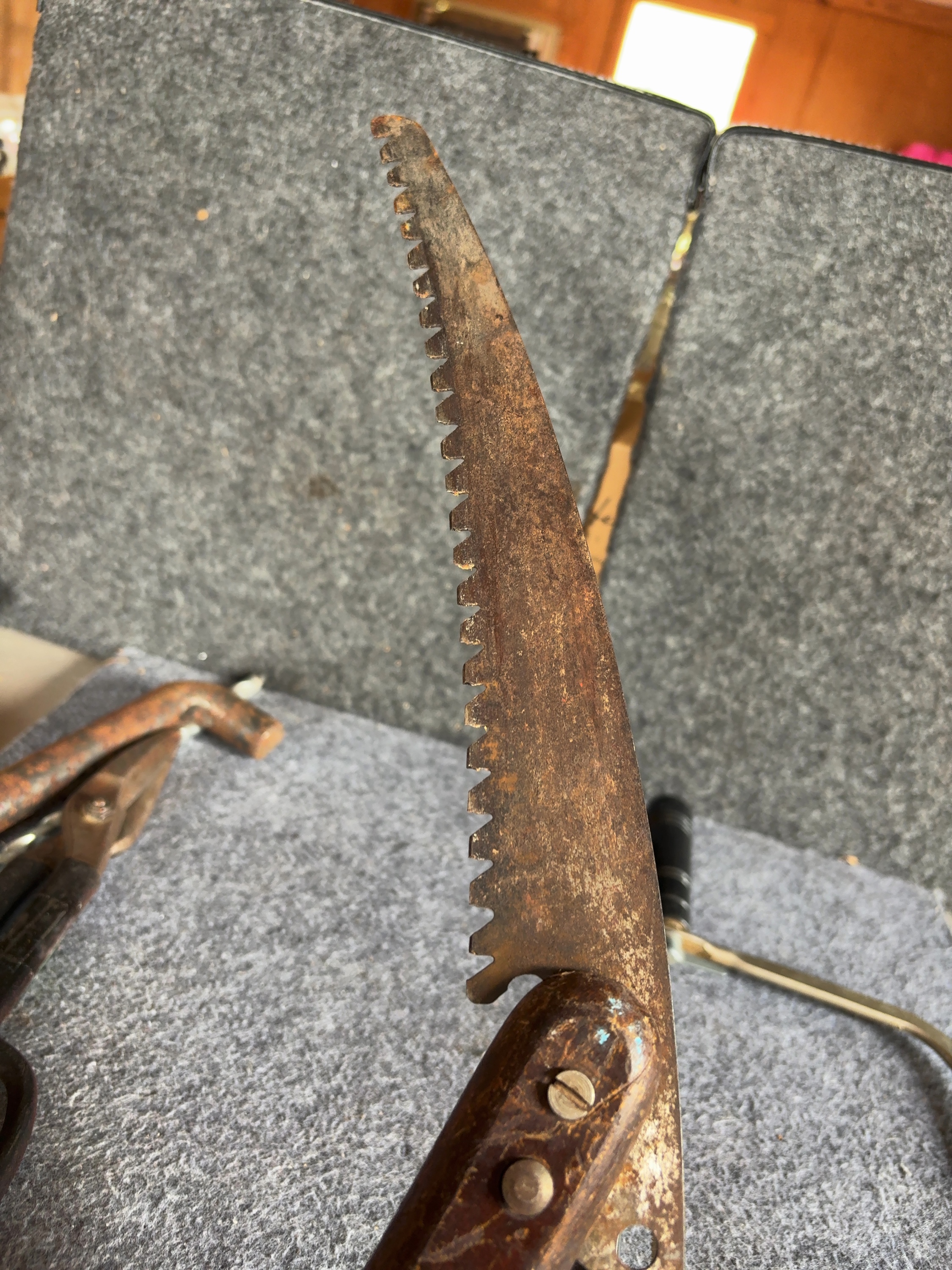 This collection consists of six assorted hand tools of various types and eras. The lot includes a folding pruning saw featuring a curved steel blade and a wooden handle with a push-button locking mechanism. The handle is printed with the maker mark Wallace and includes instructions stating Push Button To Open and Close. Also included is a Master Mechanic coping saw with a steel frame stamped Master Mechanic TM and Made in U.S.A., fitted with a black ribbed composition handle. The assortment further contains a pair of straight-cut tin snips with forged metal construction and black-coated handles, an L-shaped tapered metal alignment tool or drift punch, a long twisted-flute steel drill bit, and a chrome-plated telescoping tool with a knurled grip section.