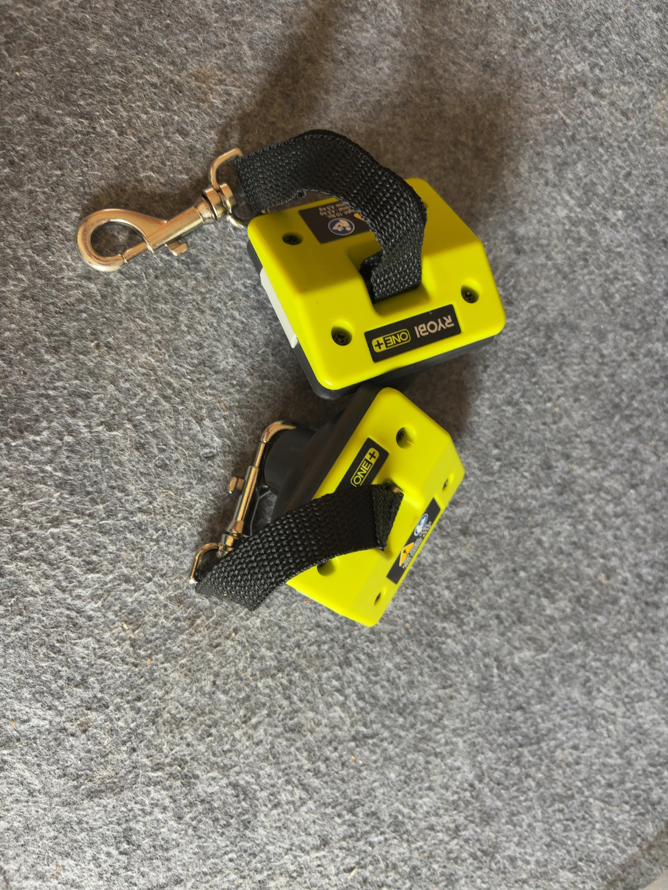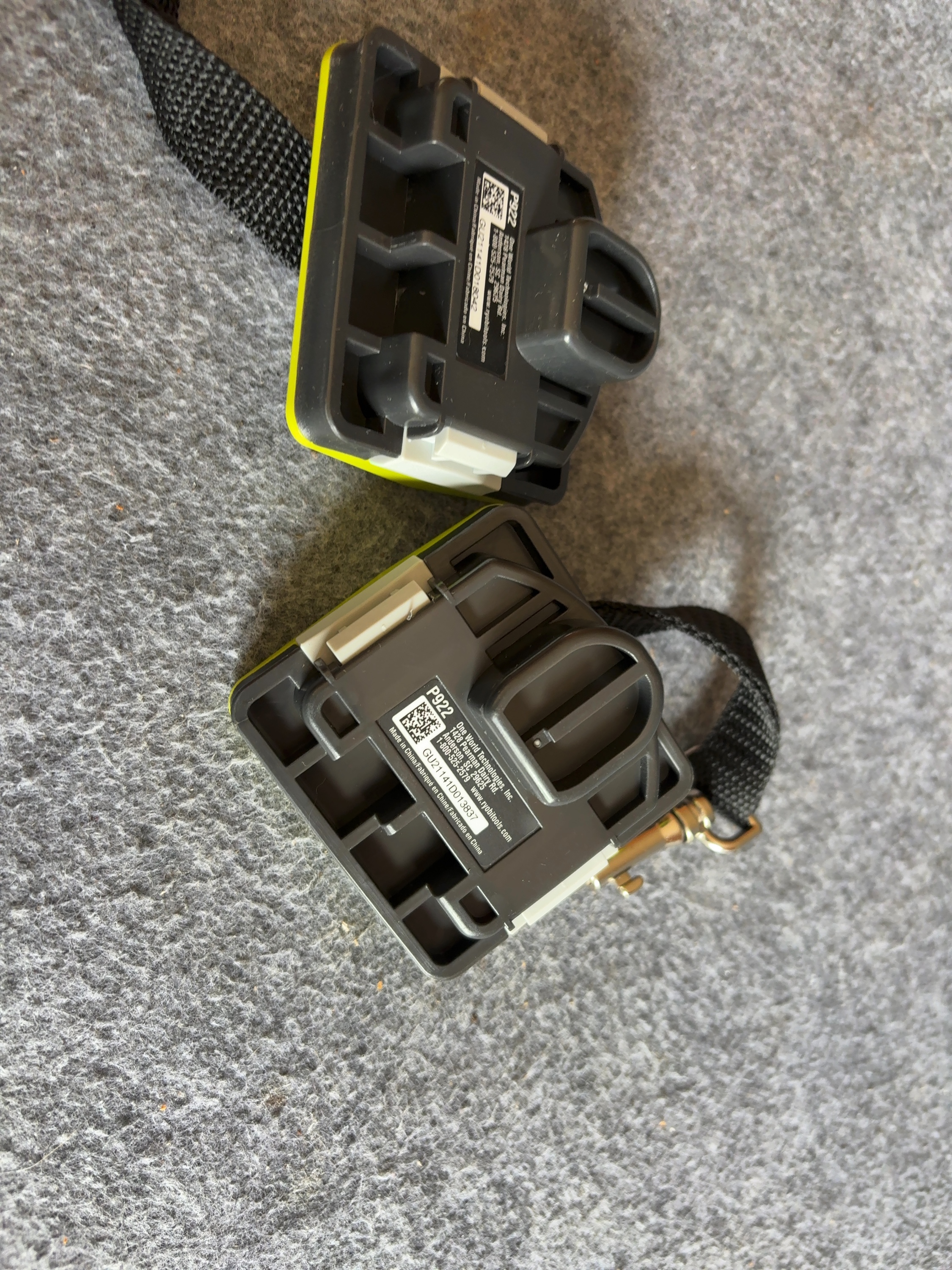 A pair of Ryobi ONE+ tool lanyard adapters, model number P922. These accessories are designed to interface with the Ryobi ONE+ battery system to provide a secure tethering point for power tools. Each unit is manufactured from signature lime-green and gray plastic and includes an integrated black nylon webbed strap terminating in a metal swivel snap hook. The top of each adapter is marked with the RYOBI ONE+ brand name and a safety warning label indicating a maximum weight capacity of 10 lbs (4.5 kg). The reverse side of each unit features a product label identifying the manufacturer as One World Technologies, Inc., the model number P922, and a QR code with a unique serial number. These items are typically sold at retail in 2-pack configurations for approximately 15 to 20 USD.