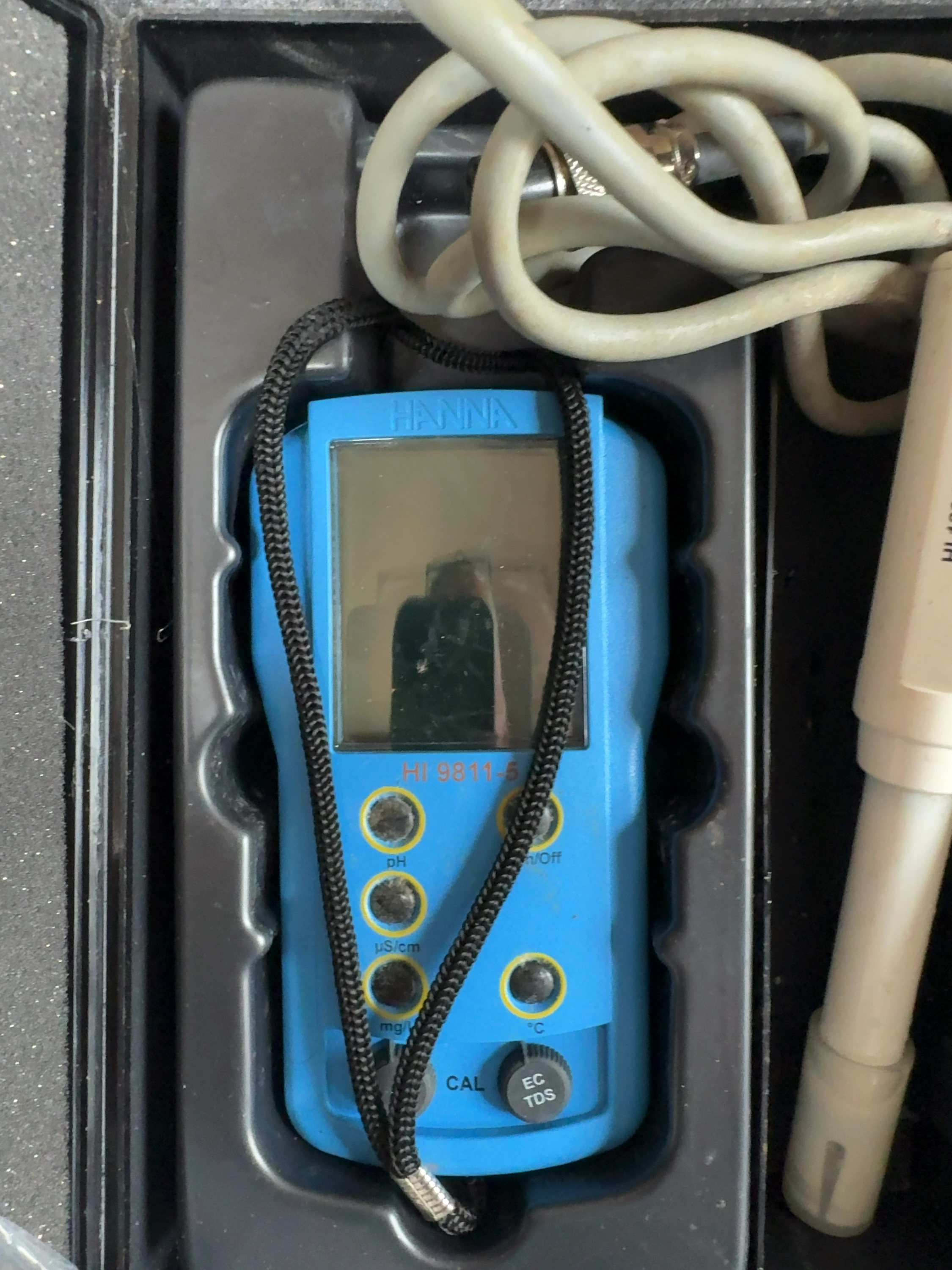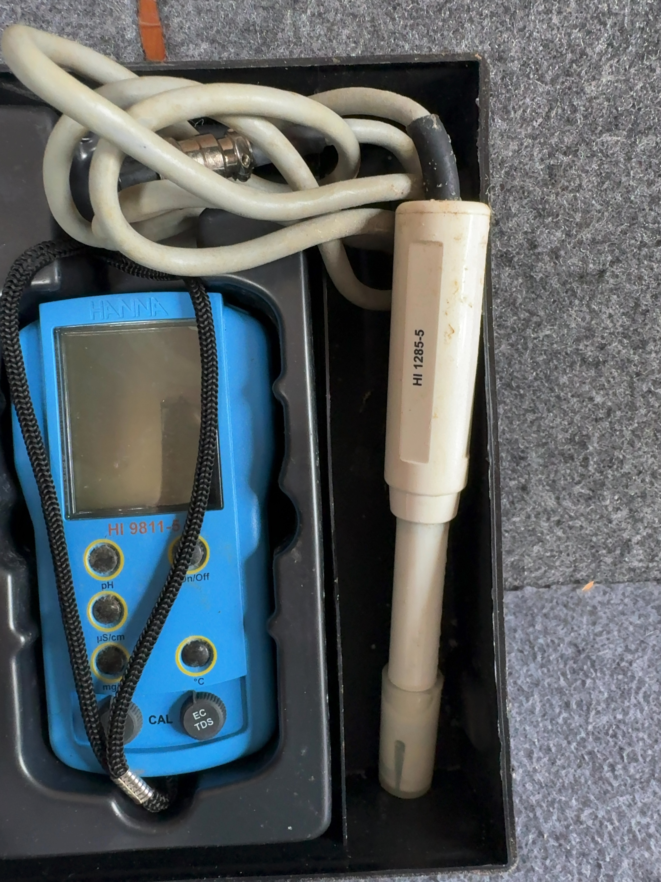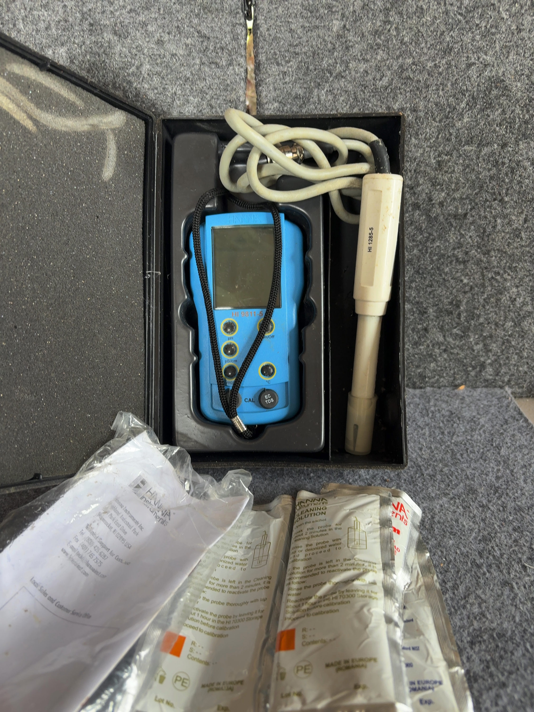 This portable water quality testing kit is manufactured by Hanna Instruments, model HI 9811-5. The set features a handheld meter unit housed in blue plastic with an integrated LCD screen and manual controls for pH, conductivity (uS/cm), total dissolved solids (mg/L), and temperature (degrees Celsius). The interface includes dedicated buttons for mode selection and a calibration (CAL) adjustment knob. The kit includes a white plastic HI 1285-5 multiparameter probe with an attached cable and connector. The components are contained within a custom-fitted black plastic hard-shell carrying case. Additional accessories include an original instruction manual and several factory-sealed 20 mL solution sachets: two HI 700661 Cleaning Solution for Agriculture Application packets, one HI 70031 1413 uS/cm Conductivity Solution packet, and one HI 70032 1382 ppm TDS Solution packet. The meter housing is embossed with the name HANNA and printed with the model number HI 9811-5. The probe is marked HI 1285-5. The exterior of the carrying case features the embossed manufacturer name.