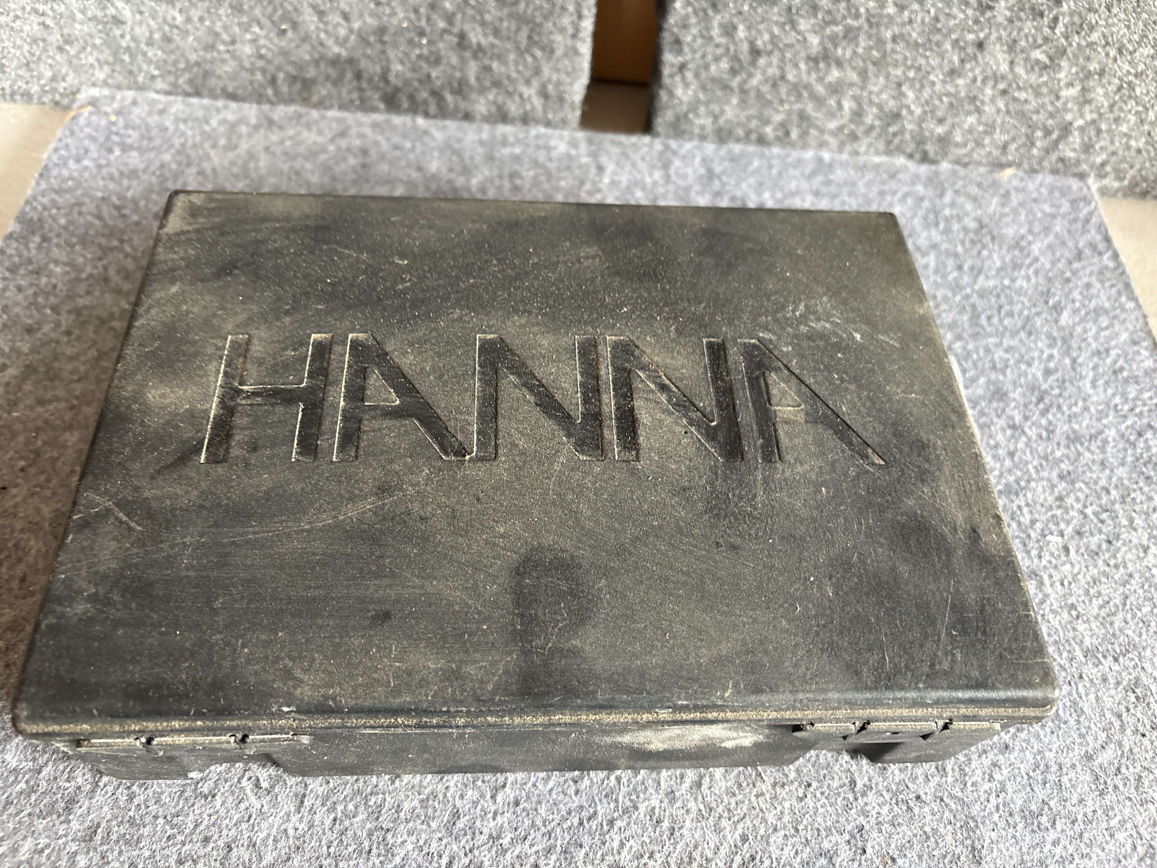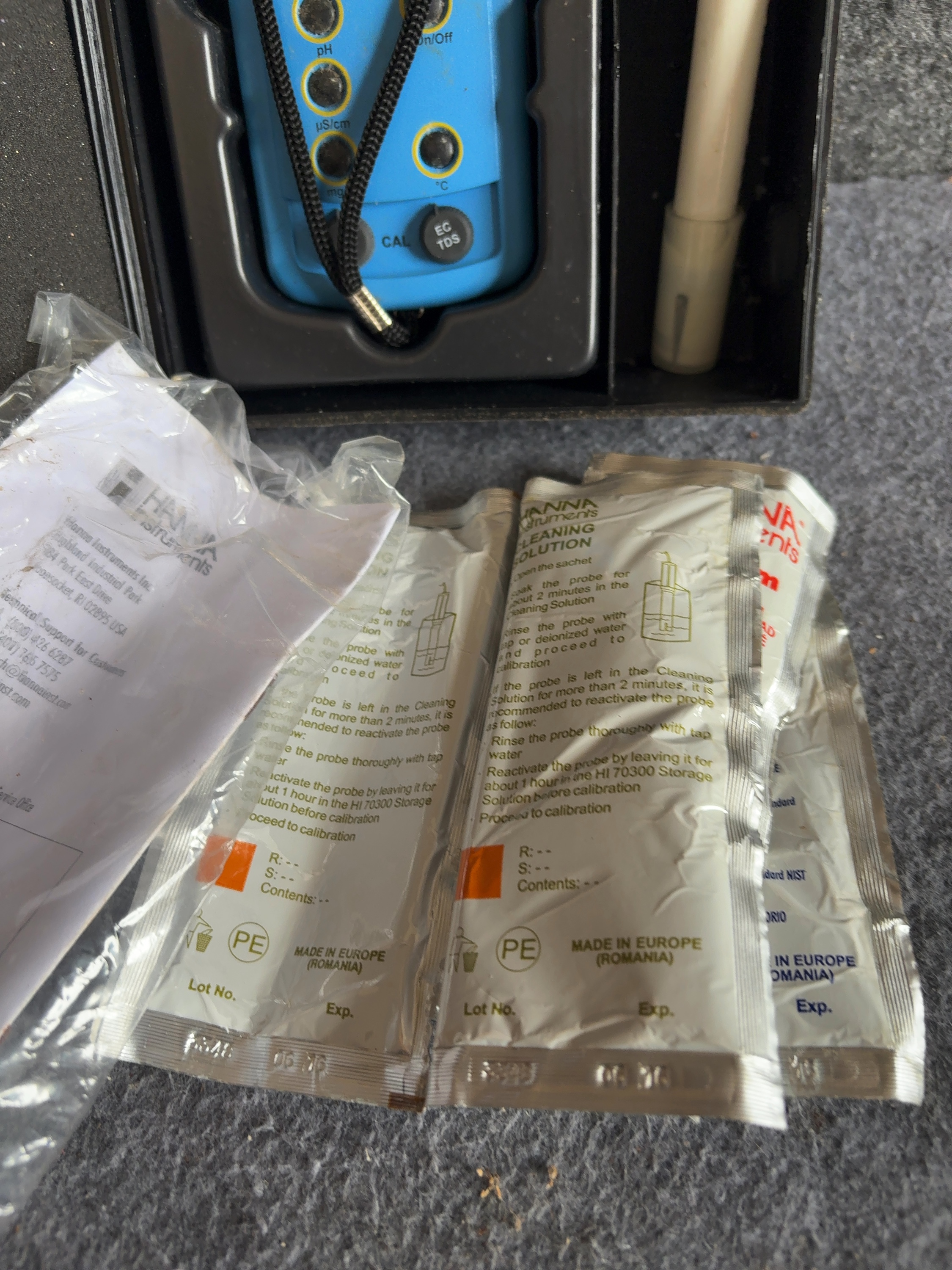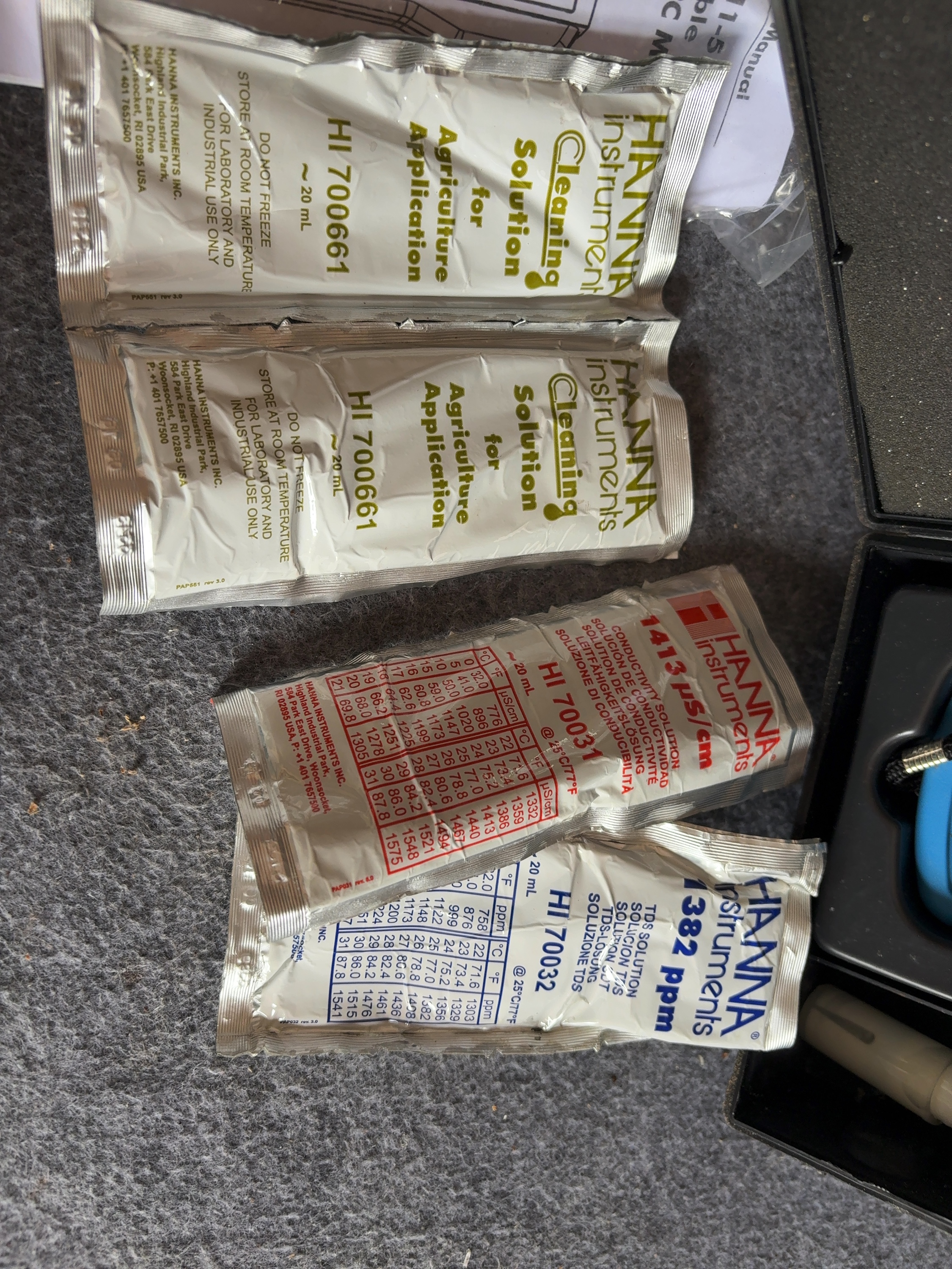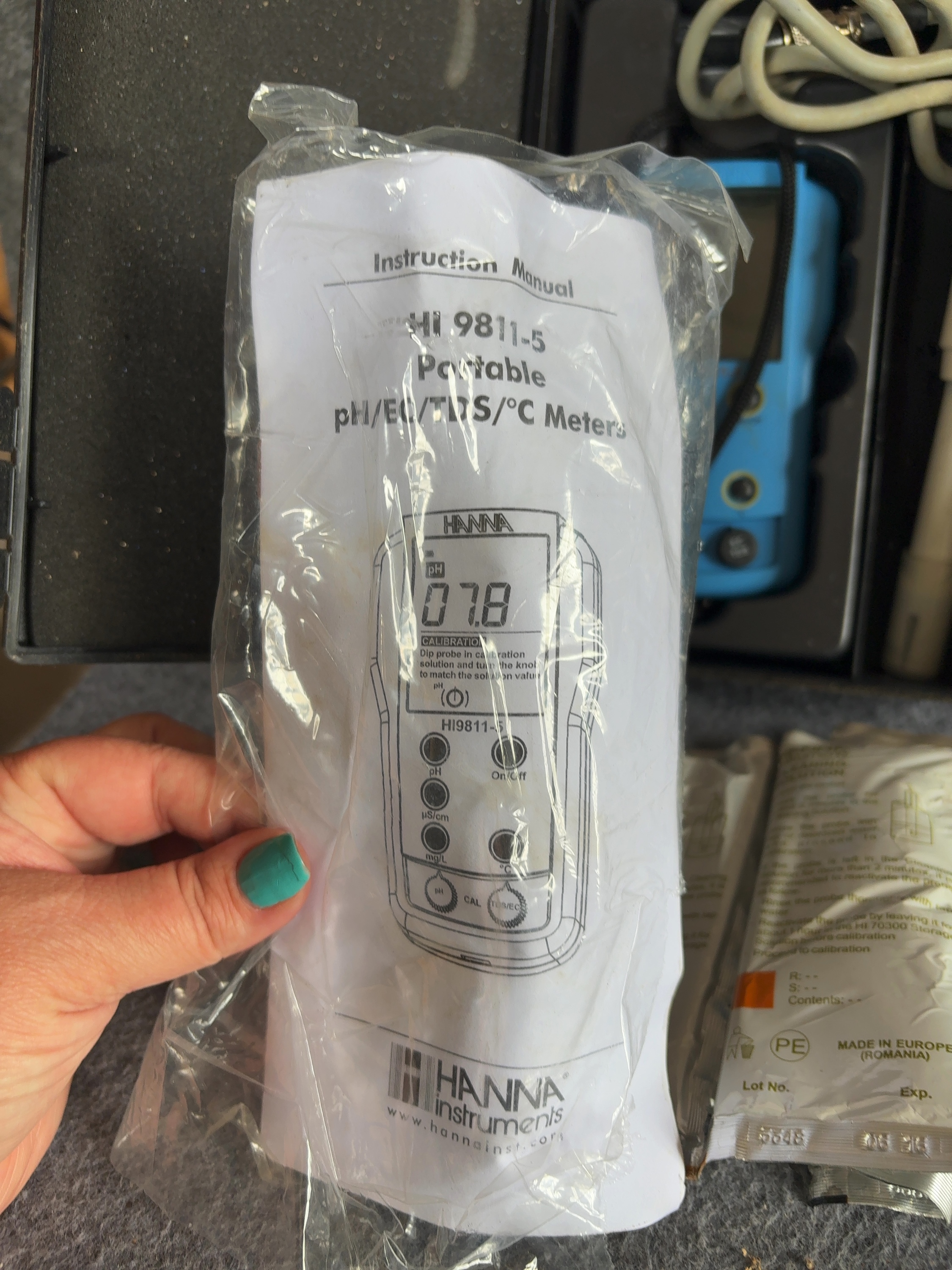 This portable water quality testing kit is manufactured by Hanna Instruments, model HI 9811-5. The set features a handheld meter unit housed in blue plastic with an integrated LCD screen and manual controls for pH, conductivity (uS/cm), total dissolved solids (mg/L), and temperature (degrees Celsius). The interface includes dedicated buttons for mode selection and a calibration (CAL) adjustment knob. The kit includes a white plastic HI 1285-5 multiparameter probe with an attached cable and connector. The components are contained within a custom-fitted black plastic hard-shell carrying case. Additional accessories include an original instruction manual and several factory-sealed 20 mL solution sachets: two HI 700661 Cleaning Solution for Agriculture Application packets, one HI 70031 1413 uS/cm Conductivity Solution packet, and one HI 70032 1382 ppm TDS Solution packet. The meter housing is embossed with the name HANNA and printed with the model number HI 9811-5. The probe is marked HI 1285-5. The exterior of the carrying case features the embossed manufacturer name.