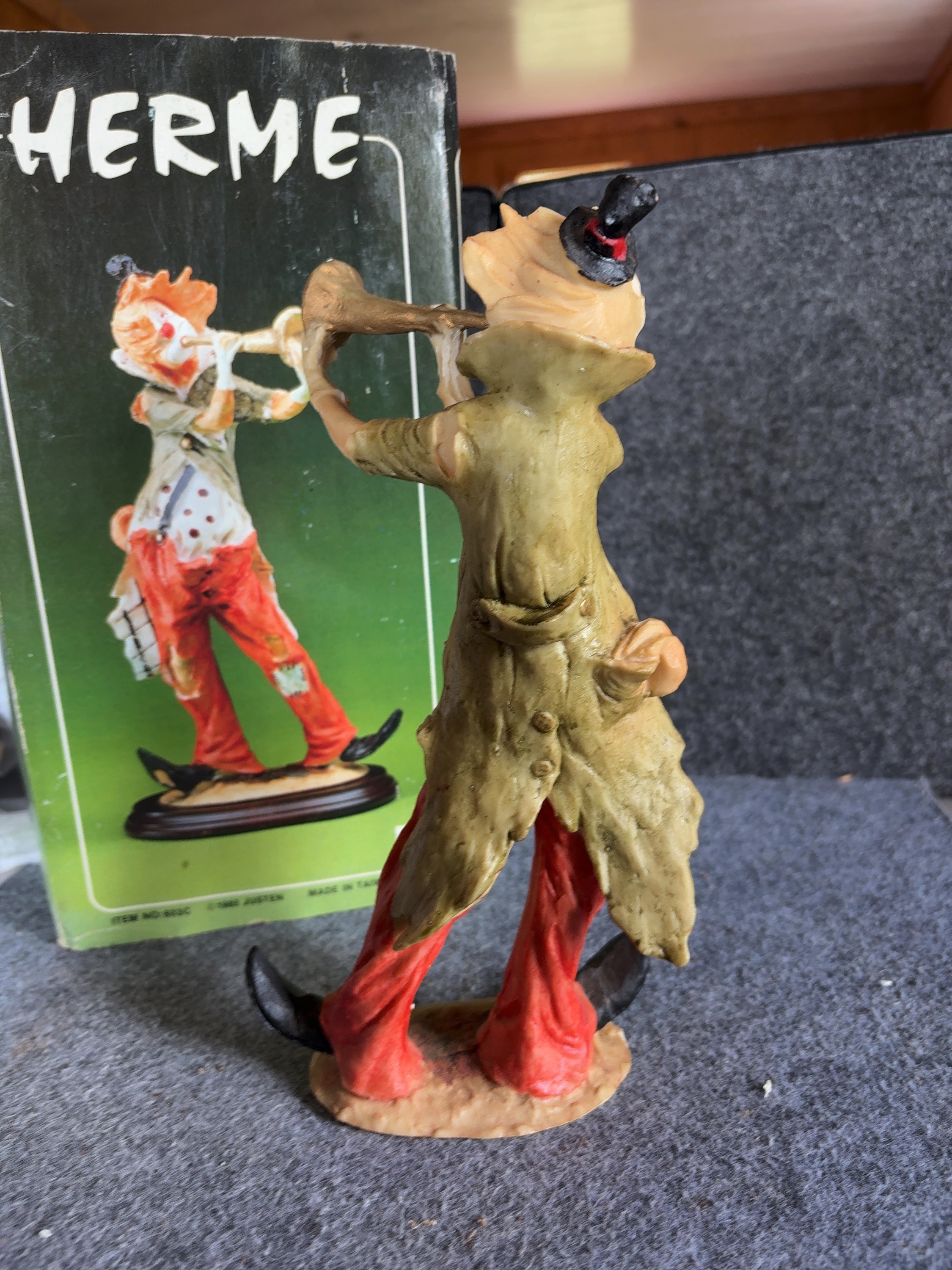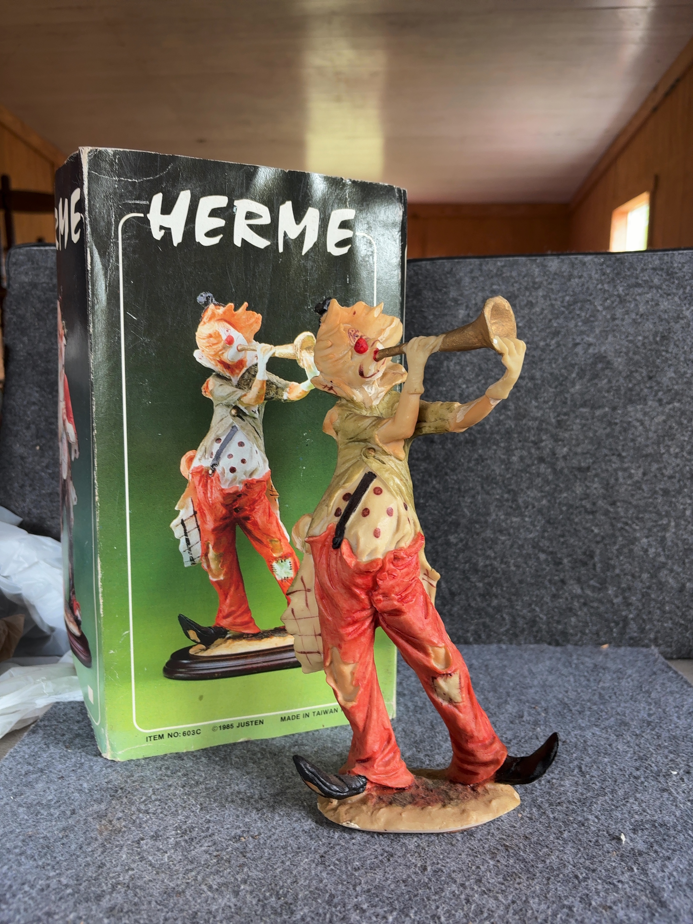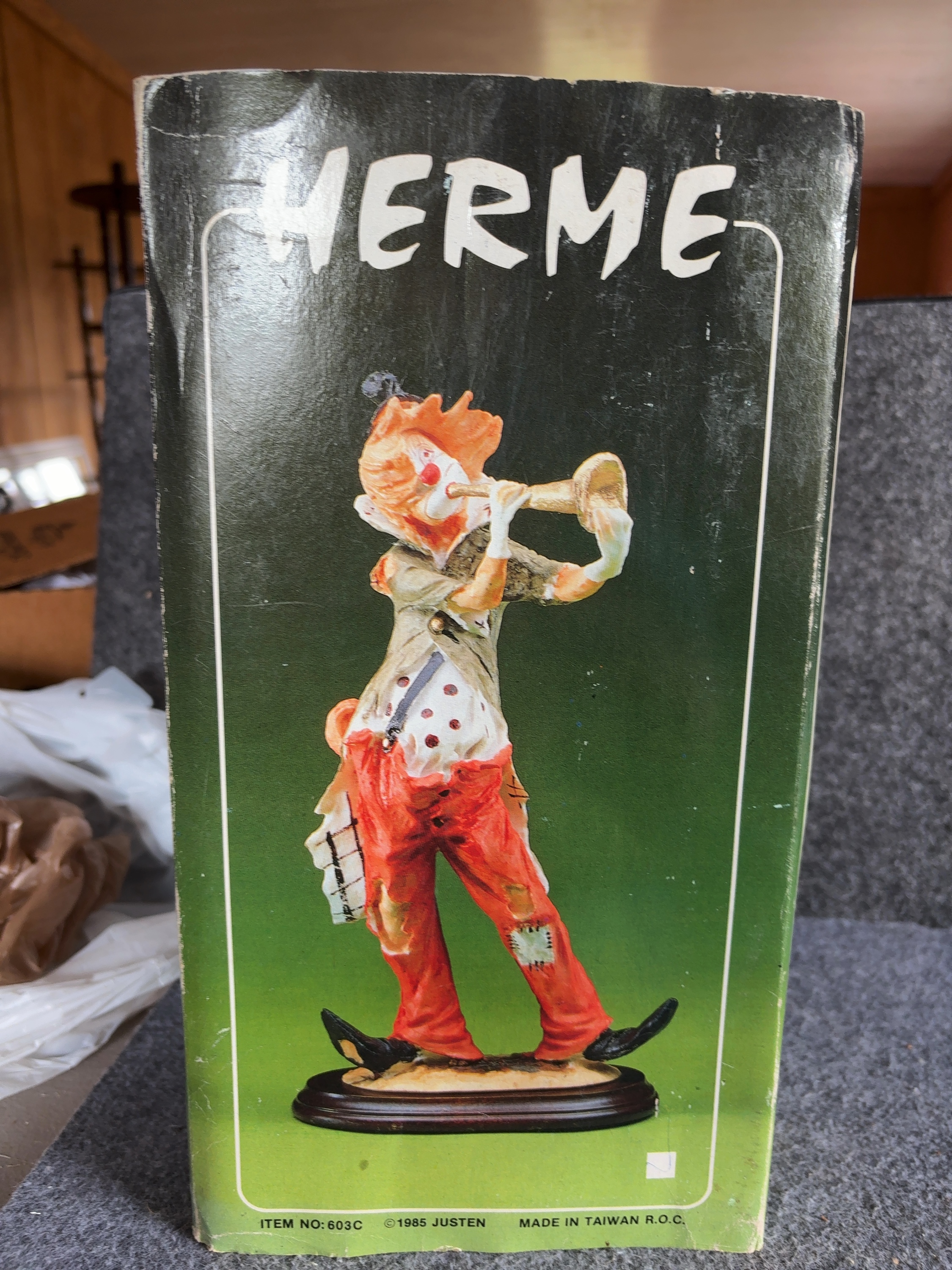 Justen Herme series clown figurine, model number 603C. This hand-painted cold-cast resin figure depicts a clown in a tattered style, shown standing and playing a long, flared trumpet. The clown wears an olive-green frock coat with buttons on the back, a beige polka-dot shirt with a single black suspender, and torn, patched red trousers. The figure features white facial makeup, a red nose, orange hair, and a small black top hat with a red band. The figurine stands on an integral, textured ground-style base. The original retail box is included, featuring the series name Herme and manufacturer information. The box is marked with a 1985 copyright and indicates the item was made in Taiwan, R.O.C.