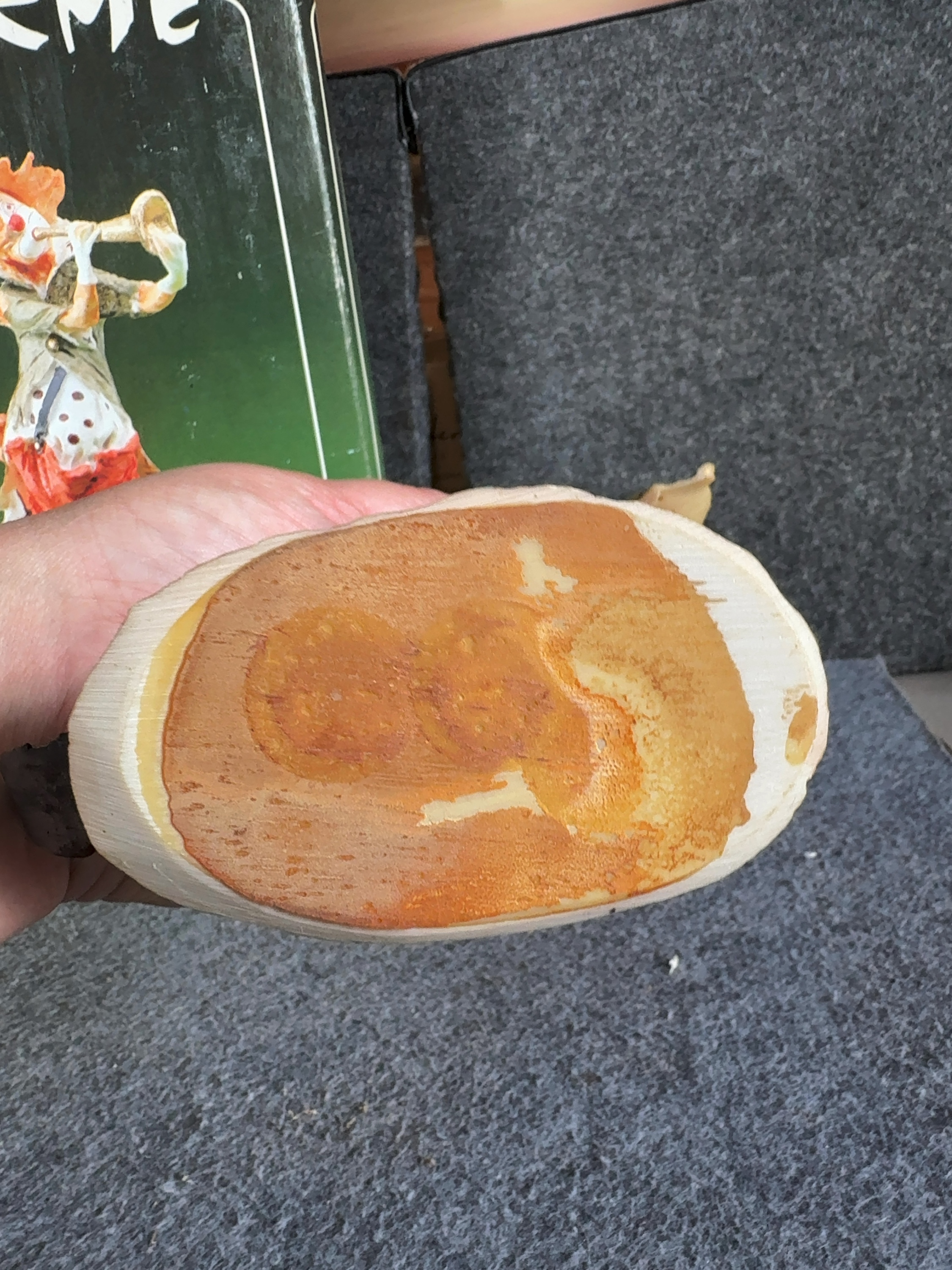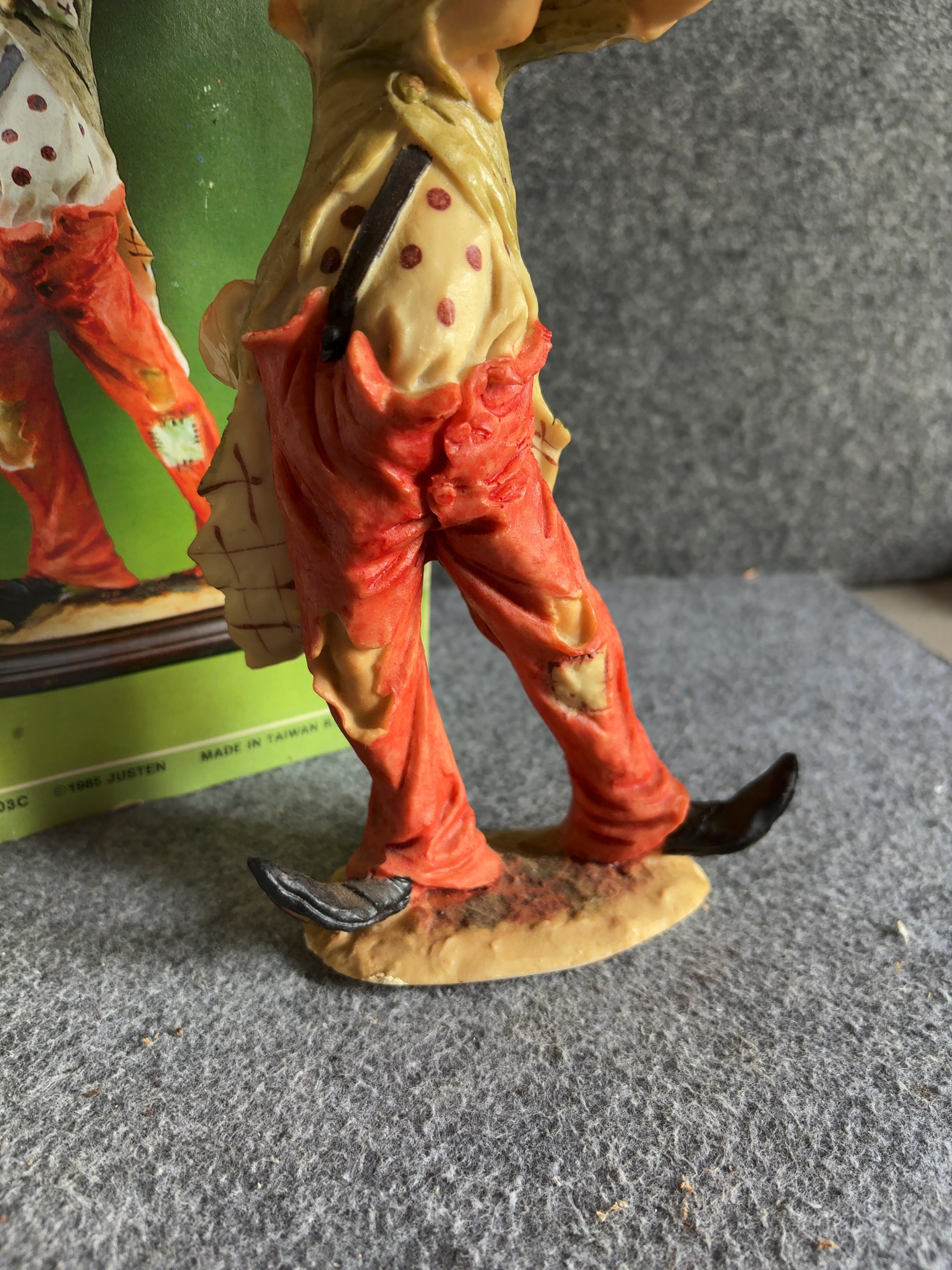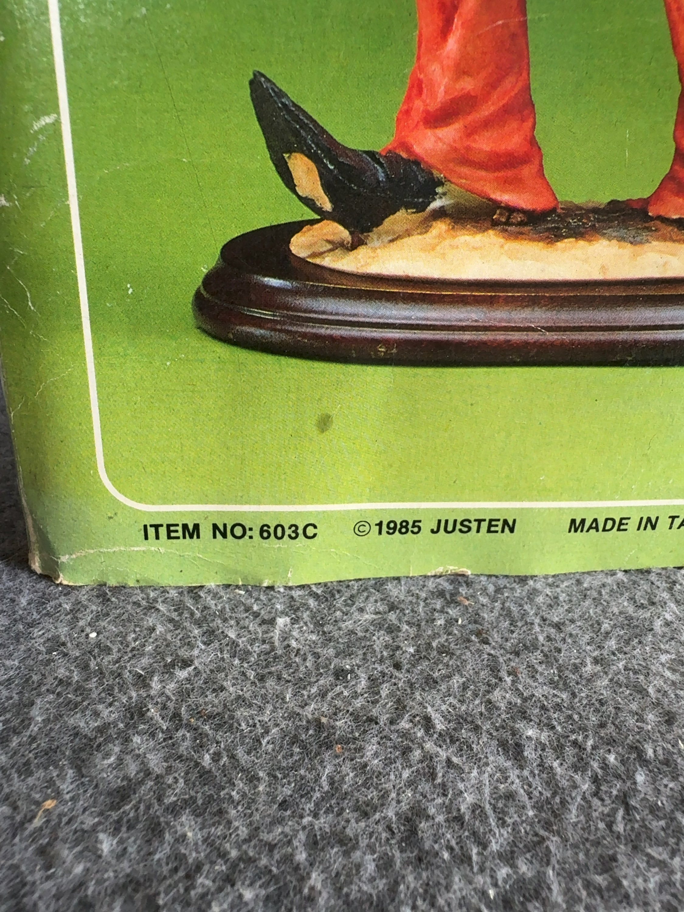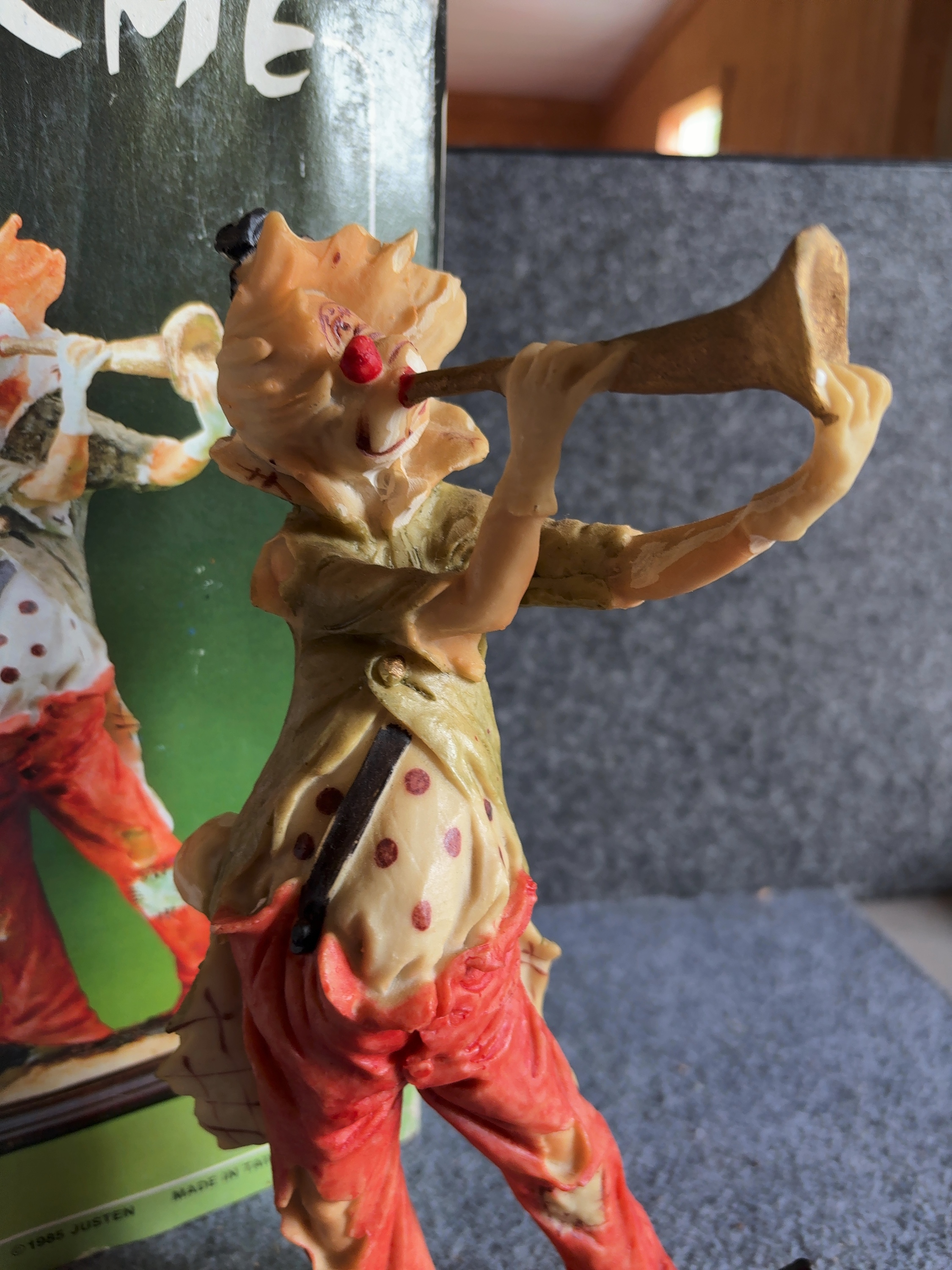 Justen Herme series clown figurine, model number 603C. This hand-painted cold-cast resin figure depicts a clown in a tattered style, shown standing and playing a long, flared trumpet. The clown wears an olive-green frock coat with buttons on the back, a beige polka-dot shirt with a single black suspender, and torn, patched red trousers. The figure features white facial makeup, a red nose, orange hair, and a small black top hat with a red band. The figurine stands on an integral, textured ground-style base. The original retail box is included, featuring the series name Herme and manufacturer information. The box is marked with a 1985 copyright and indicates the item was made in Taiwan, R.O.C.