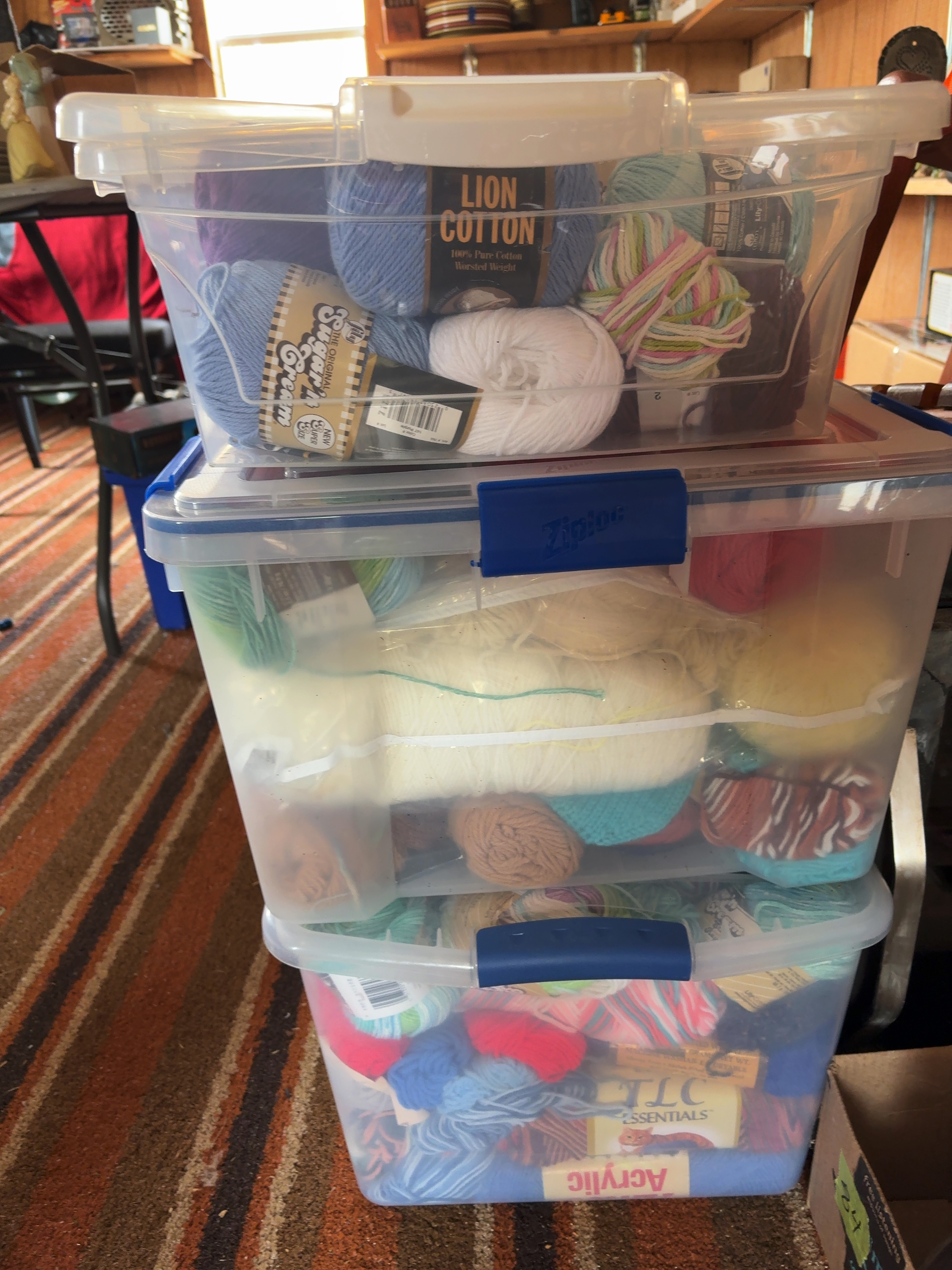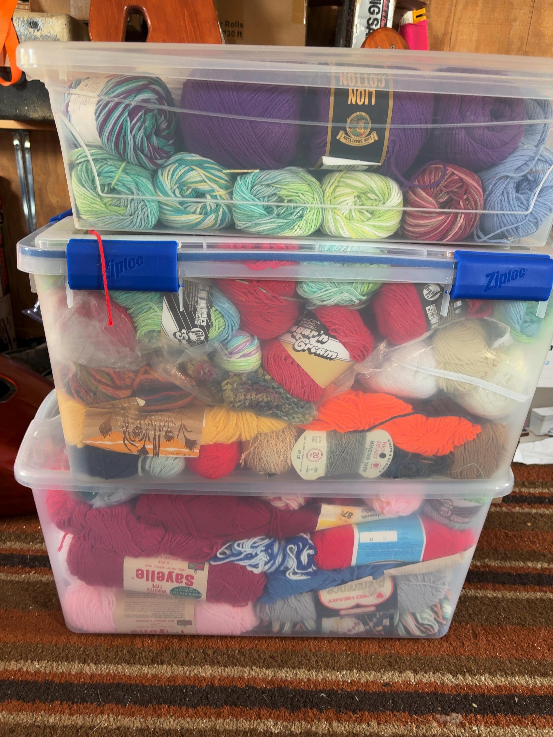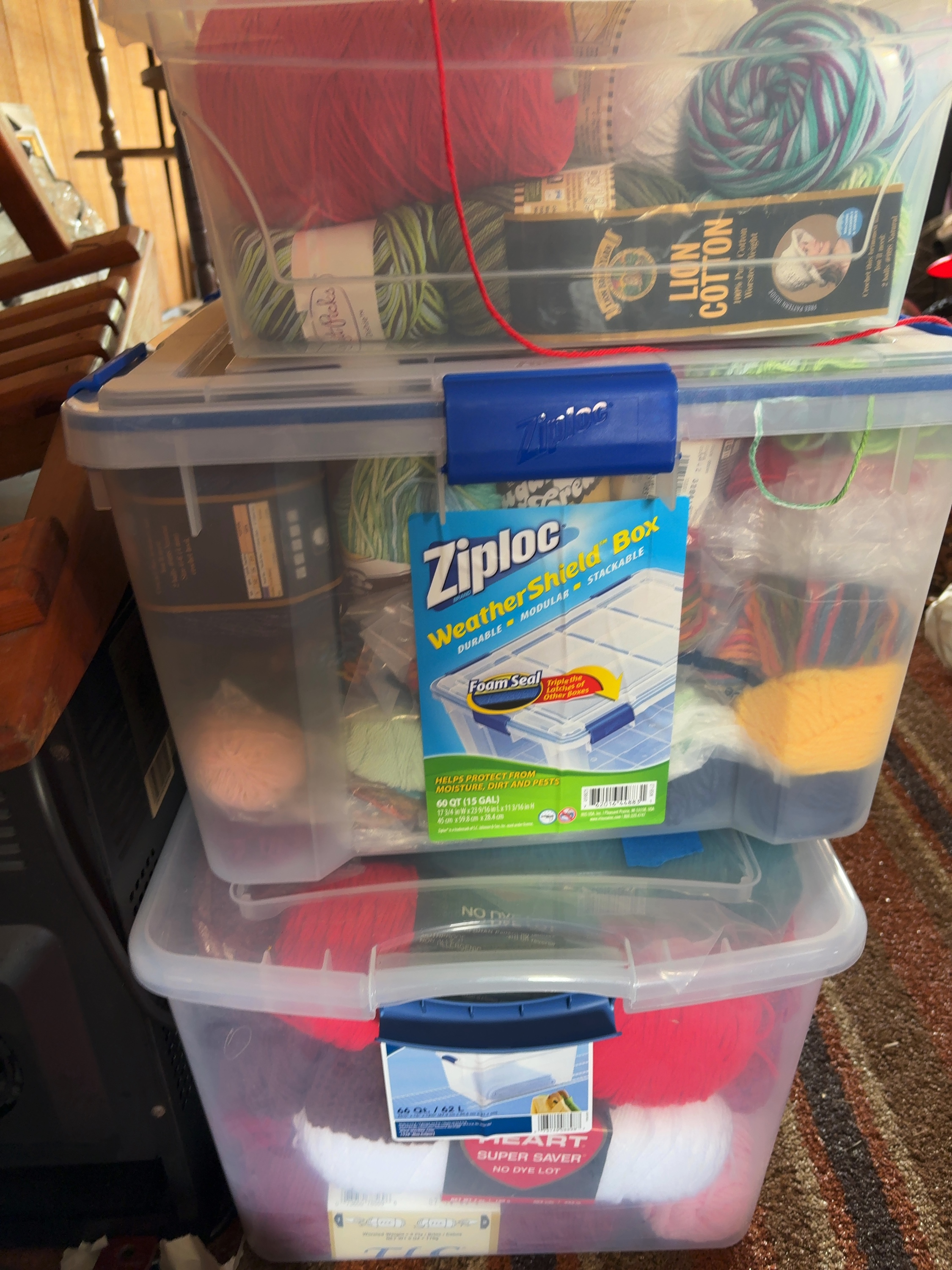This collection consists of a large quantity of yarn from various manufacturers, including Lion Brand (Lion Cotton), Red Heart (Super Saver and Mending Yarn), Sugar n Cream, Sayelle, KnitPicks, and TLC Essentials. The lot features a variety of colors, weights, and materials such as cotton and acrylic. The assortment includes full skeins with original manufacturer labels, partially used skeins, and loose balls of yarn. Some items are individually packaged in smaller plastic bags. The yarn is housed in three large clear plastic storage containers with latching lids. Two of the containers are identified as Ziploc WeatherShield boxes with a 60-quart (15-gallon) capacity.