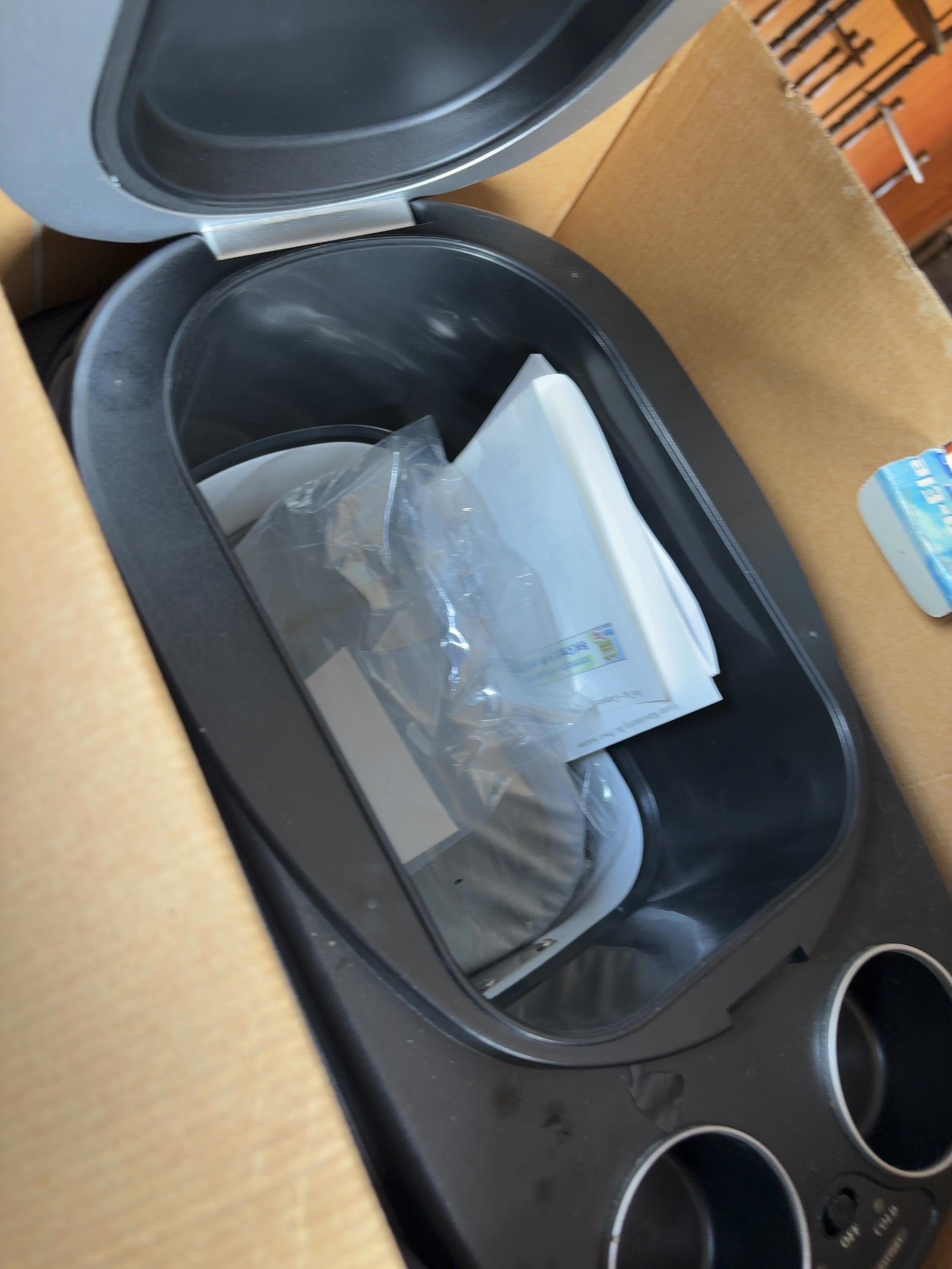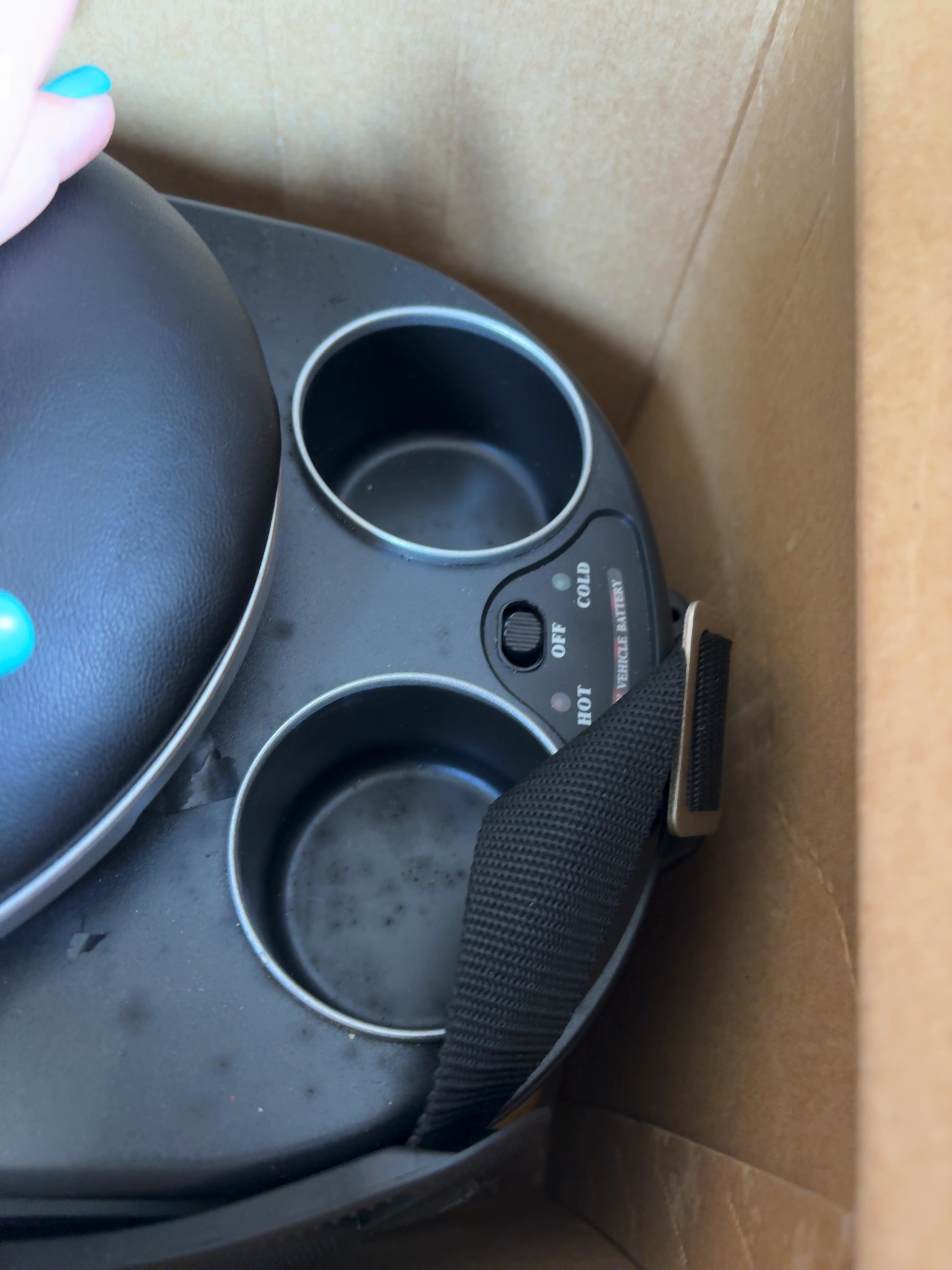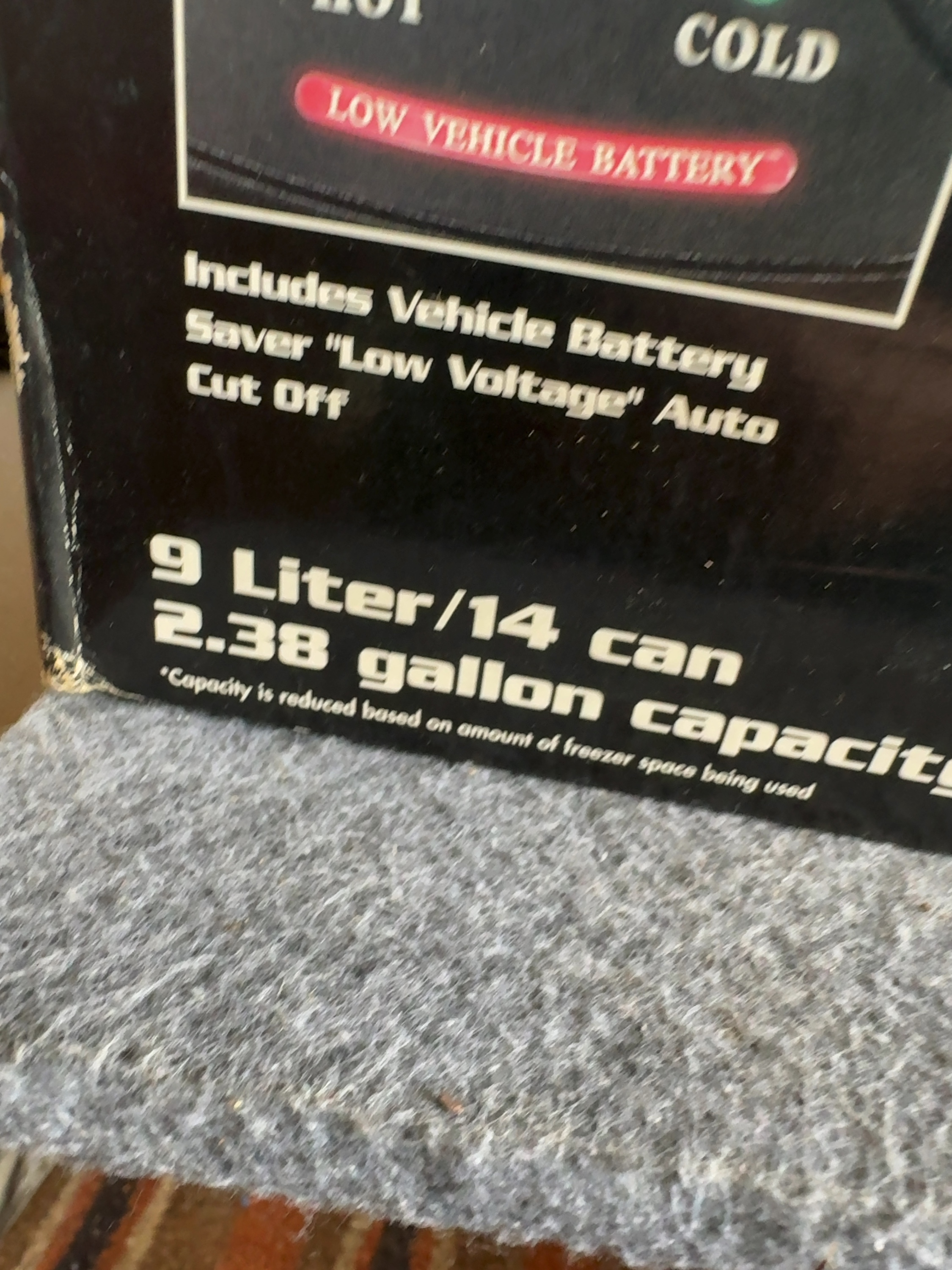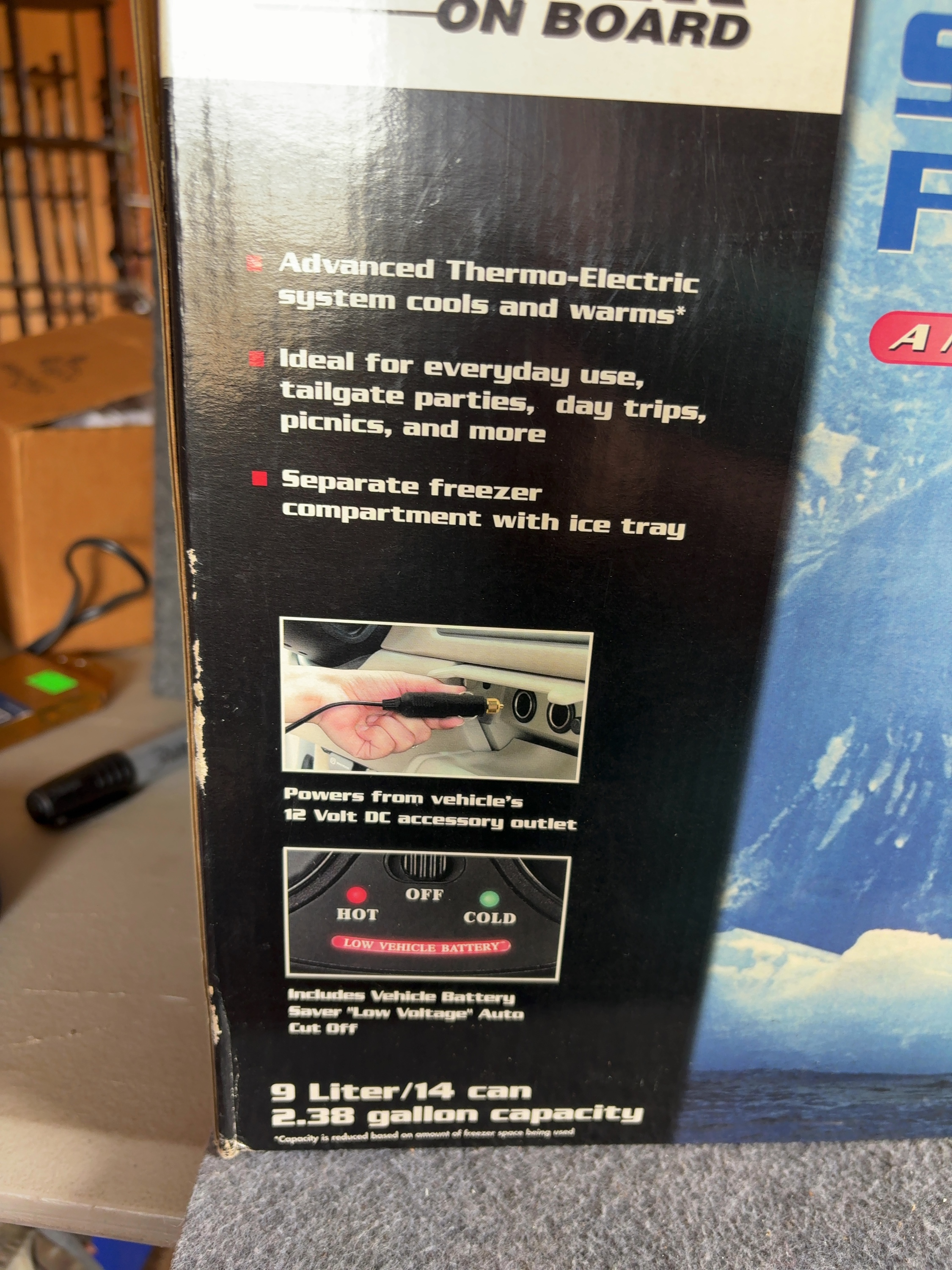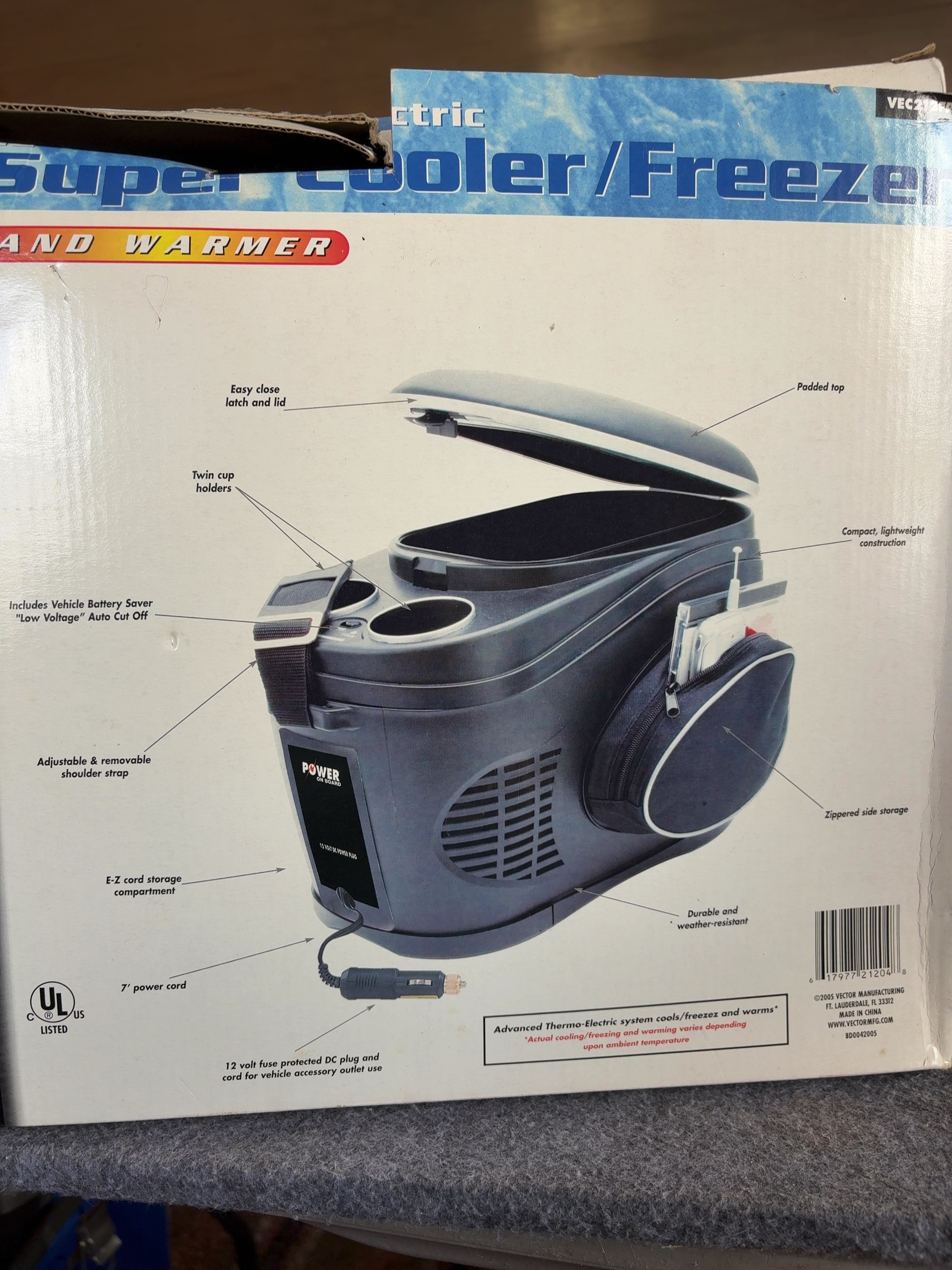 Vector Manufacturing Power On Board model VEC212FPB 12-volt thermo-electric super cooler, freezer, and warmer. This unit has a 9-liter capacity, equivalent to 14 cans or 2.38 gallons, and features a separate internal freezer compartment. The thermo-electric system is designed to cool, freeze, or warm items using a vehicle 12V DC accessory outlet. It includes a built-in Low Voltage automatic cut-off battery saver. The exterior is constructed with a padded top, twin cup holders, zippered side storage, and an E-Z cord storage compartment. It is equipped with an adjustable and removable shoulder strap. Included with the unit are a 7-foot power cord with a fused 12-volt DC plug, the original instruction manual, and a packaged ice tray. The item is presented in its original retail box.