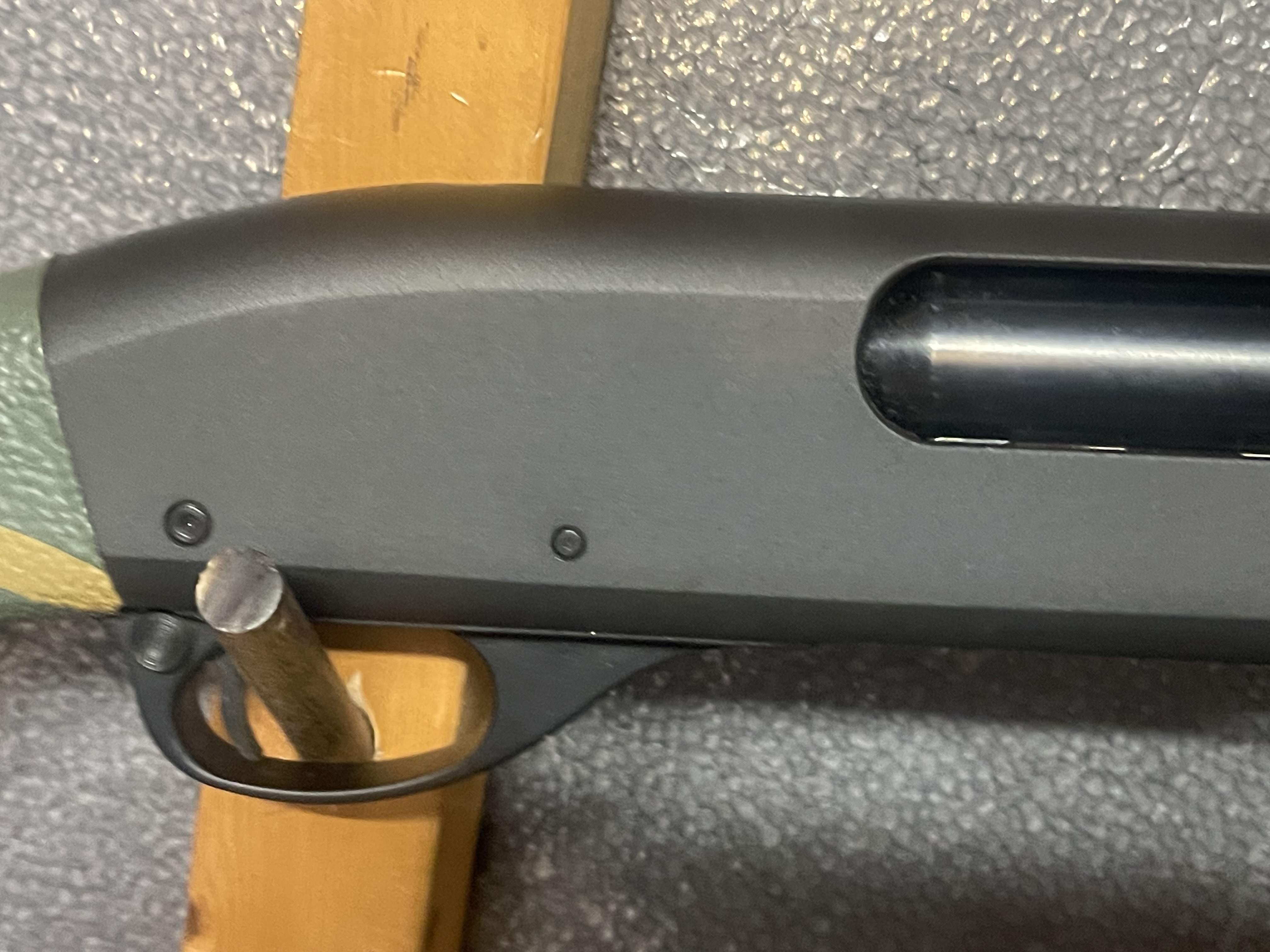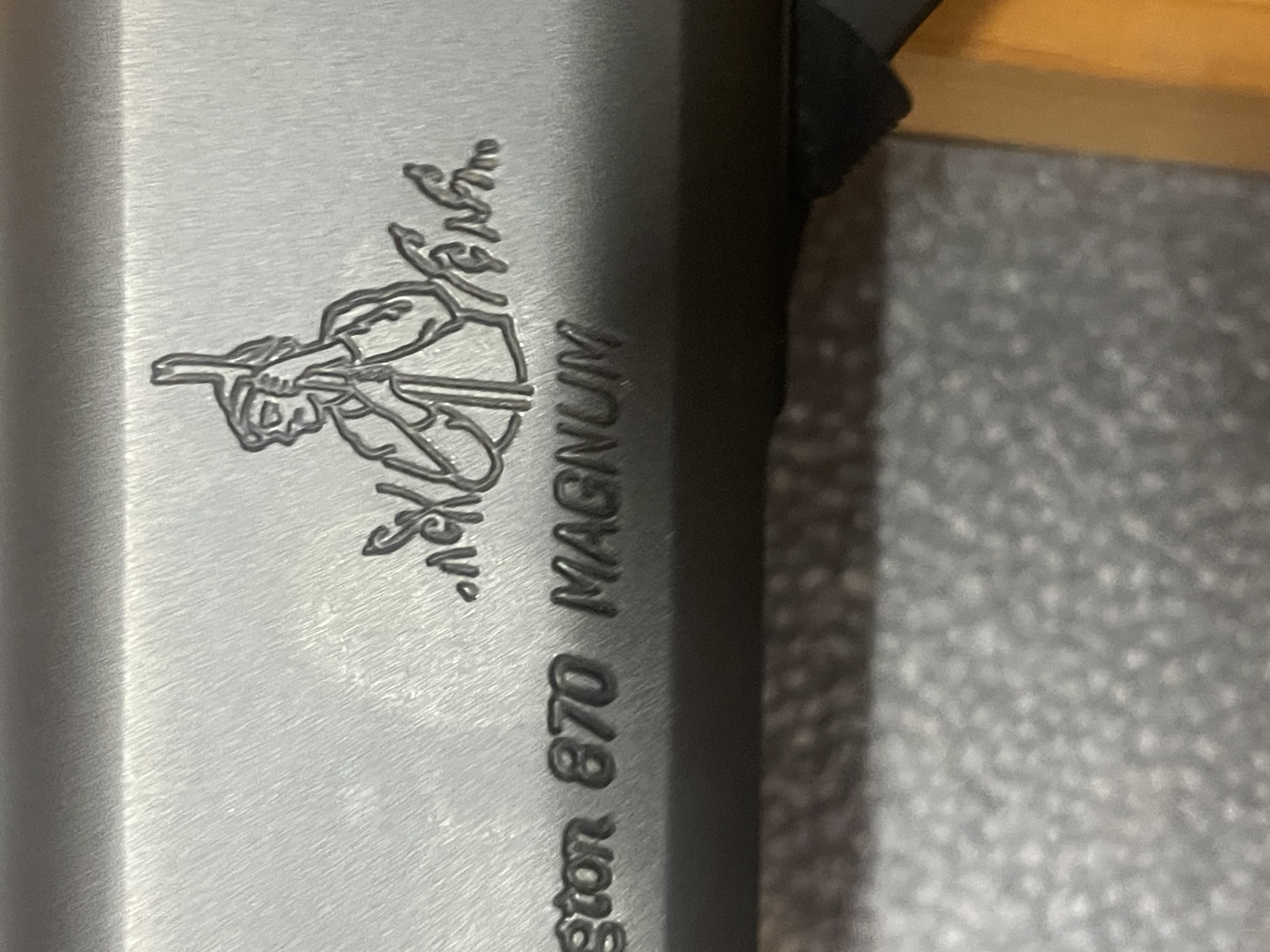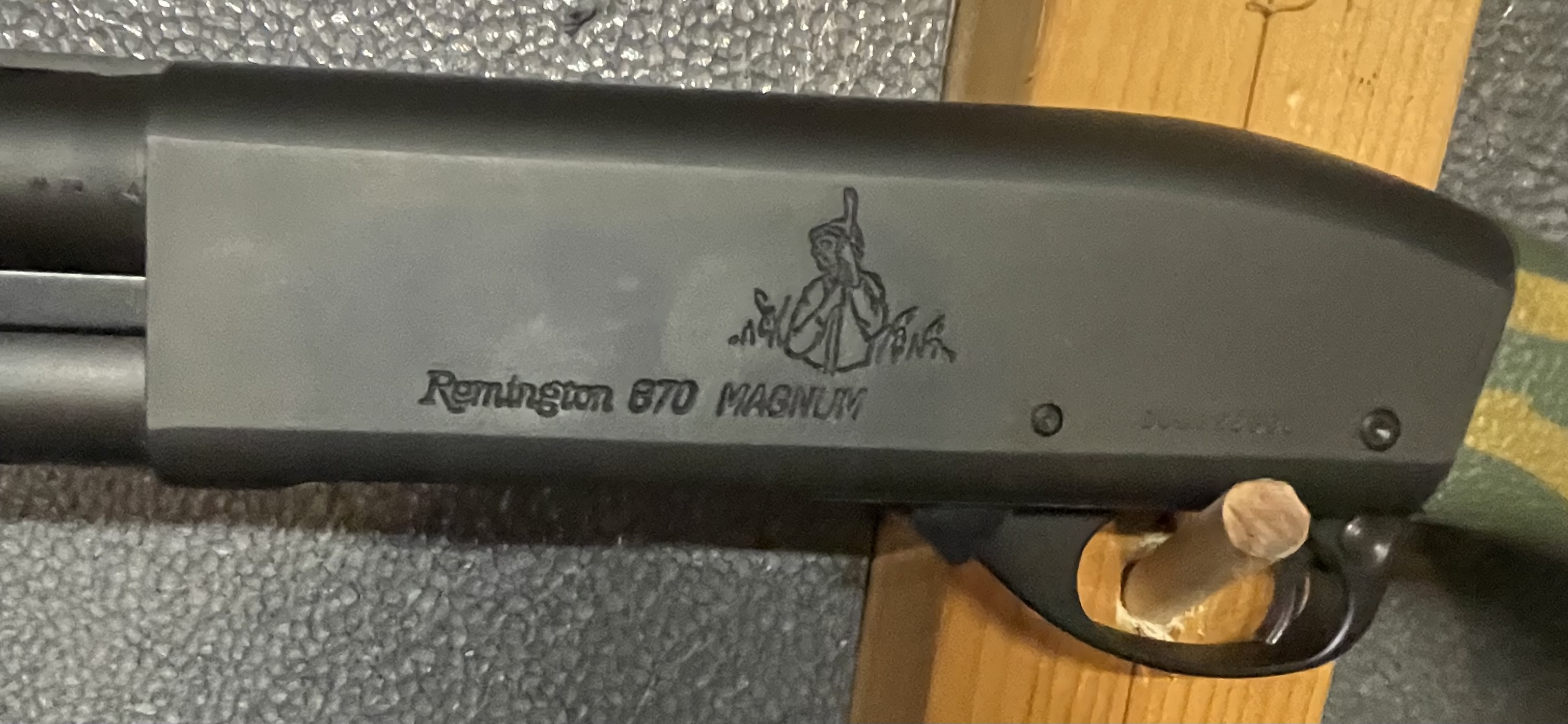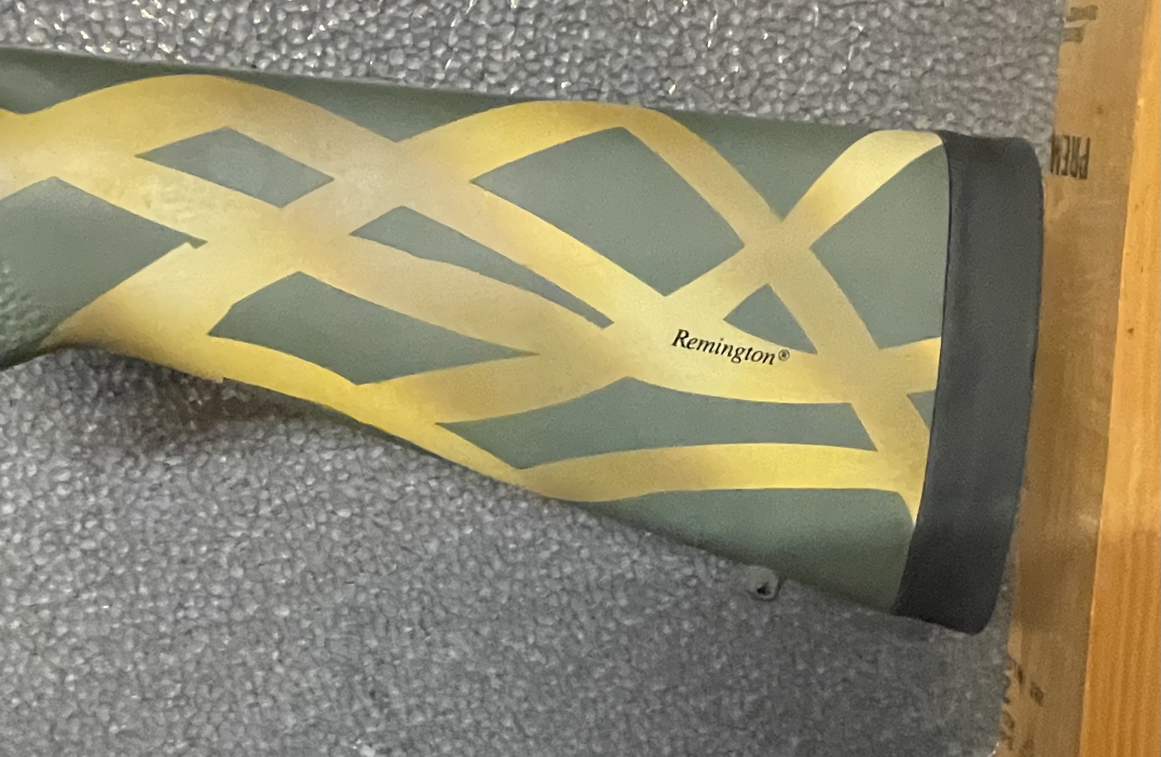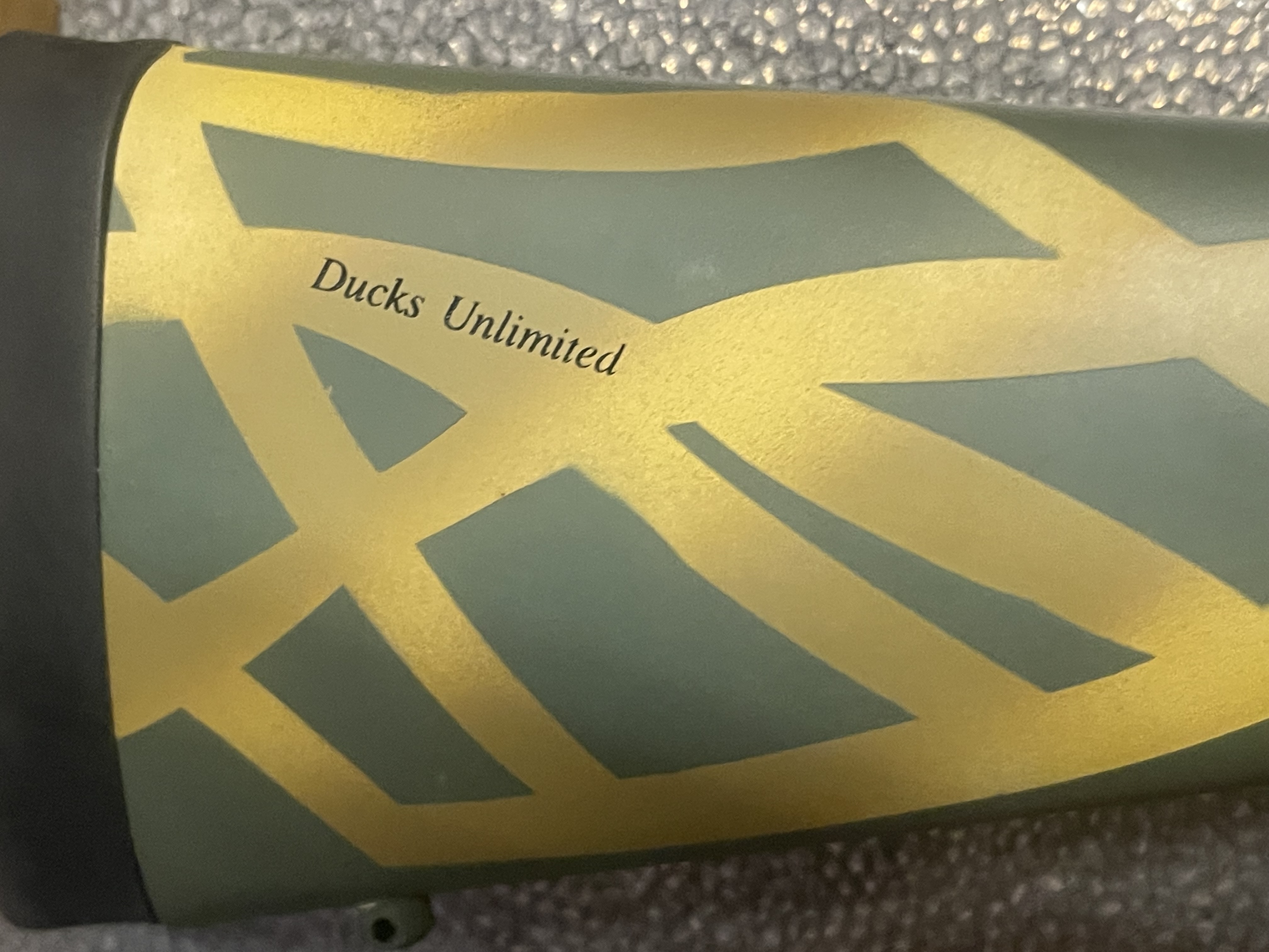 NEVER FIRED NEW IN SAFE ALL THESE YEARS Remington Model 870 Magnum Ducks Unlimited Guide Gun serial #DUGG-2602, 12 ga., 28” ventilated rib Rem-Choked barrel with a bright excellent bore. The metal surfaces PERFECT. The textured synthetic pistolgrip buttstock and forend ALL FACTORY FRESH green and yellow wetlands camouflage The left side of the receiver features the bust of a hunting guide, the barrel is sighted with a silver bead, and the action appears to function well mechanically.