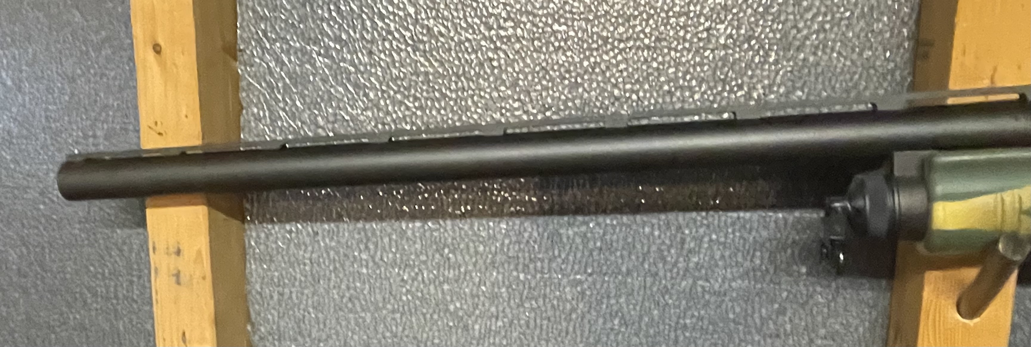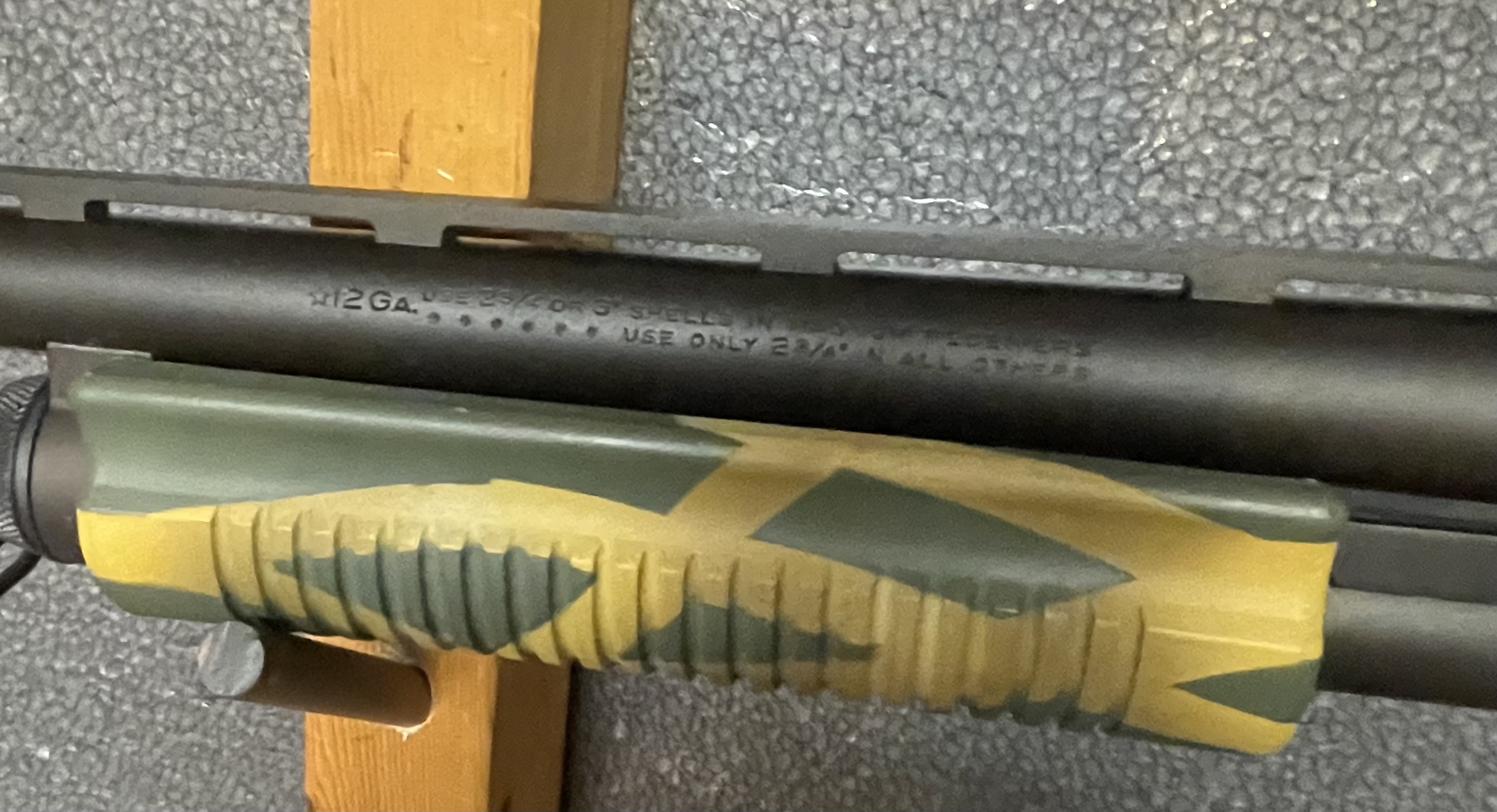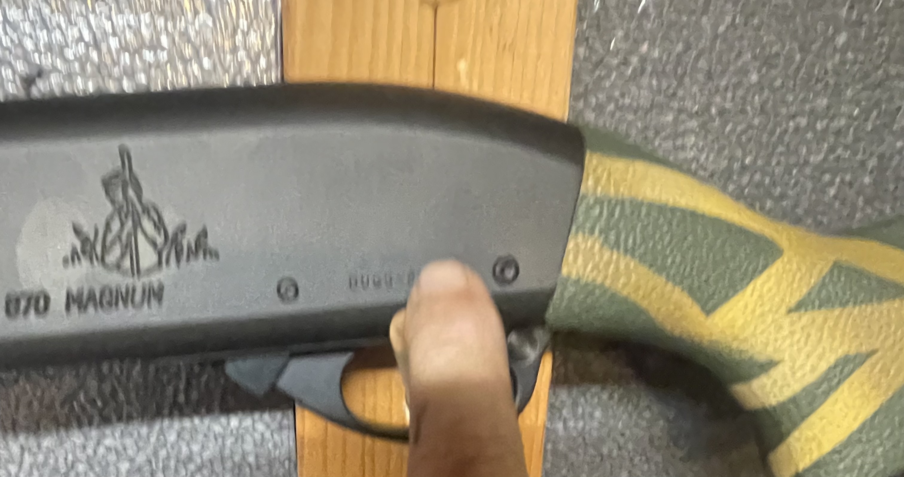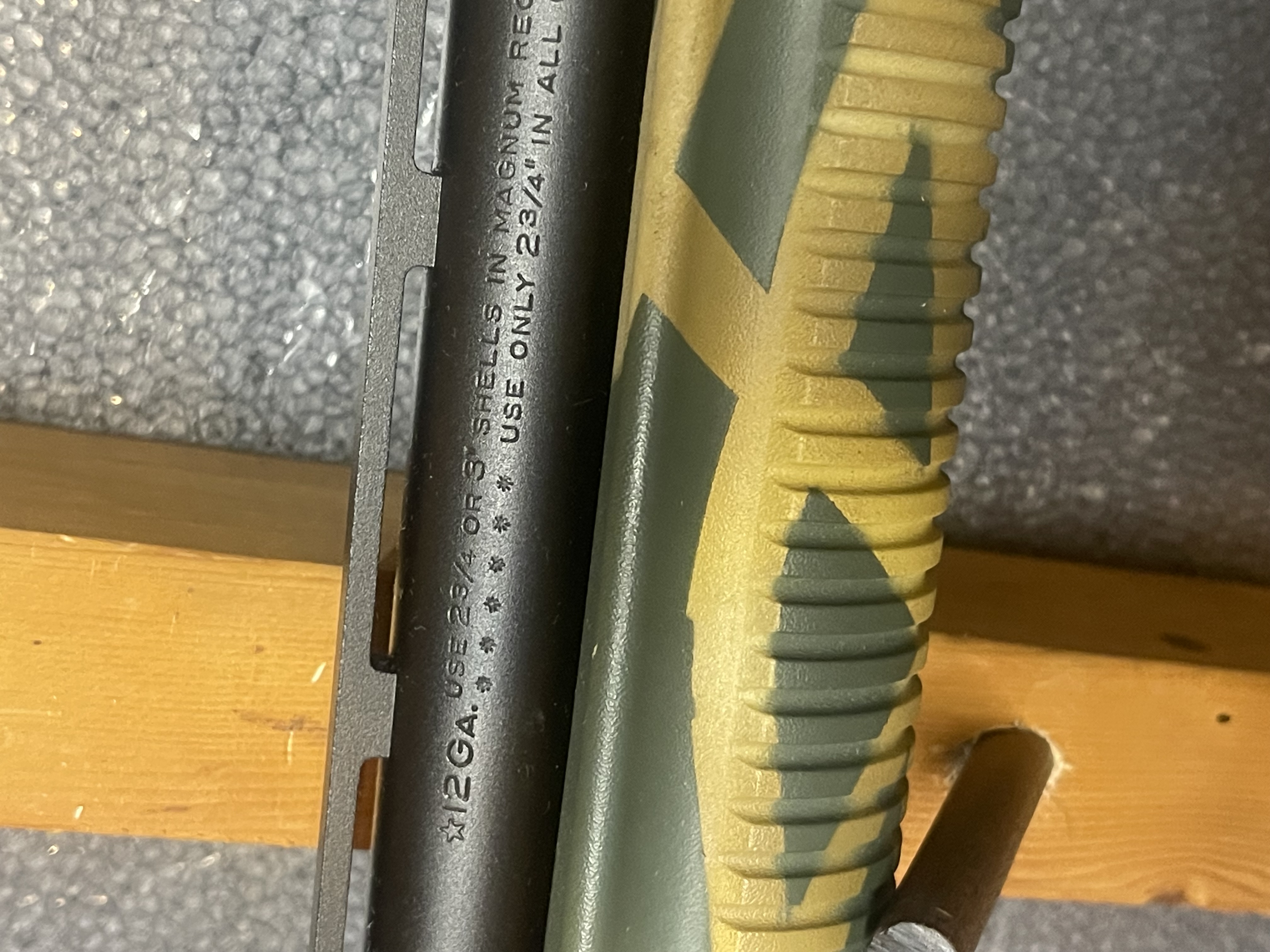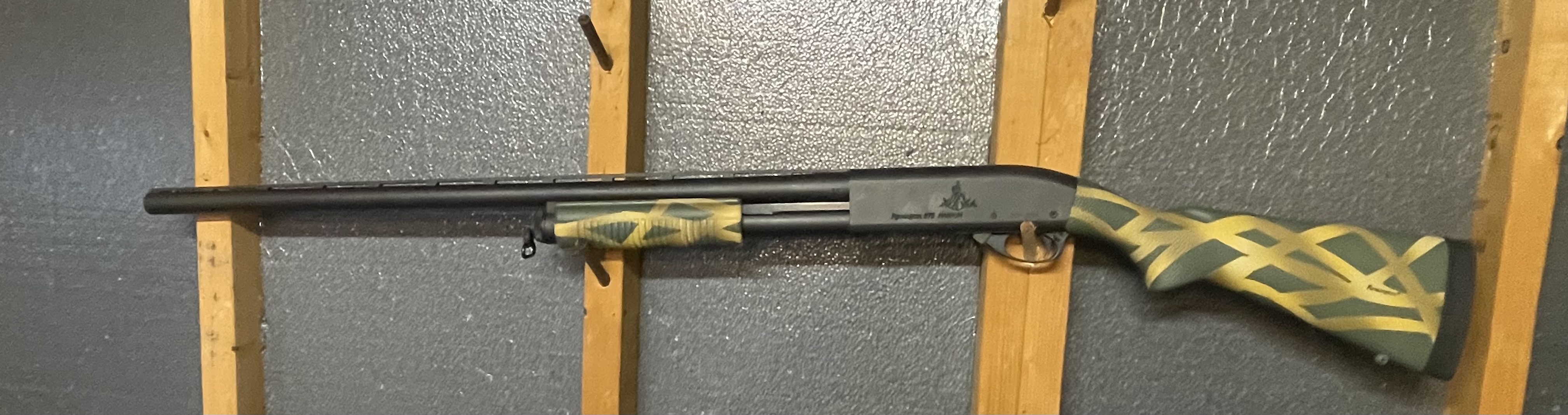 NEVER FIRED NEW IN SAFE ALL THESE YEARS Remington Model 870 Magnum Ducks Unlimited Guide Gun serial #DUGG-2602, 12 ga., 28” ventilated rib Rem-Choked barrel with a bright excellent bore. The metal surfaces PERFECT. The textured synthetic pistolgrip buttstock and forend ALL FACTORY FRESH green and yellow wetlands camouflage The left side of the receiver features the bust of a hunting guide, the barrel is sighted with a silver bead, and the action appears to function well mechanically.