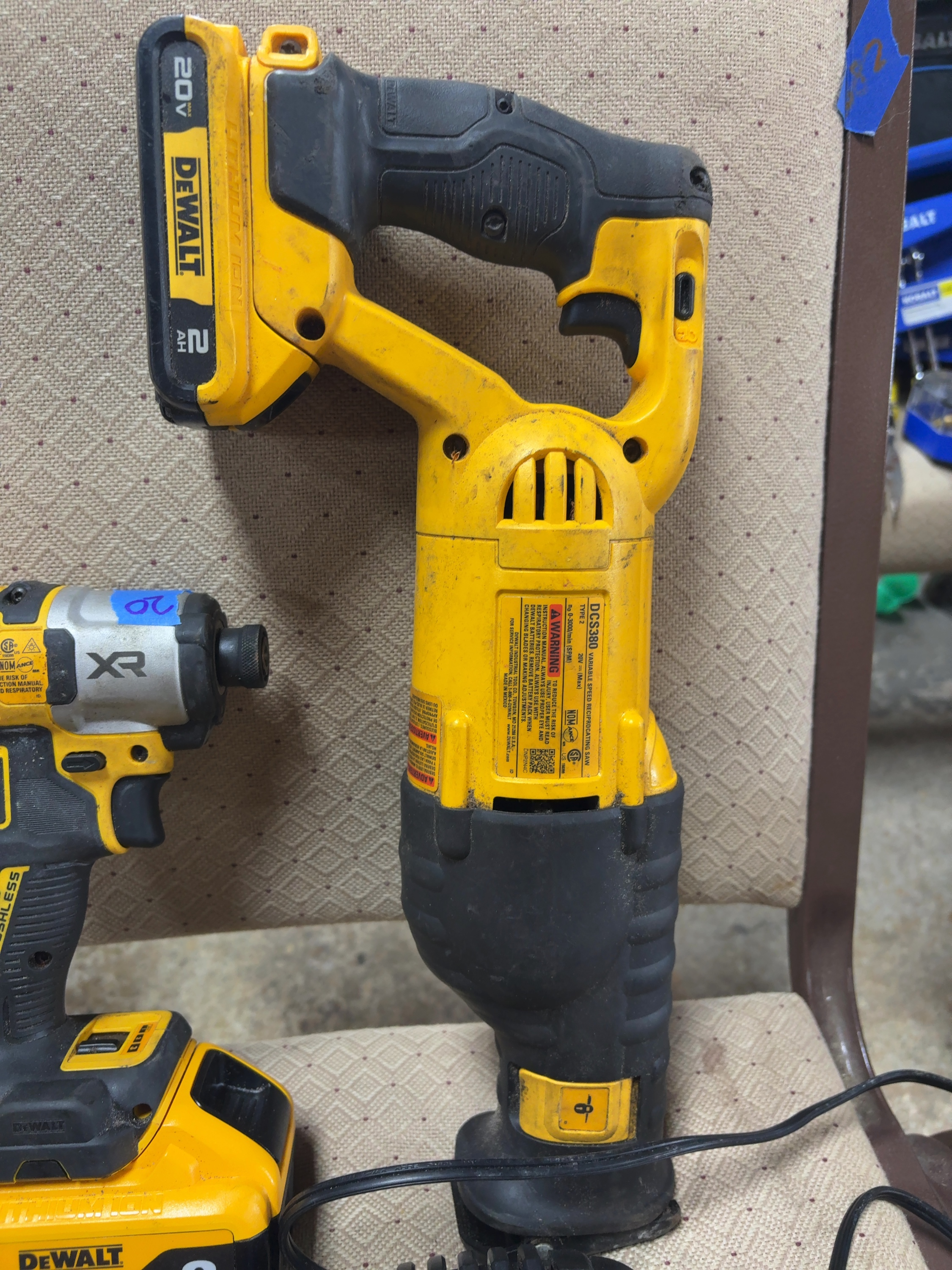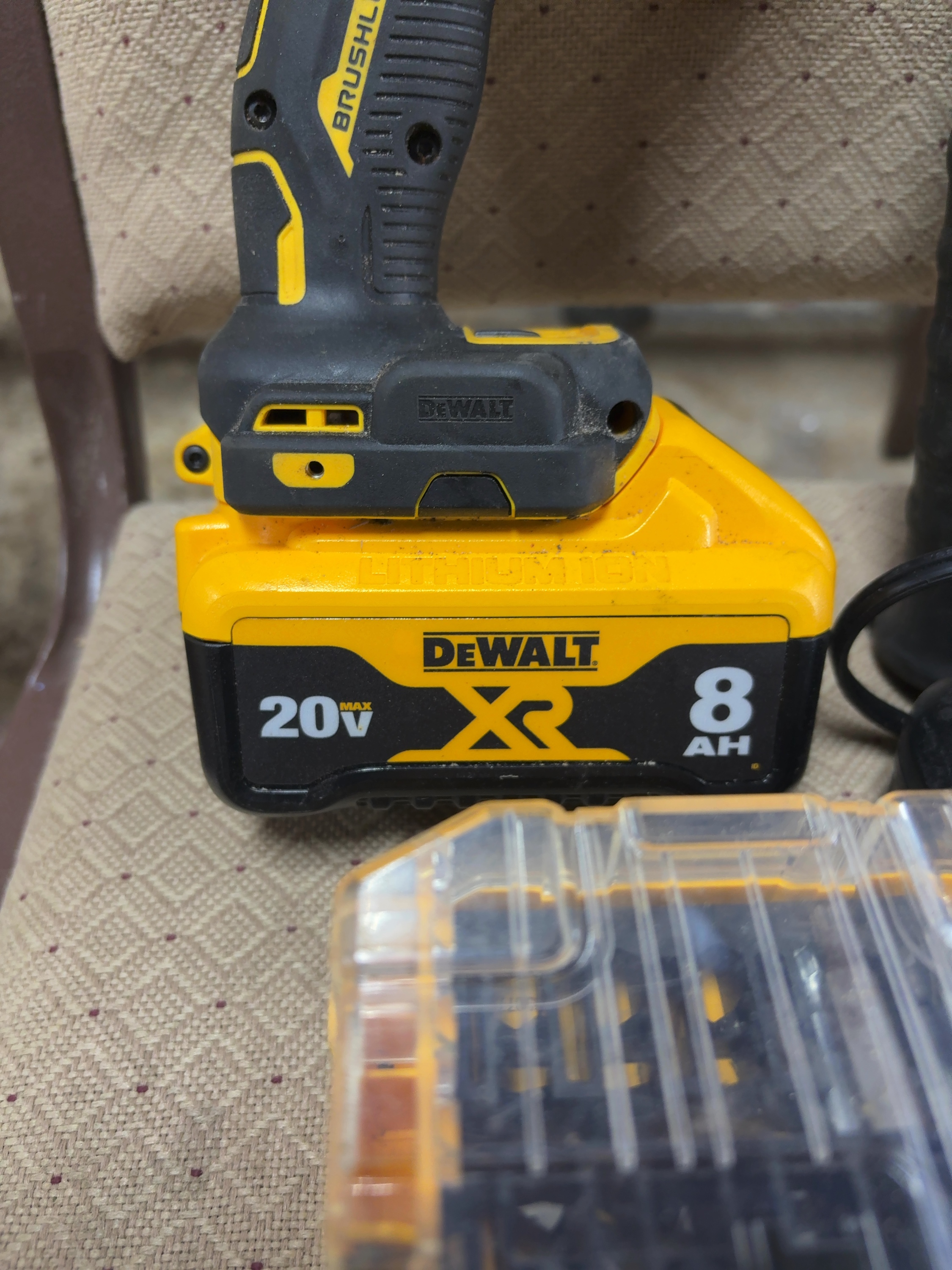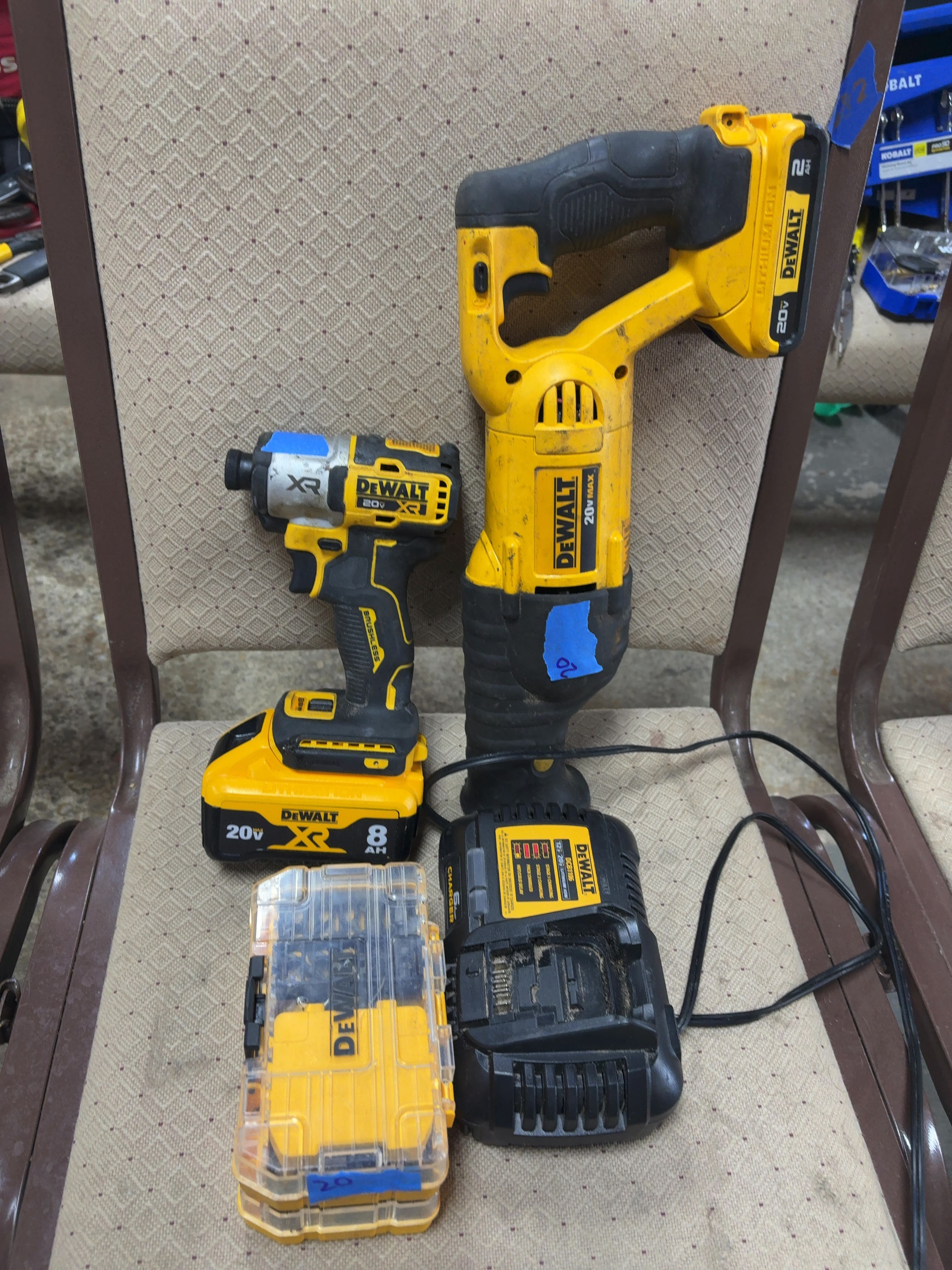 This collection consists of DeWalt brand 20V Max cordless power tools and related accessories. The set includes a DCF845 Type 1 XR Brushless 1/4 inch impact driver and a DCS380 Type 2 variable speed reciprocating saw. Power is provided by two lithium-ion batteries: one 20V Max XR 8.0 Ah and one 20V Max 2.0 Ah. A DeWalt DCB1106 6 Amp battery charger is included, designed for 12V and 20V lithium-ion batteries. Additionally, the lot contains two DeWalt ToughCase plus storage containers holding an assortment of accessories. One case contains gold-finish twist drill bits in various sizes up to 1/2 inch. The second case contains a variety of driver bits including Phillips, flathead, hex, and Torx types, along with nut drivers and a bit holder. Manufacturer labels on the tools identify the maker as DeWalt Industrial Tool Co., Towson, Maryland. The reciprocating saw label indicates it was made in Mexico.