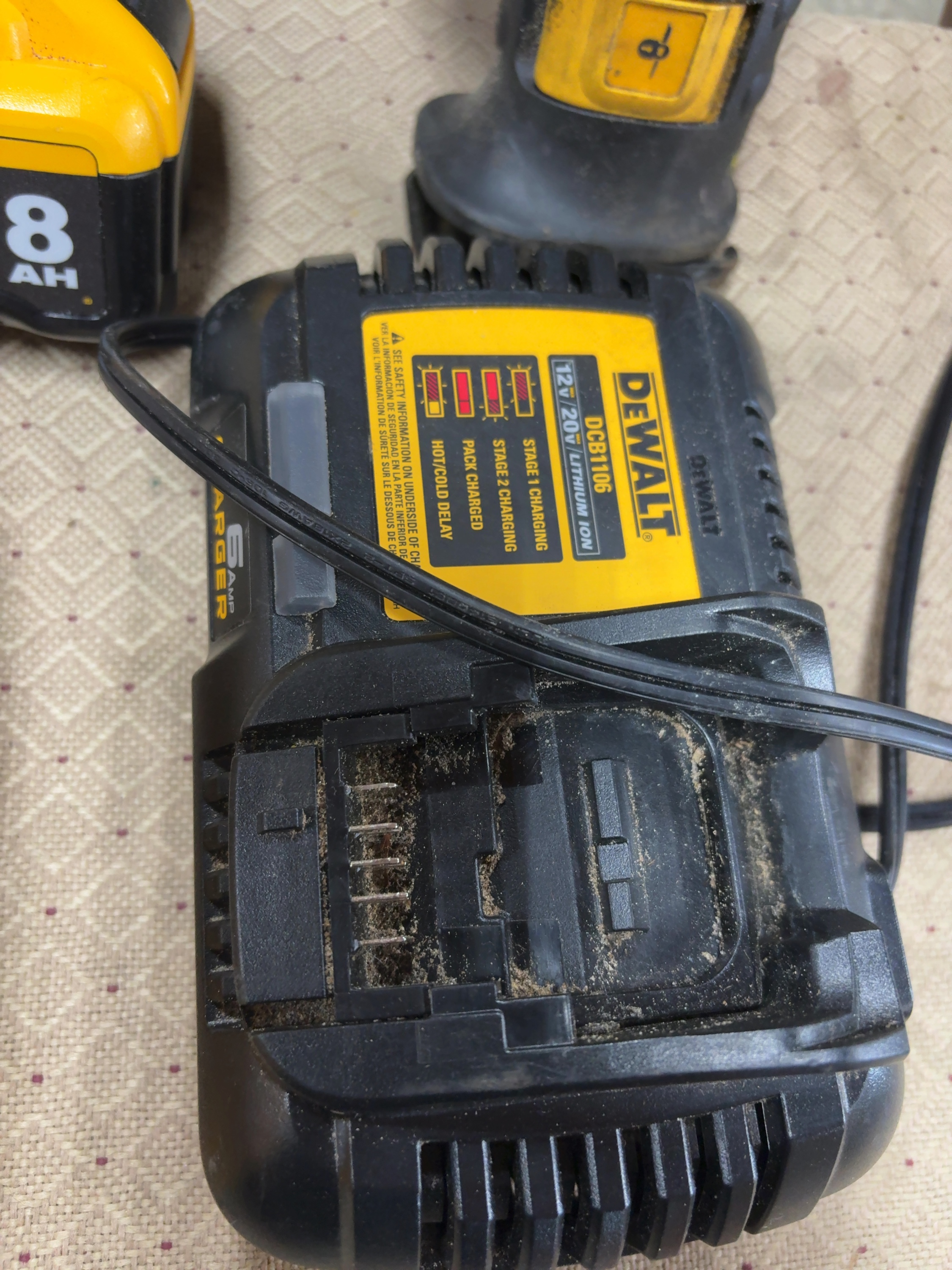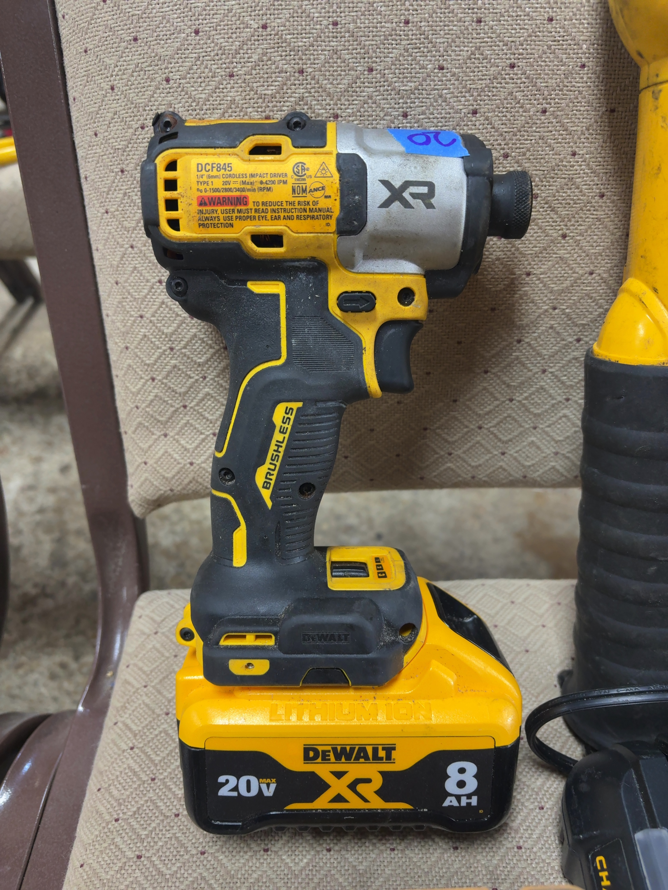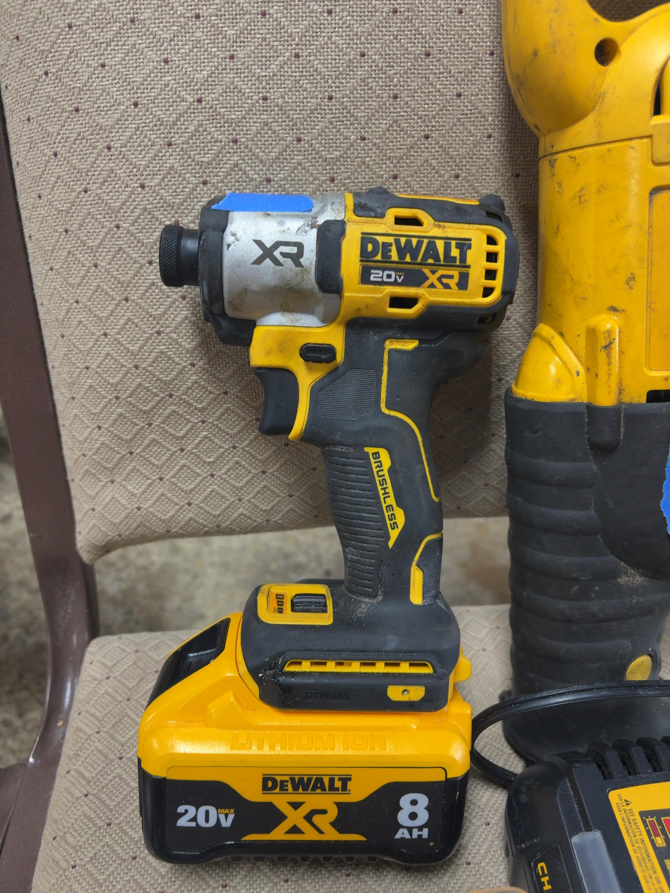 This collection consists of DeWalt brand 20V Max cordless power tools and related accessories. The set includes a DCF845 Type 1 XR Brushless 1/4 inch impact driver and a DCS380 Type 2 variable speed reciprocating saw. Power is provided by two lithium-ion batteries: one 20V Max XR 8.0 Ah and one 20V Max 2.0 Ah. A DeWalt DCB1106 6 Amp battery charger is included, designed for 12V and 20V lithium-ion batteries. Additionally, the lot contains two DeWalt ToughCase plus storage containers holding an assortment of accessories. One case contains gold-finish twist drill bits in various sizes up to 1/2 inch. The second case contains a variety of driver bits including Phillips, flathead, hex, and Torx types, along with nut drivers and a bit holder. Manufacturer labels on the tools identify the maker as DeWalt Industrial Tool Co., Towson, Maryland. The reciprocating saw label indicates it was made in Mexico.