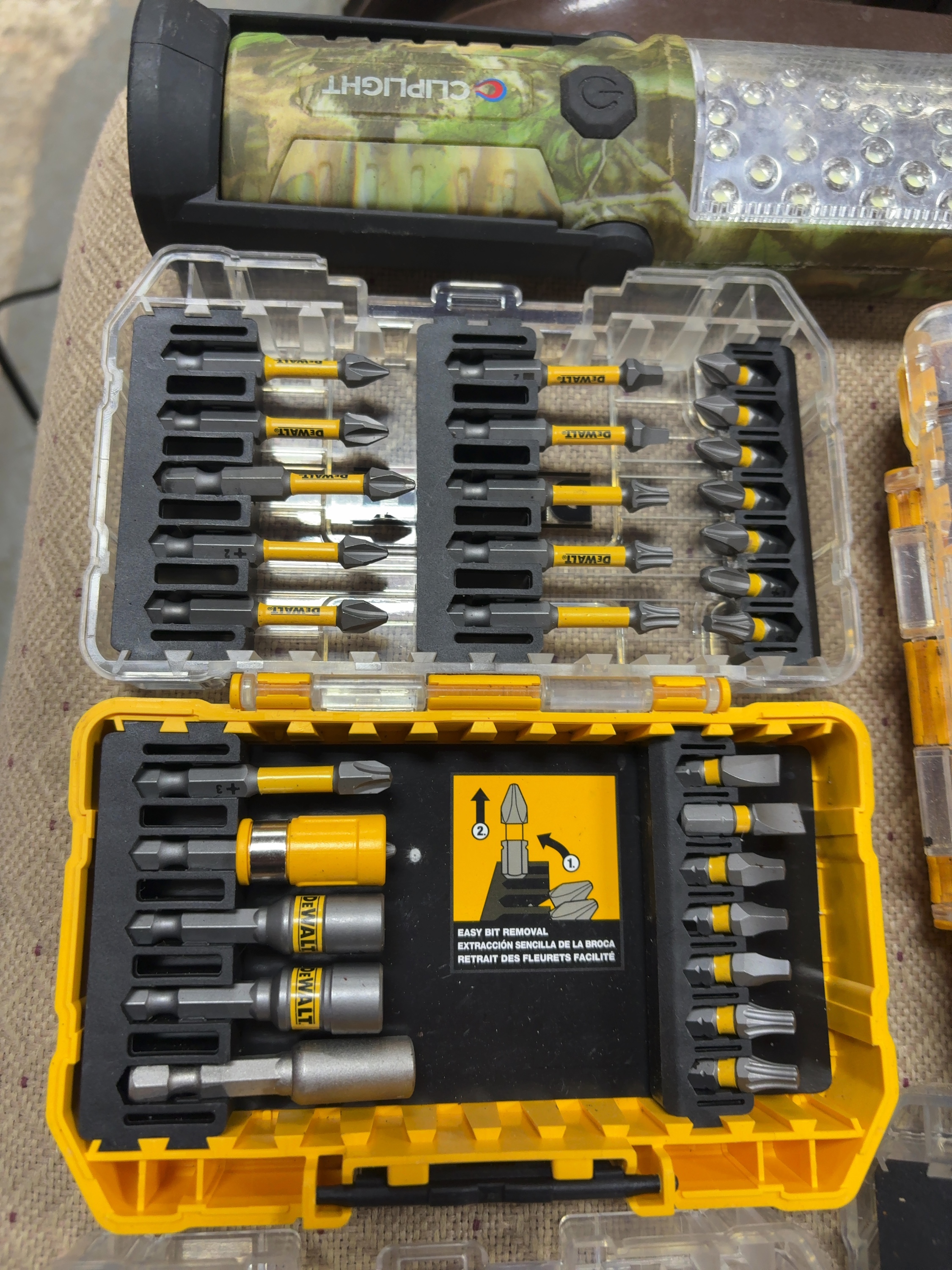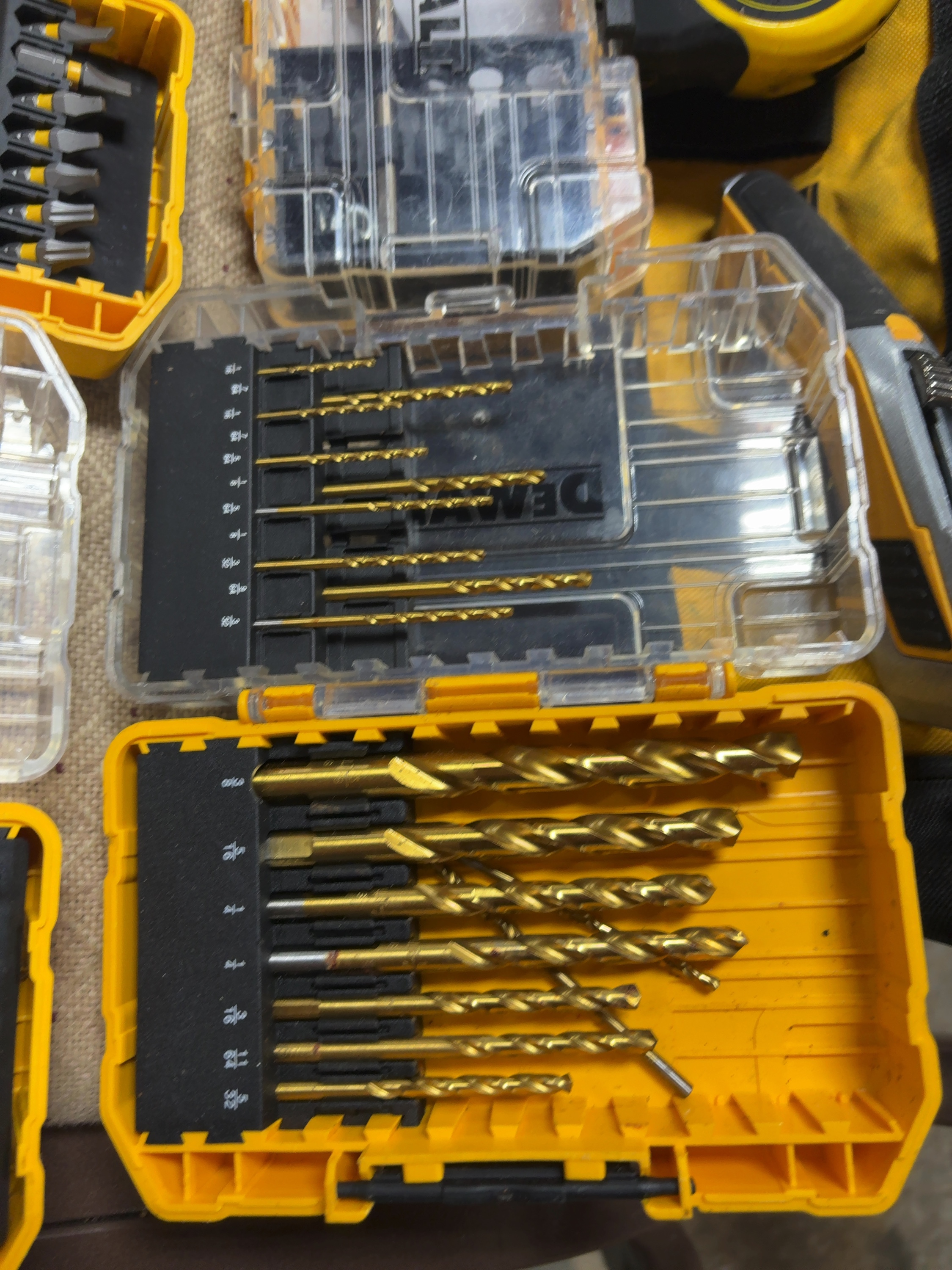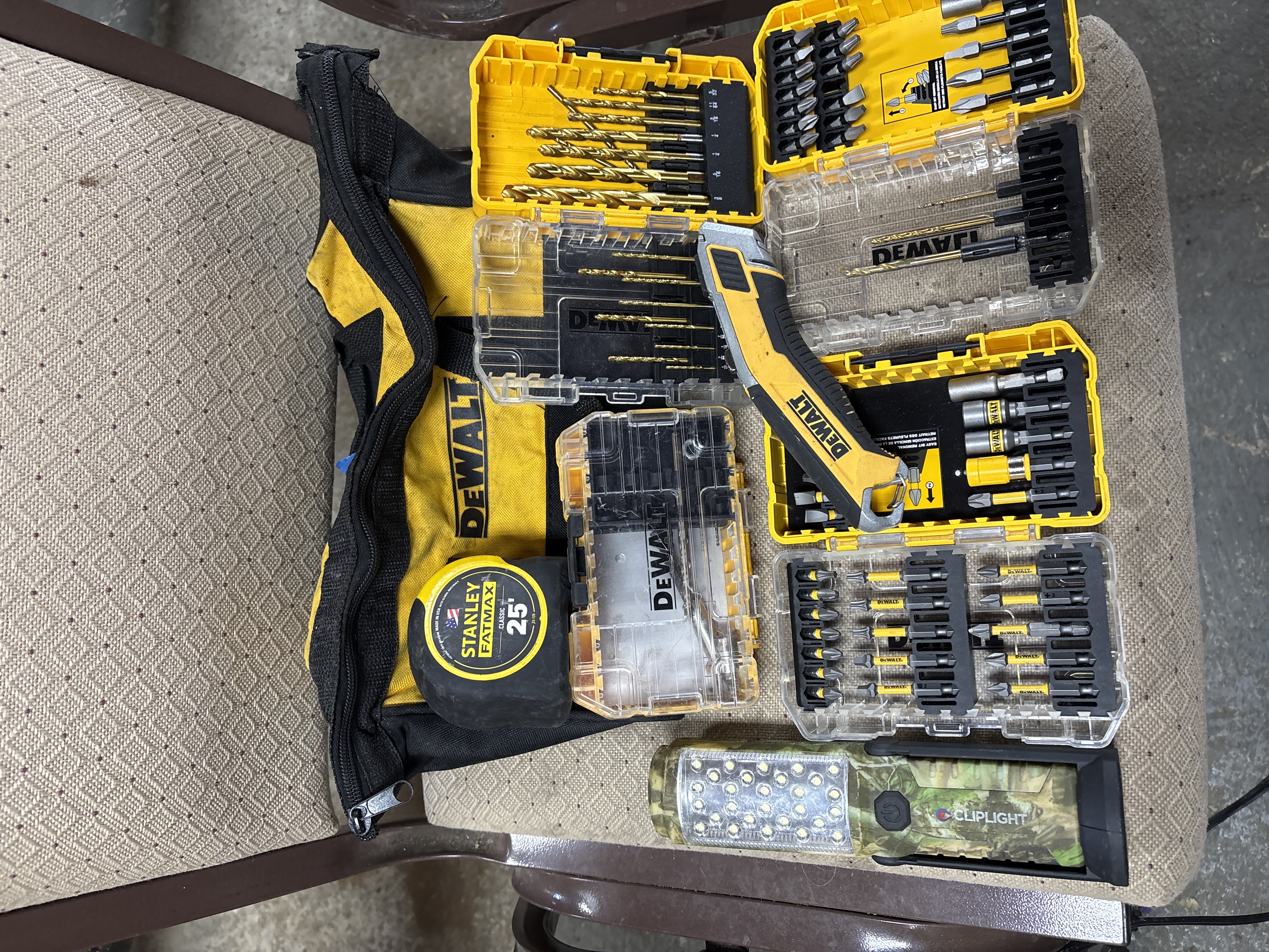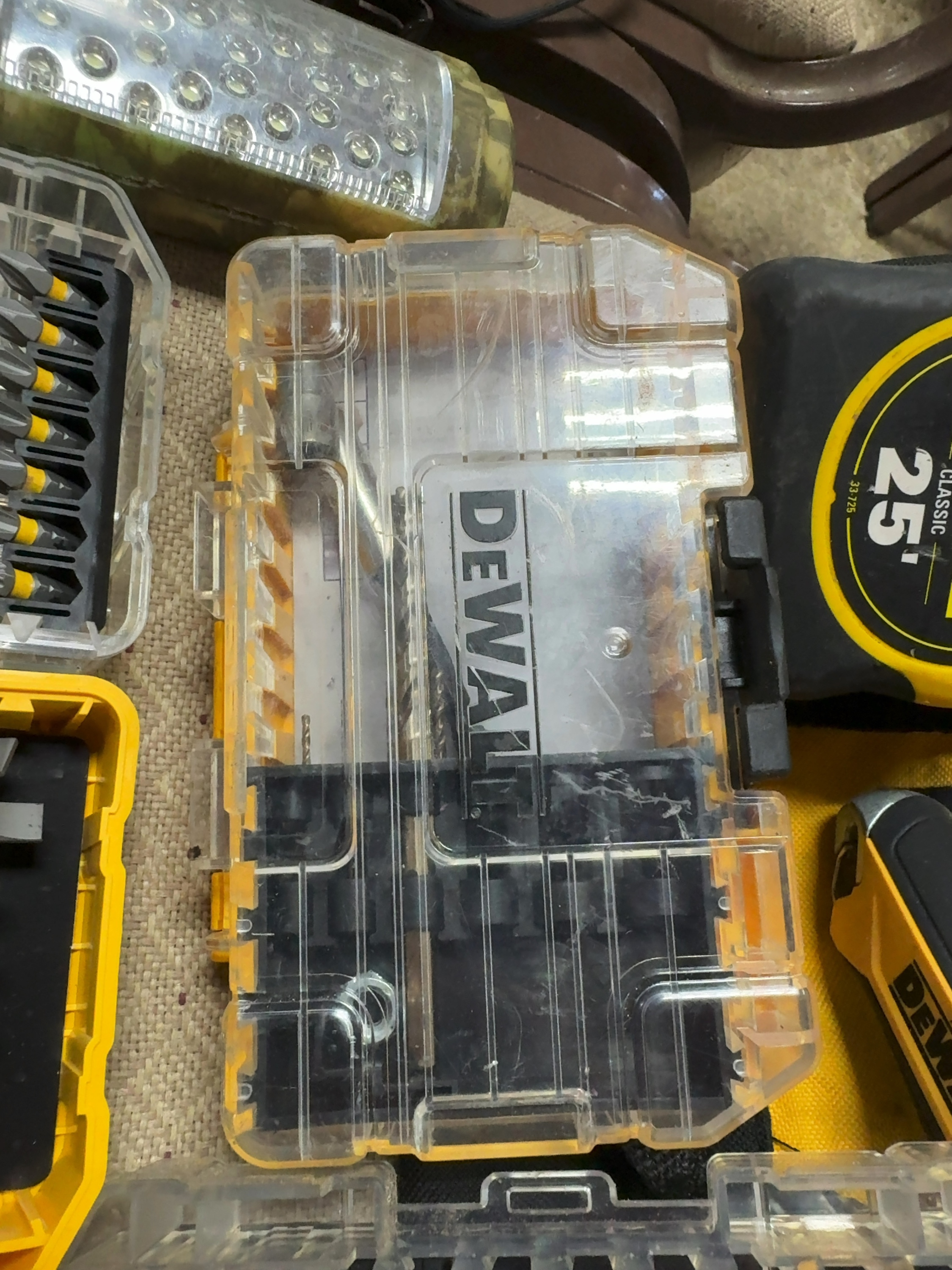 An Assortment of DeWalt and Stanley Tools including Bit Sets, Tape Measure, and Utility Knife