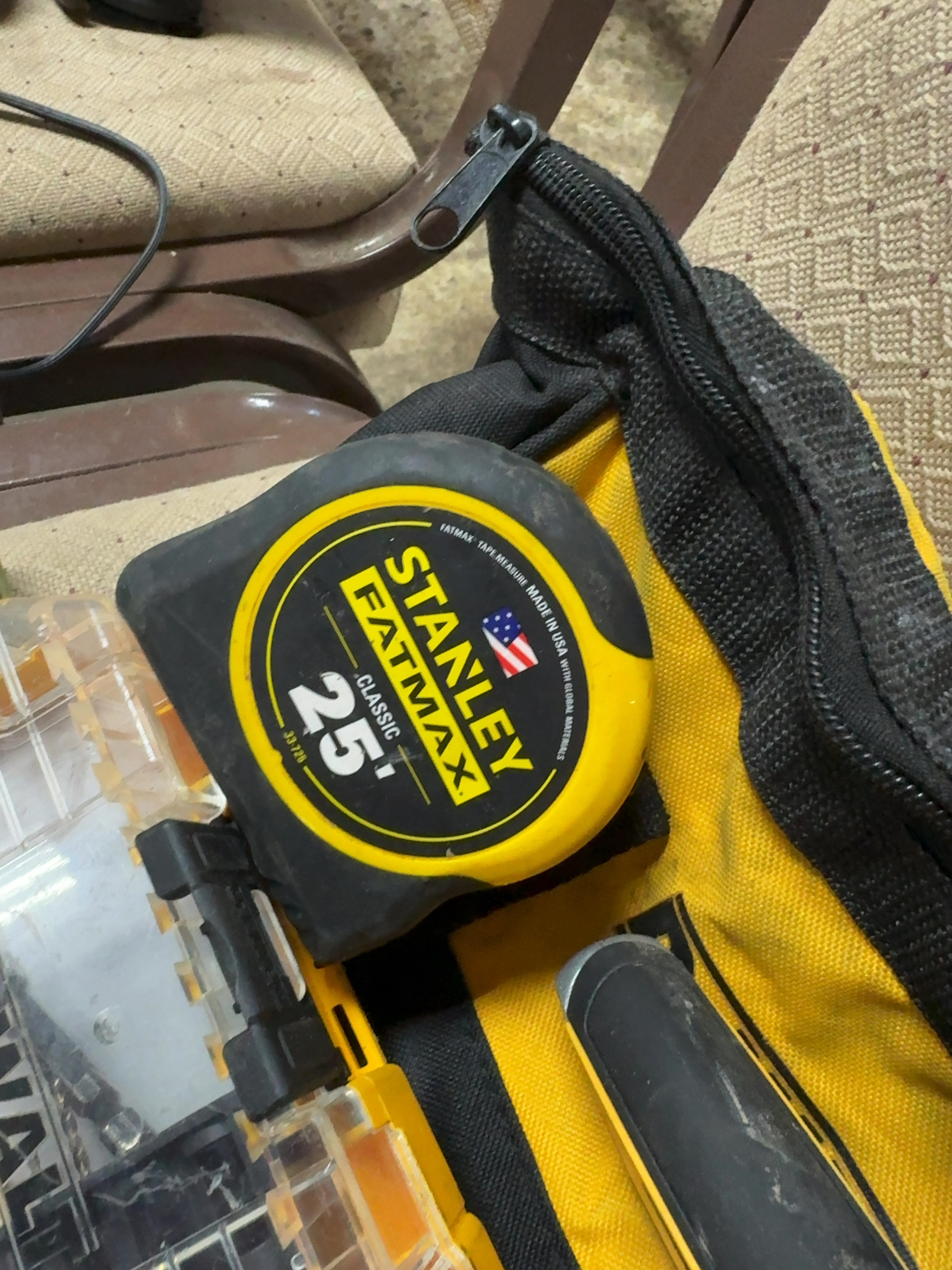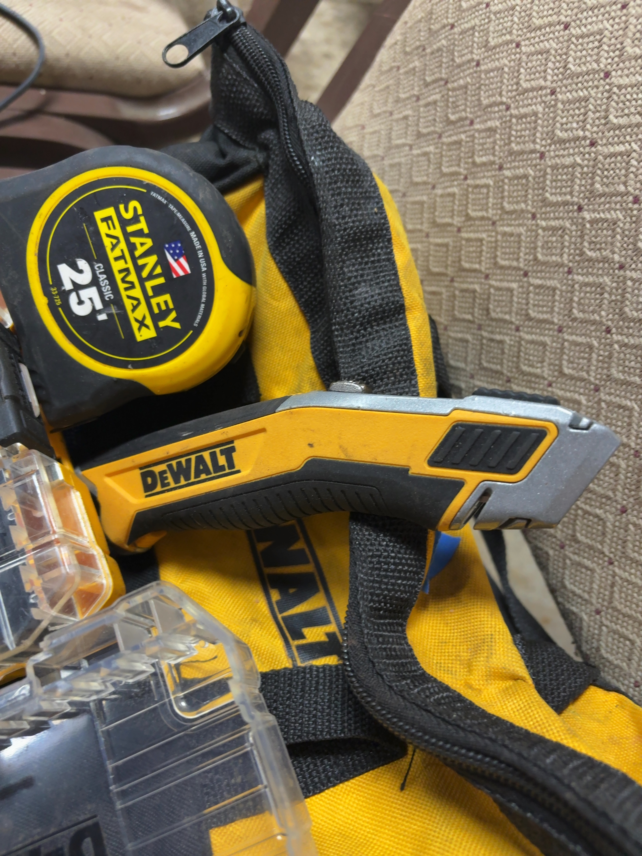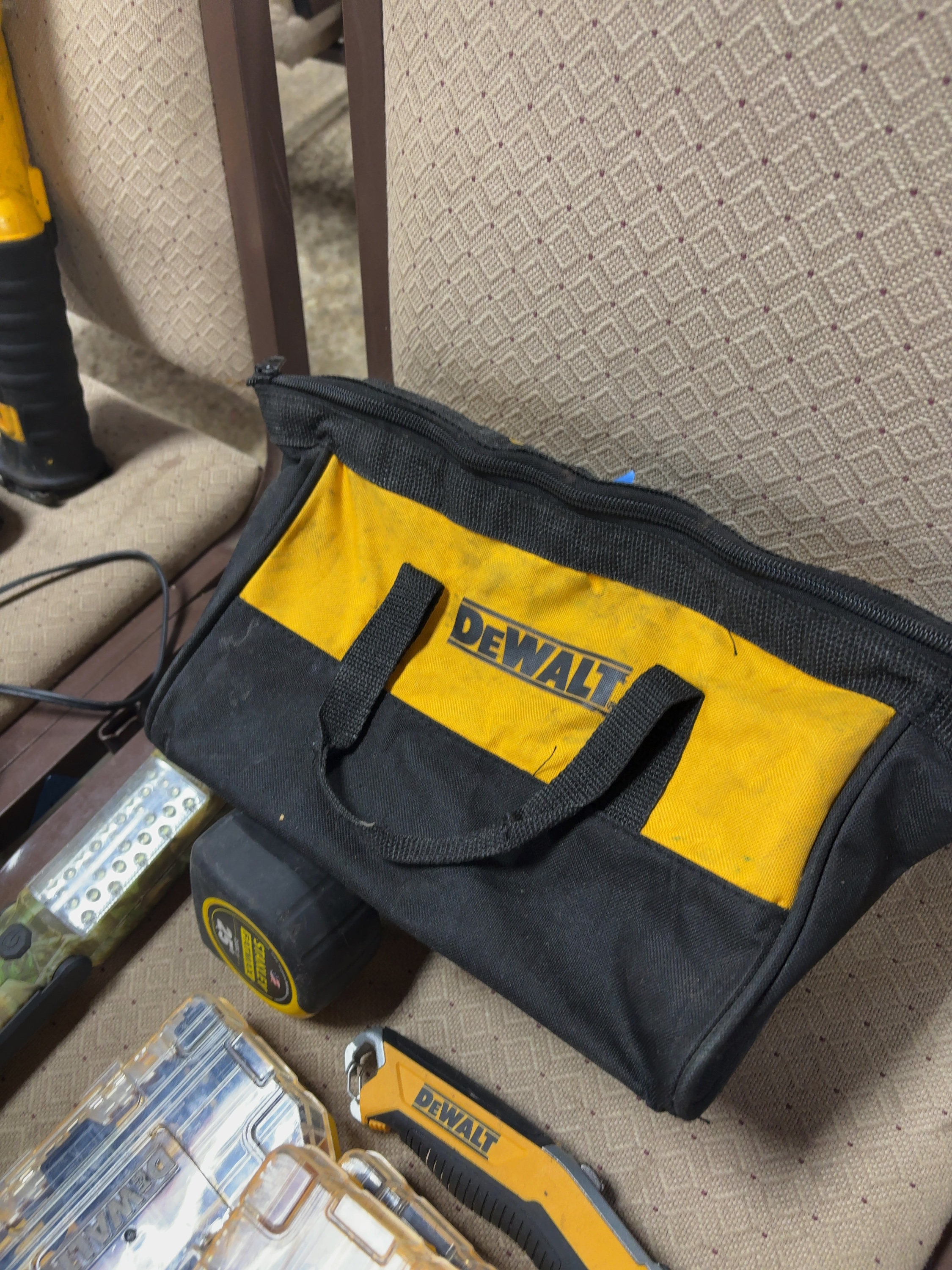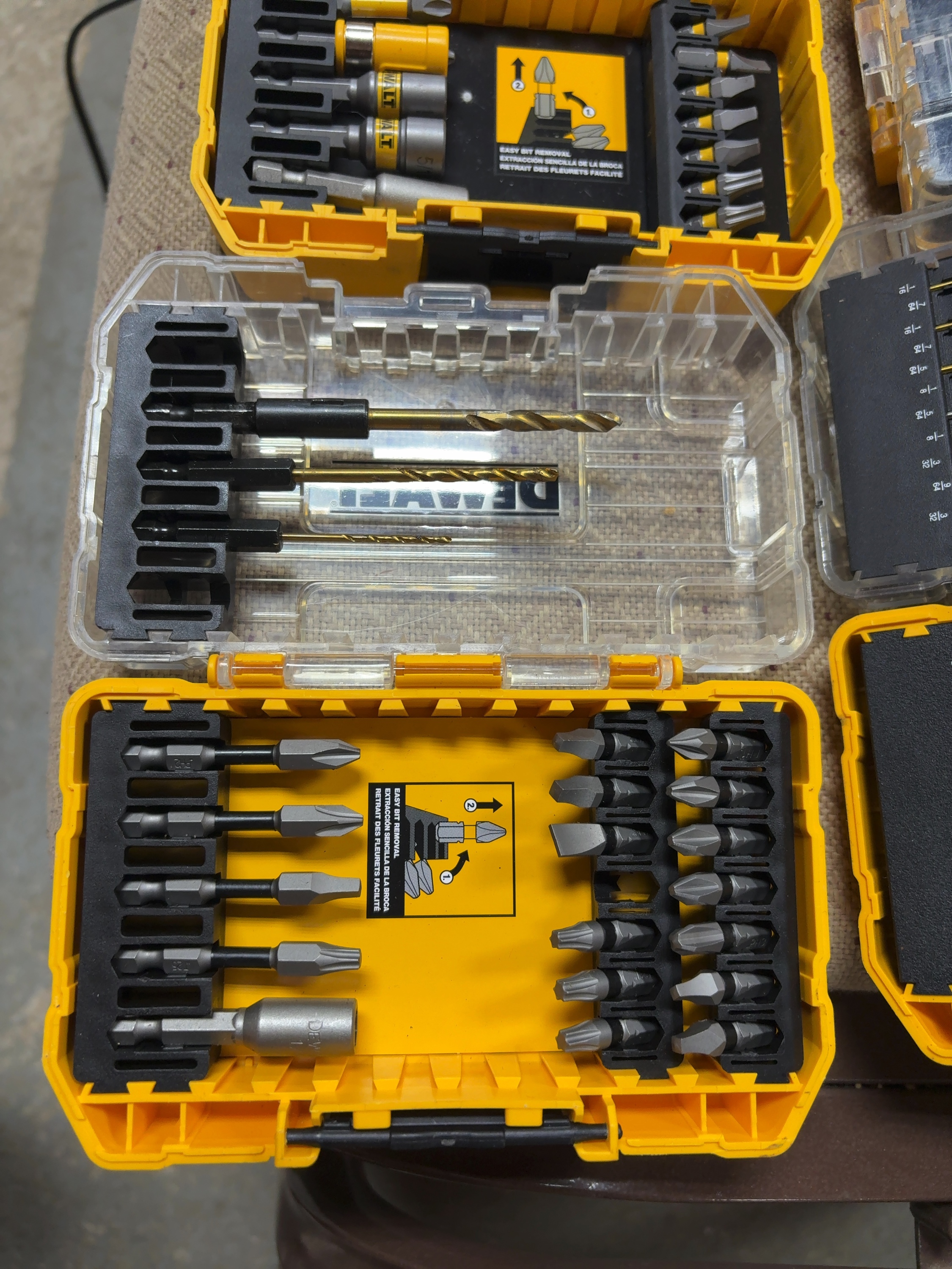 An Assortment of DeWalt and Stanley Tools including Bit Sets, Tape Measure, and Utility Knife