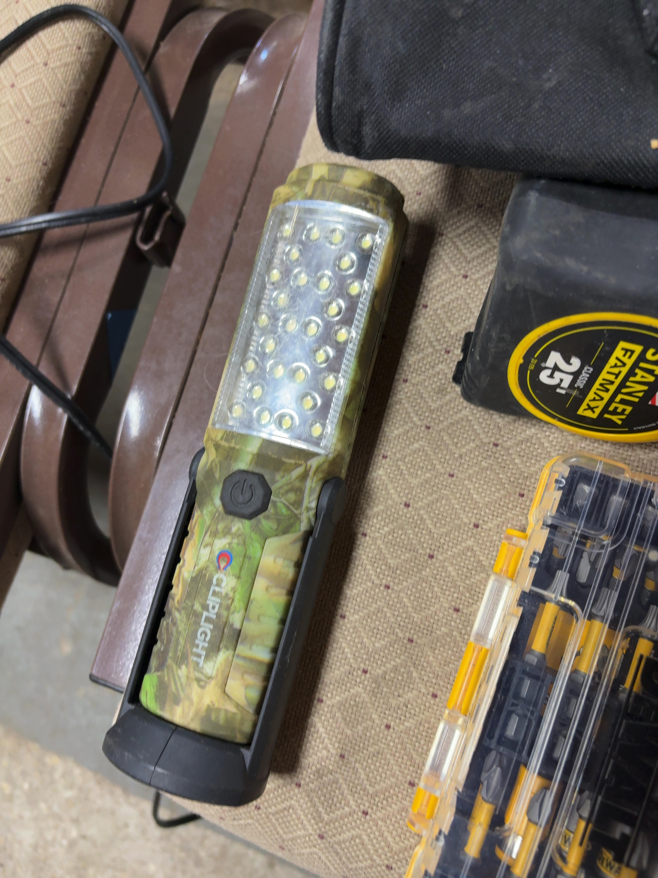 An assortment of professional-grade hand tools and accessories featuring components from DeWalt and Stanley. The collection includes multiple DeWalt ToughCase plastic organizers containing an array of impact driver bits, hex-shank nut drivers, and gold-tone twist drill bits. Driver bit types include Phillips, square, and Torx. The lot features a Stanley FatMax Classic retractable tape measure, model 33-725, with a 25-foot capacity and a yellow and black circular label. Also present is a DeWalt retractable utility knife with a yellow and black rubberized grip handle and a Cliplight LED portable work light featuring a camouflage pattern housing and a multi-LED array. The items are contained within a DeWalt soft-sided tool bag made of heavy-duty black and yellow synthetic fabric. Visible markings include DEWALT on various cases, bits, the knife, and the bag; STANLEY FATMAX CLASSIC 25′ on the tape measure; and CLIPLIGHT on the work light.