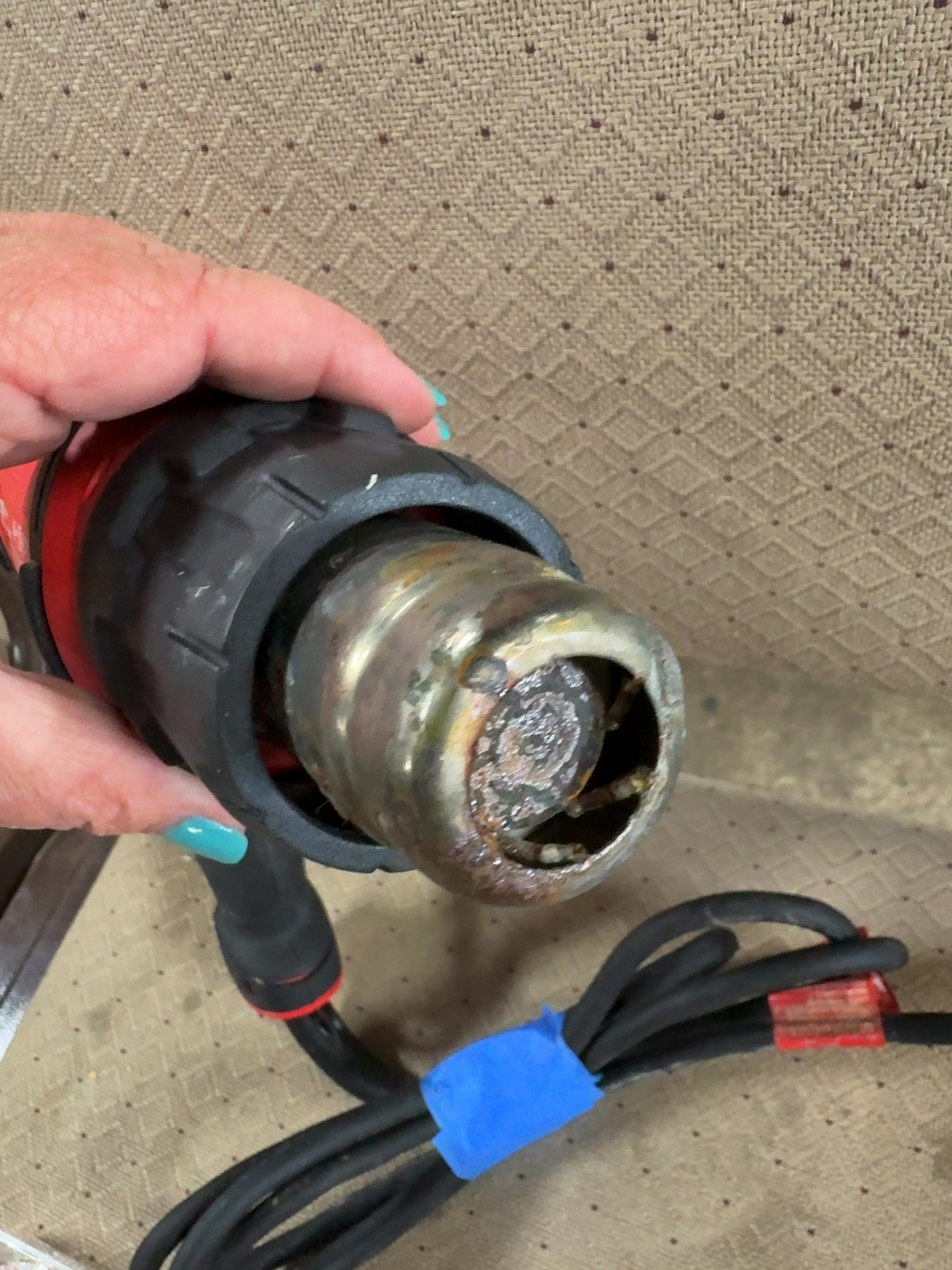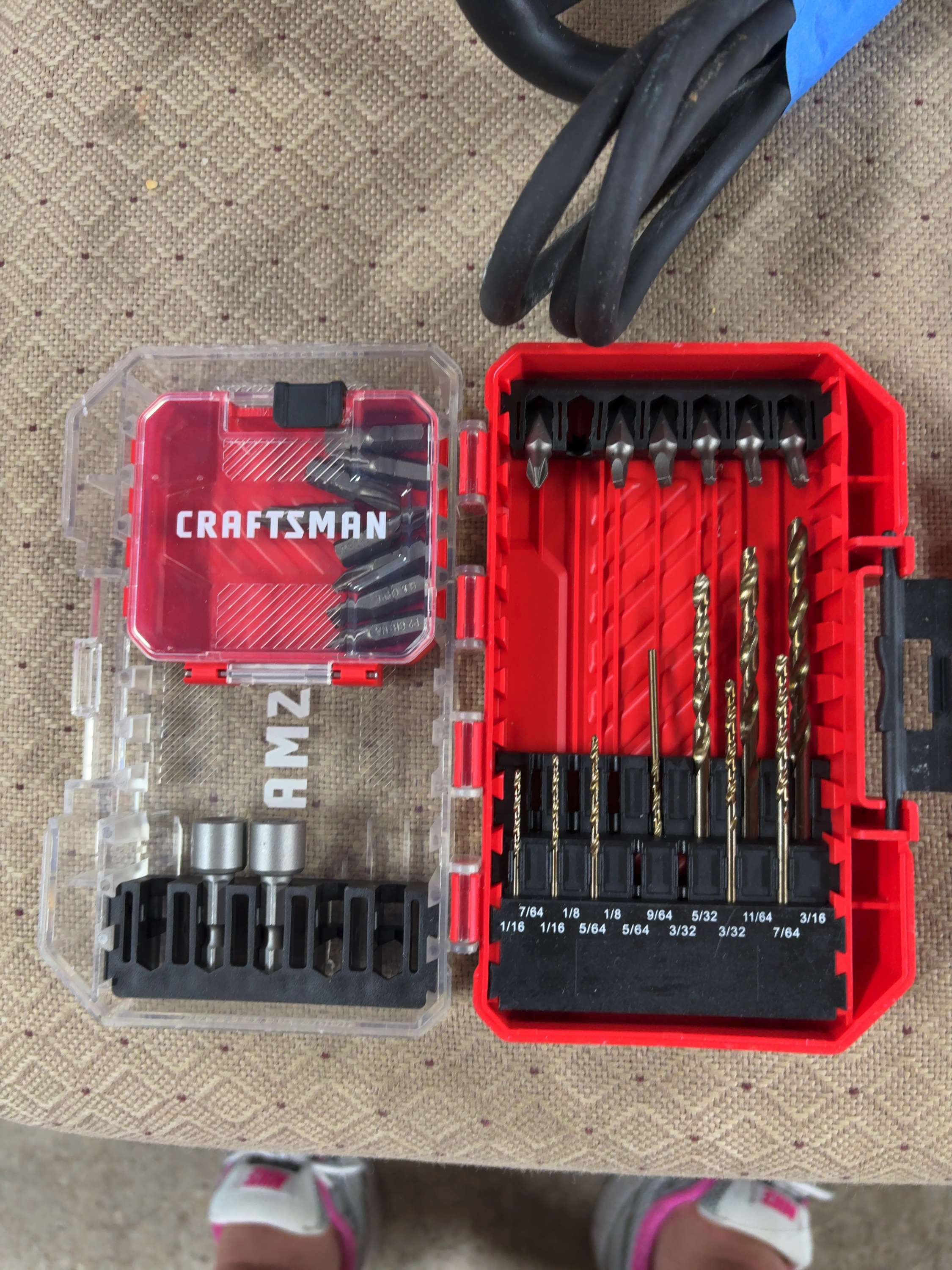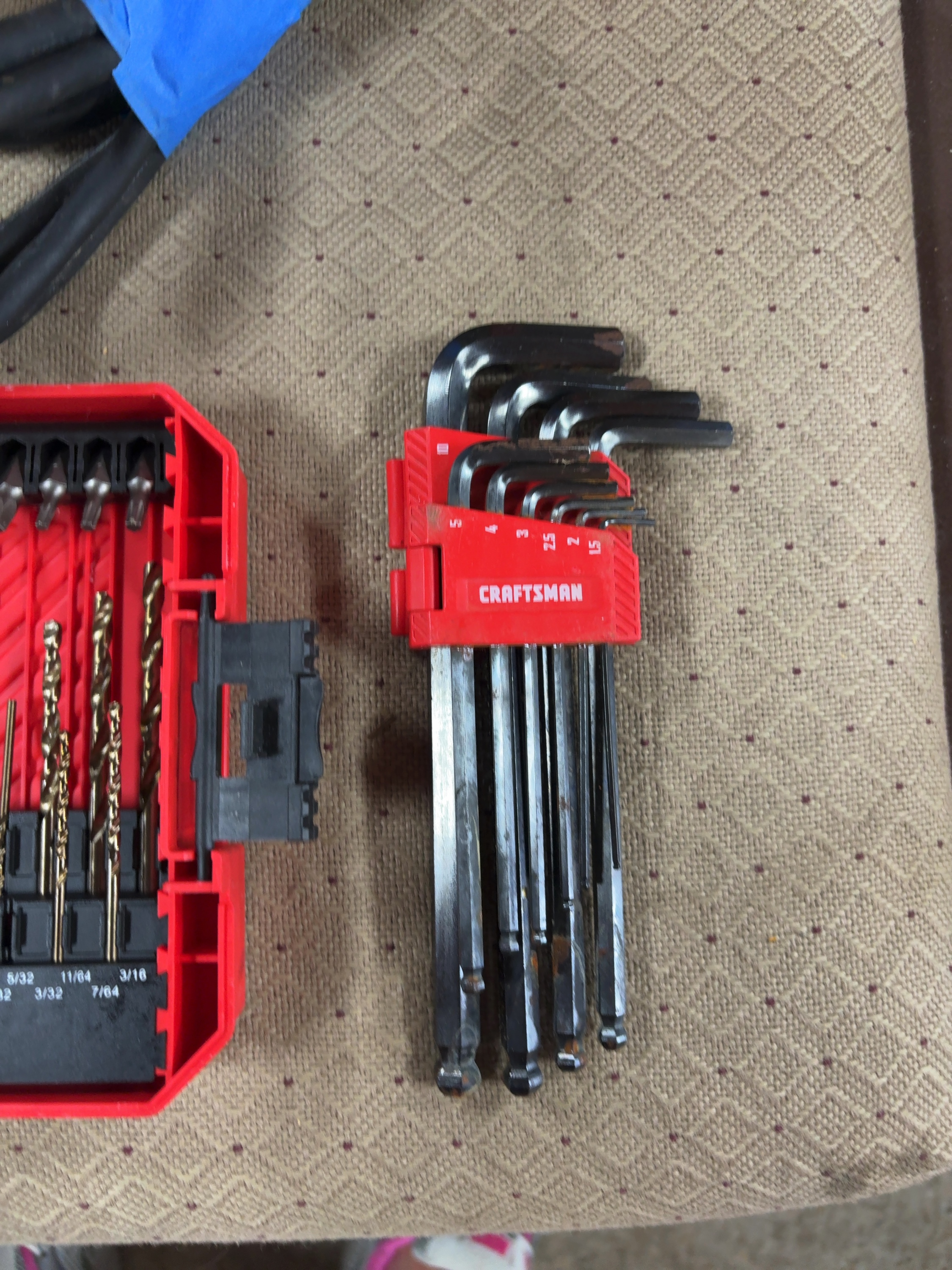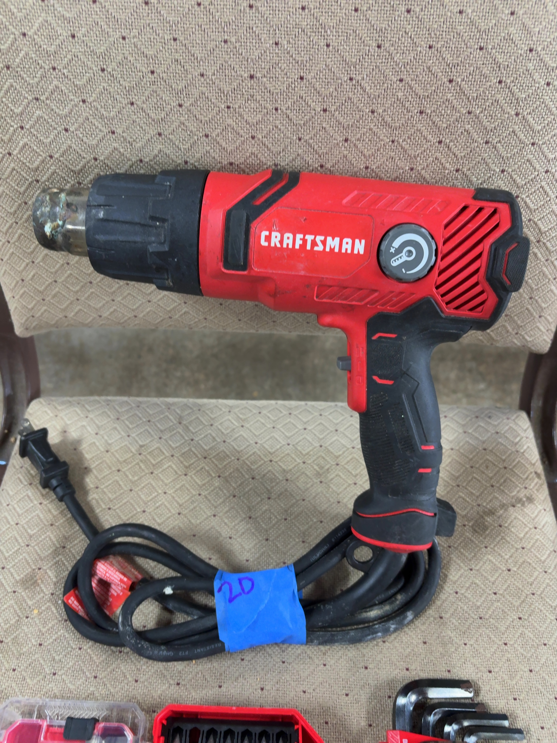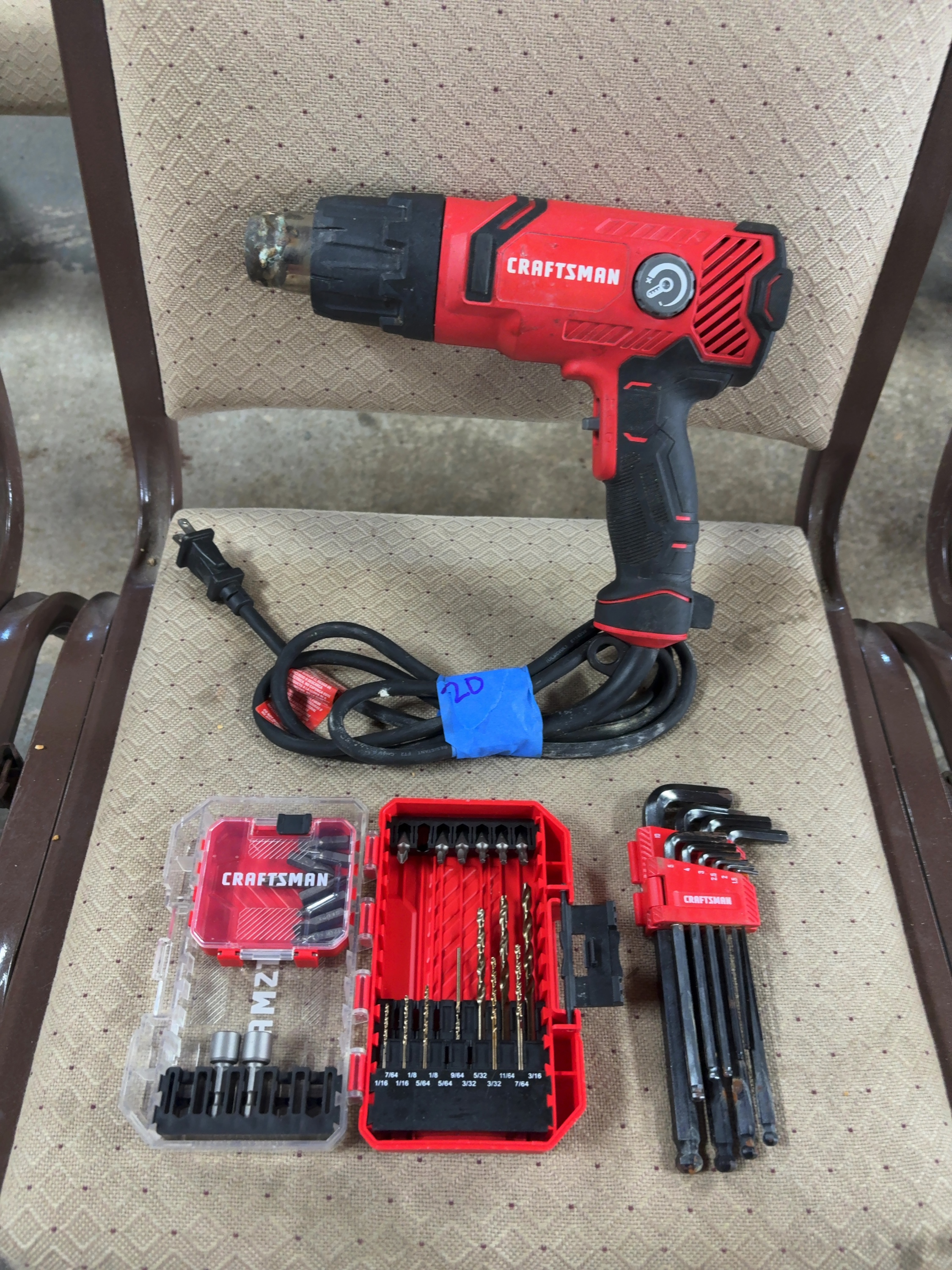 Accompanying the heat gun is a Craftsman multi-piece drill and driver bit set housed in a folding plastic storage case with a clear lid. The set includes a variety of metal drill bits with size markings ranging from 1/16 inch to 3/16 inch and several screwdriver bits. Also included is a set of ball-end hex keys, or Allen wrenches, in a red plastic holder. The holder is marked with sizes 1.5, 2, 2.5, 3, 4, and 5.