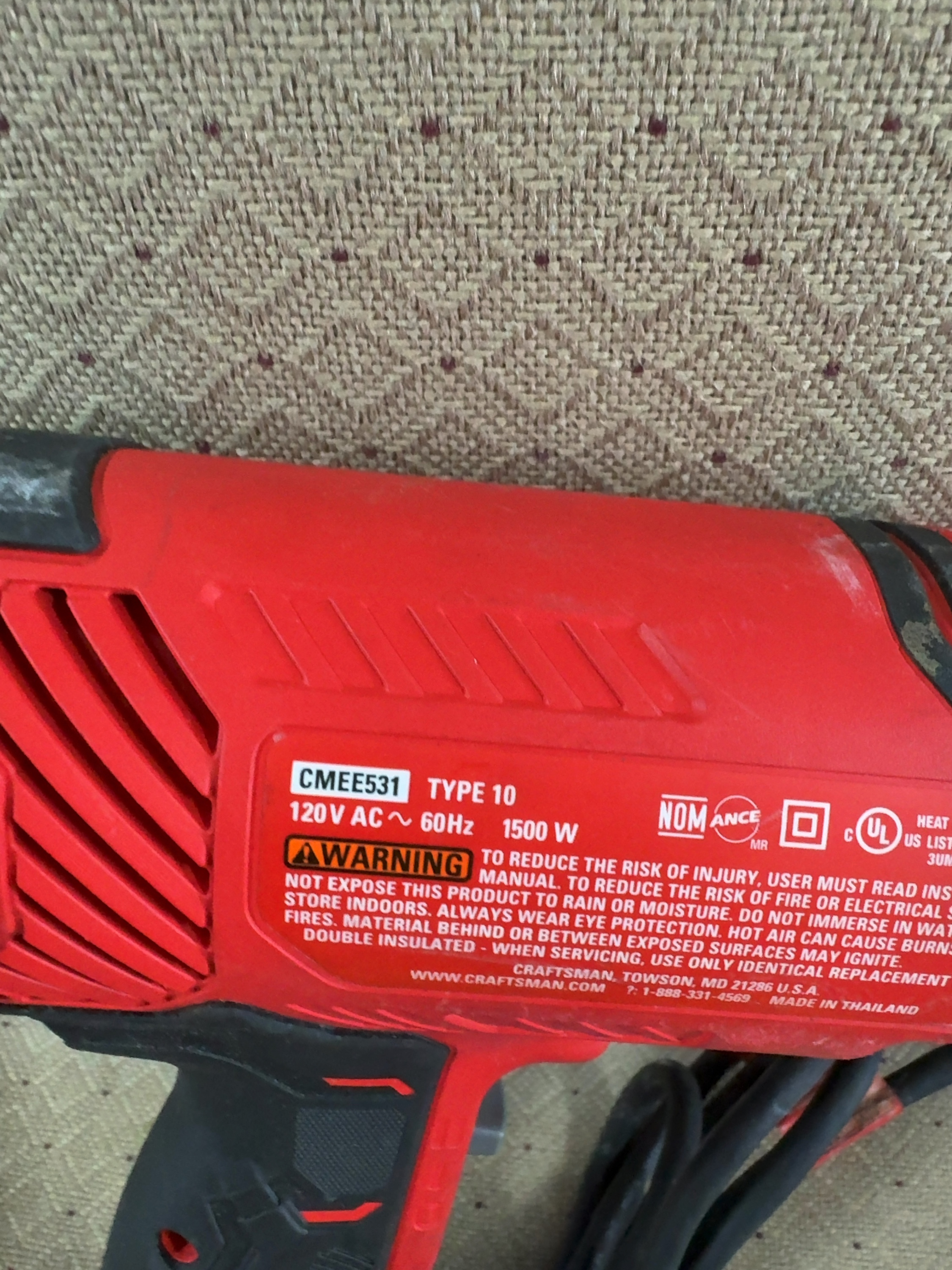 This collection includes a corded electric heat gun and two accessory sets from Craftsman. The primary item is a Craftsman CMEE531 Type 10 heat gun, a 1500W power tool designed for 120V AC 60Hz operation. The unit features a red and black plastic housing with a trigger switch and a dial control on the side. The manufacturer label on the reverse side identifies it as being from Towson, MD, and made in Thailand.