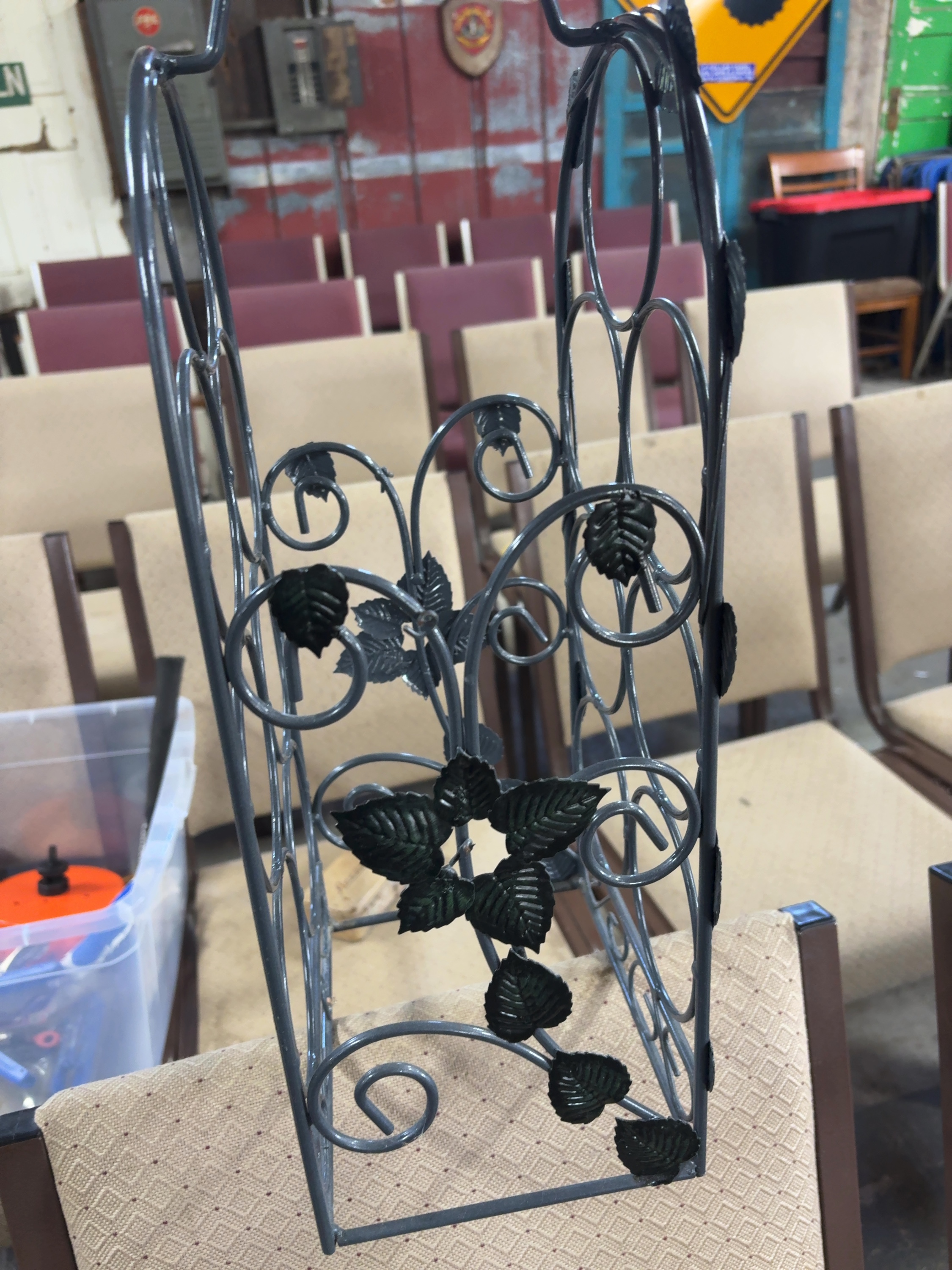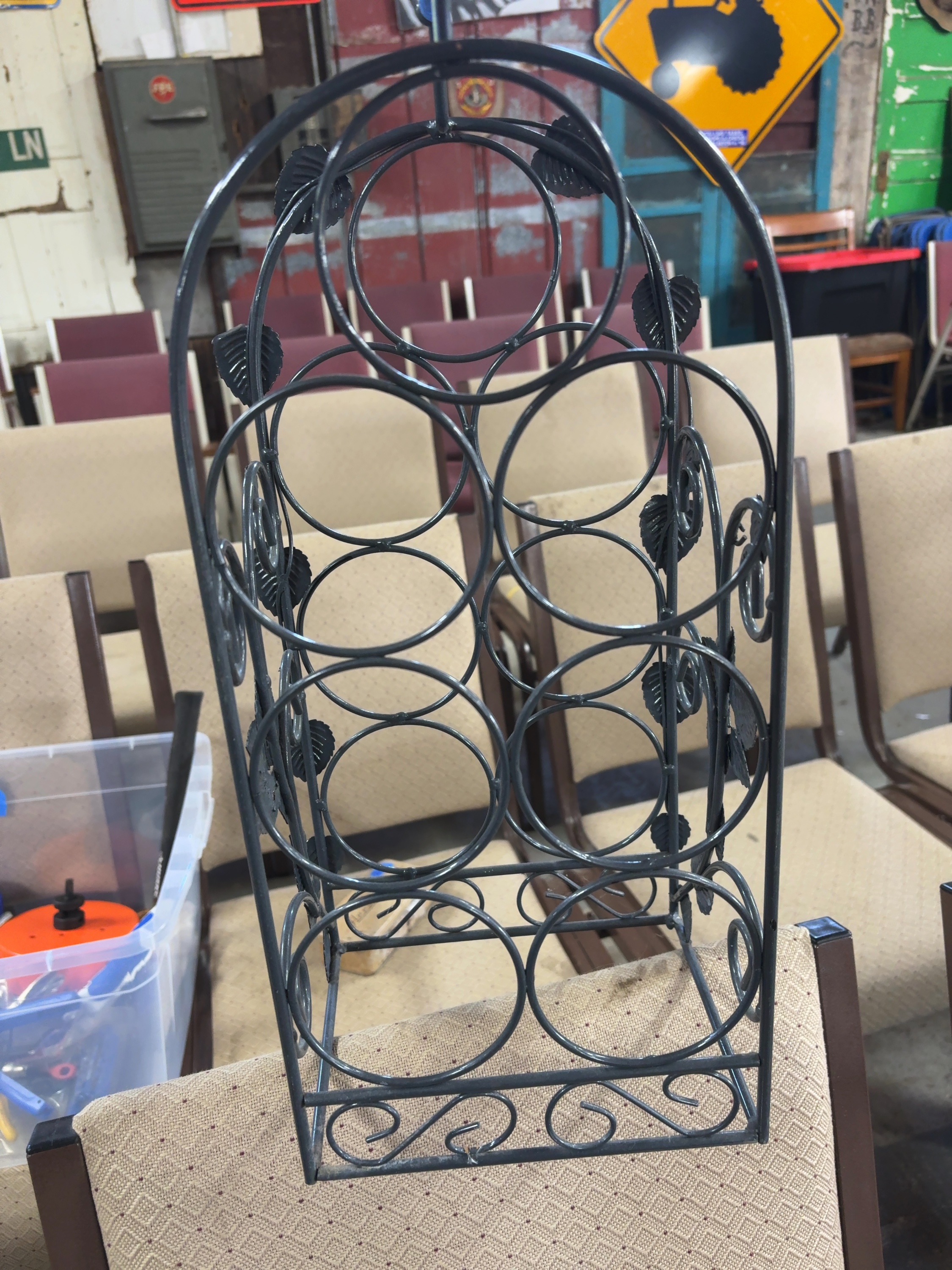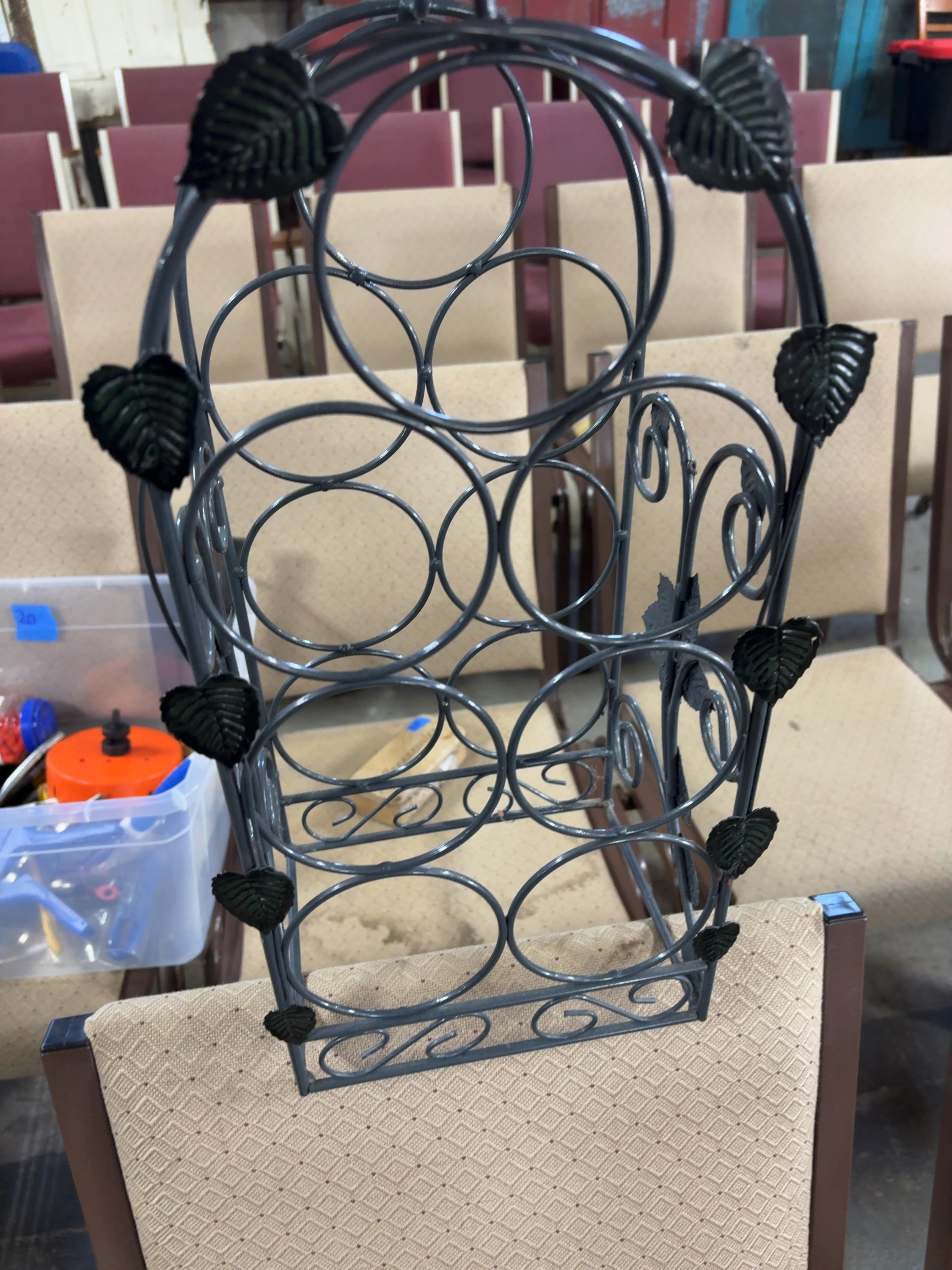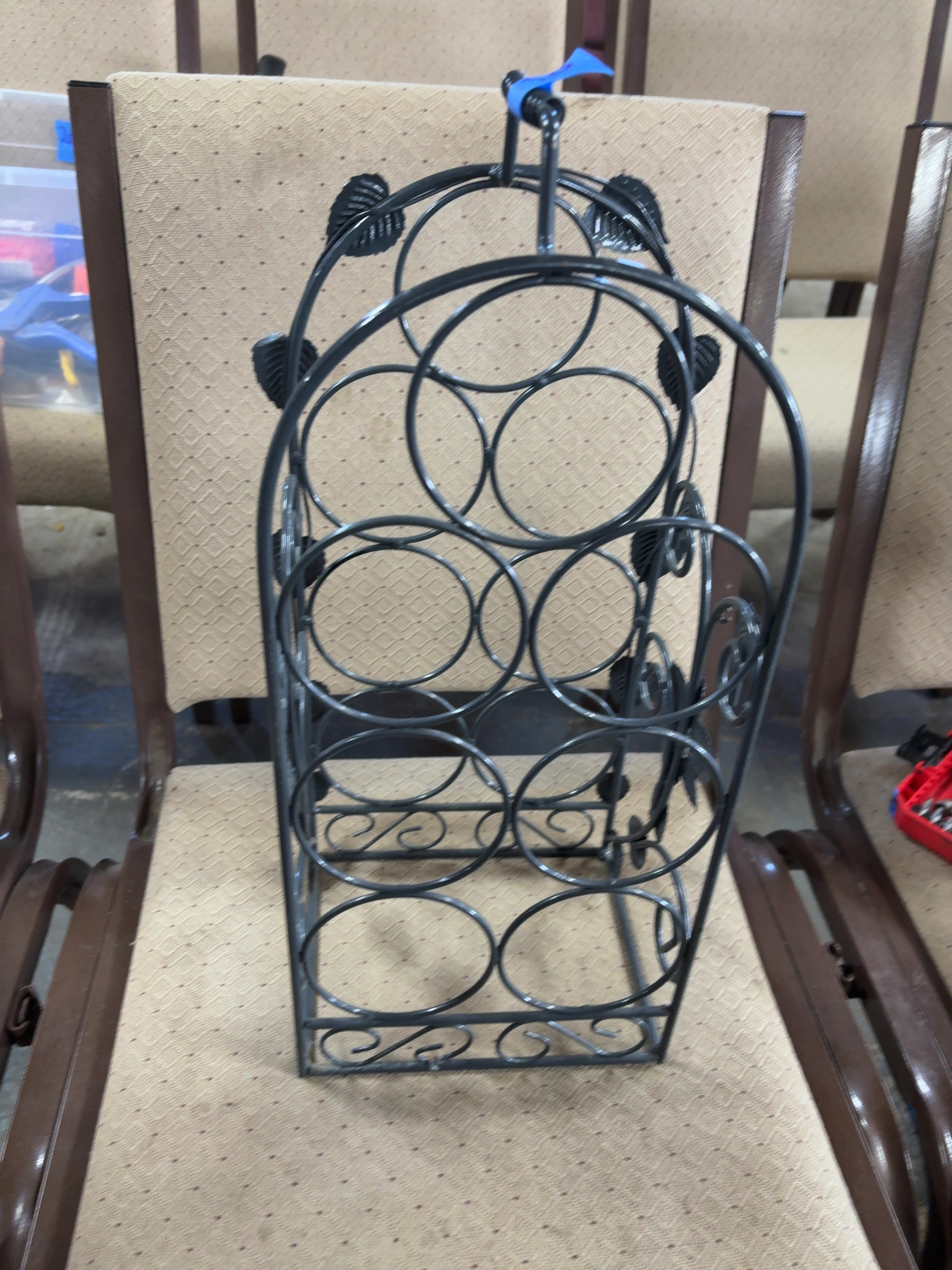 A countertop wine rack designed to hold seven standard wine bottles in an upright, tiered arrangement. The piece is constructed of welded iron or steel wire and rod with a dark gray or charcoal painted finish. The design features a cathedral arch silhouette topped with a central carrying handle. The interior framework consists of seven circular bottle holders. The sides are decorated with stamped metal leaf motifs and scrolling wire work. The base is rectangular with additional scrollwork accents on the front and back. No manufacturer marks or signatures are present. No ruler or scale is present in the images to provide exact dimensions or weight.