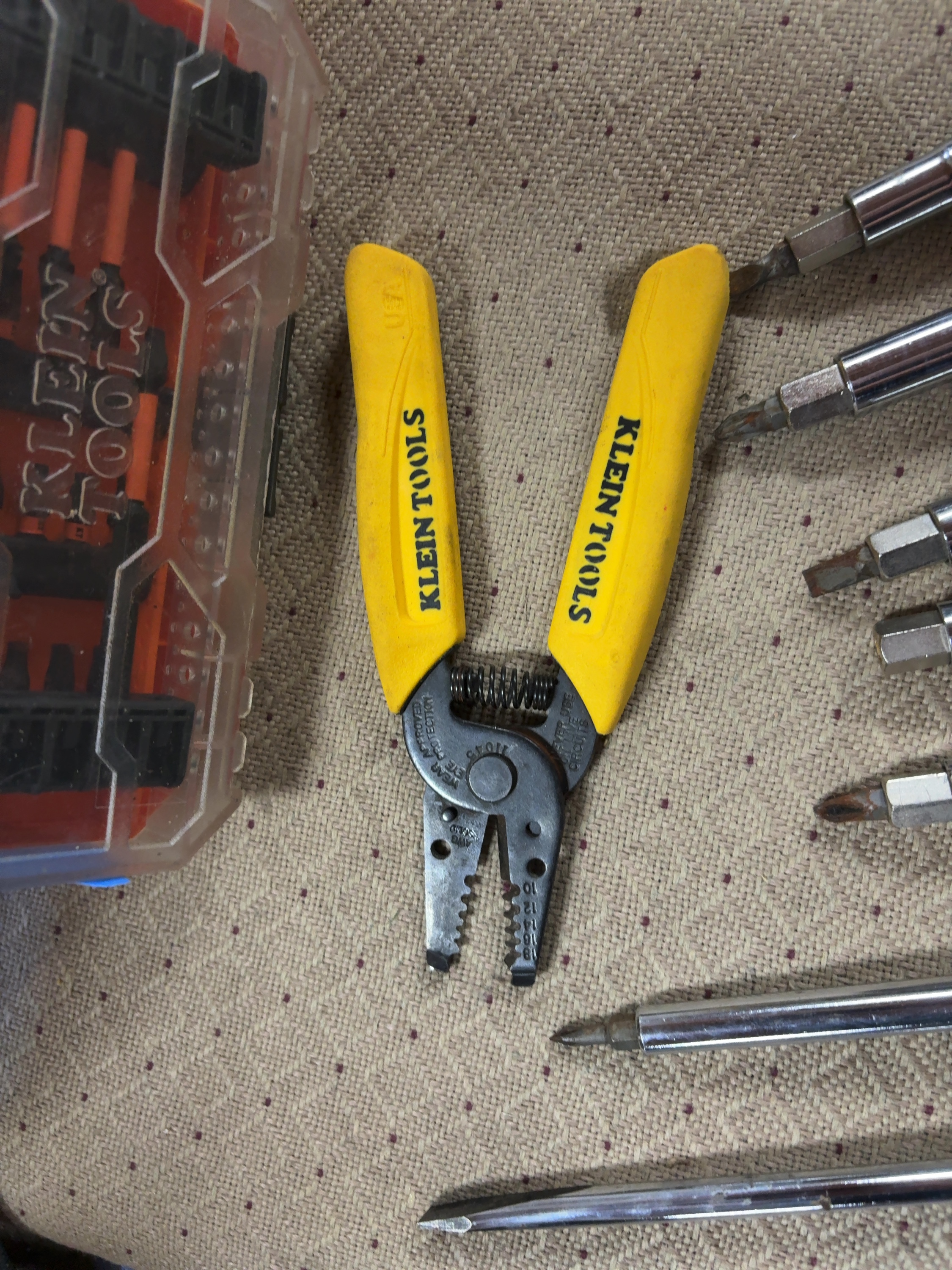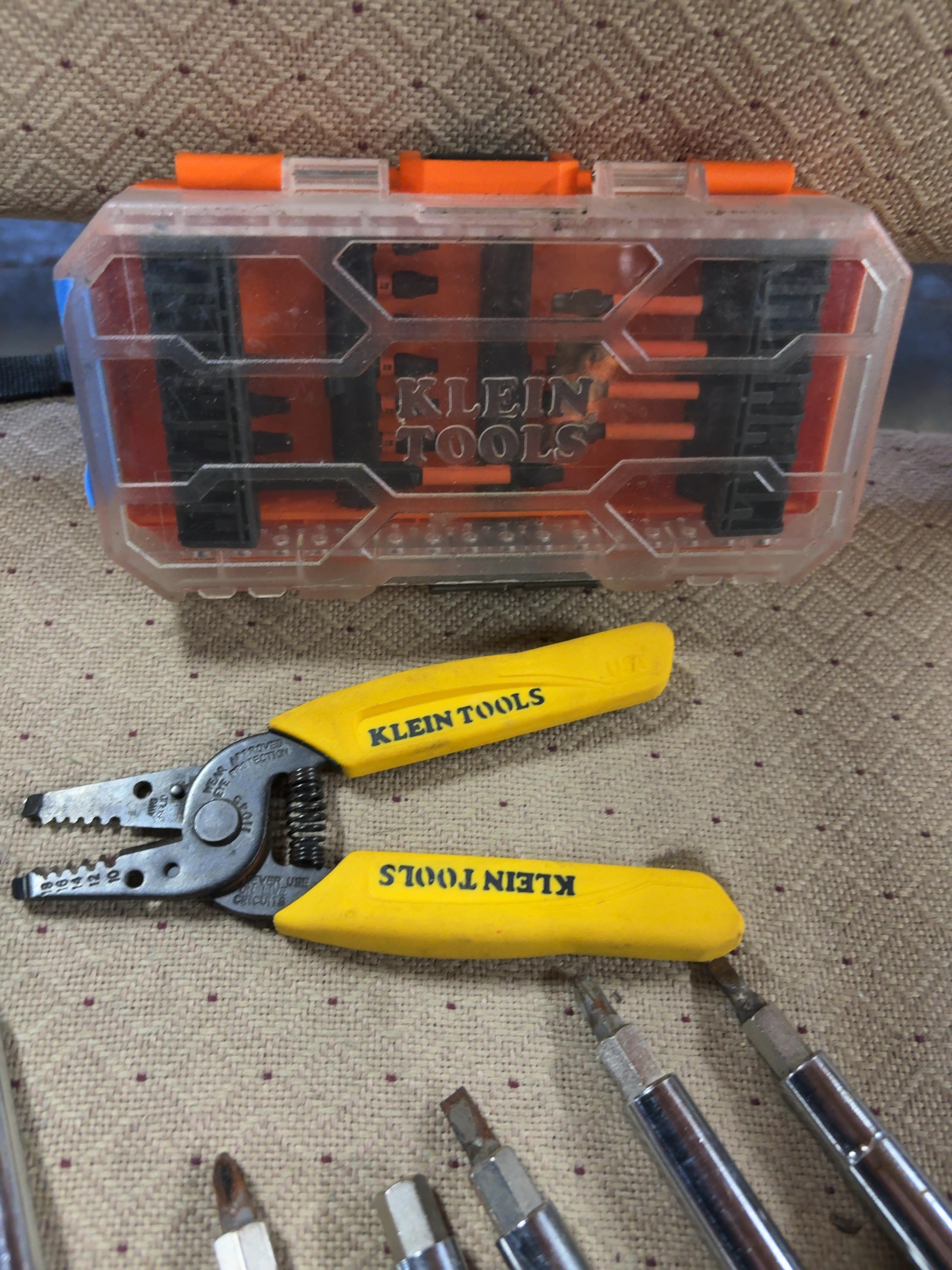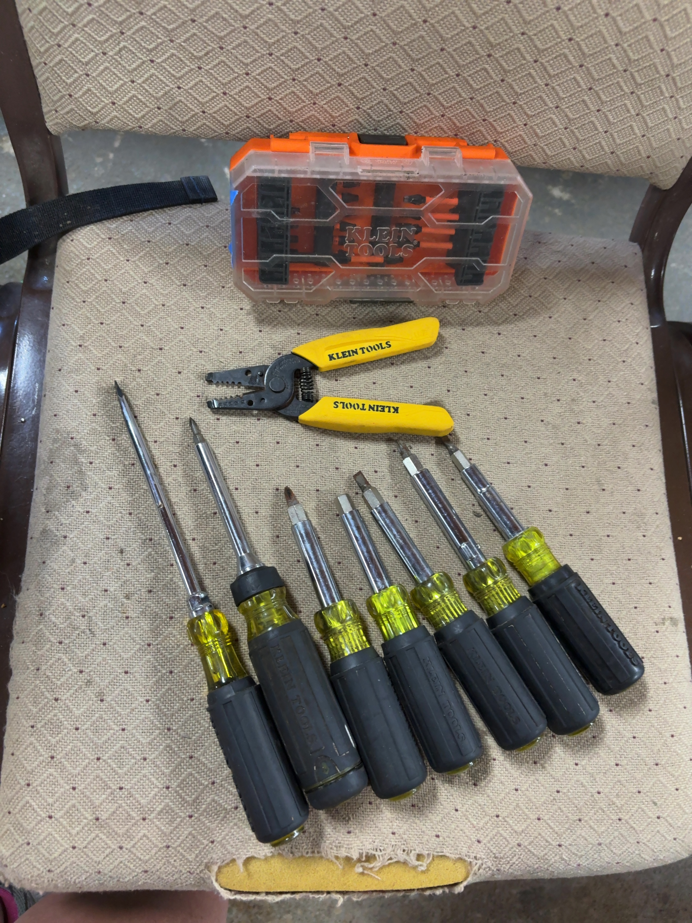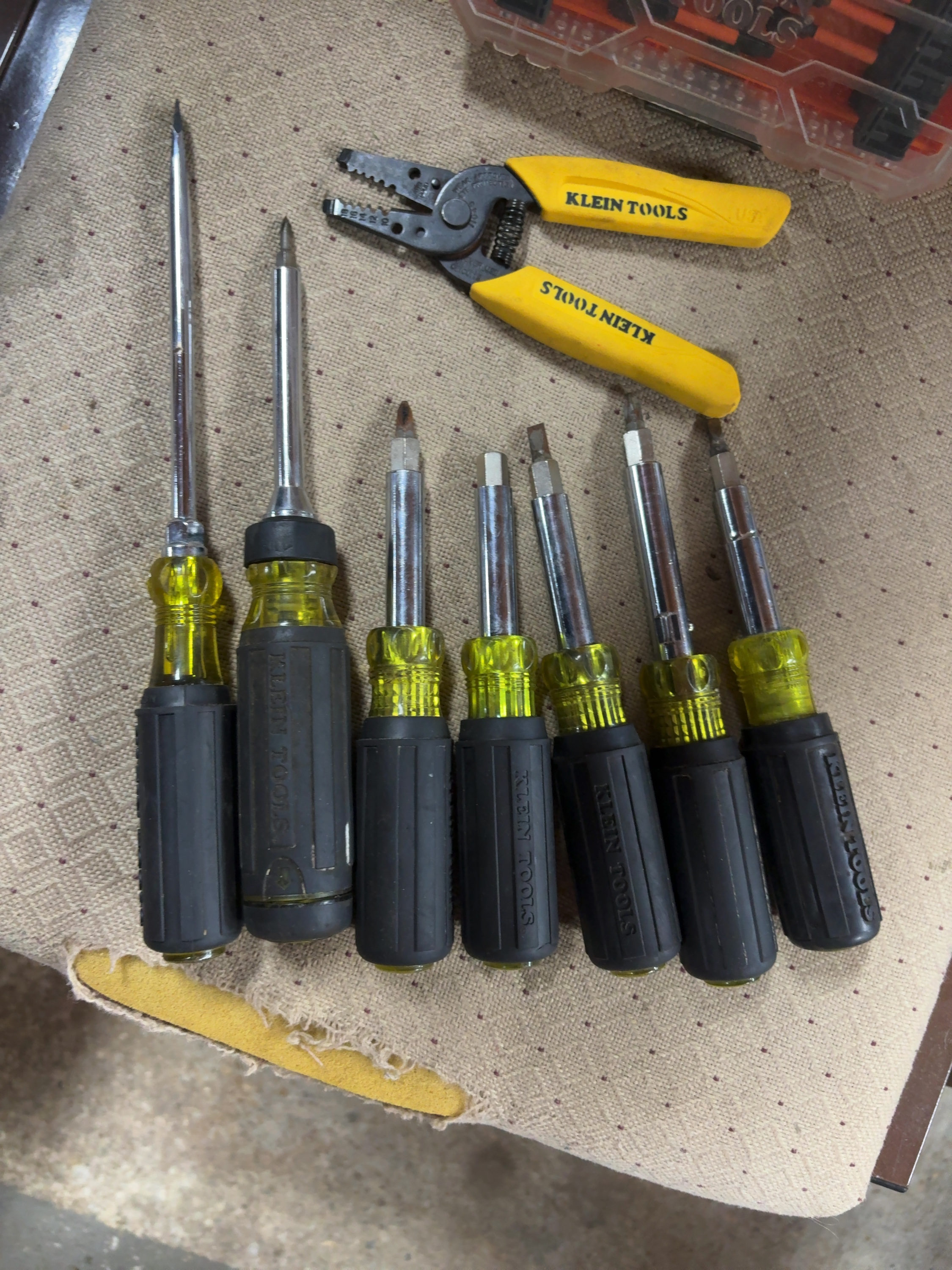 An assortment of Klein Tools professional-grade hand tools and accessories. The collection includes various drivers featuring black rubberized cushion-grip handles over yellow acetate, including screwdrivers and nut drivers of different lengths. One pair of wire strippers and cutters is included, featuring yellow plastic-coated handles with wire gauge markings and the manufacturer’s name. A plastic storage case with an orange base and clear lid contains multiple driver bits. The handles are marked with the manufacturer name KLEIN TOOLS. The metal body of the wire stripper is stamped with wire gauge sizes 10 through 18 and the handle is stamped USA.