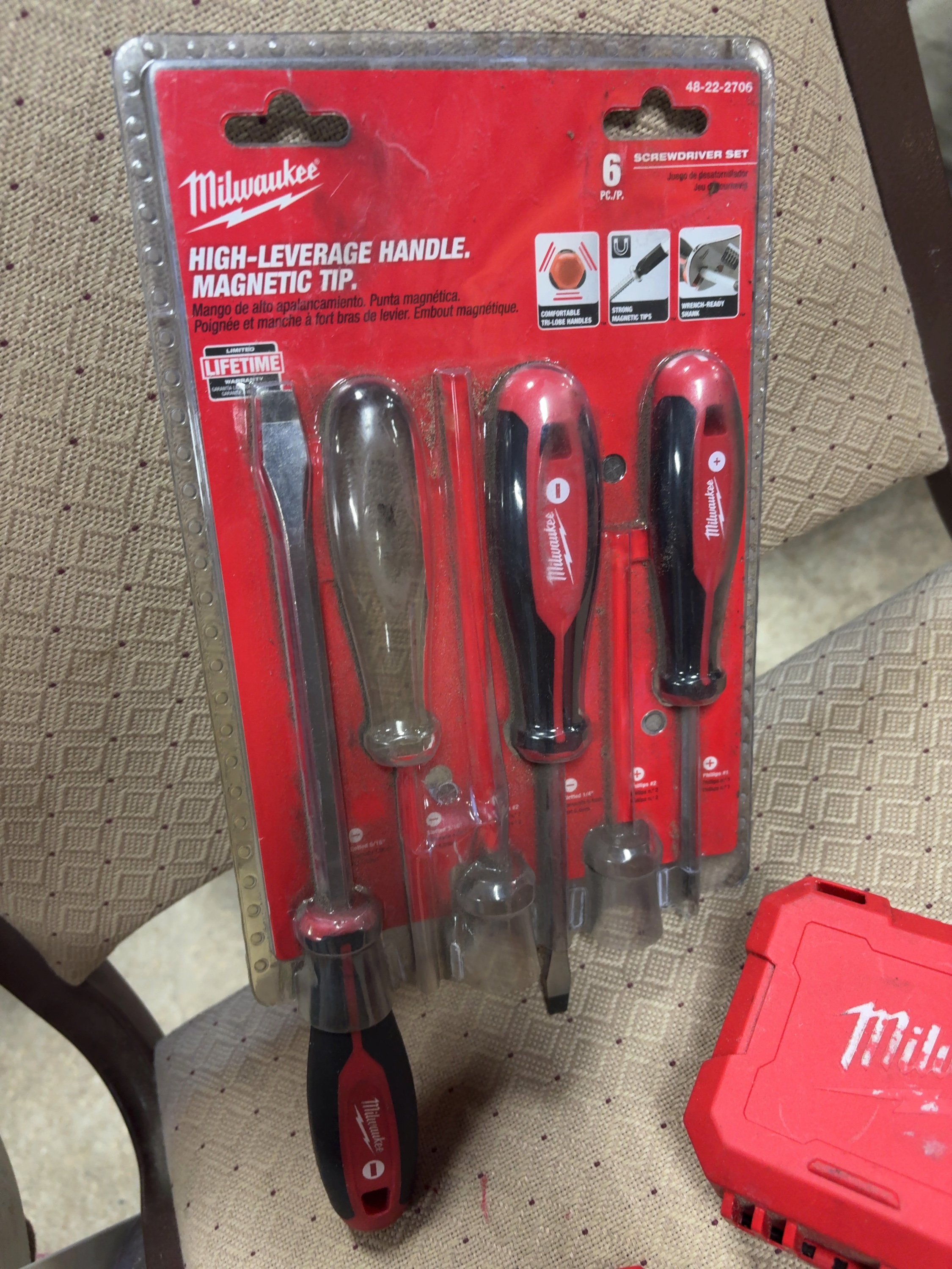 This lot features a collection of professional-grade hand tools and accessories manufactured by Milwaukee. The group includes a 6-piece screwdriver set, model number 48-22-2706, featuring tri-lobe high-leverage handles and magnetic tips. The set contains both Phillips and slotted drivers with wrench-ready shanks. Also included is a Milwaukee Fastback model folding utility knife constructed with a red plastic and metal housing. The final item is a cased set of Milwaukee titanium-coated drill bits featuring the Quad Edge Tip design and hex shanks. The bits are housed in a red plastic indexed case with internal markings for bit sizes and promotional text. All items prominently display the Milwaukee brand logo and name.