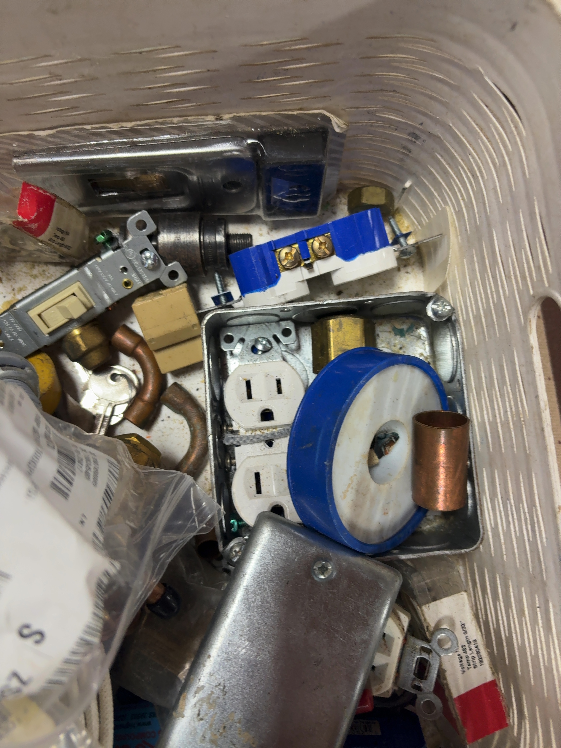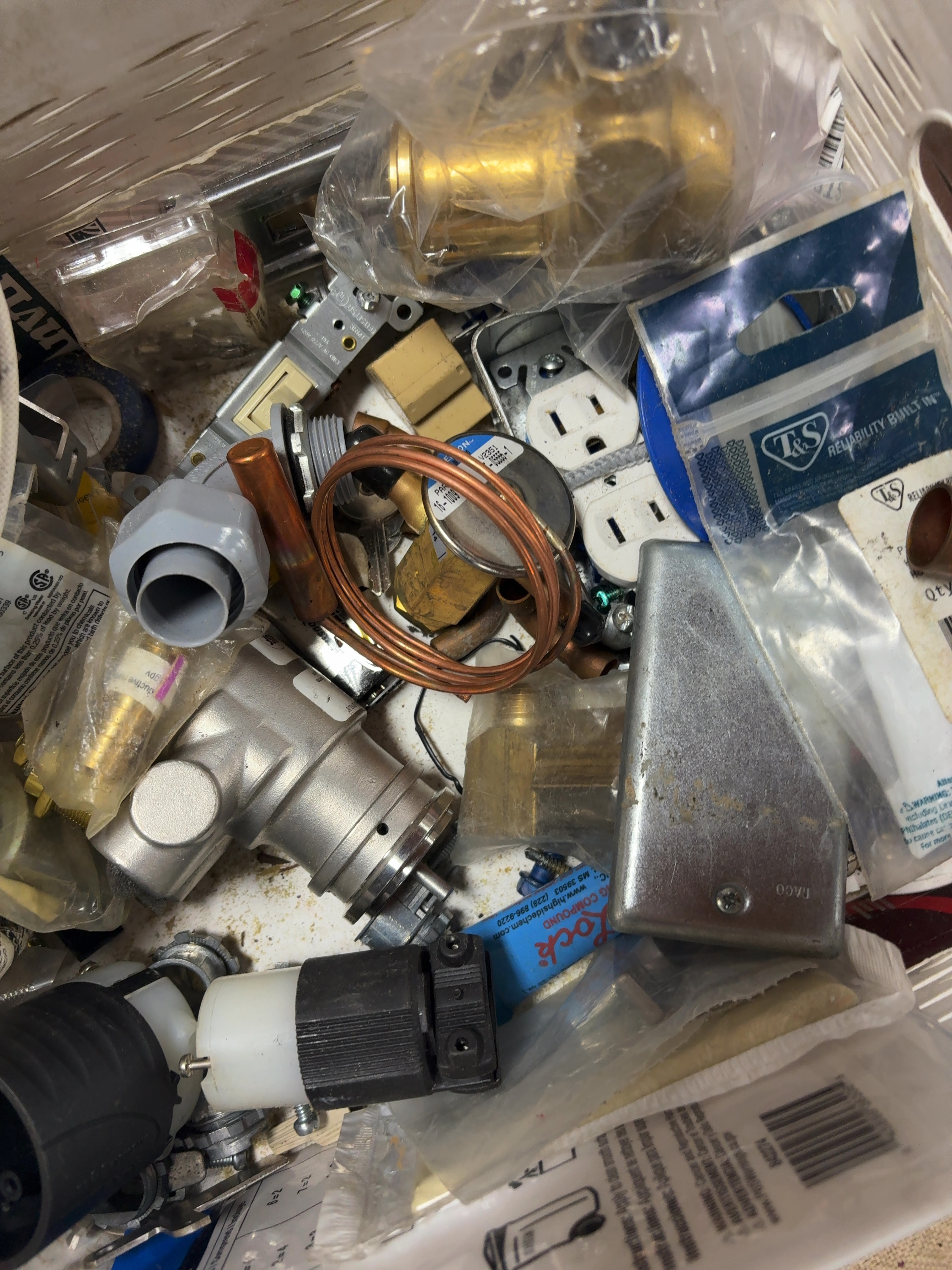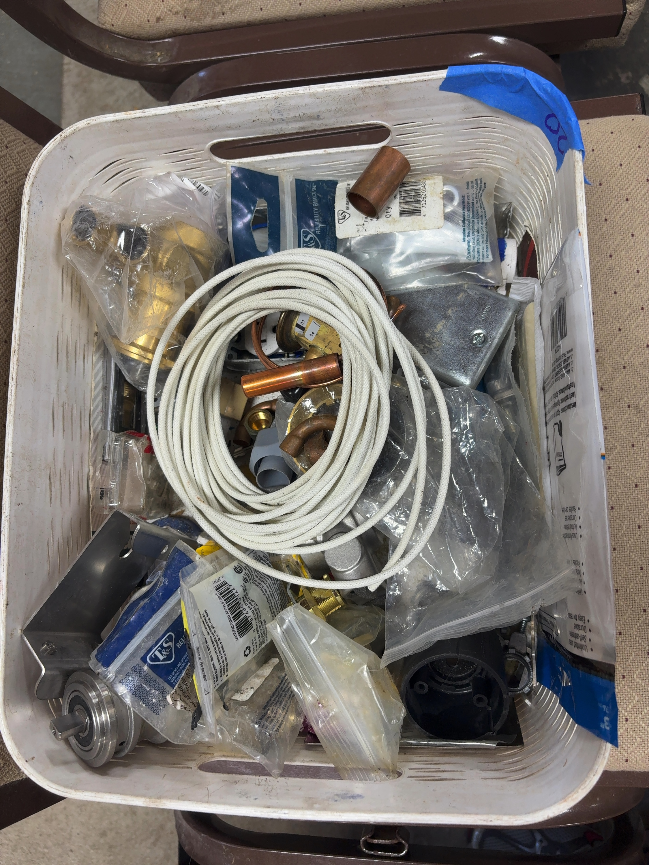 This lot comprises a diverse collection of industrial trade supplies, including plumbing, electrical, and mechanical components. Plumbing highlights include various valves and fittings from T&S Brass and Bronze Works, Everbilt 3/8 inch brass flare fittings, a coil of small-diameter copper tubing, various copper pipe segments and elbows, a large stainless steel valve body, and a roll of white PTFE thread seal tape. Electrical components consist of RACO metal electrical boxes and covers, standard white duplex receptacles, an ivory toggle light switch, heavy-duty industrial connectors, a roll of blue electrical tape, wire nut connectors, and a large coil of white braided or fabric-covered electrical cord. Mechanical hardware includes a bearing and shaft assembly, a custom stainless steel mounting bracket, and miscellaneous fasteners, with some hardware from Anvil International. Many items are new-old-stock in original packaging and feature UL and CSA certification marks. One label specifies a manufacture date after July 2018.